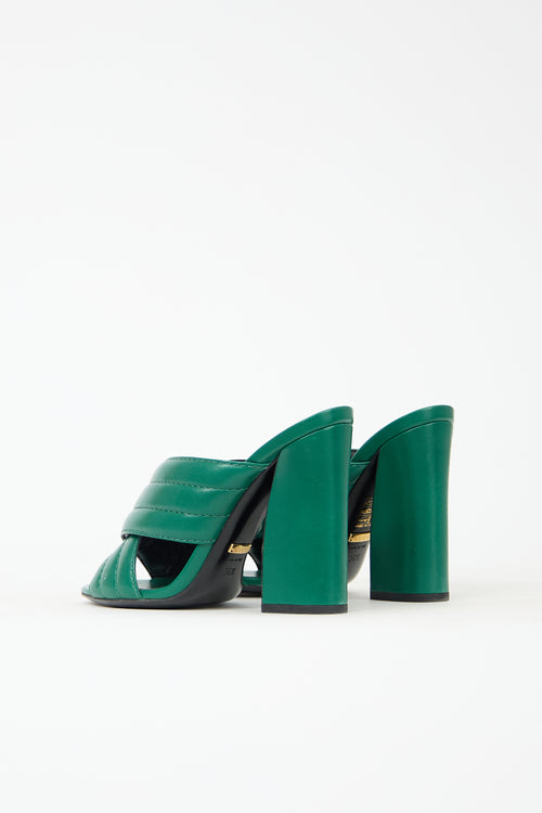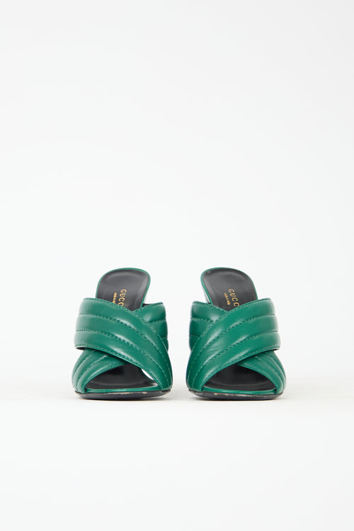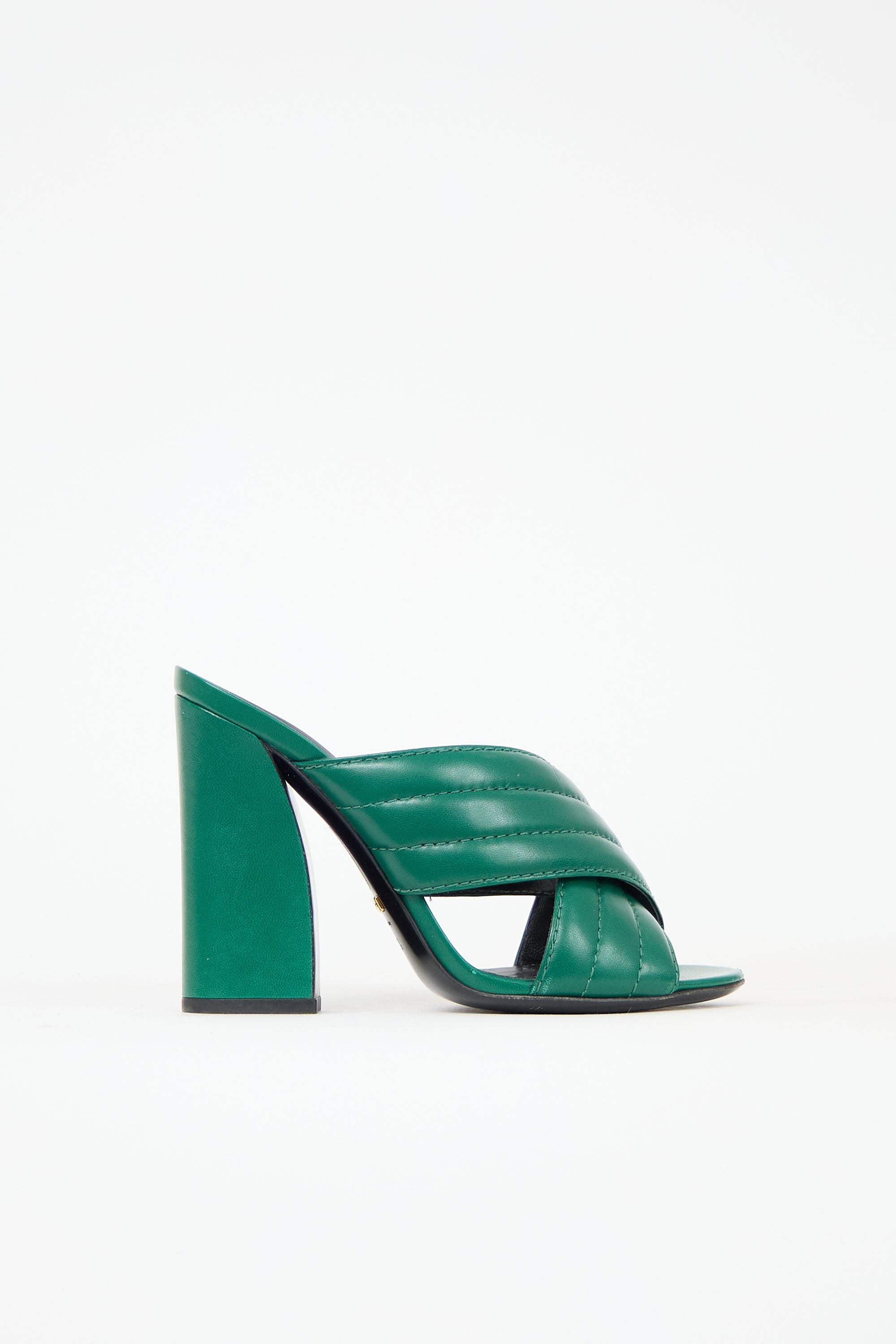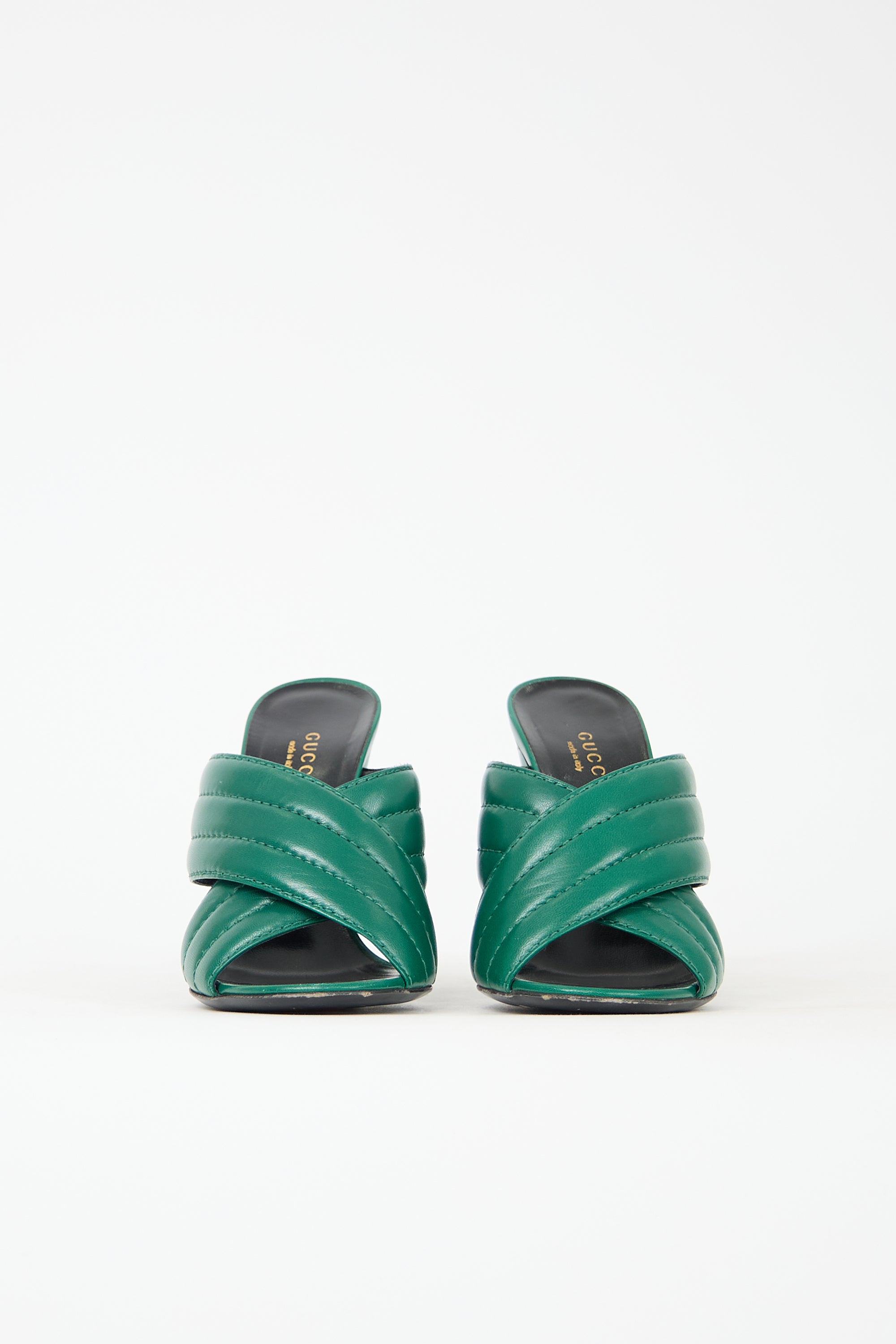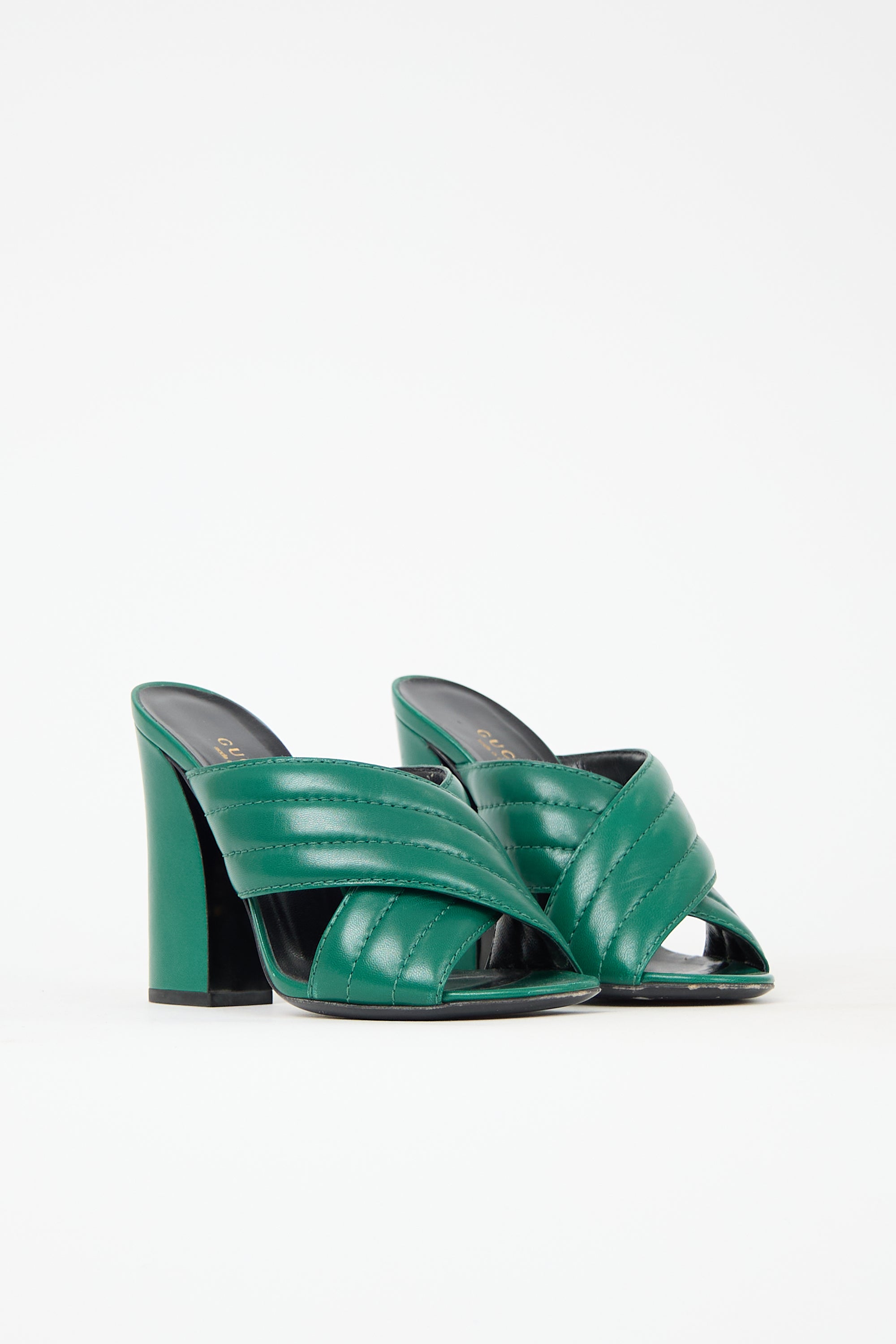 Pre-owned Gucci green leather Webby mules featuring rounded open toe, criss cross strap upper, slip on entry, and covered block heel.