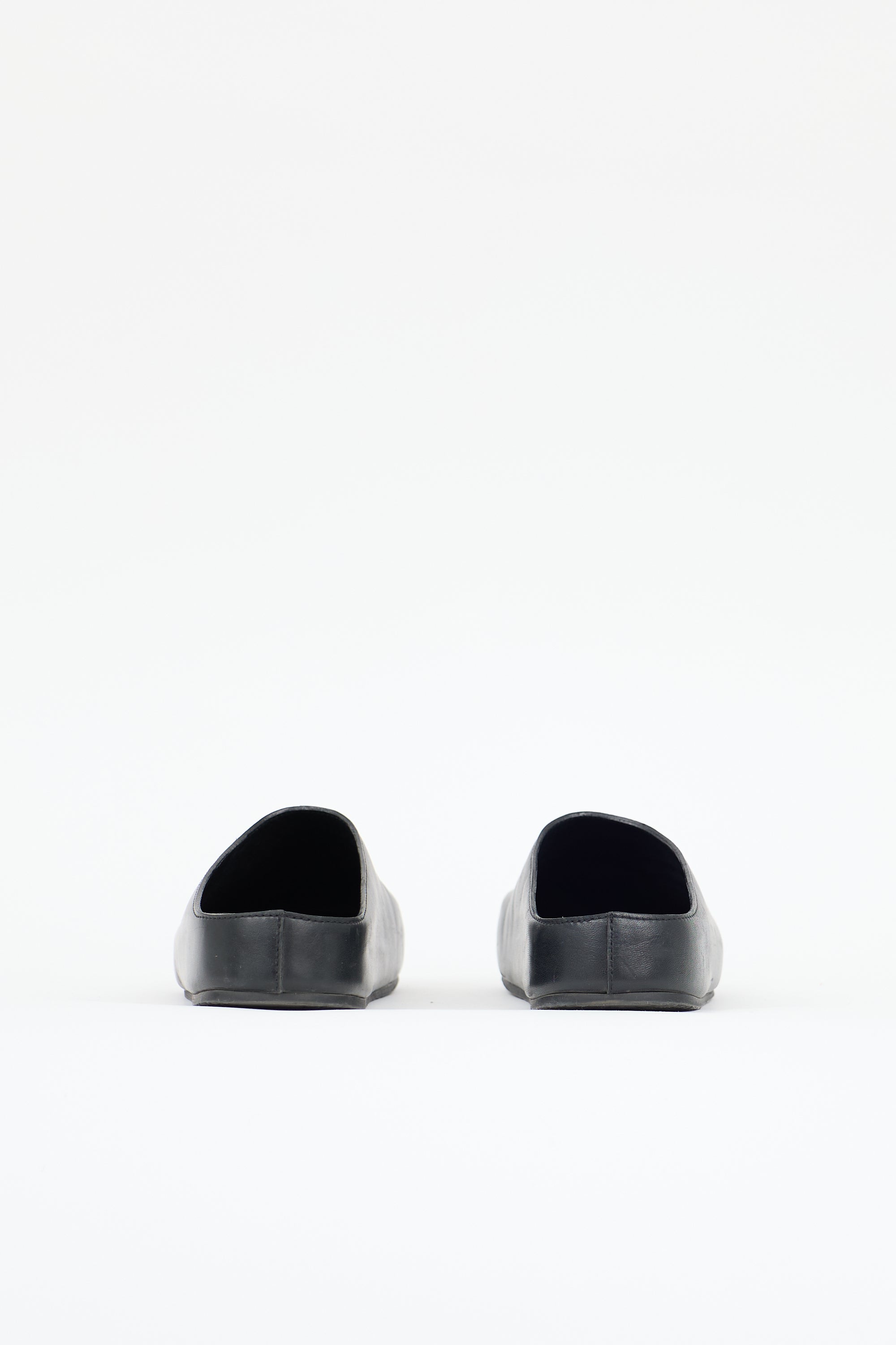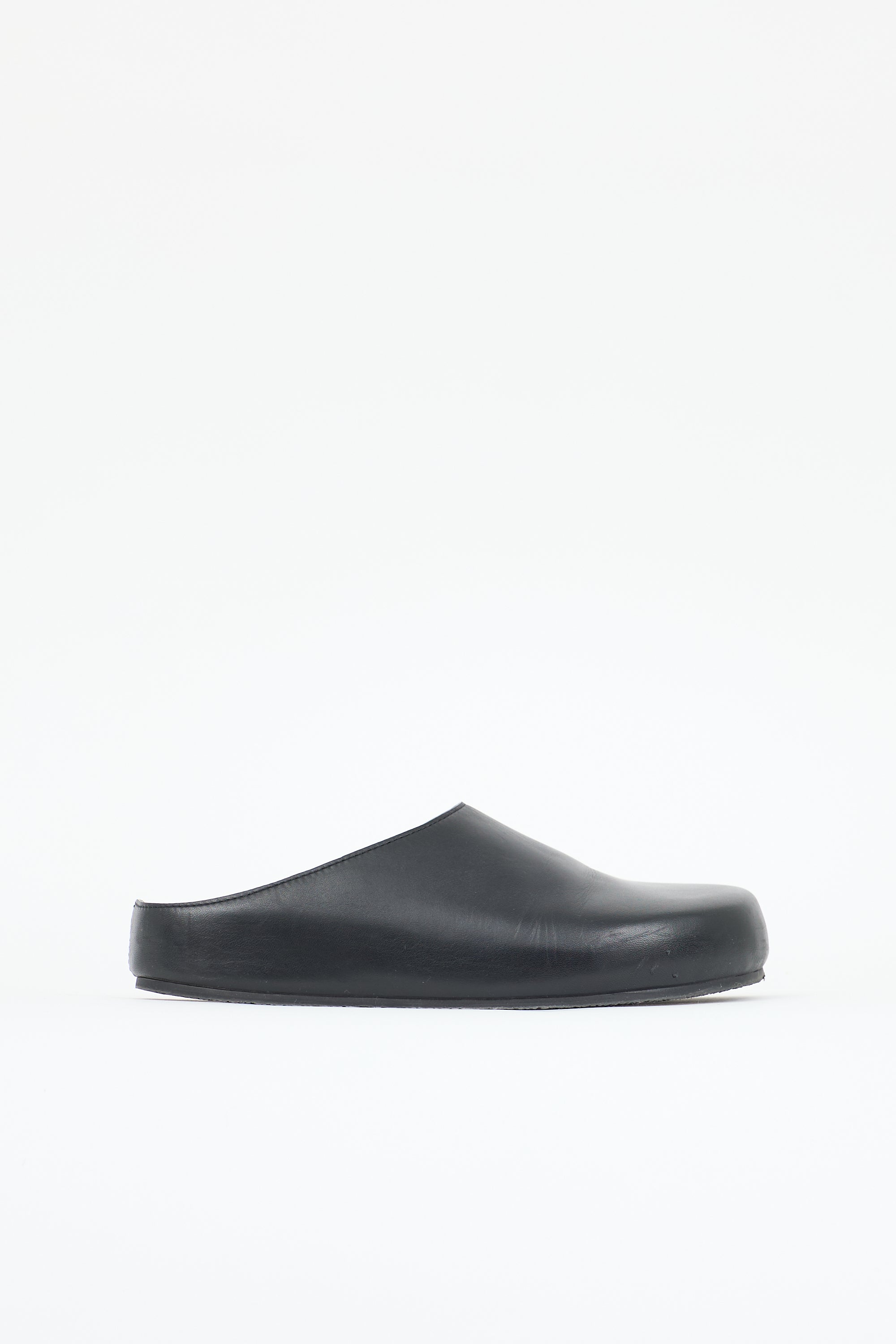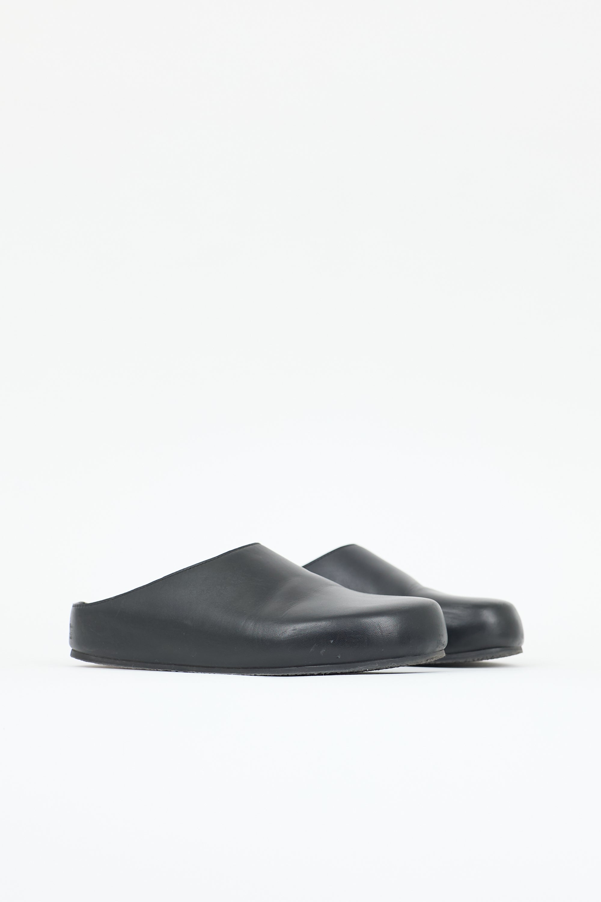 Pre-owned Studio Nicholson black leather Wearing Clog mules featuring a rounded toe, slip on entry, covered midsole, and a rubber crepe outsole.
