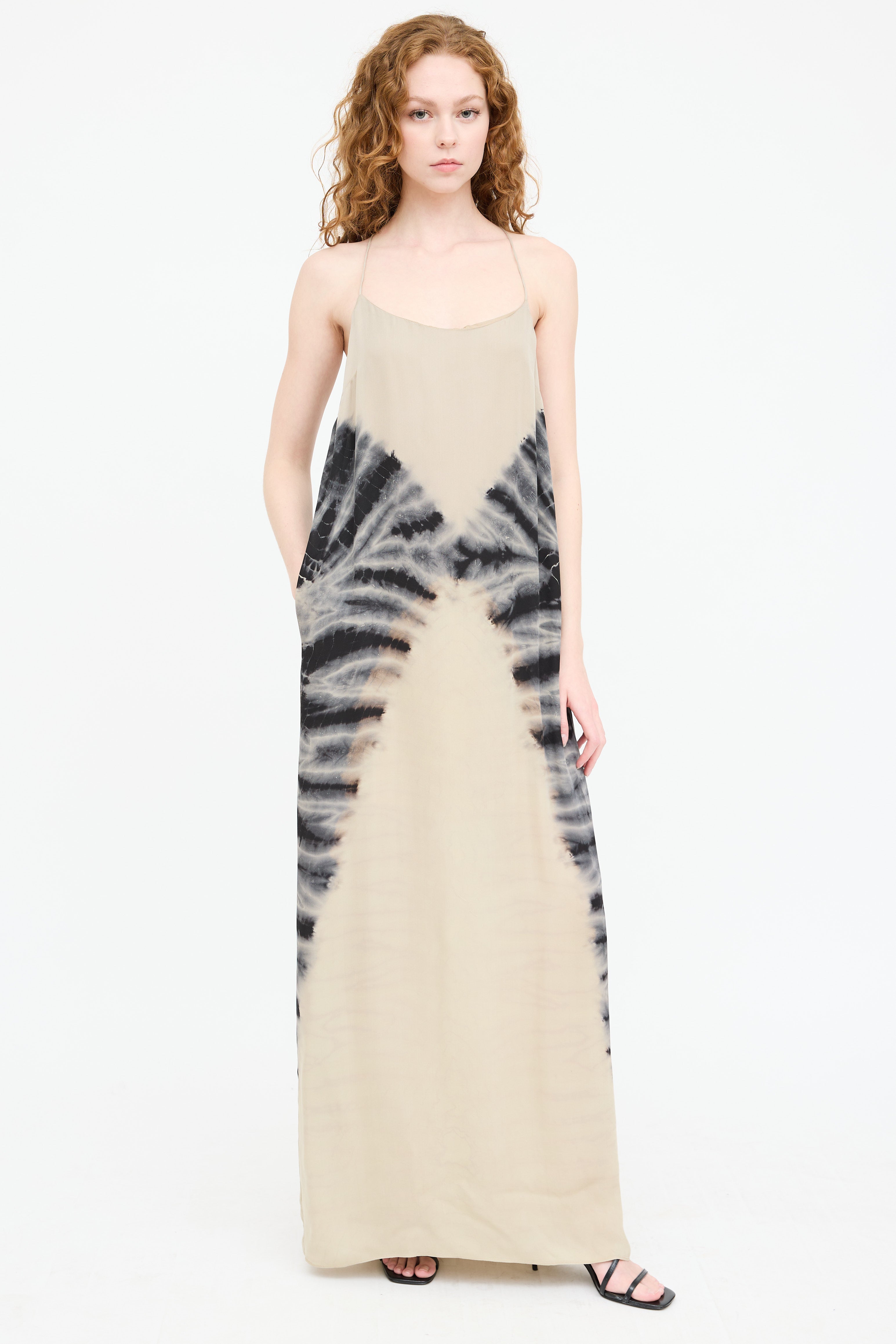 Pre-owned Raquel Allegra beige silk dress featuring a black tie dye pattern, round neckline, sleeveless styling, and two slip pockets at hip.