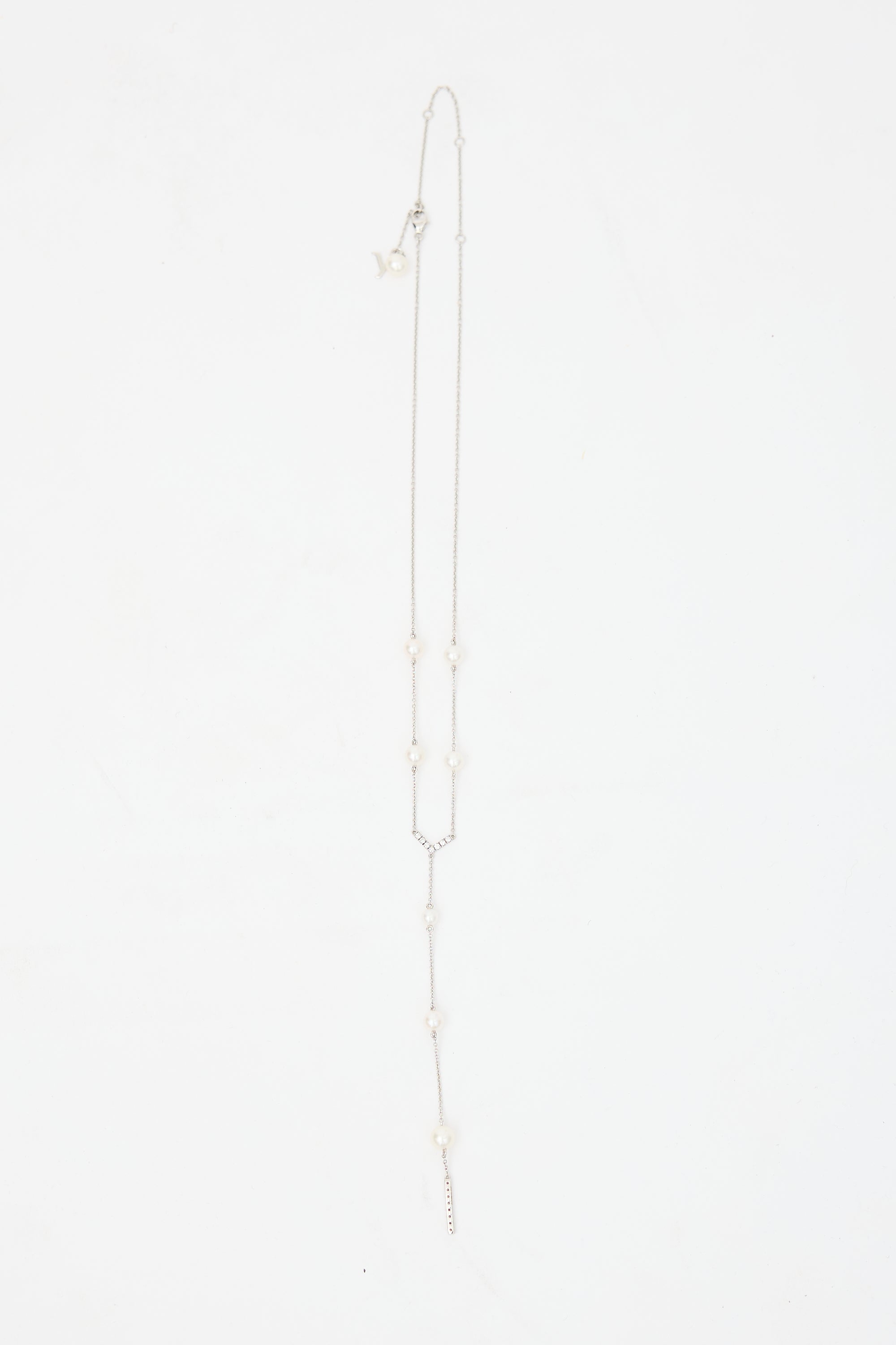 Pre-owned Yoko London V necklace featuring adjustable 18K white gold chain, drop design, eight freshwater pearls, VS diamond pavé accents, Y logo charm at one end, and lobster clasp closure. Comes with original box, wooden case, and certificate of authenticity card.