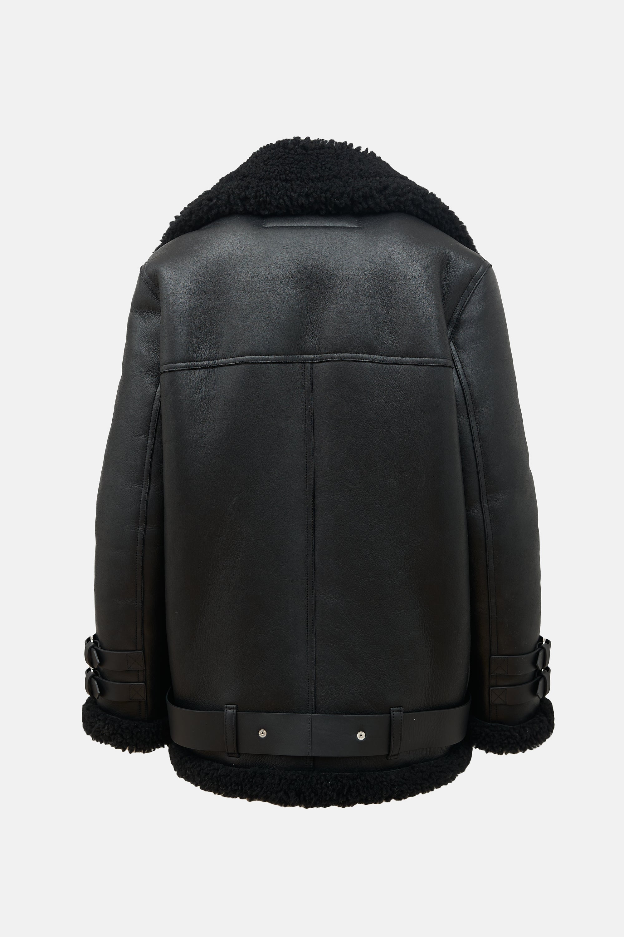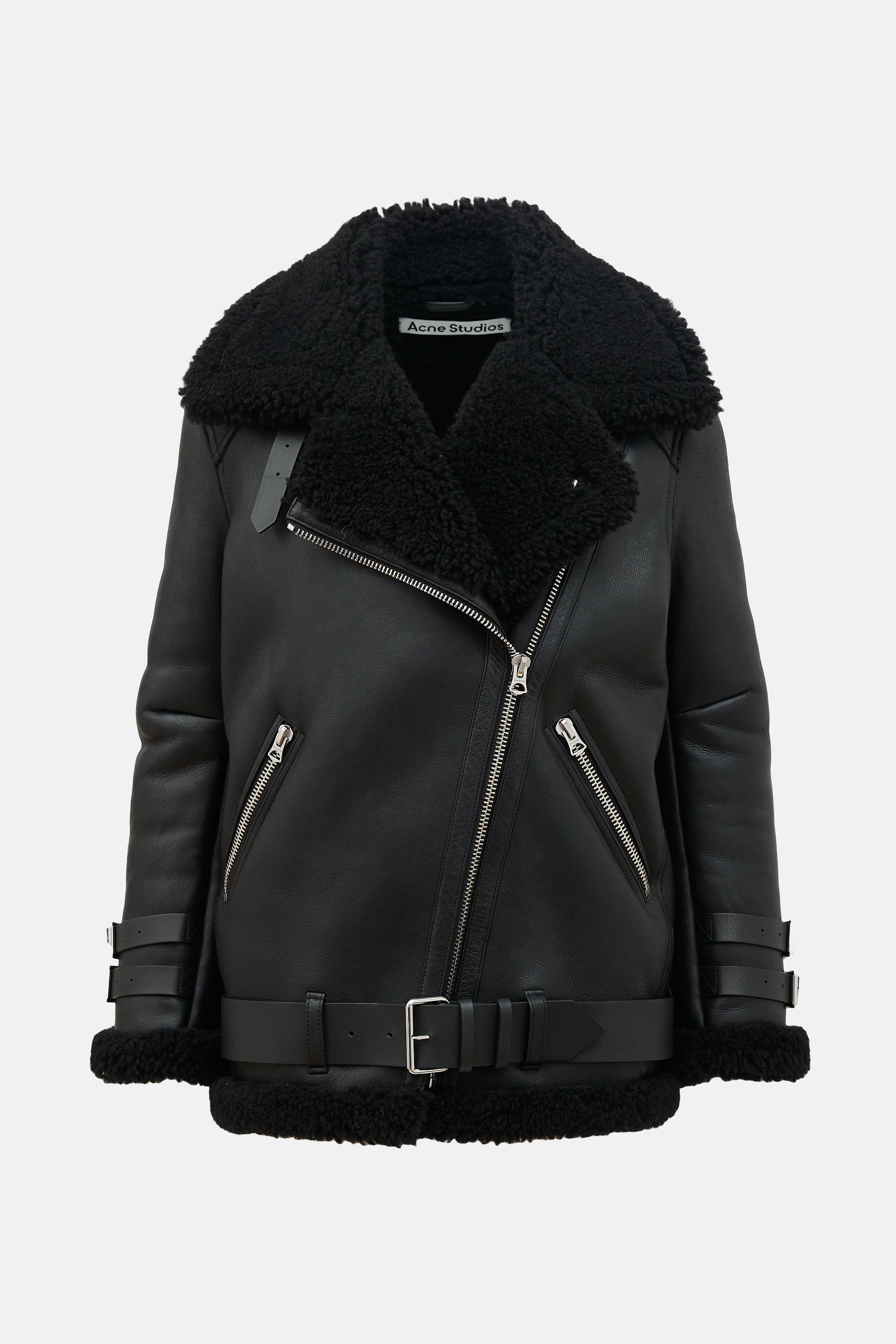 Pre-owned Acne Studios black shearling Velocite jacket featuring soft leather exterior, wide notched lapel with adjustable strap at neck, asymmetrical zip front, two zip pockets, belted cuffs, and adjustable belt at hem.