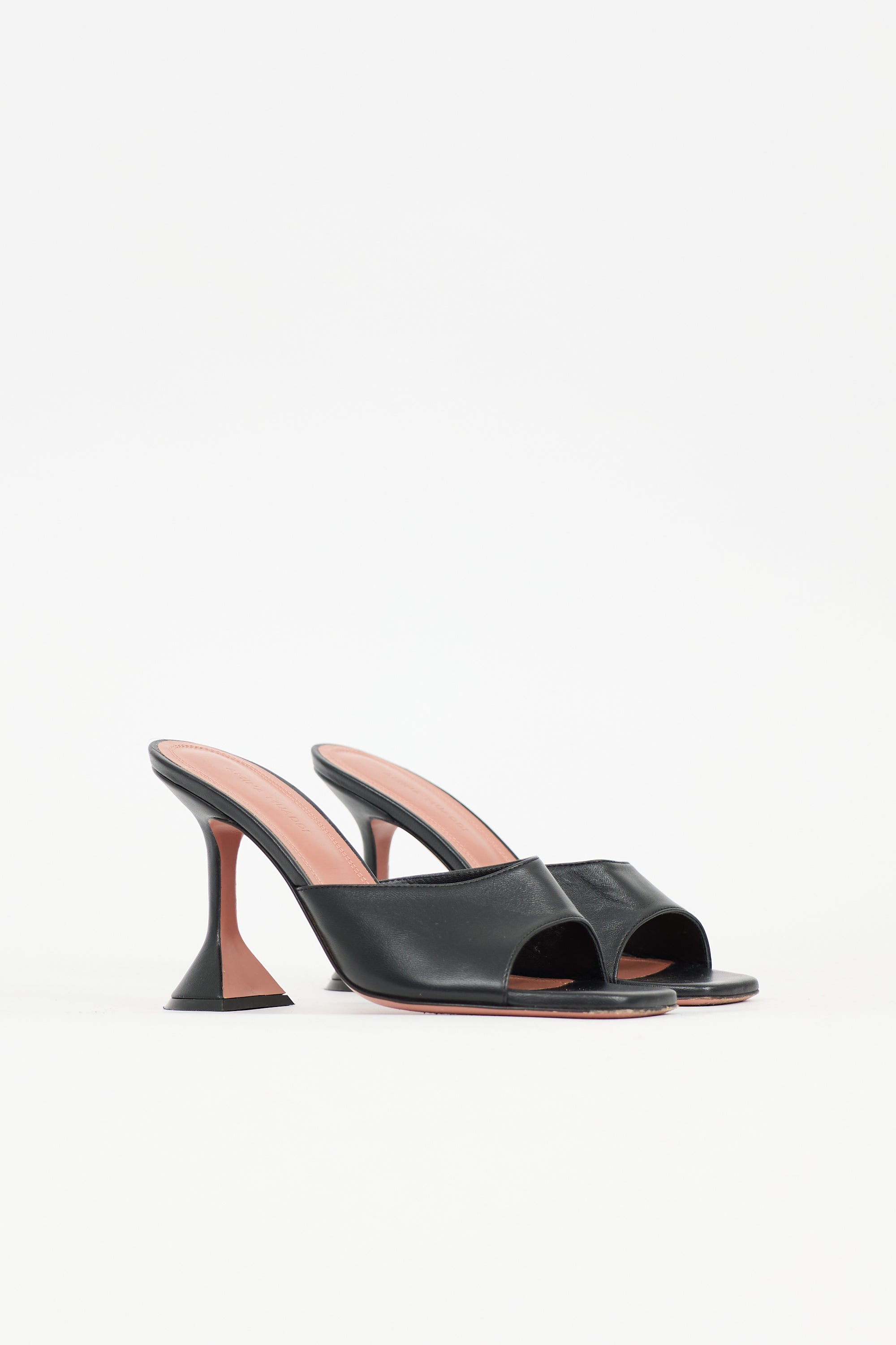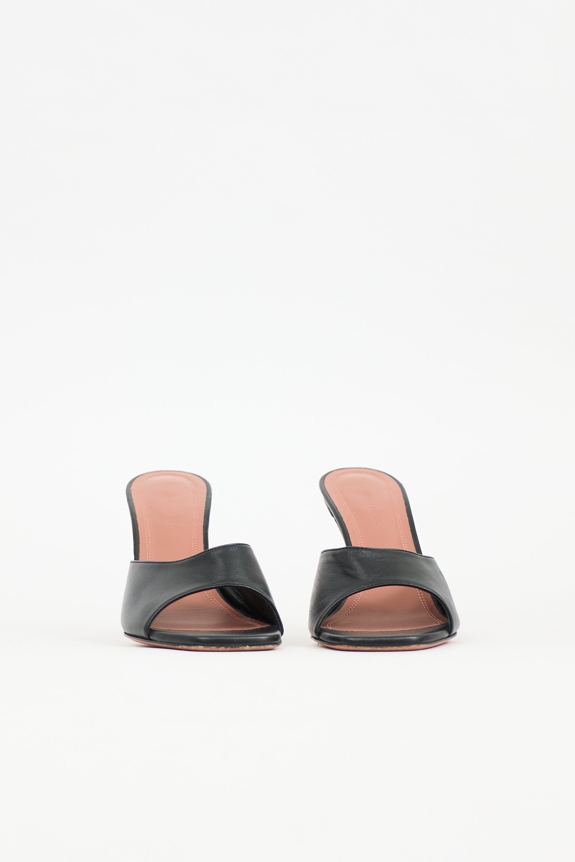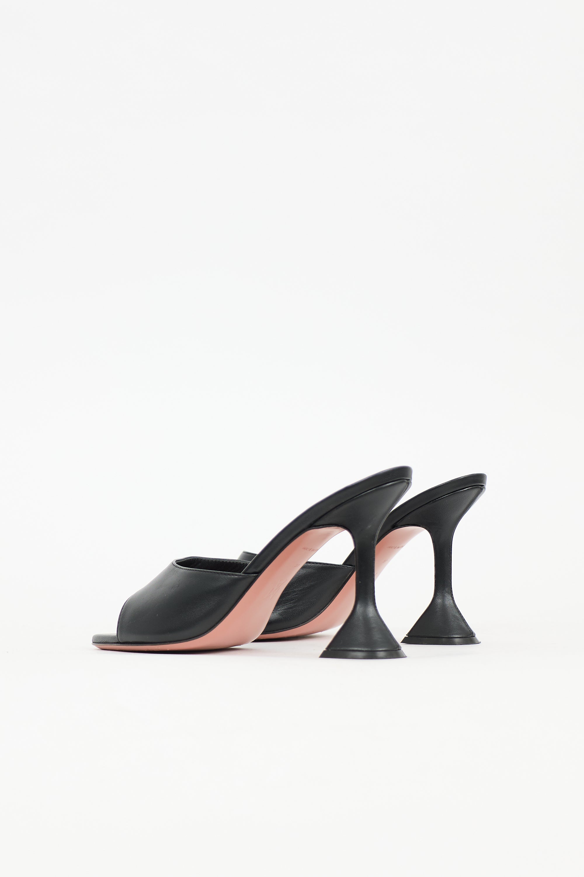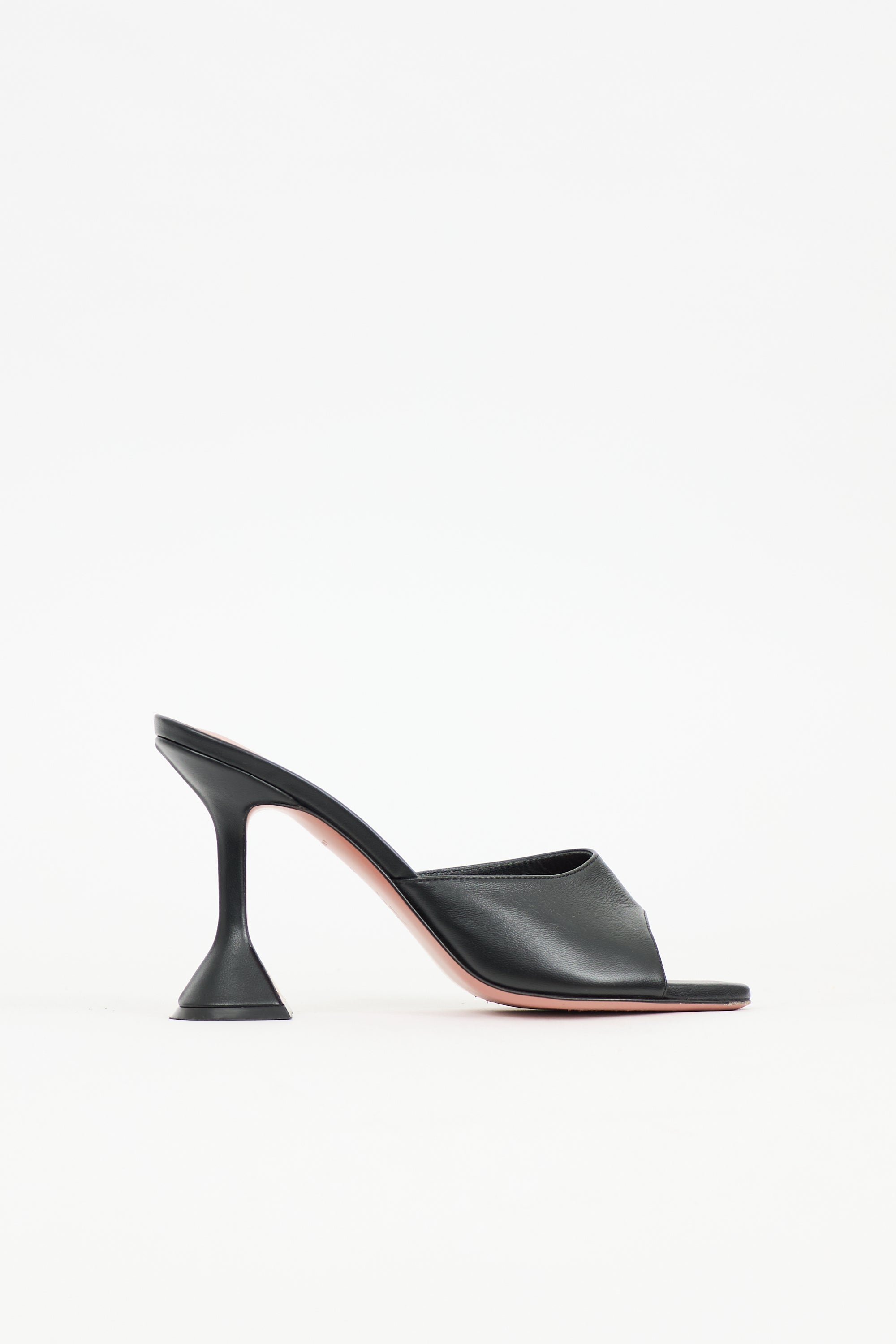 Pre-owned Amina Muaddi black leather Lupita mules featuring open square toe and martini heel. Includes original dust bag.