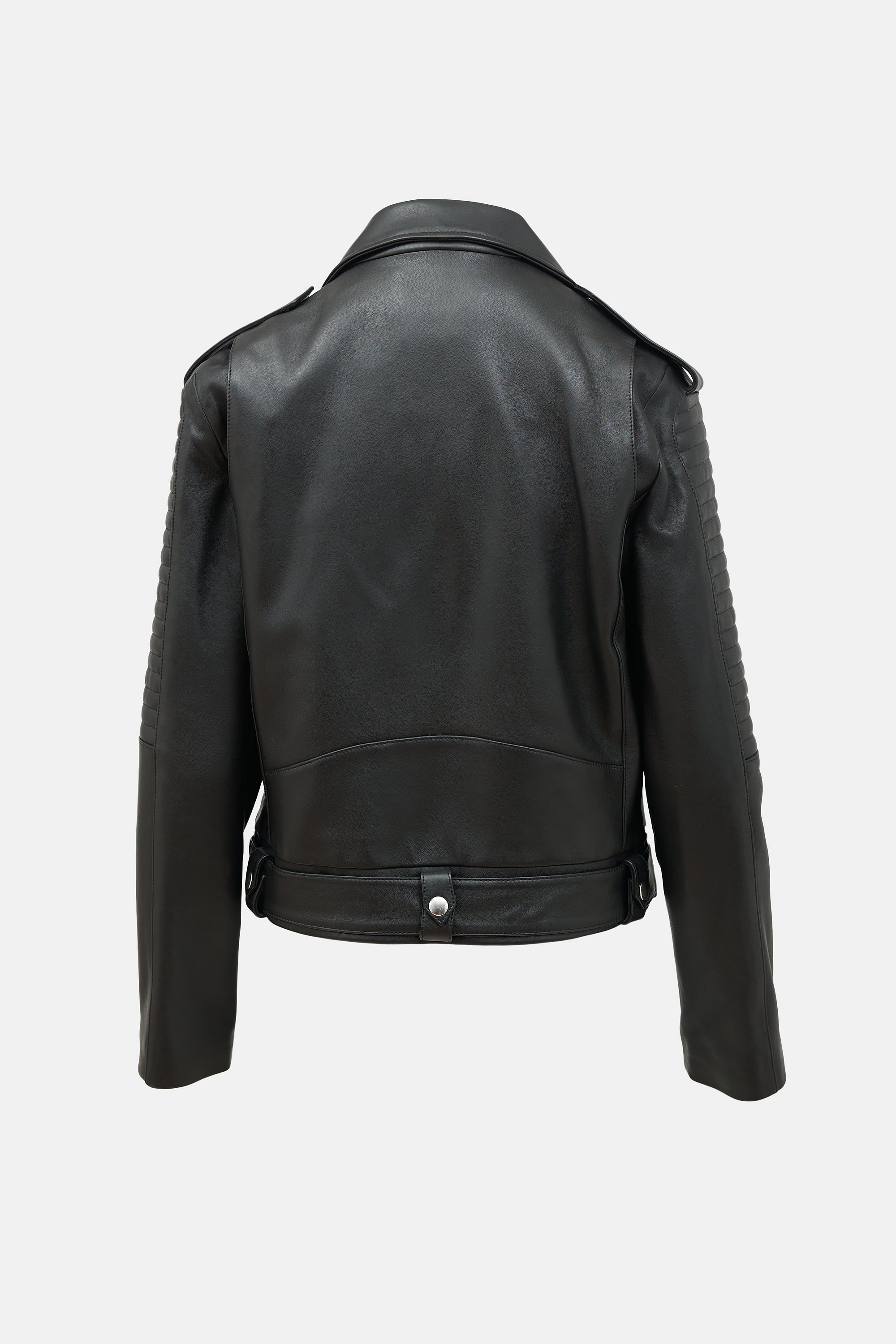 Pre-owned Anine Bing black leather moto jacket featuring a notched lapel, asymmetric two way zip front, two zip pockets at front, faux zip detail at front, epaulettes, padded sleeves, and belt at hem. Lined.
