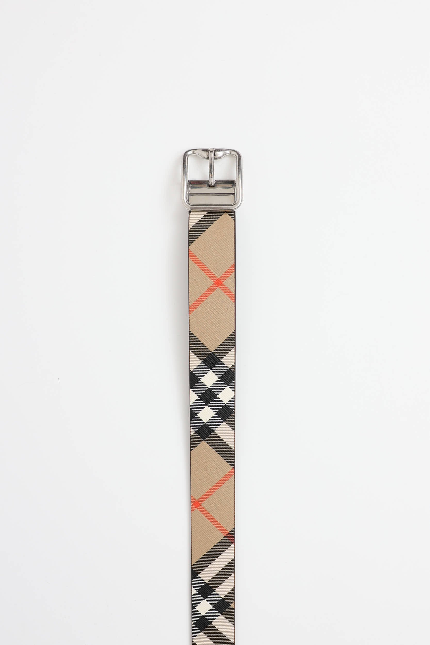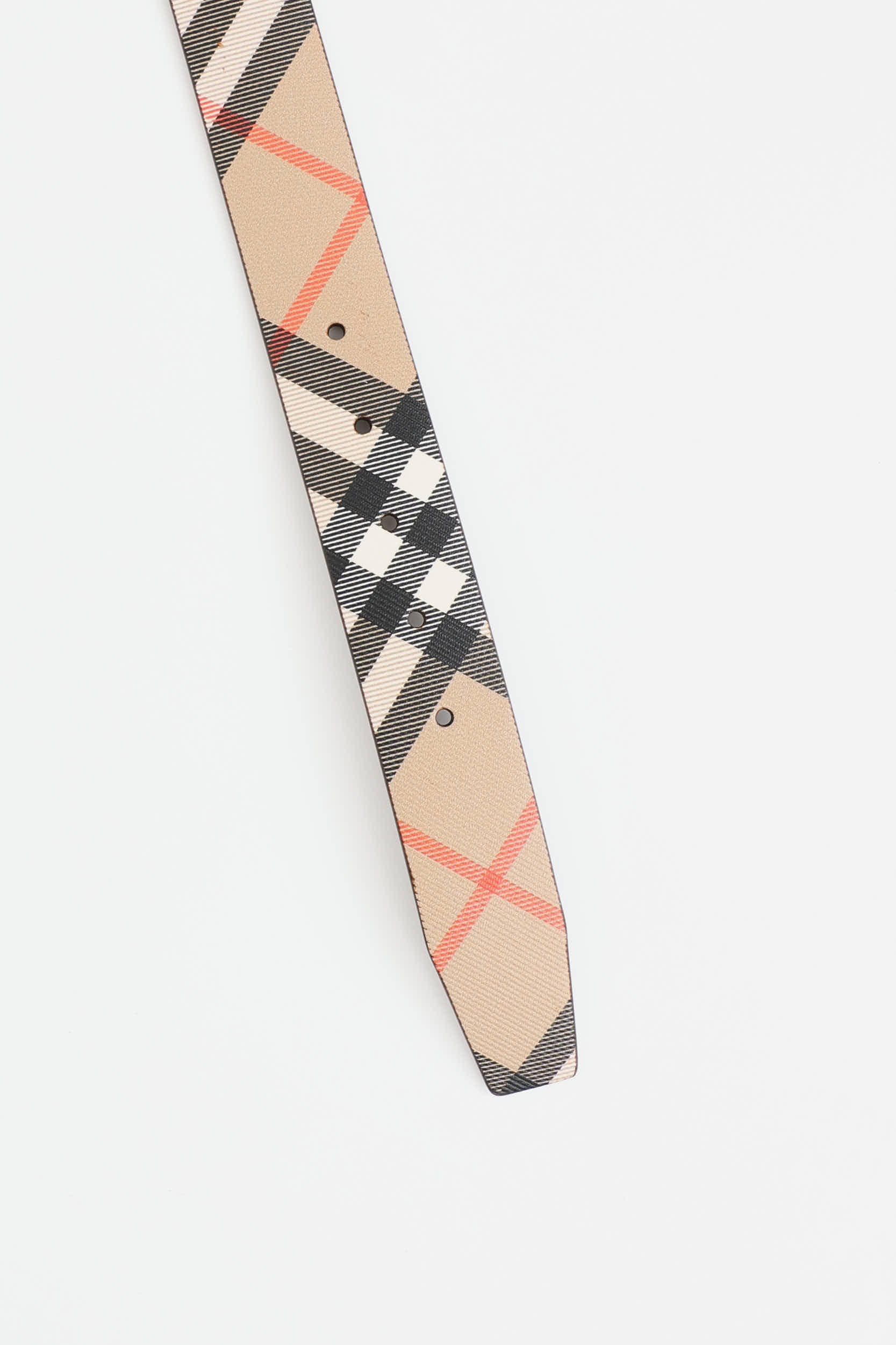 Pre-owned Burberry beige reversible belt featuring a nova check pattern throughout, stamped logo at interior, and silver tone buckle closure. Includes original dust bag.