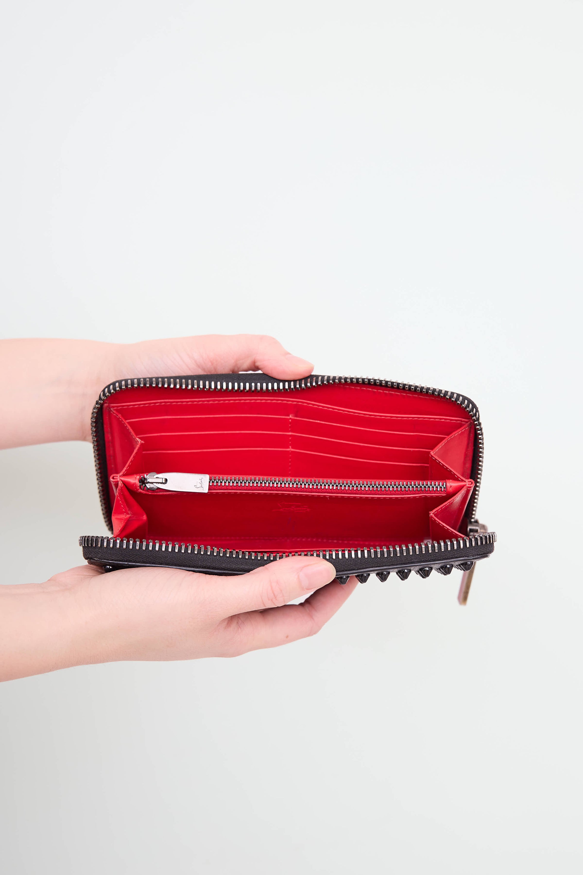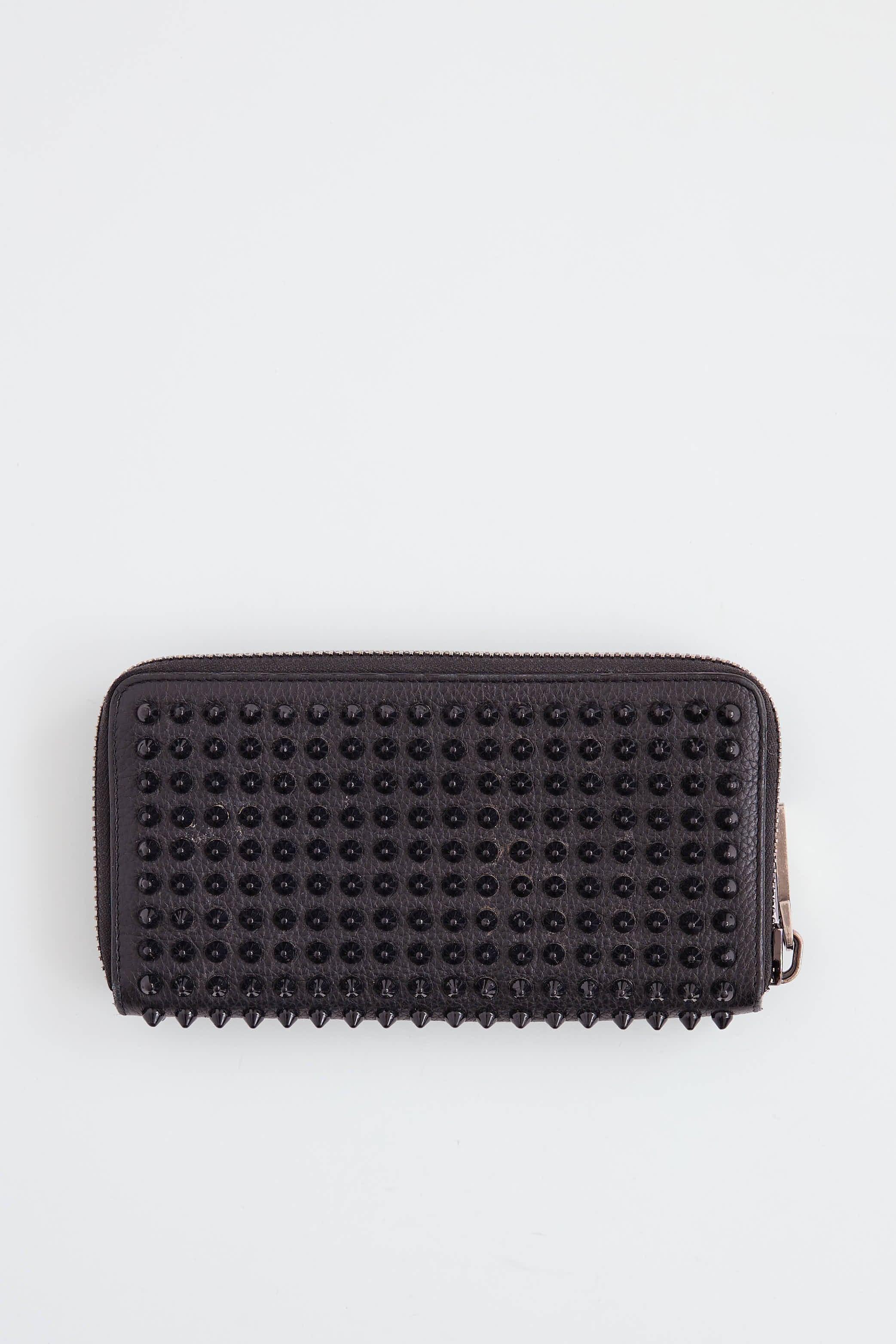 Pre-owned Louboutin black Panettone wallet featuring black metallic studs, zip around closure, red leather interior, sixteen card slots, and one zip pocket at middle.