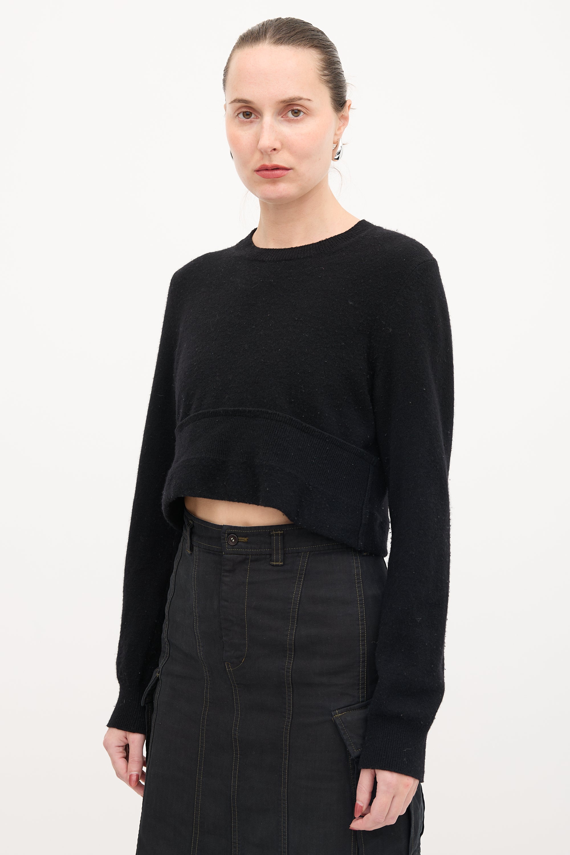 Pre-owned Comme des Garçons Fall/Winter 2020 black wool cropped sweater featuring crew neckline and ribbed collar, hem, and cuffs.