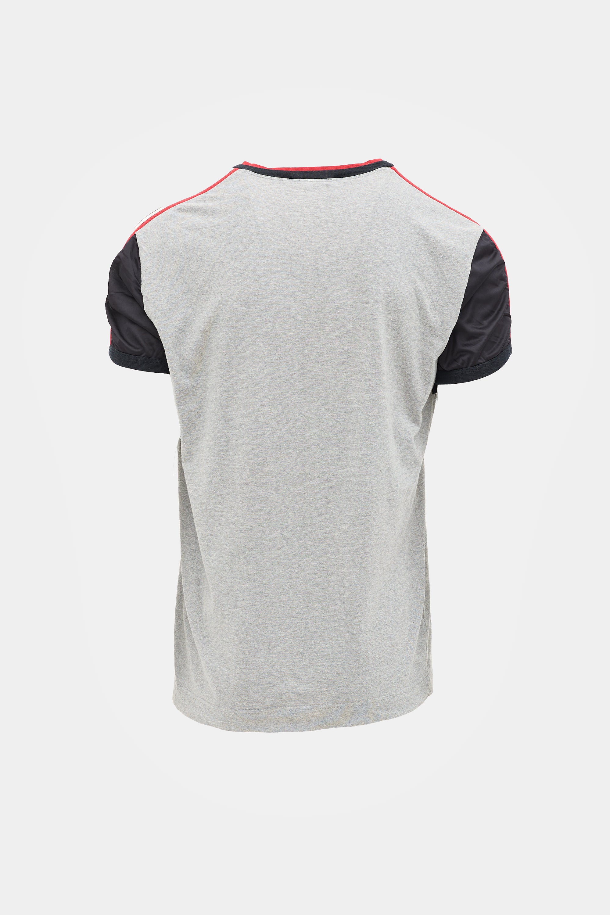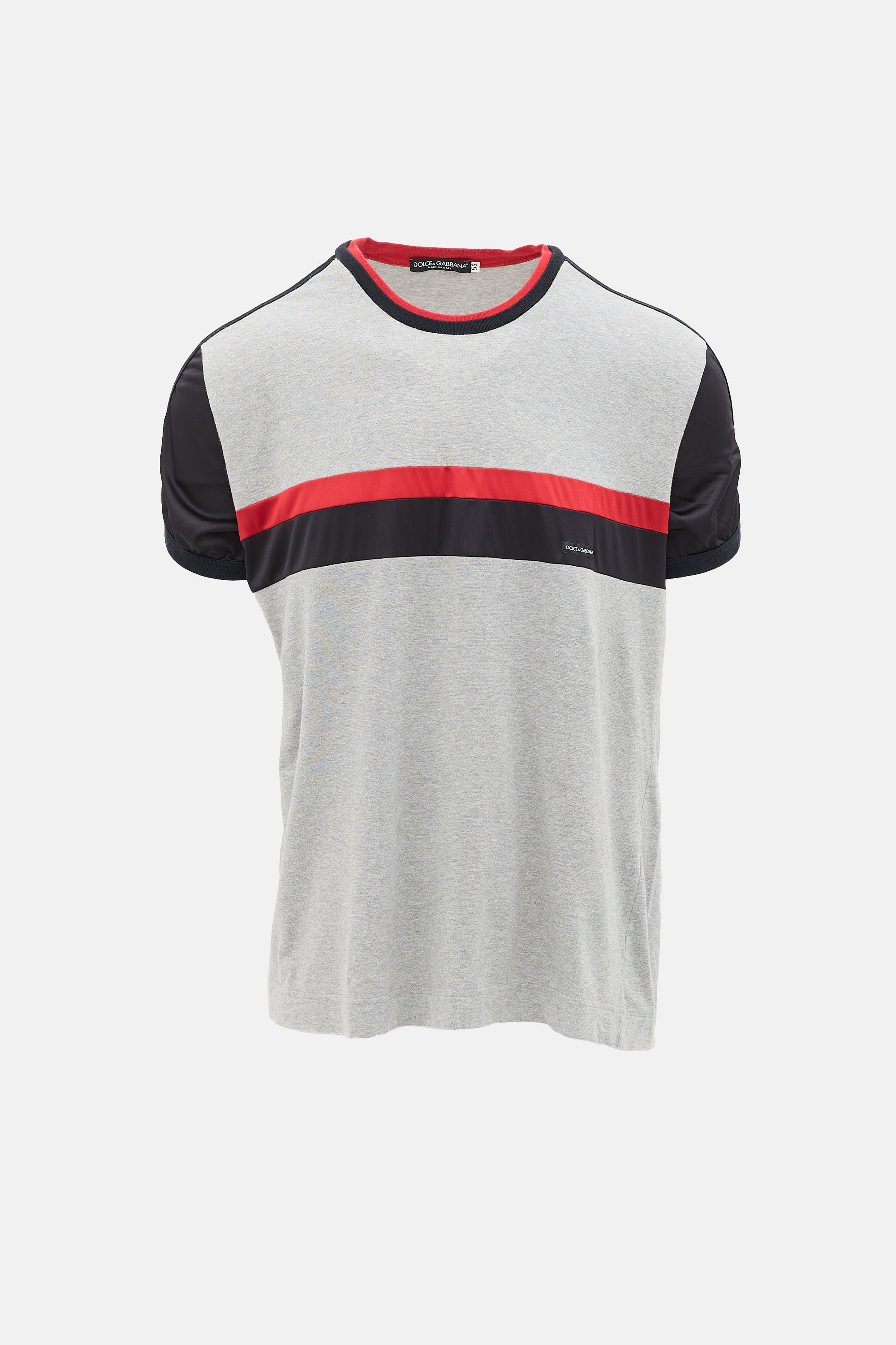 Pre-owned Dolce & Gabbana heather grey T-shirt featuring layered crew neckline, red, black, and white stripe trim, and logo tab at left chest.
