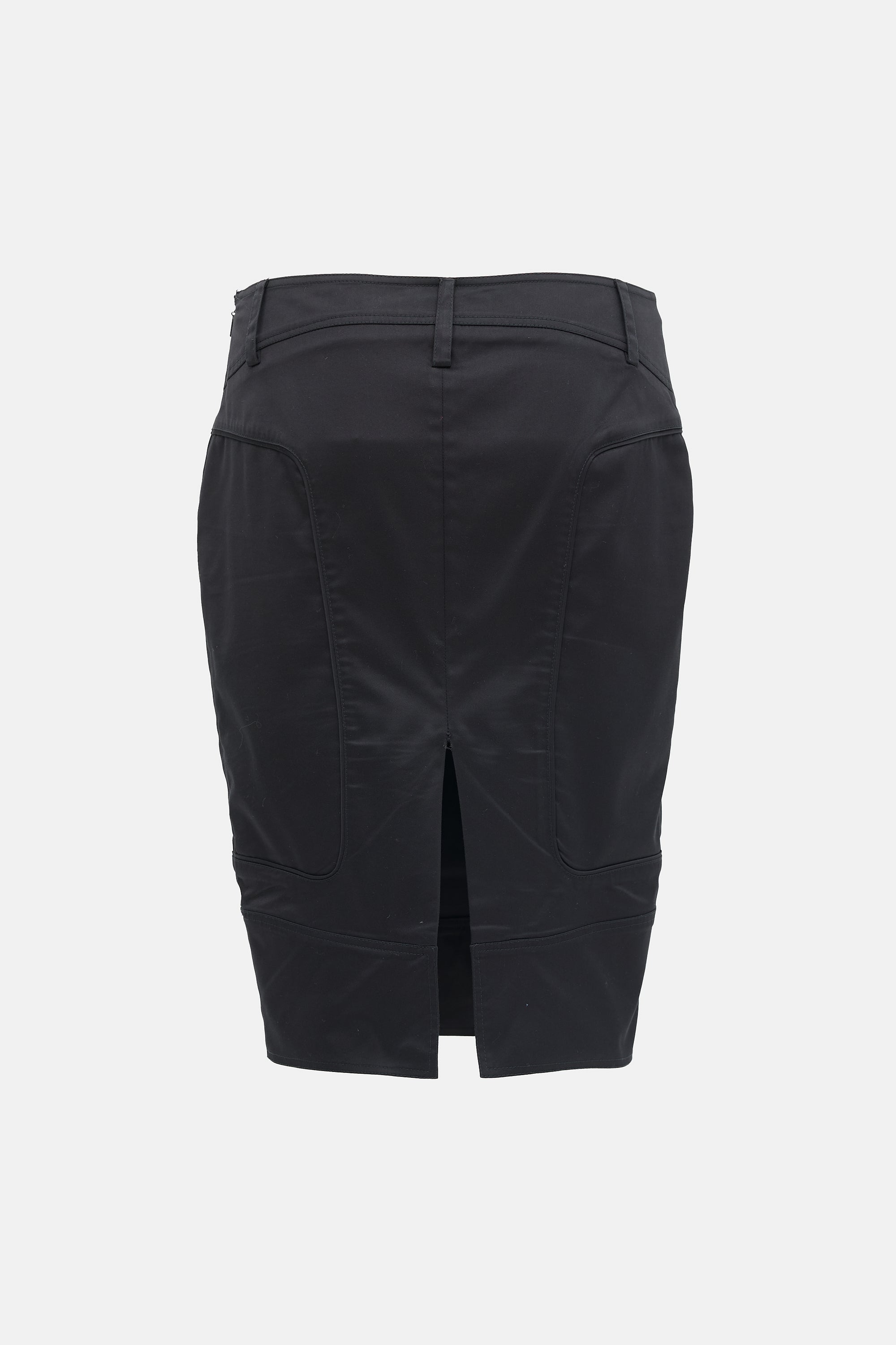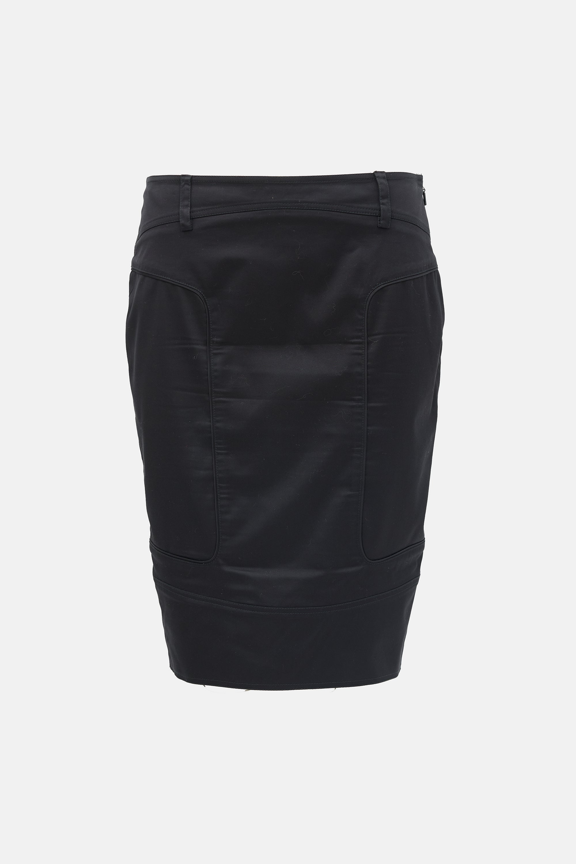 Pre-owned Gucci 2003 black satin pencil skirt featuring a panelled design, side zip, belt loops, and back vent. Tom Ford era design.