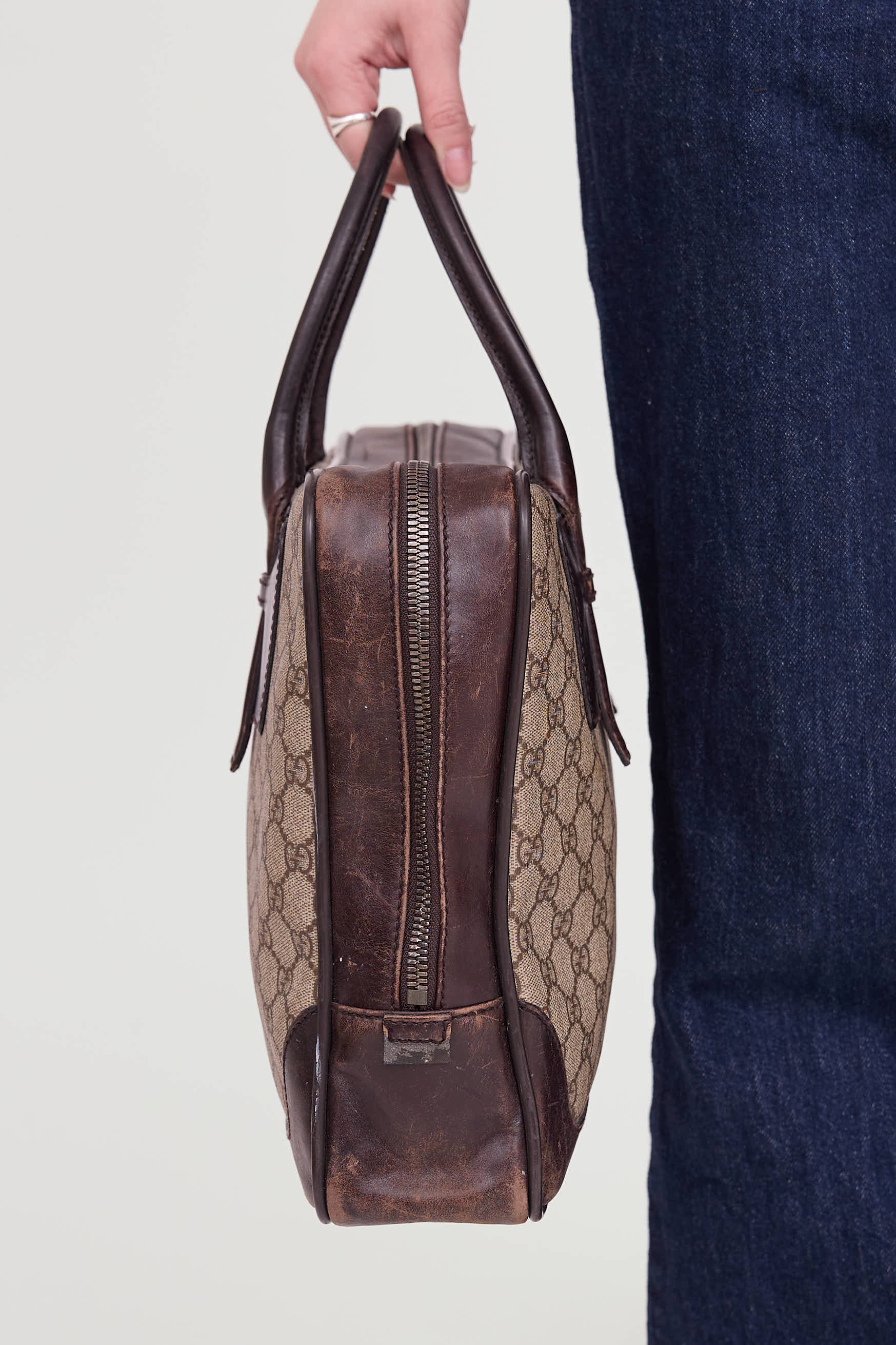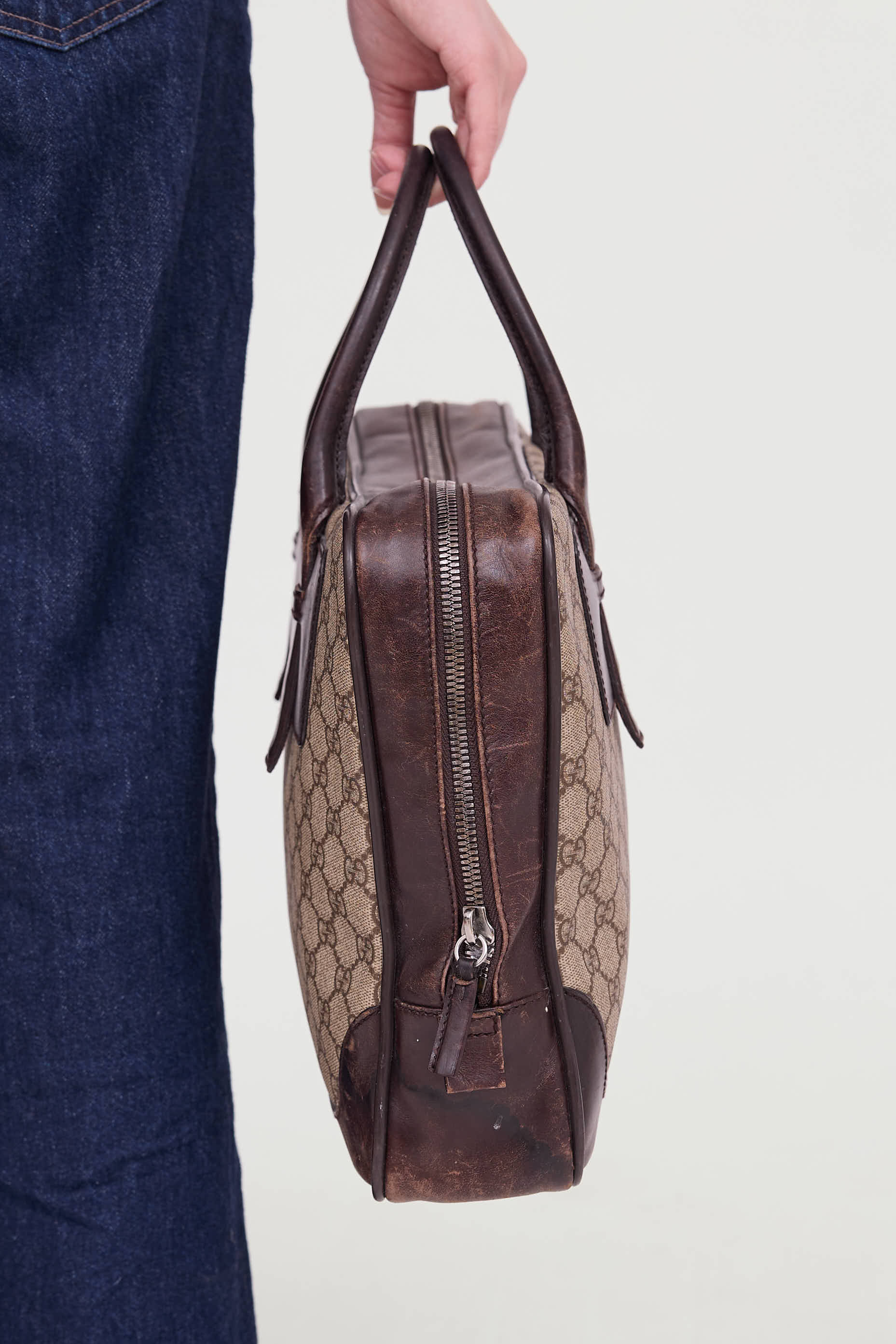 Pre-owned Gucci brown GG Supreme briefcase featuring two leather rolled top handles, top zip closure, textile lined interior, single flat pocket, zip pocket, two leather pen pockets and card slot.