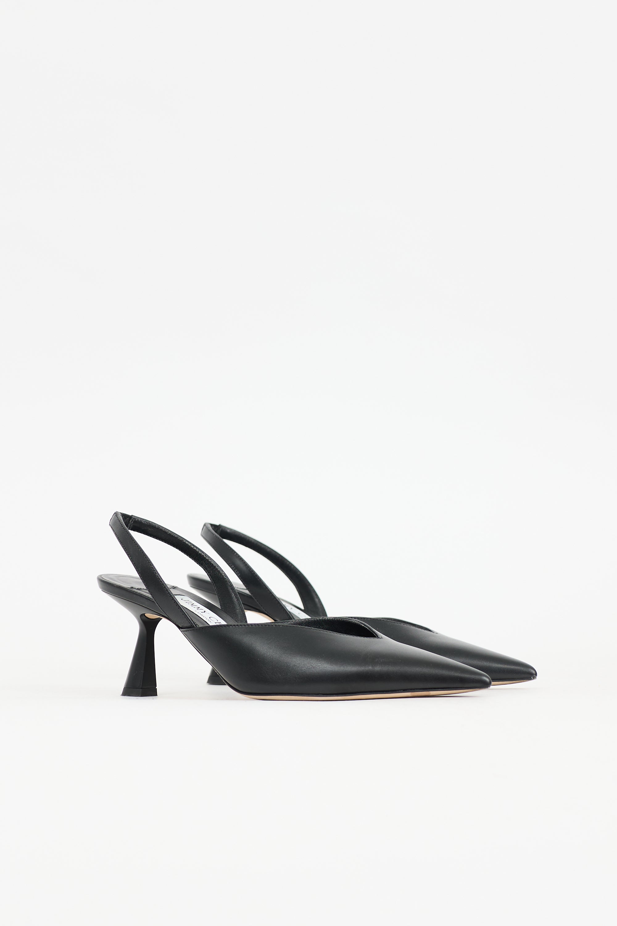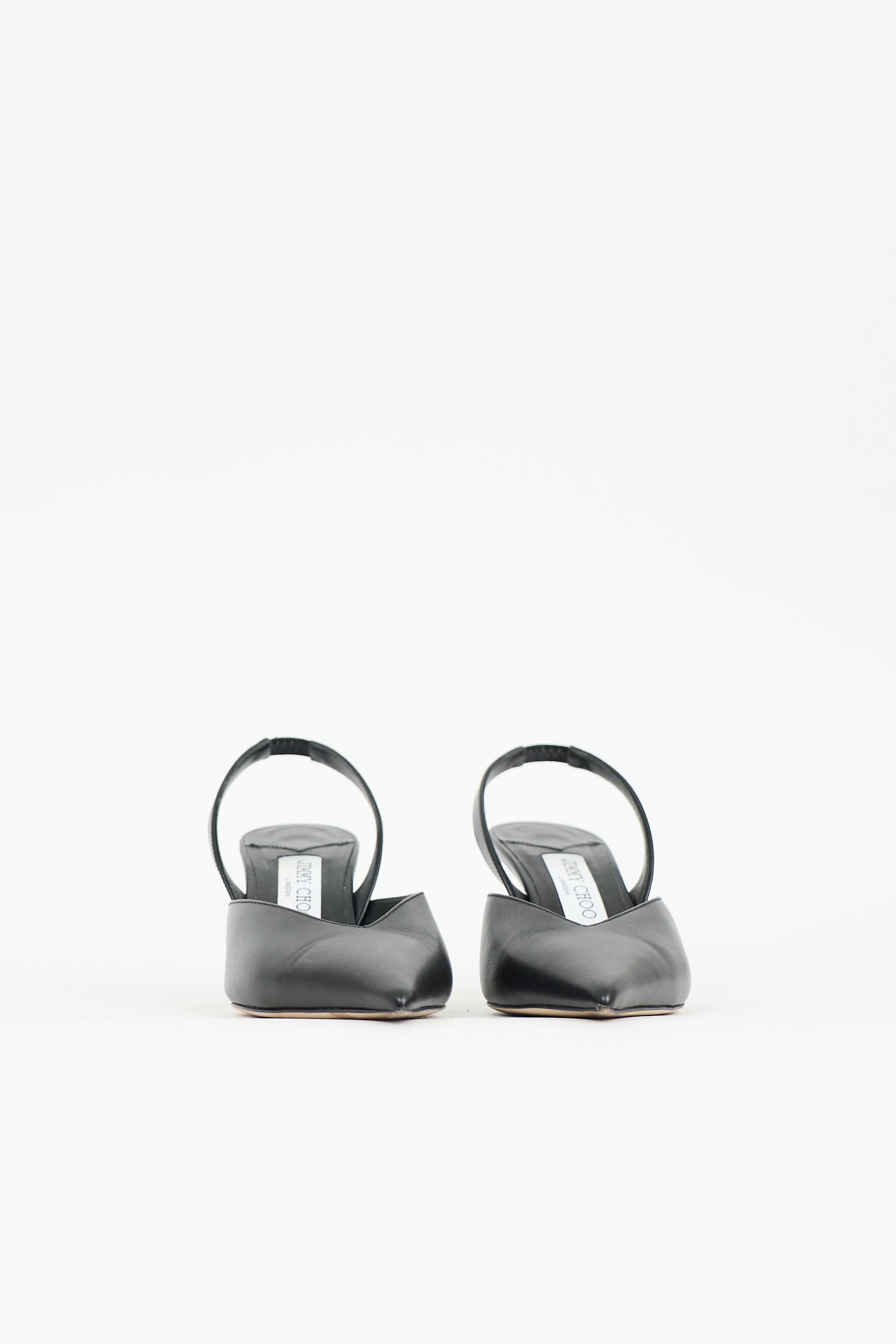 Pre-owned Jimmy Choo black leather Maryanne heels featuring pointed toe, slingback strap, and comma heel. Includes original dust bag.