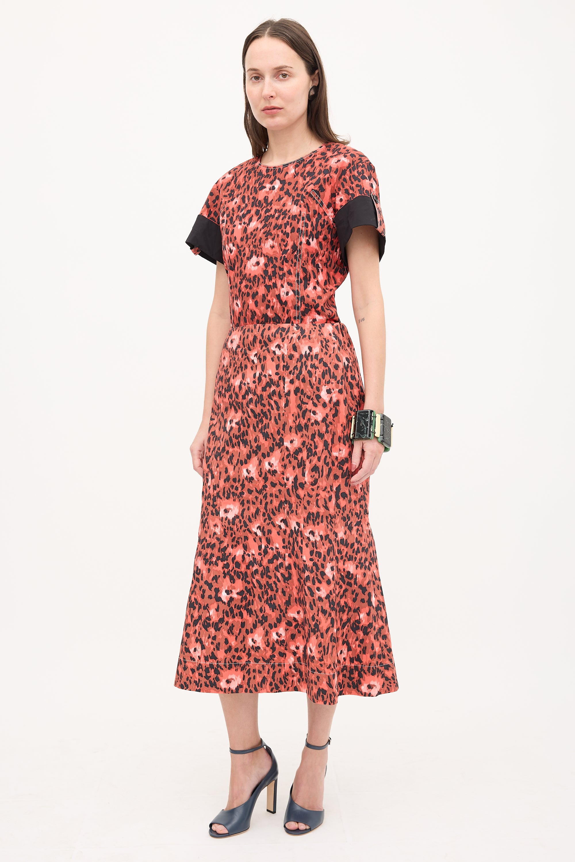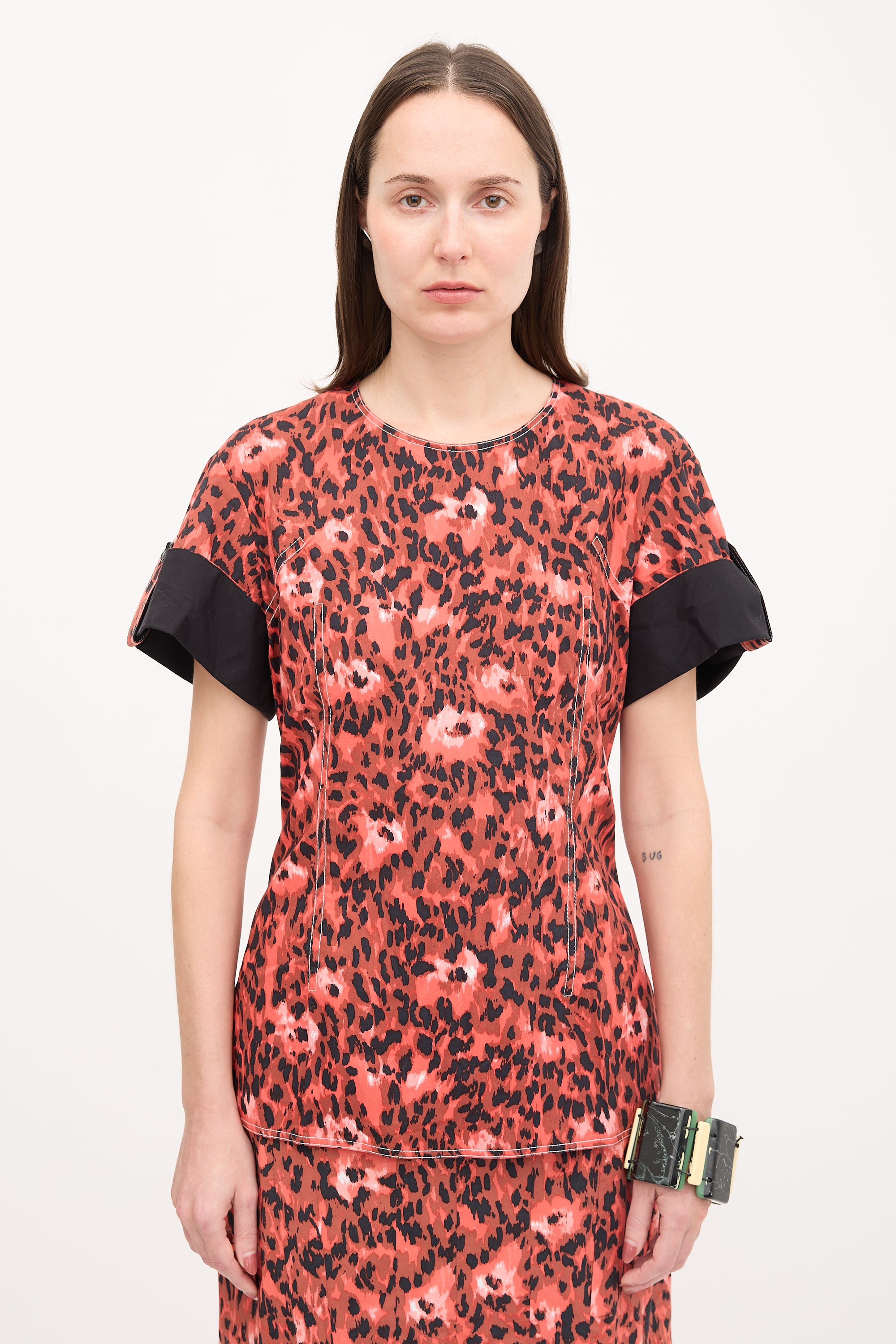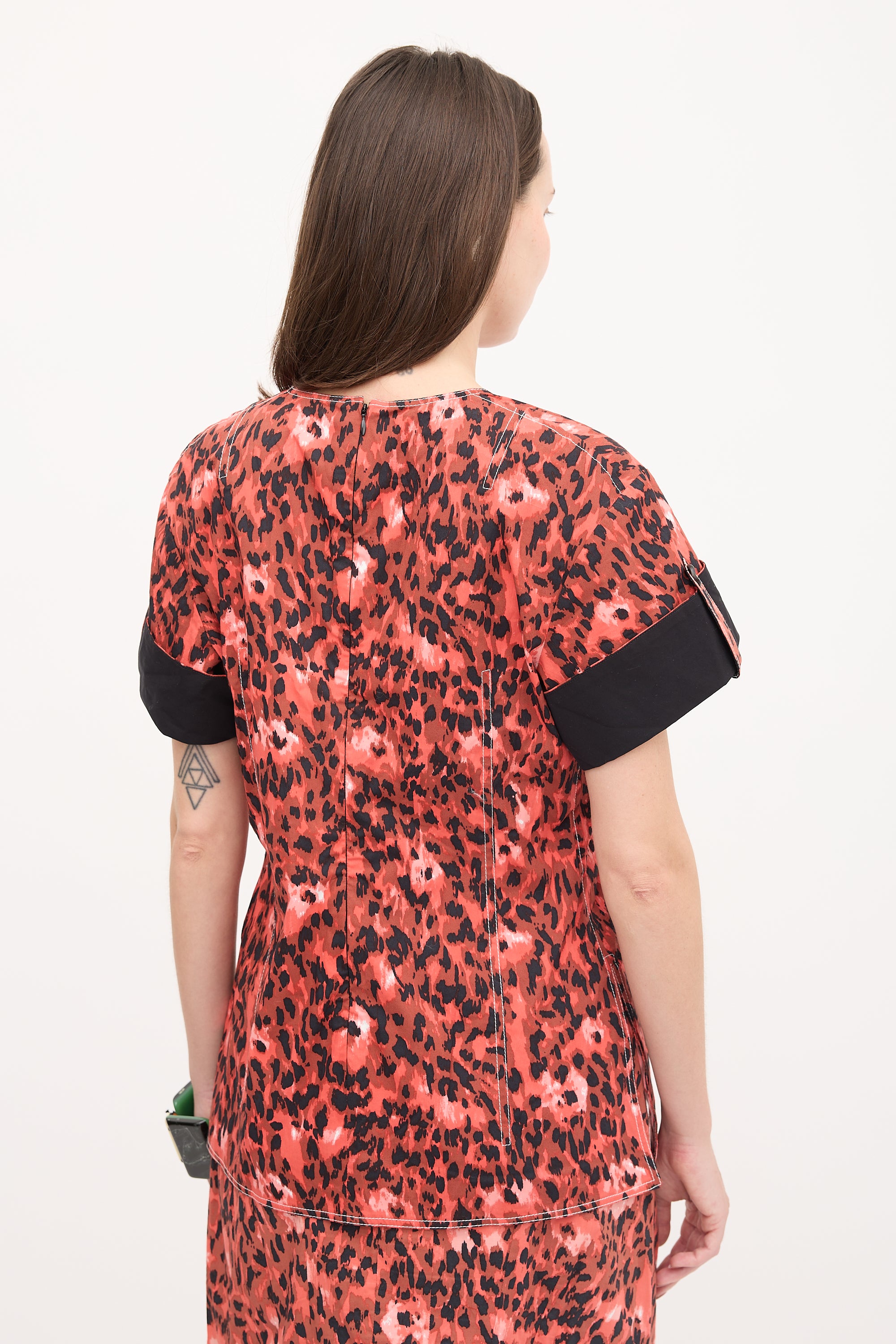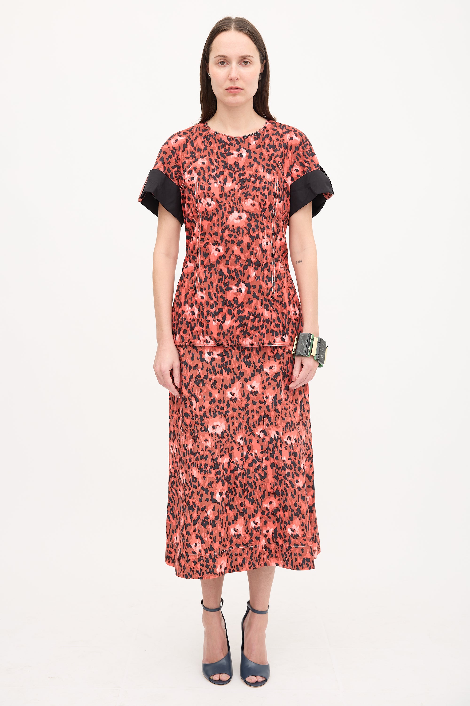 Pre-owned Marni red and black leopard print co-ord set featuring top with round neckline, in seam pockets, concealed back zip closure, and folded cuffs with contrast facing and buttoned strap detail. Matching midi skirt features high waist, flared silhouette, and concealed side zip closure.