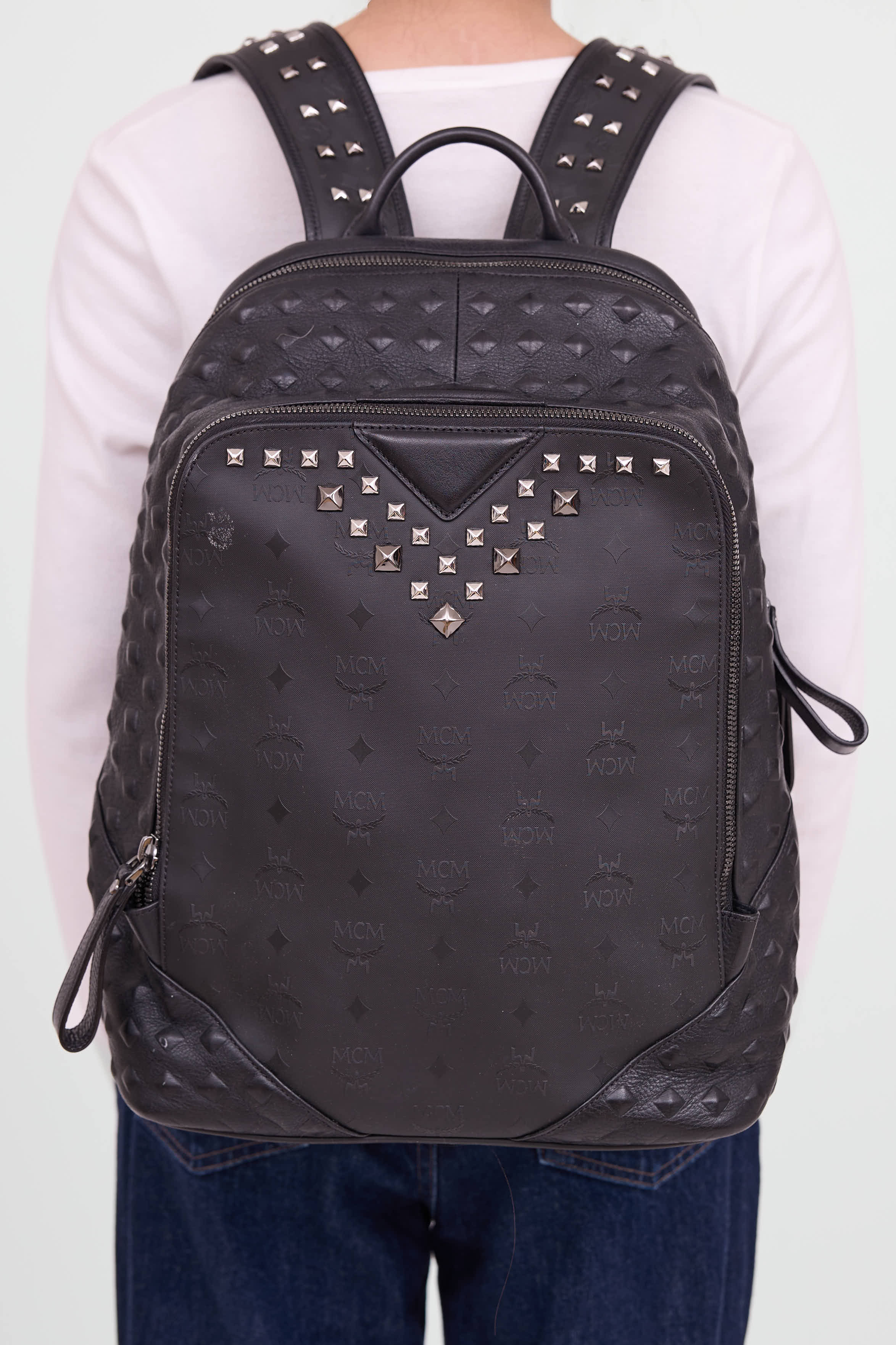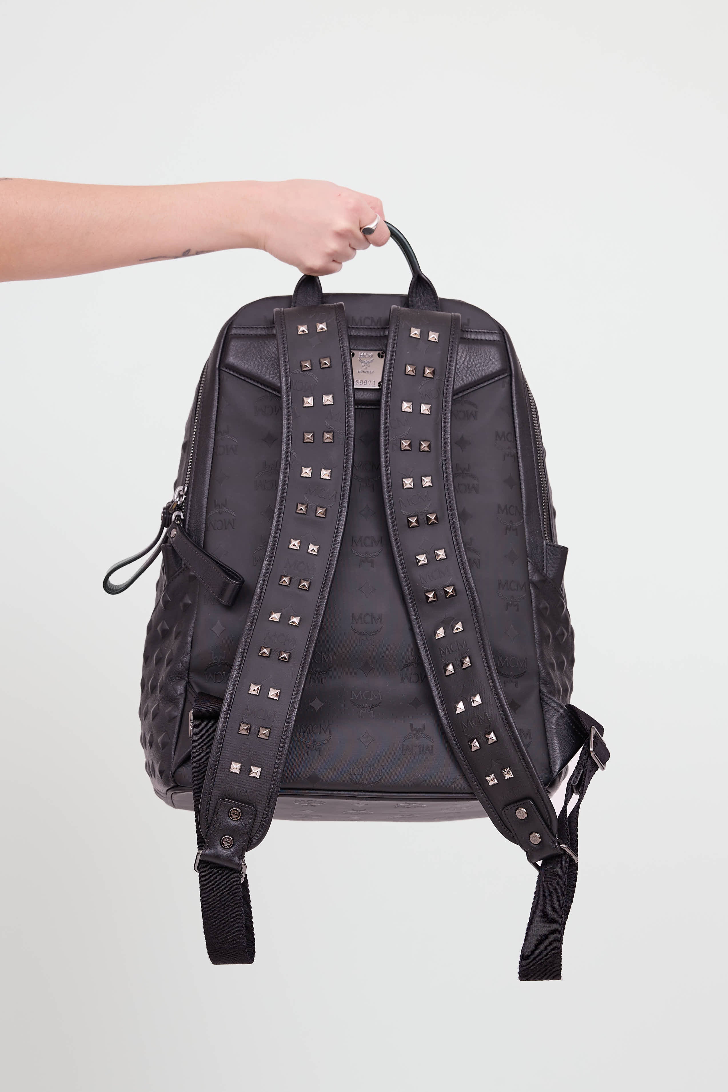Pre-owned MCM black Duke studded backpack featuring monogram logo and rockstuds throughout, singular rolled top handle, adjustable backpack straps, zip pocket at face with one main compartment, five slip pockets, one interior pen pocket, top zip closure with one main compartment, 11" laptop divider and one zip pocket.