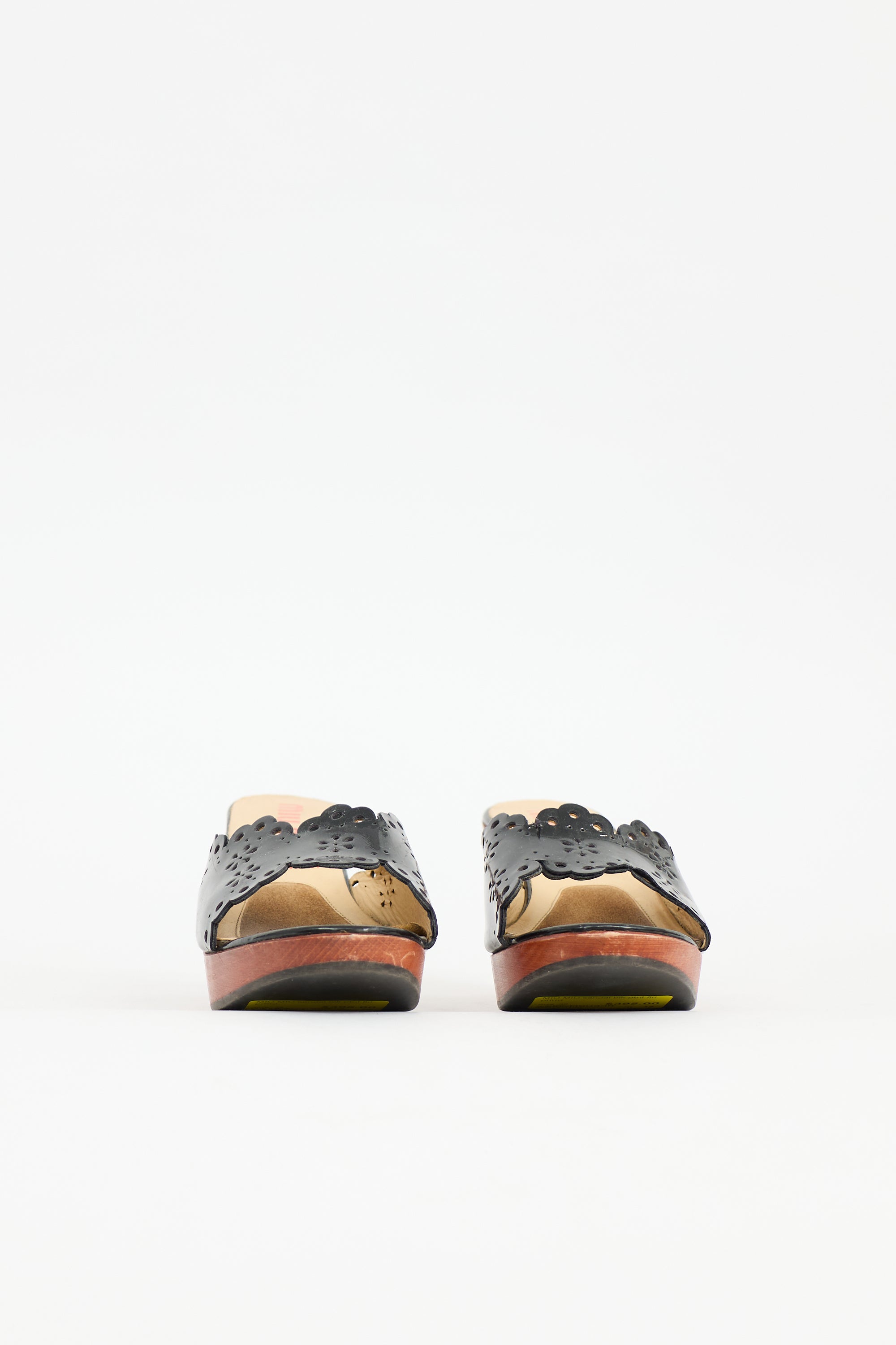 Pre-owned Miu Miu vintage black patent leather sandals featuring open rounded toe, laser cut vamp strap, and wooden heel and midsole.