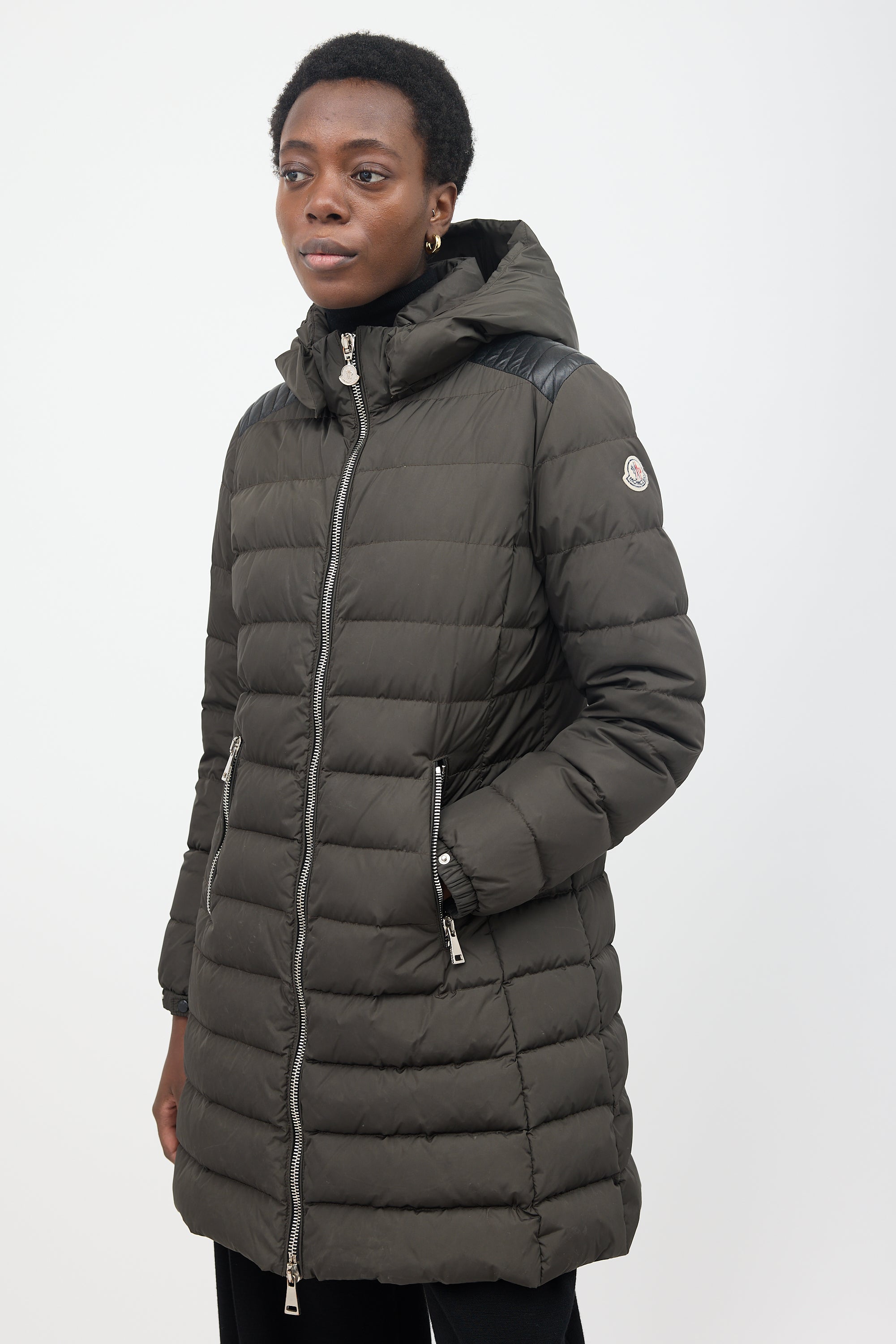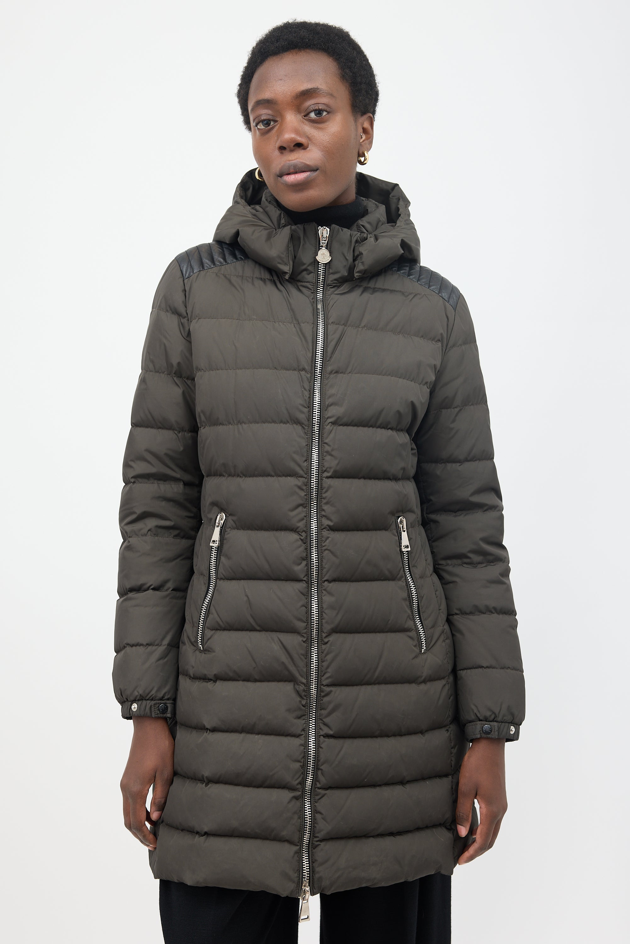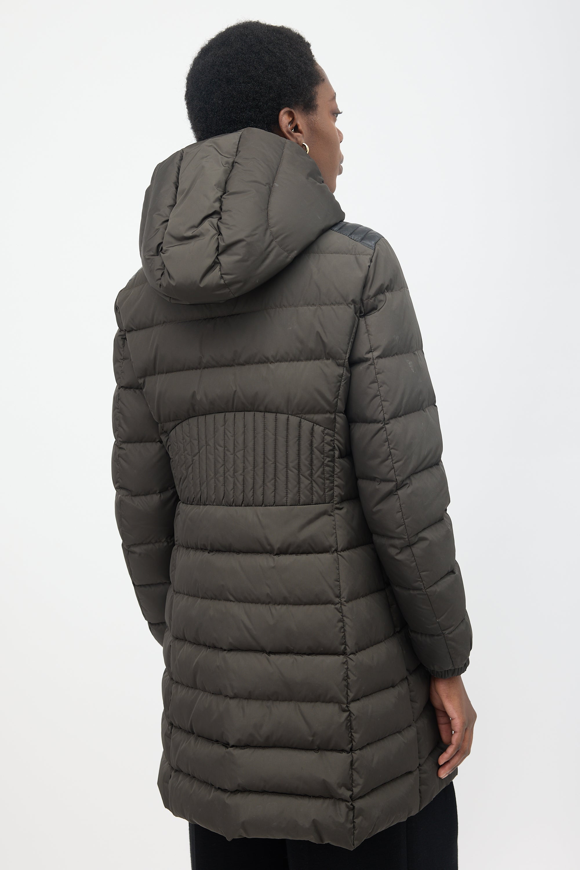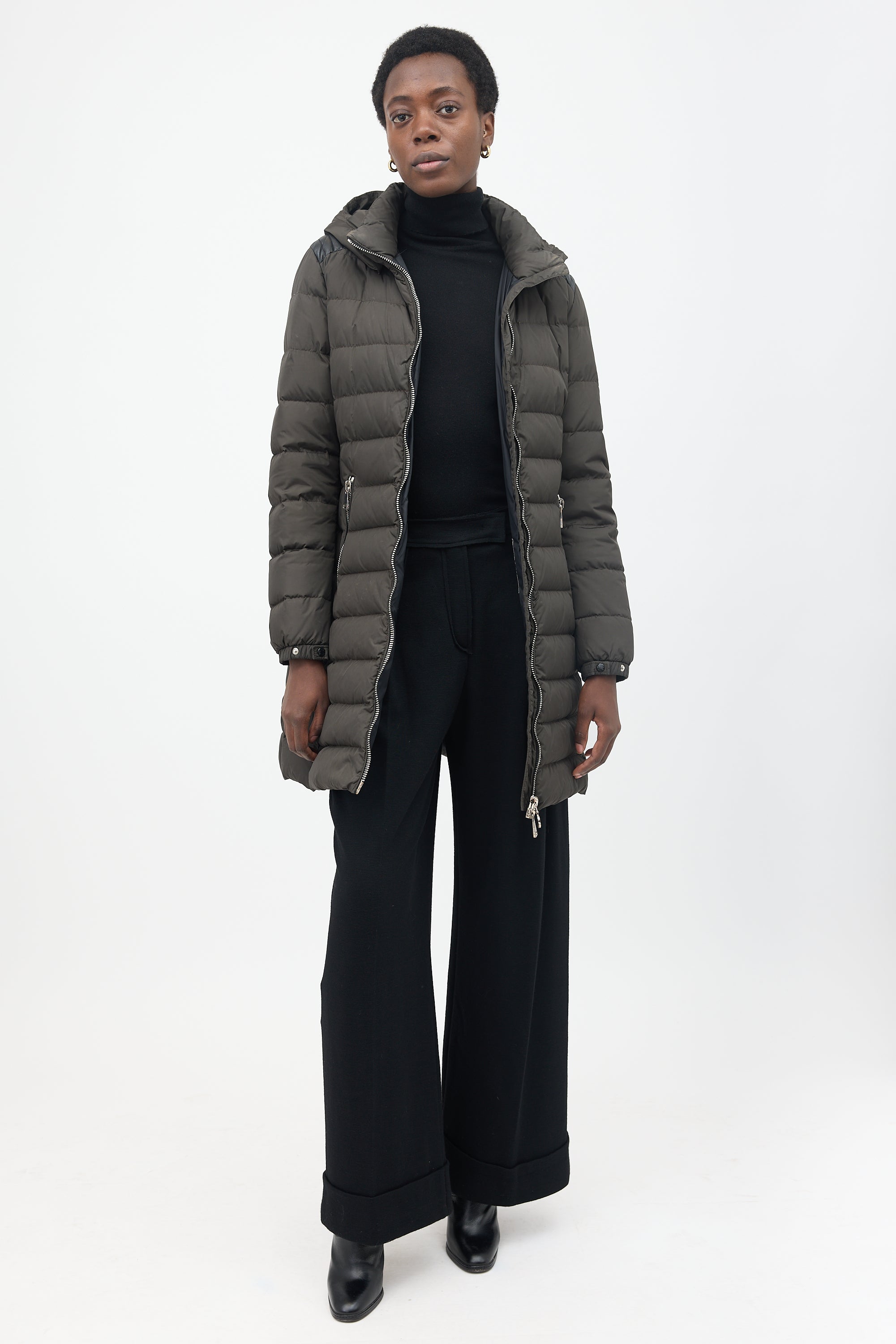 Pre-owned Moncler grey down-filled Talev coat featuring a funnel neck, detachable hood, two way zip front, two zip pockets at front, quilted panel at back, and elasticized cuffs. Lined.