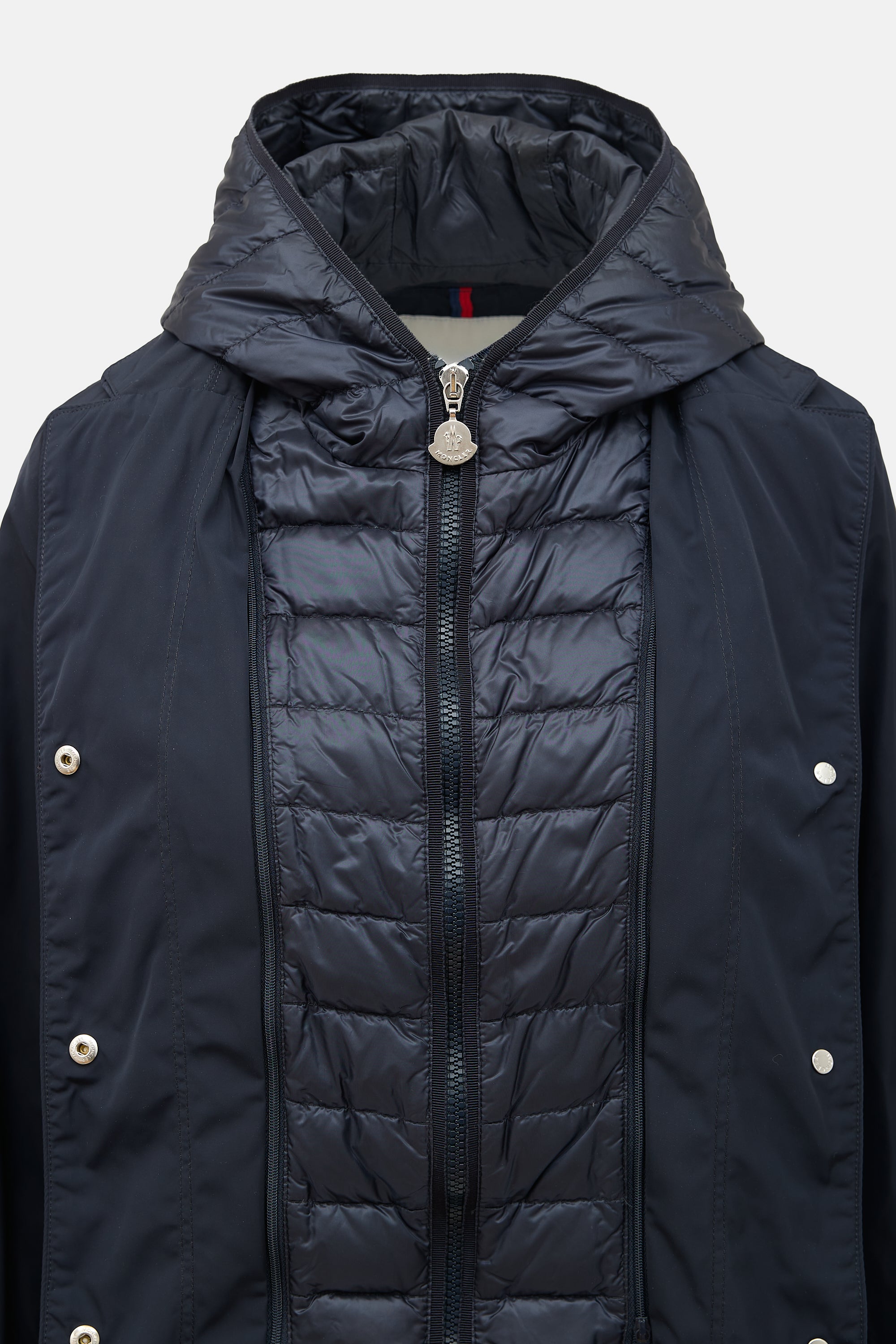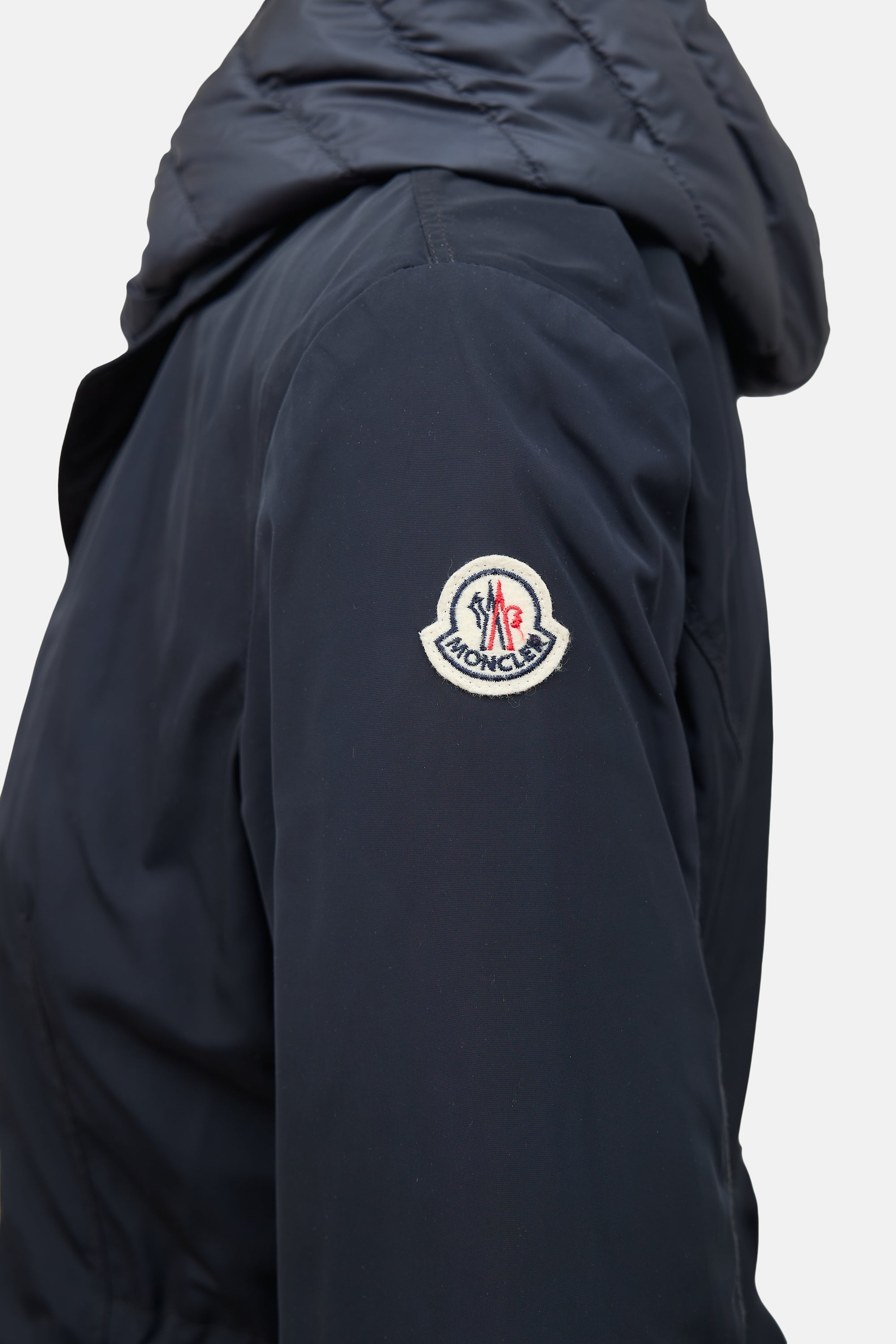 Pre-owned Moncler navy nylon Lime Giubbotto jacket featuring a notched lapel, button front, detachable zip front puffer placket with attached hood, drawcord waist, and two zip pockets at front.