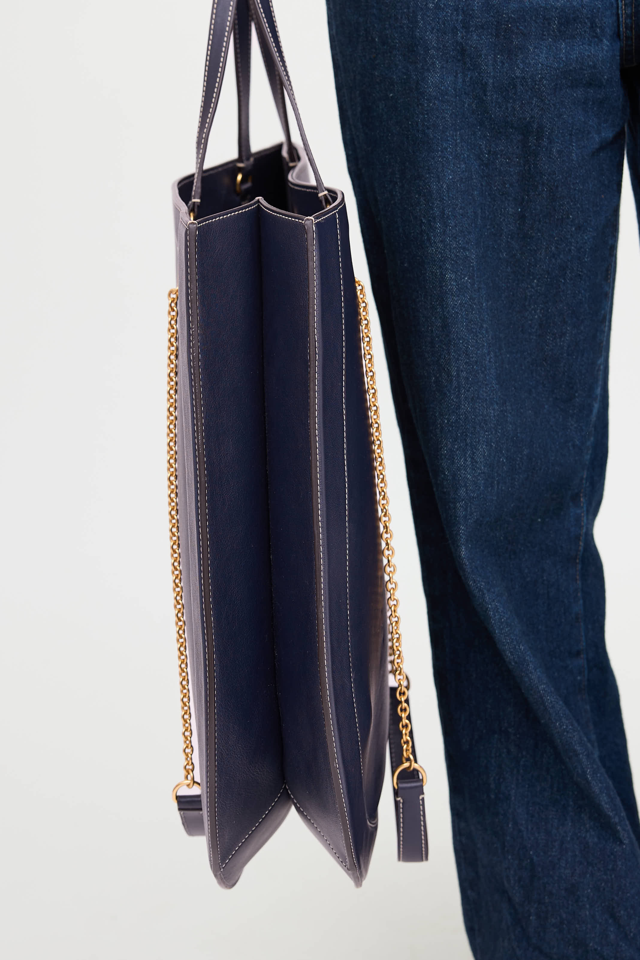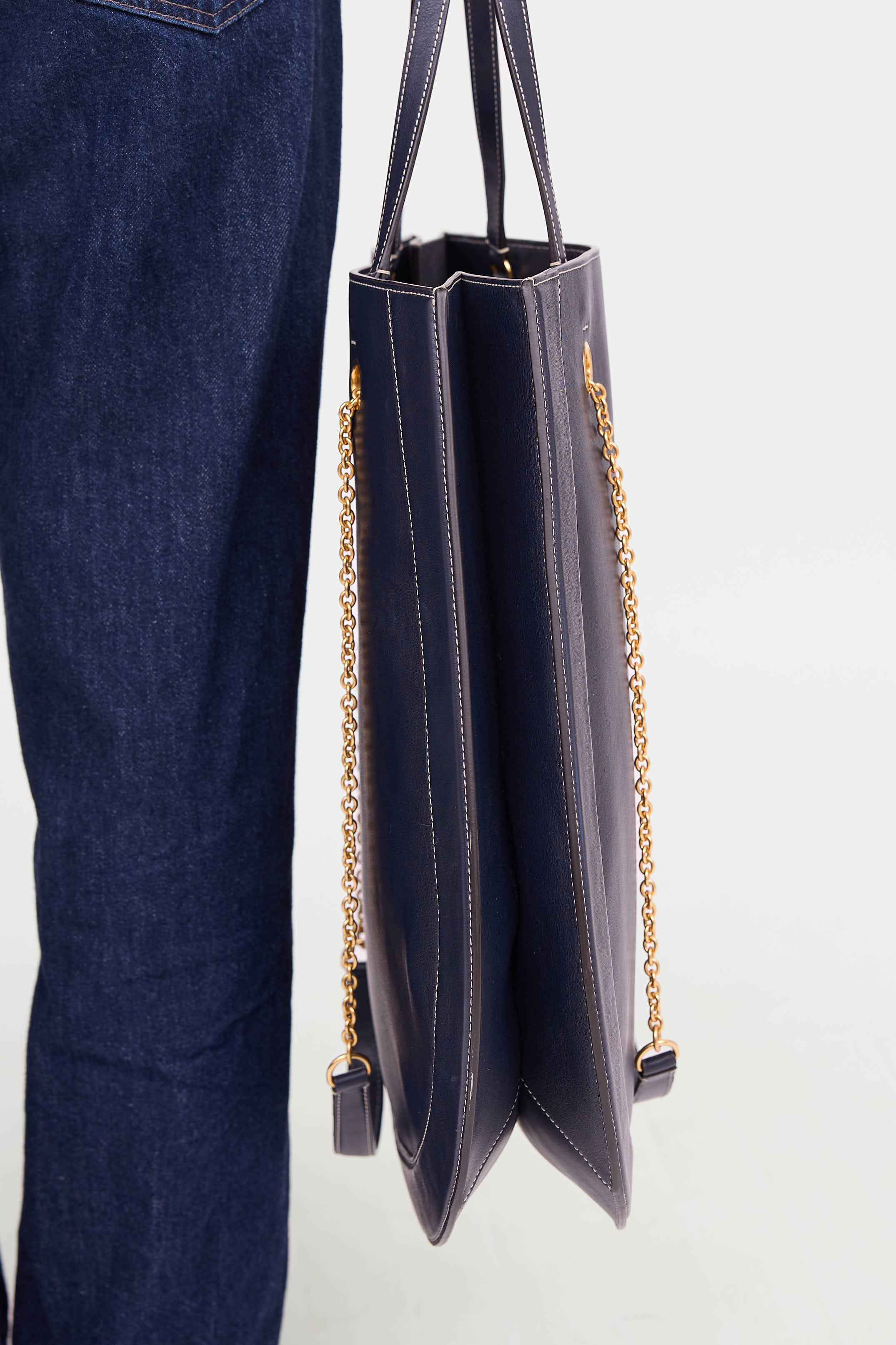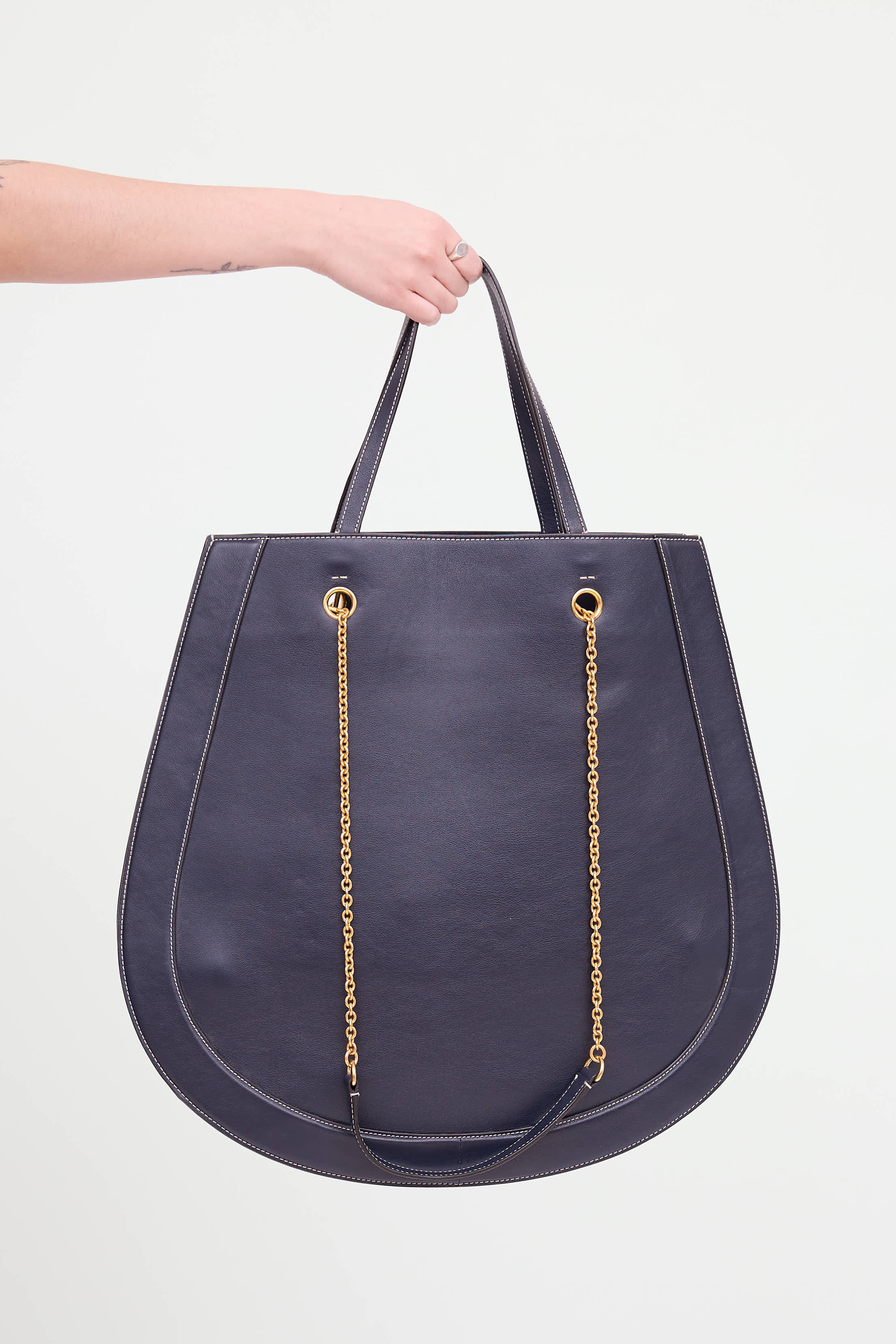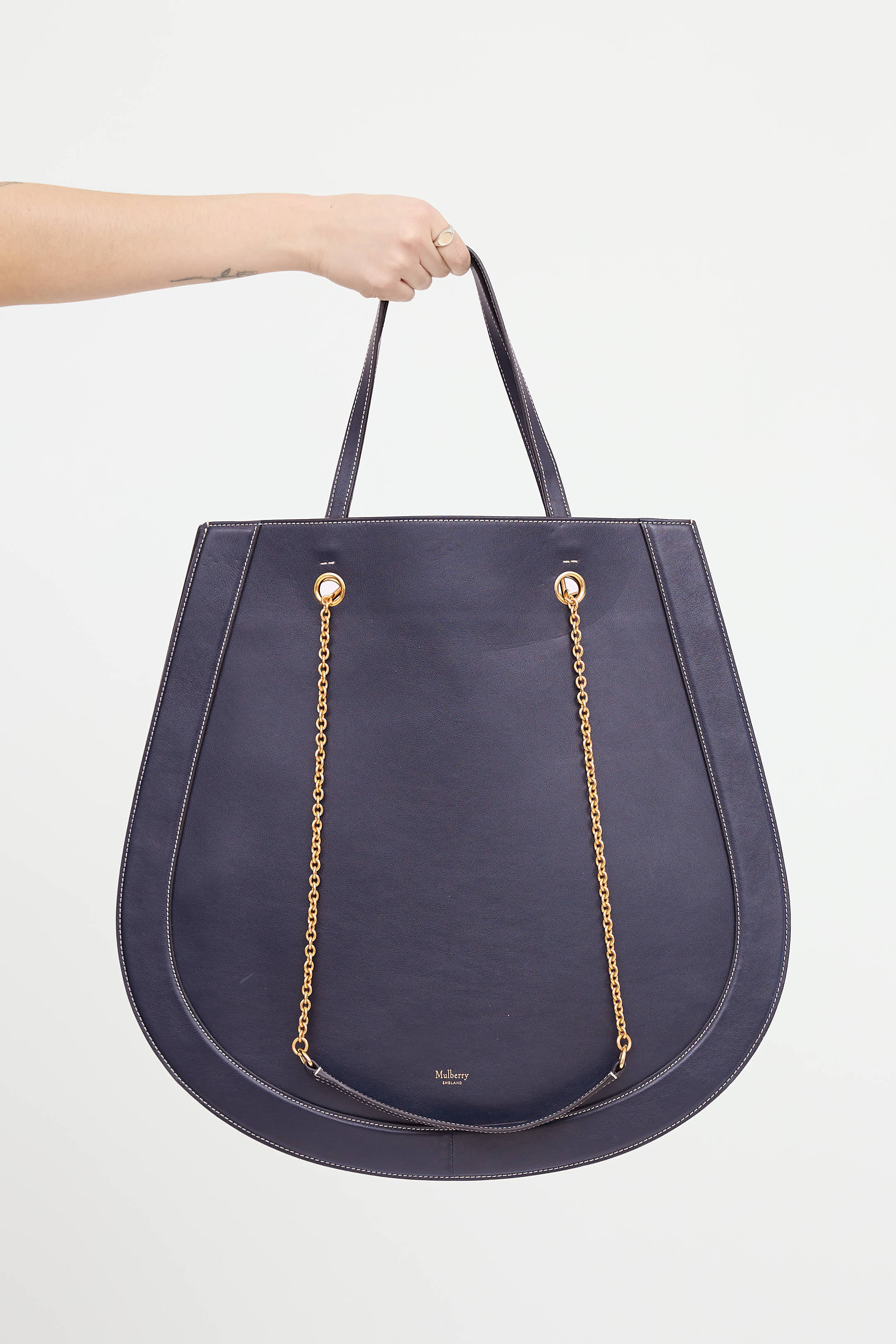 Pre-owned Mulberry navy Roundabout tote bag featuring dual leather flat top handles, detachable chain link and leather shoulder straps, gold tone hardware, contrast stitching, printed logo at front face, and one main compartment with one zip pocket.