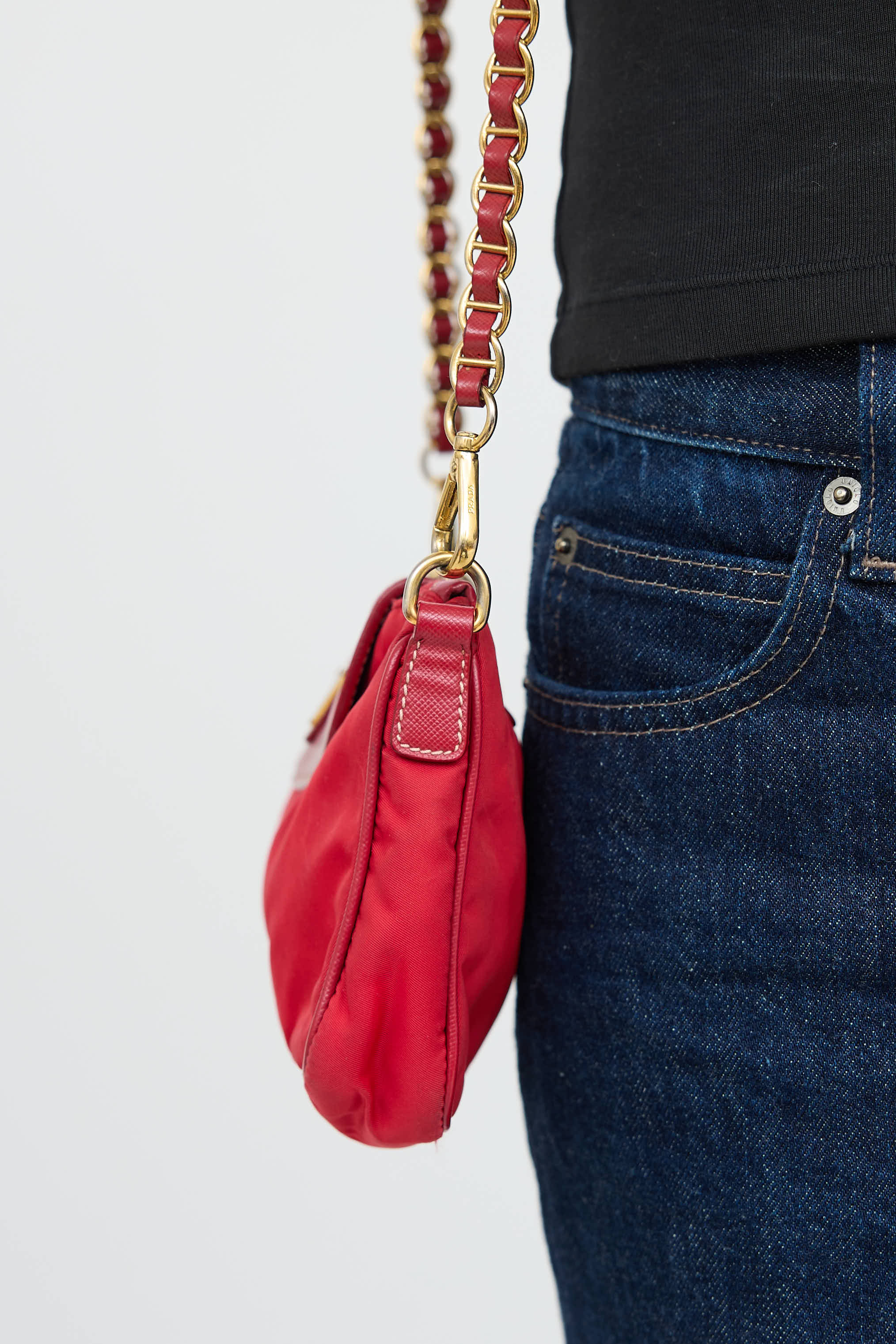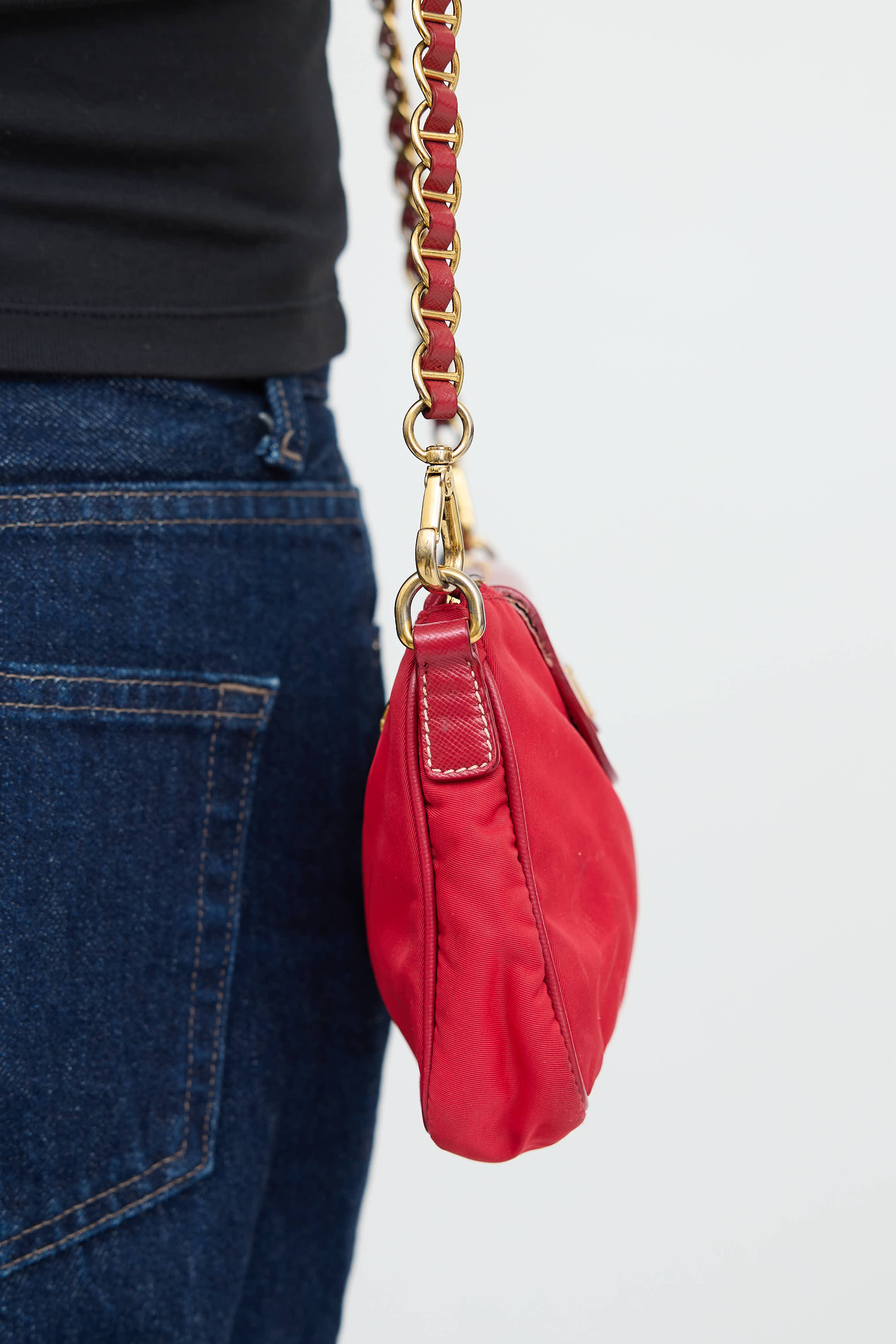 Pre-owned Prada red Saffiano leather Tessuto chain bag featuring red Saffiano leather top flap with magnetic snap closure and gold tone triangle logo plaque, removable woven leather chain shoulder strap, top zip closure, hidden front pocket, textile lined interior, and singular zip pocket.