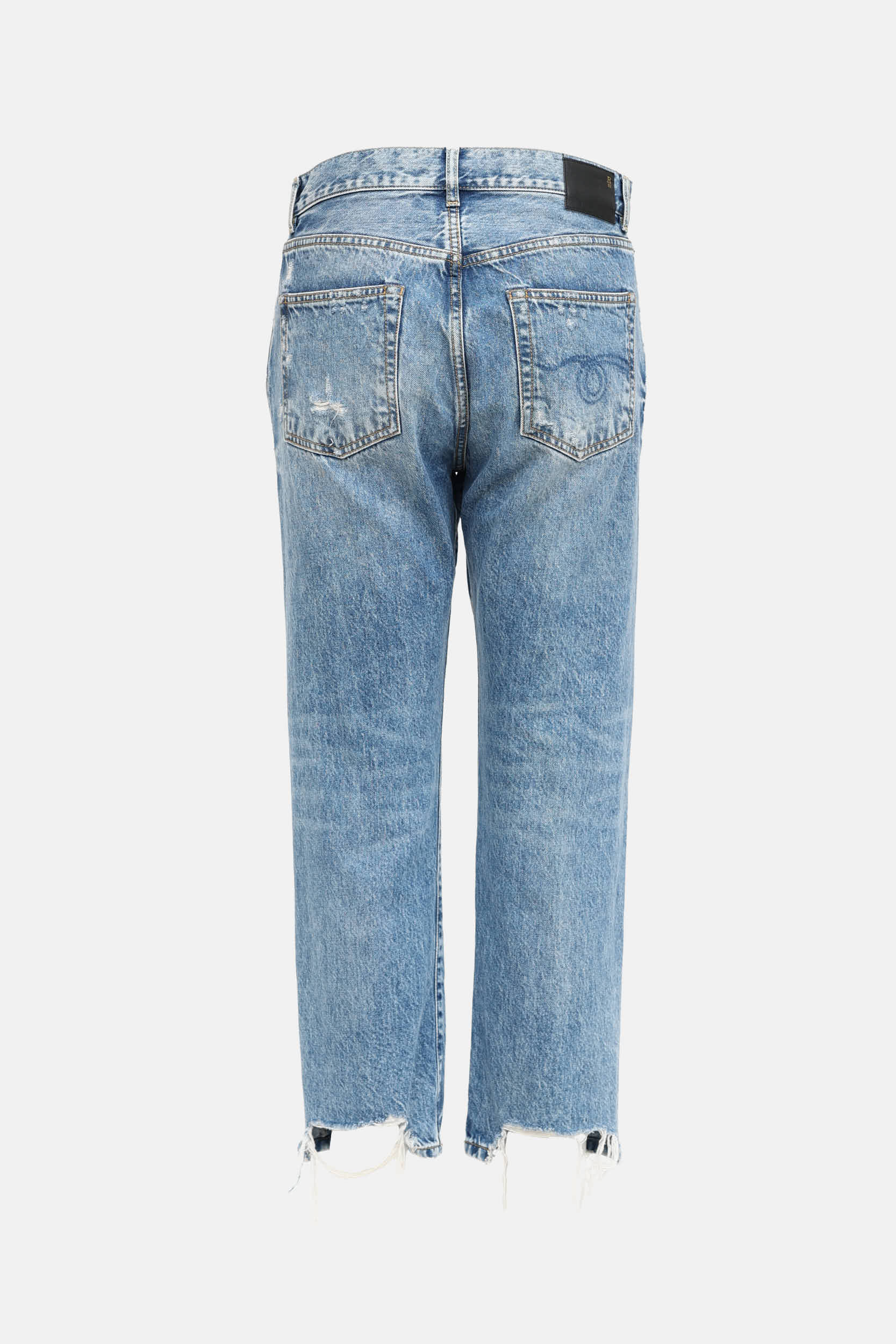 Pre-owned R13 light wash Boyfriend jeans featuring zip fly, belt loops, five pocket styling, distressing throughout, and leather logo patch at back.