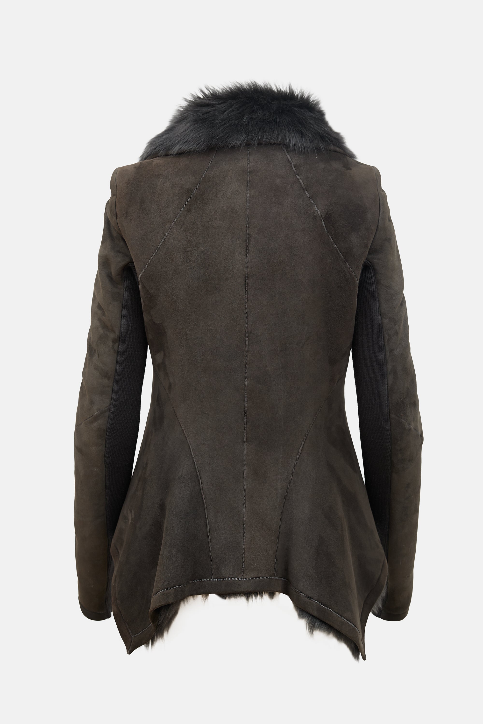 Pre-owned Rick Owens brown shearling jacket featuring a funnel neck, fur interior, asymmetric zip front, ribbed knit underarm panels, and a high low asymmetric hem.
