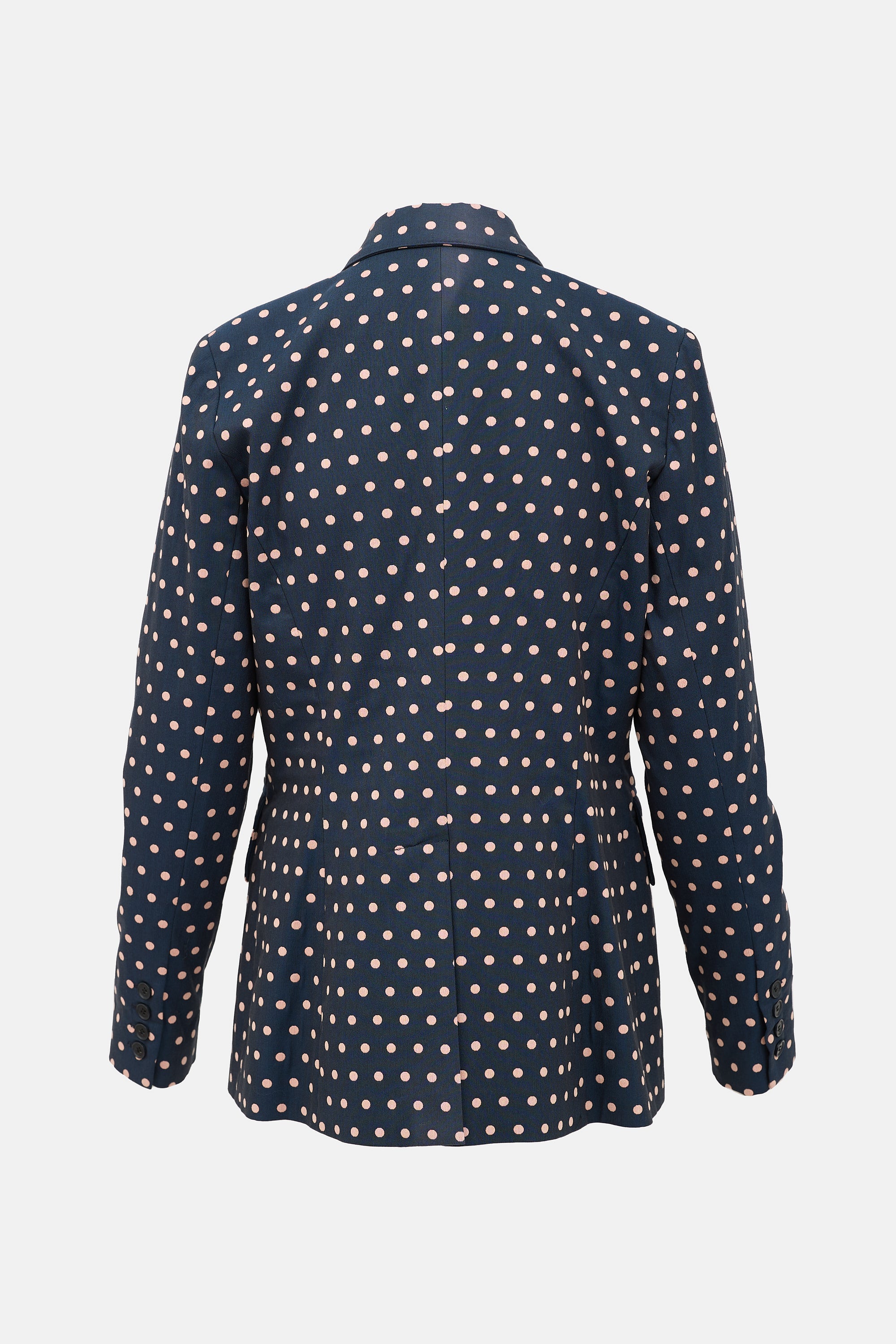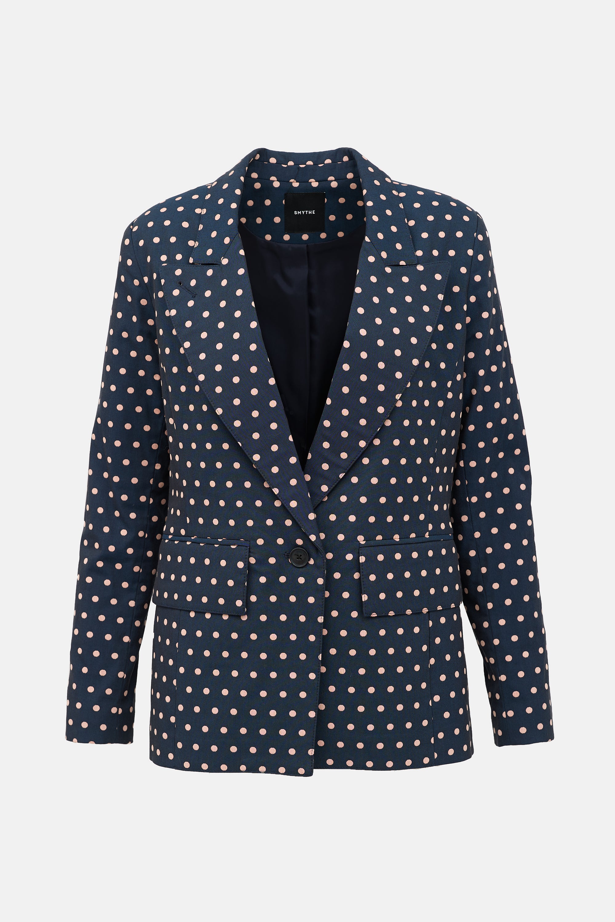 Pre-owned Smythe navy Lounge blazer featuring a pink Polka dot print, wide peak lapel, padded shoulder, single button front, double welt pockets, and a back vent. Lined.