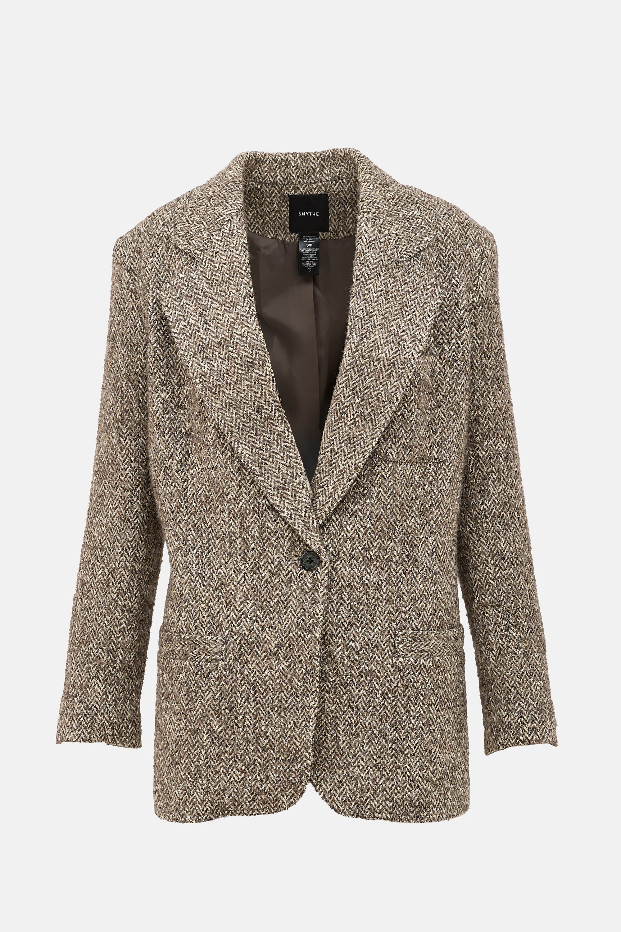 Pre-owned Smythe grey and beige tweed blazer featuring a Herringbone pattern, notched collar, padded shoulder, welt pockets, back vent, and an oversized fit. Lined.