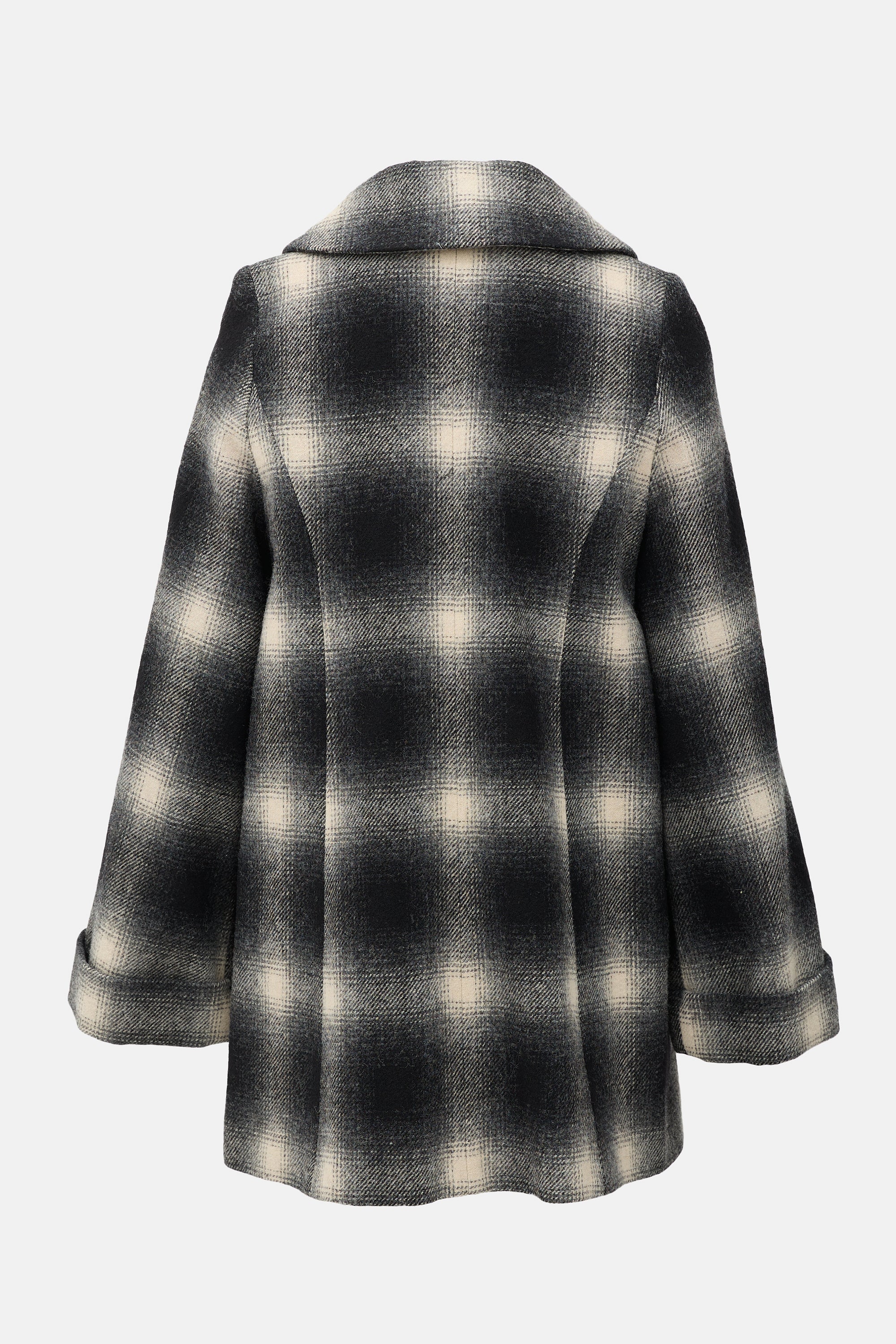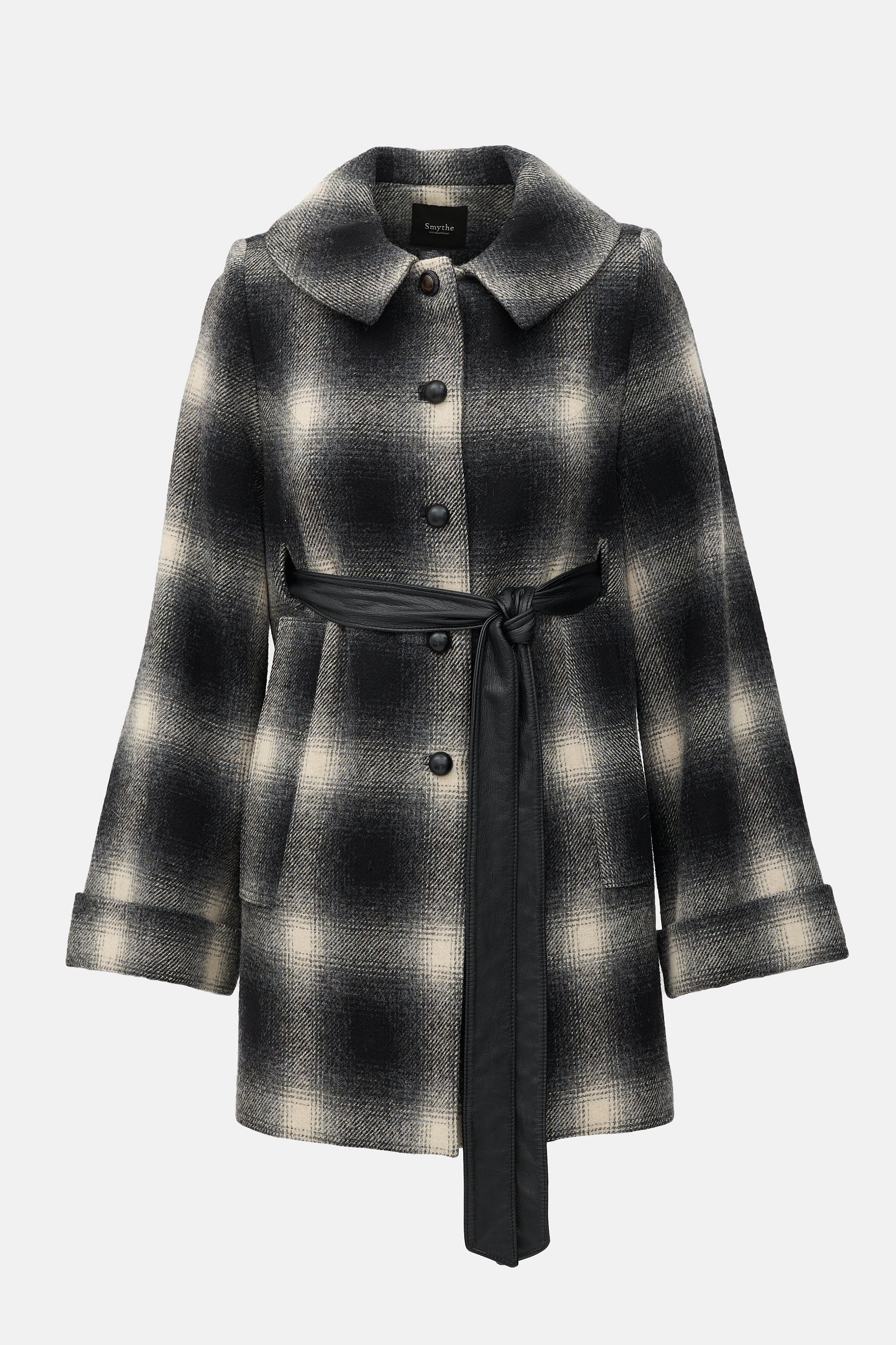 Pre-owned Smythe black and cream wool blend jacket featuring plaid pattern, wide collar, button up front, two front slip pockets, black leather tie waist belt, and foldover cuffs. Lined.