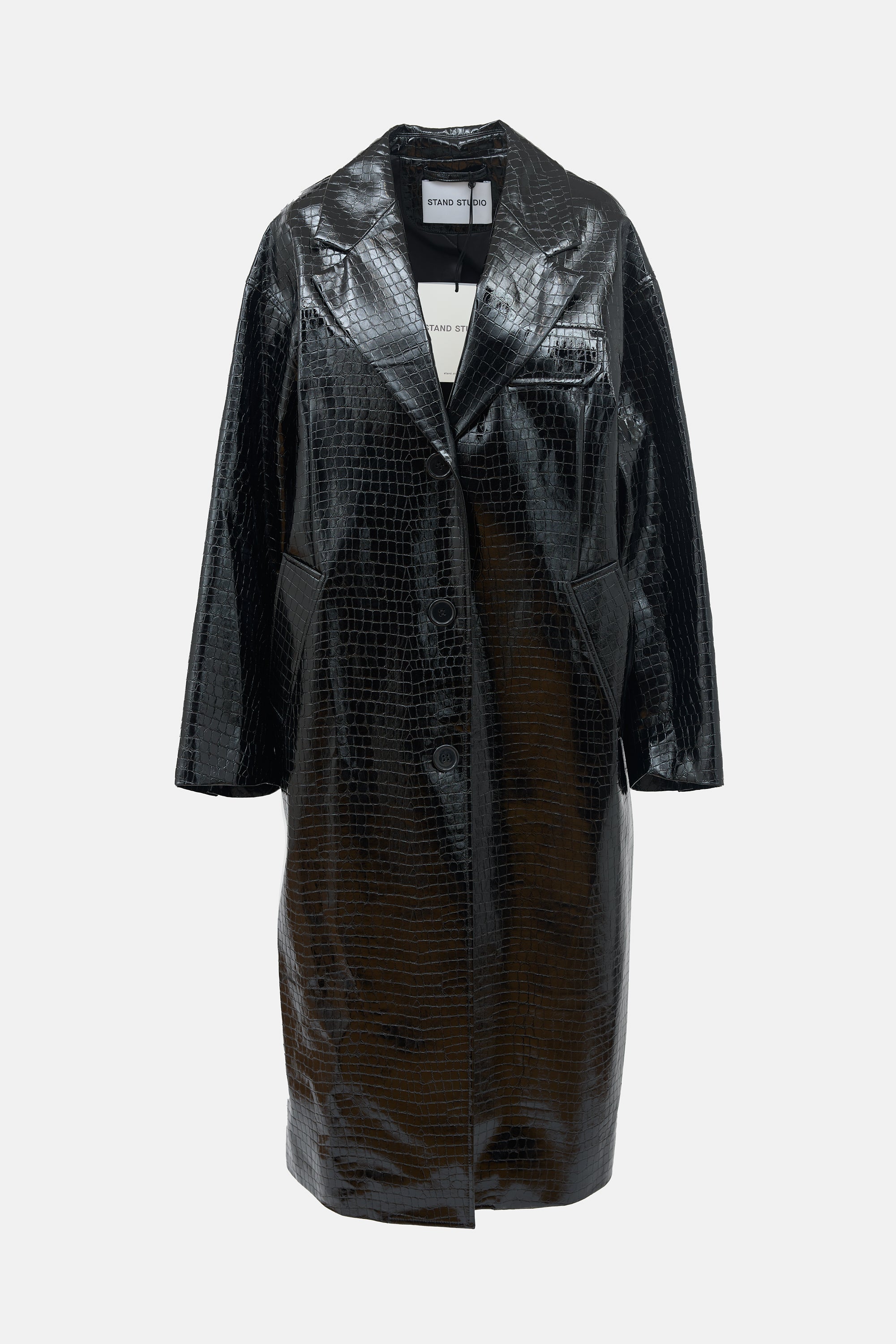 Pre-owned Stand Studio black embossed faux patent leather Haylo coat featuring a wide notched collar, button front, welt pockets, and back vent. Lined.