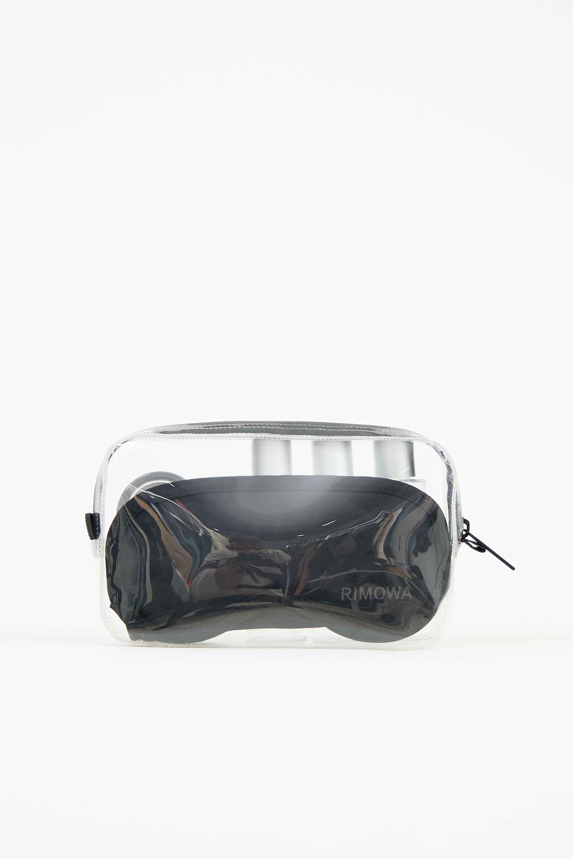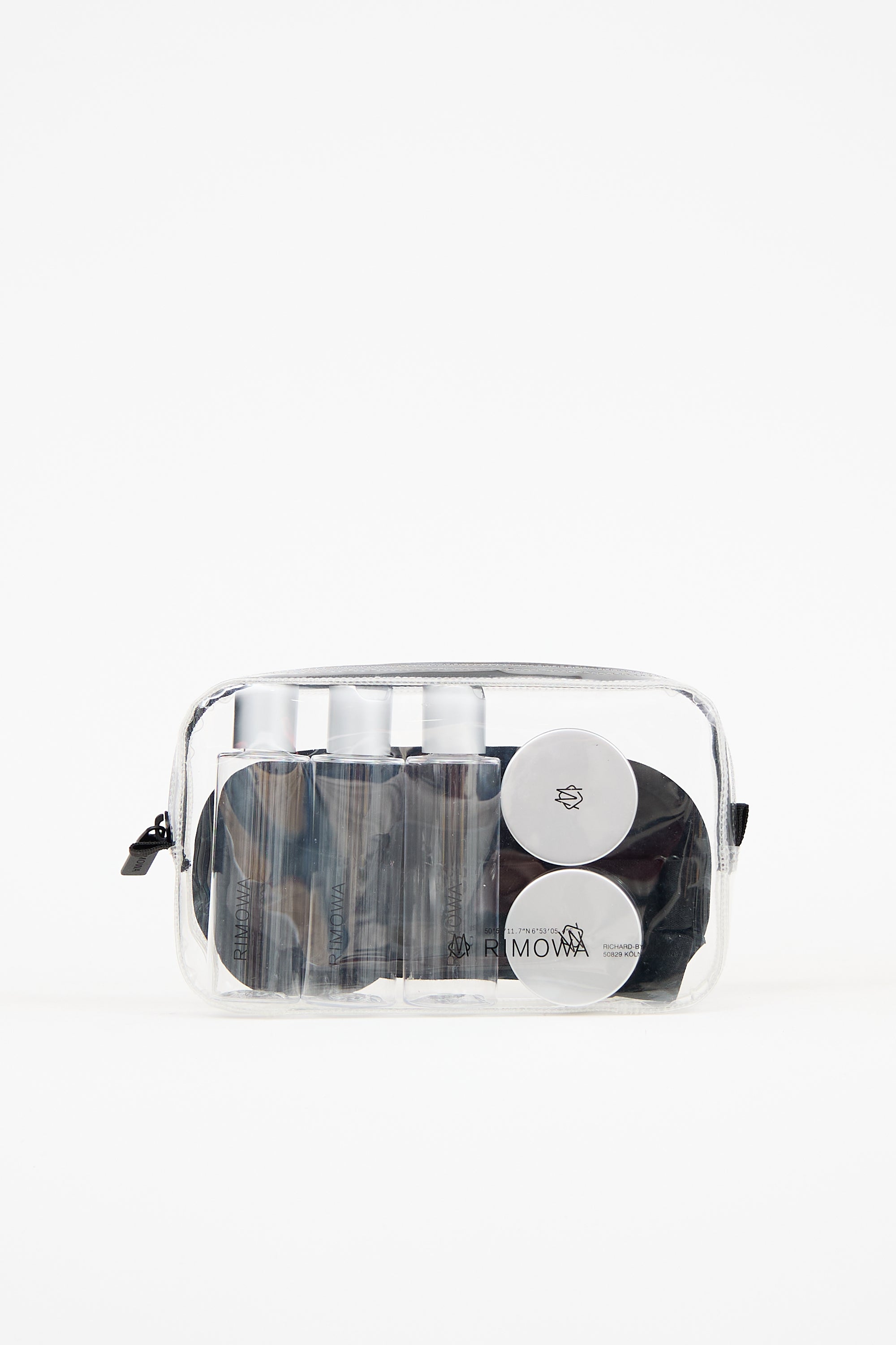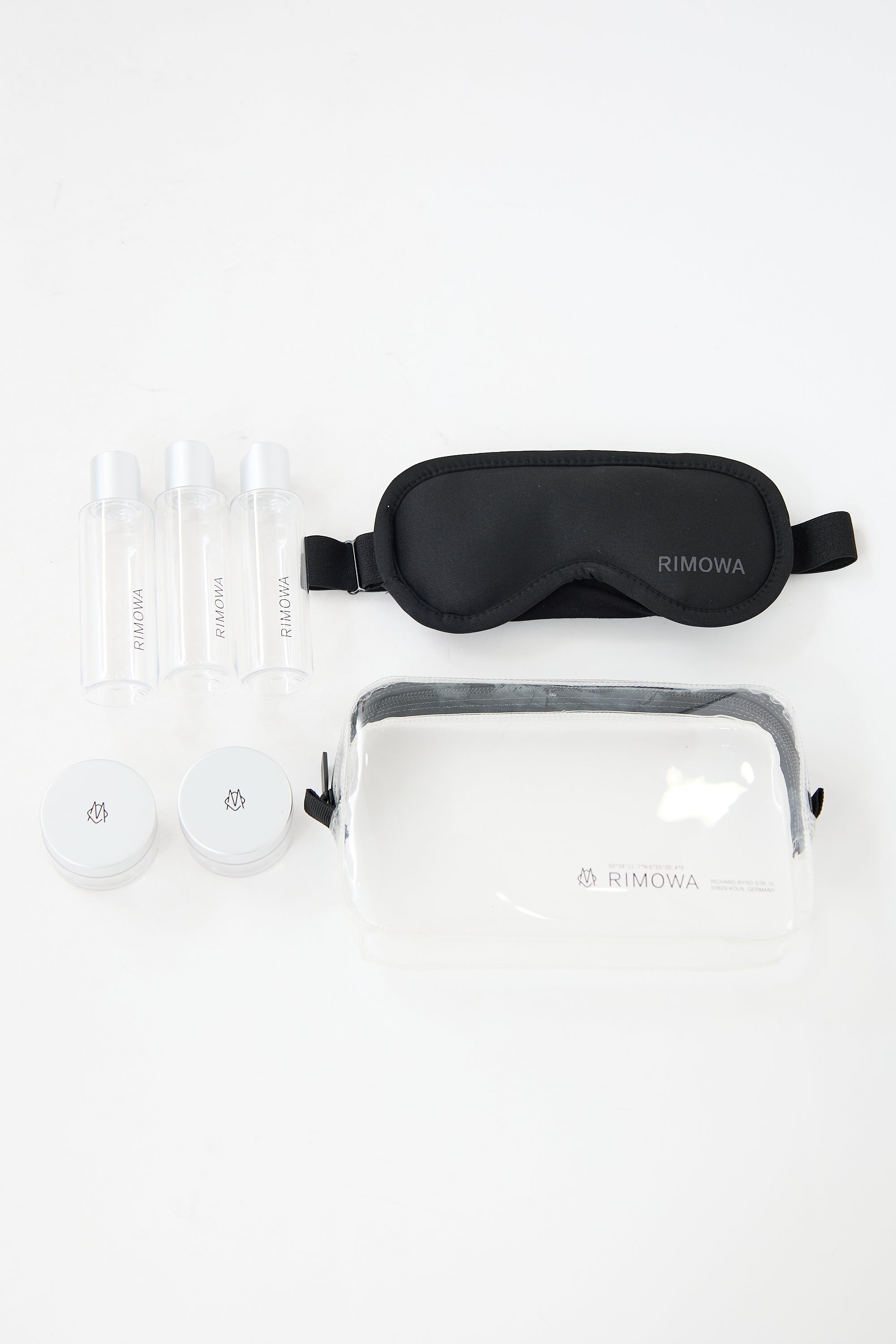 Rimowa travel kit featuring clear waterproof pouch with stamped logo, three liquid bottles with stamped logo, two jar containers, and padded eye masks.
