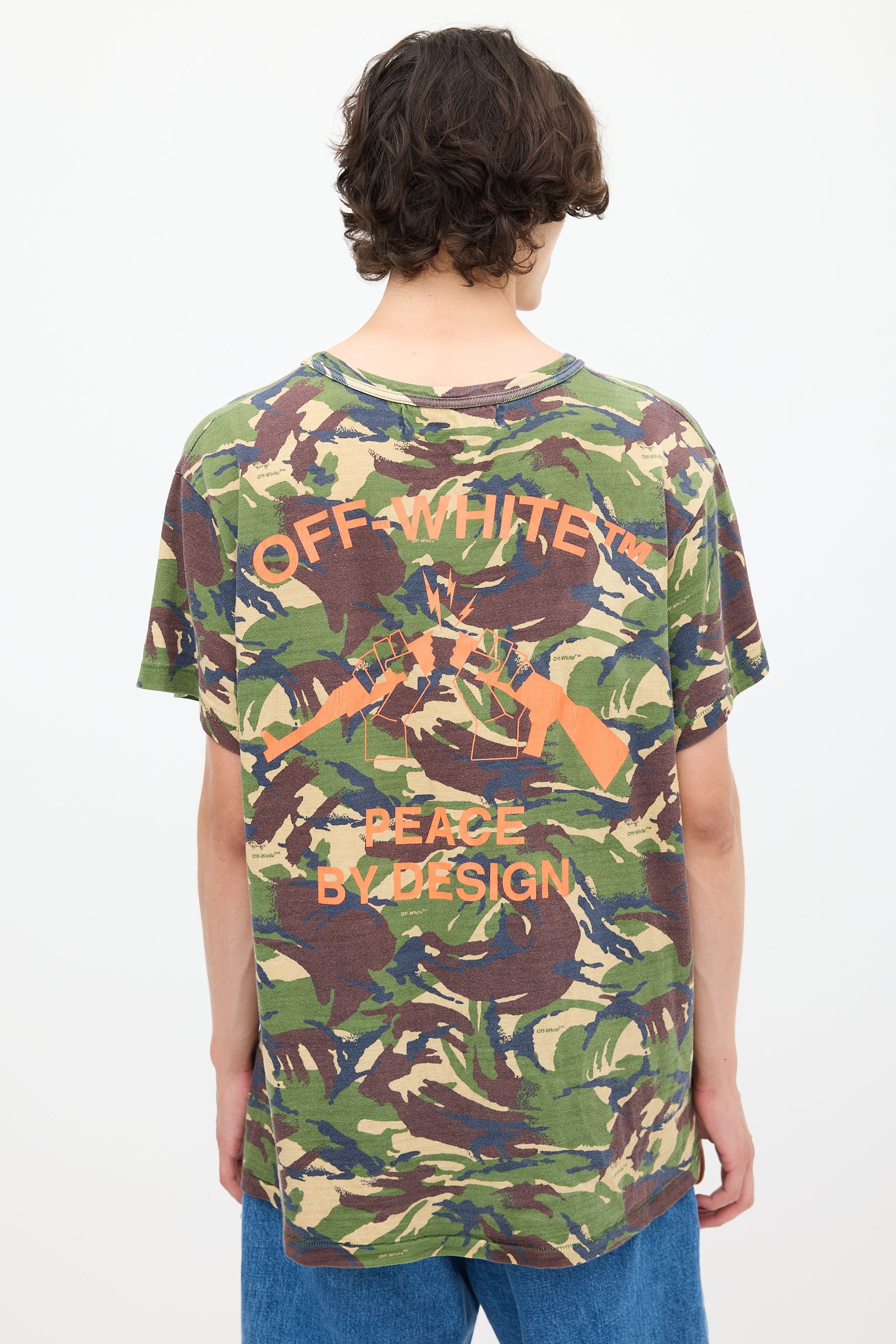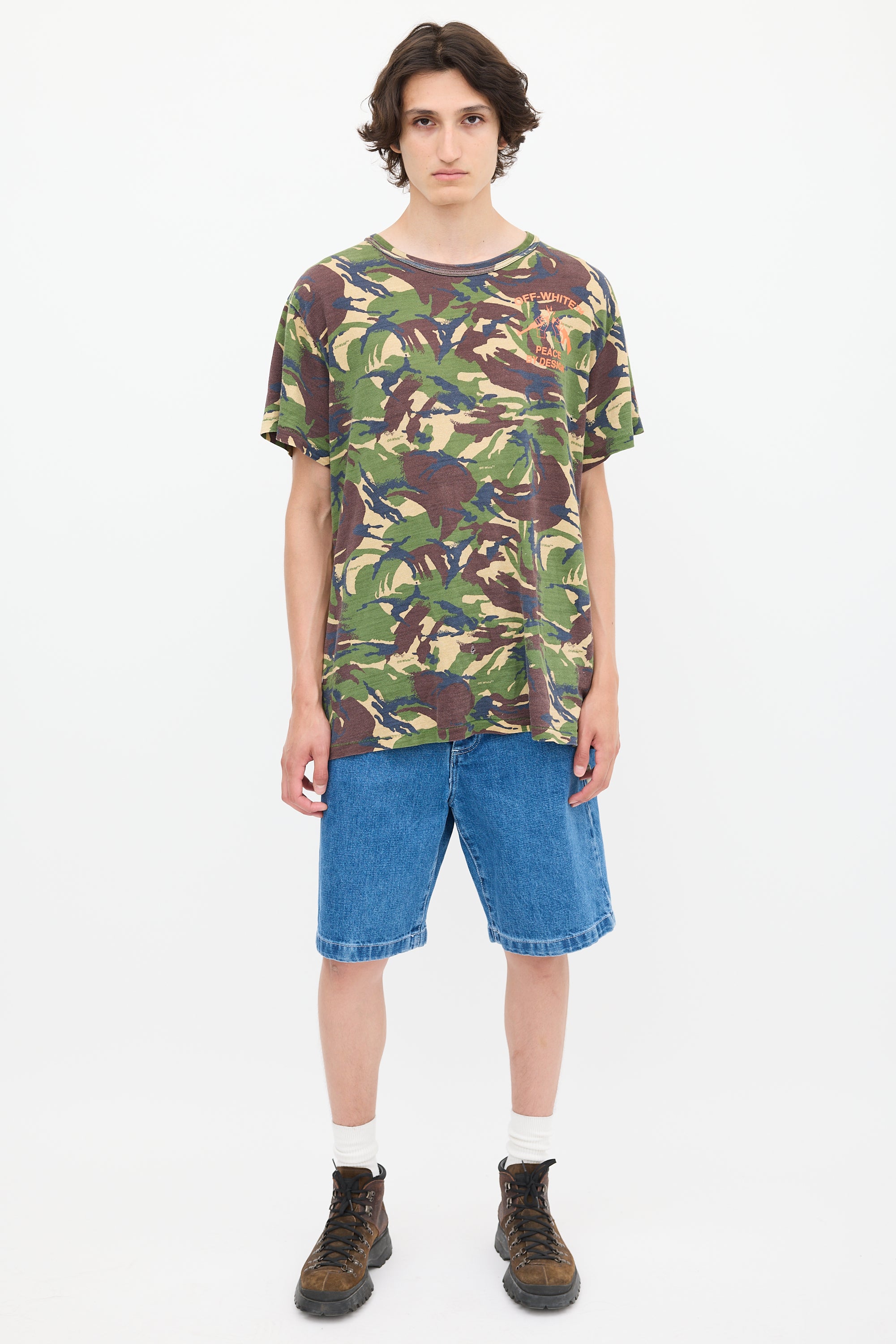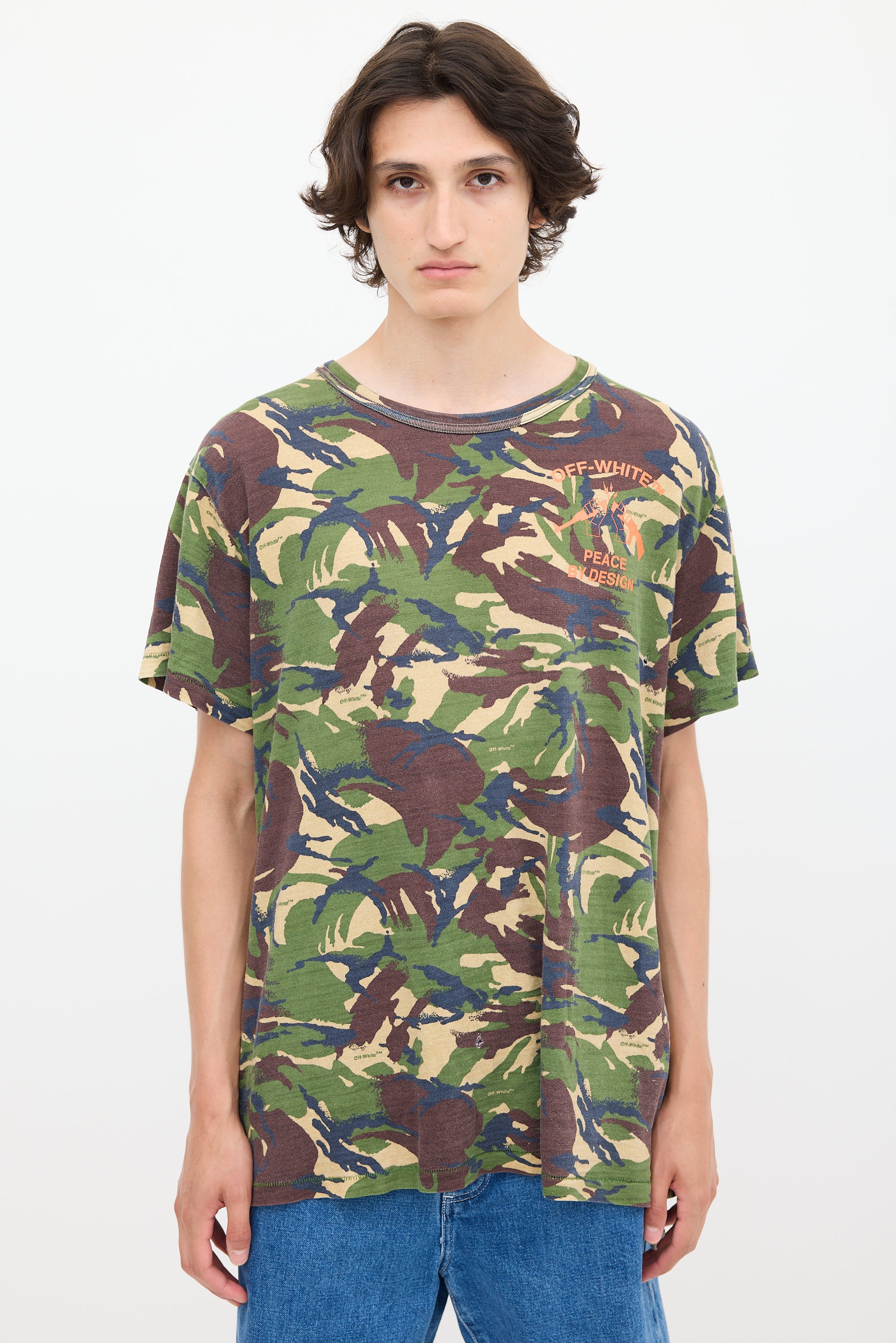 Pre-owned Off-White 2013 green and multicolour T-shirt featuring a round neck, logo camouflage print throughout, orange print logo at left chest and at back, even hem, and short sleeves.