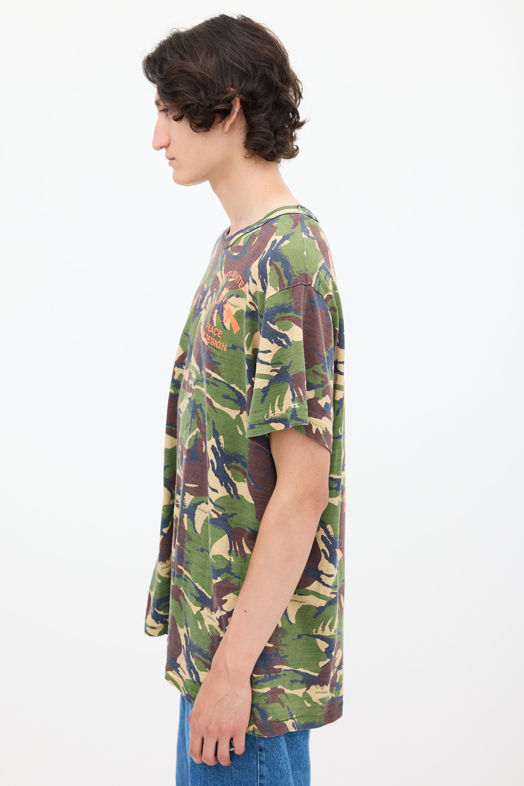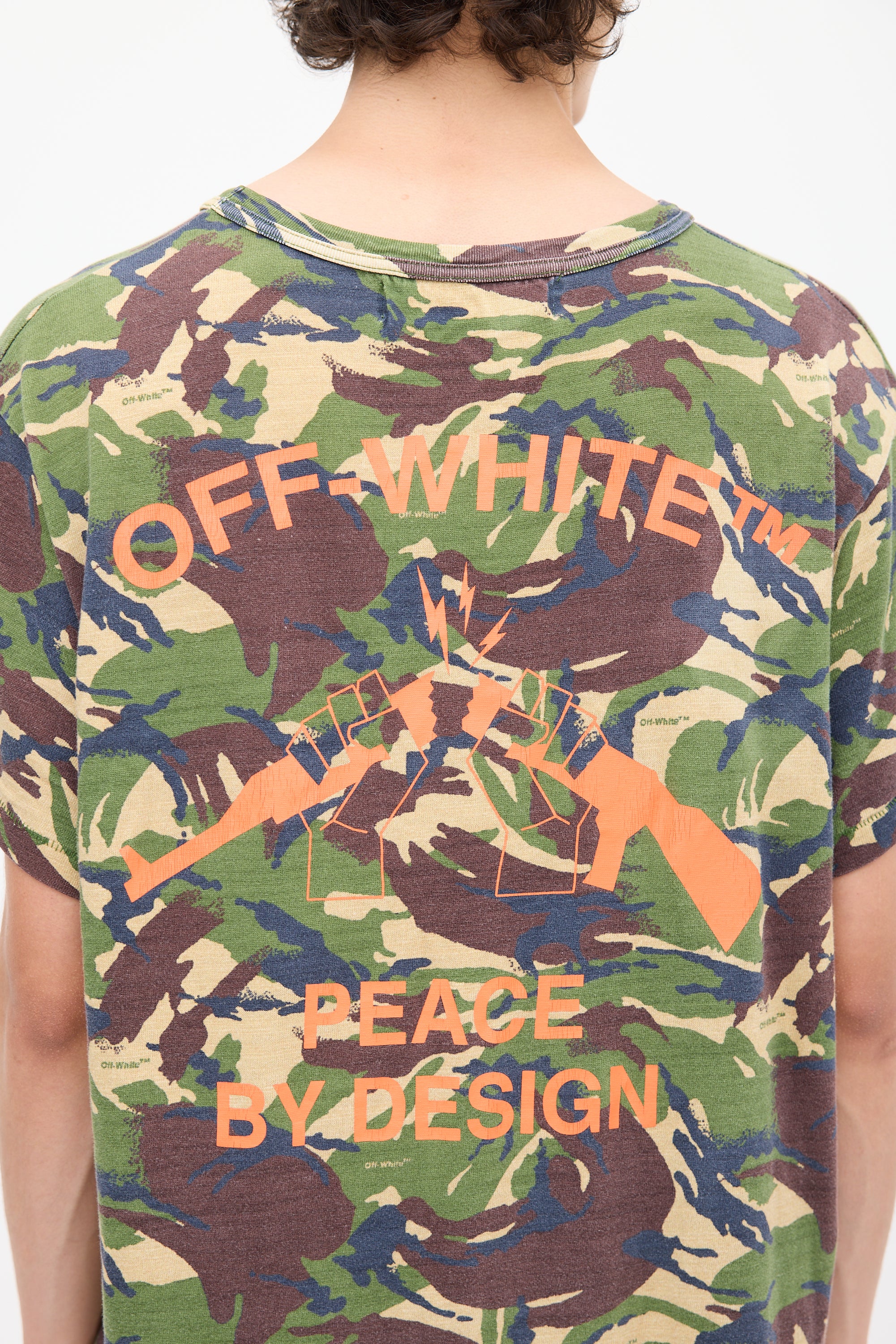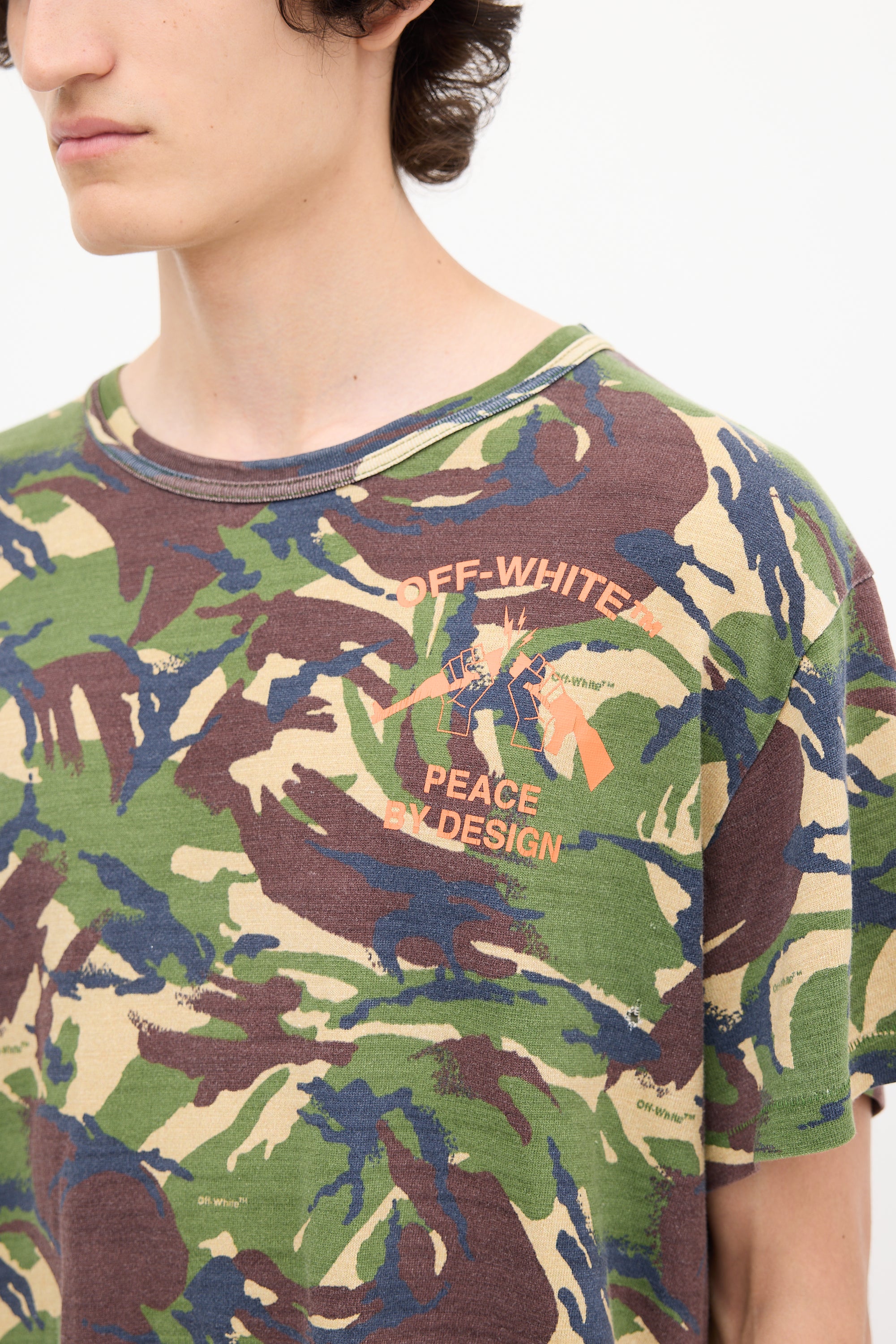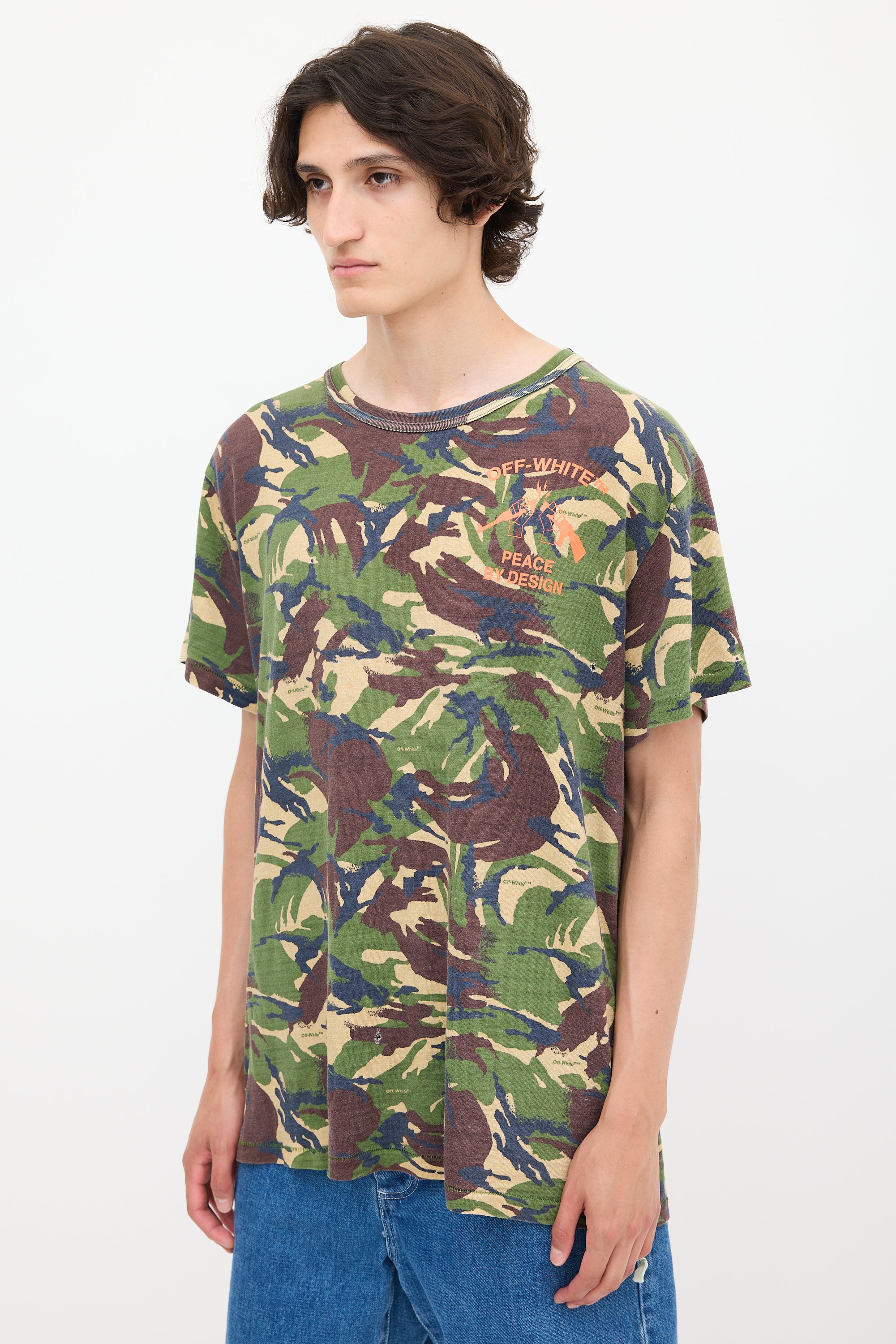 Pre-owned Off-White 2013 green and multicolour T-shirt featuring a round neck, logo camouflage print throughout, orange print logo at left chest and at back, even hem, and short sleeves.