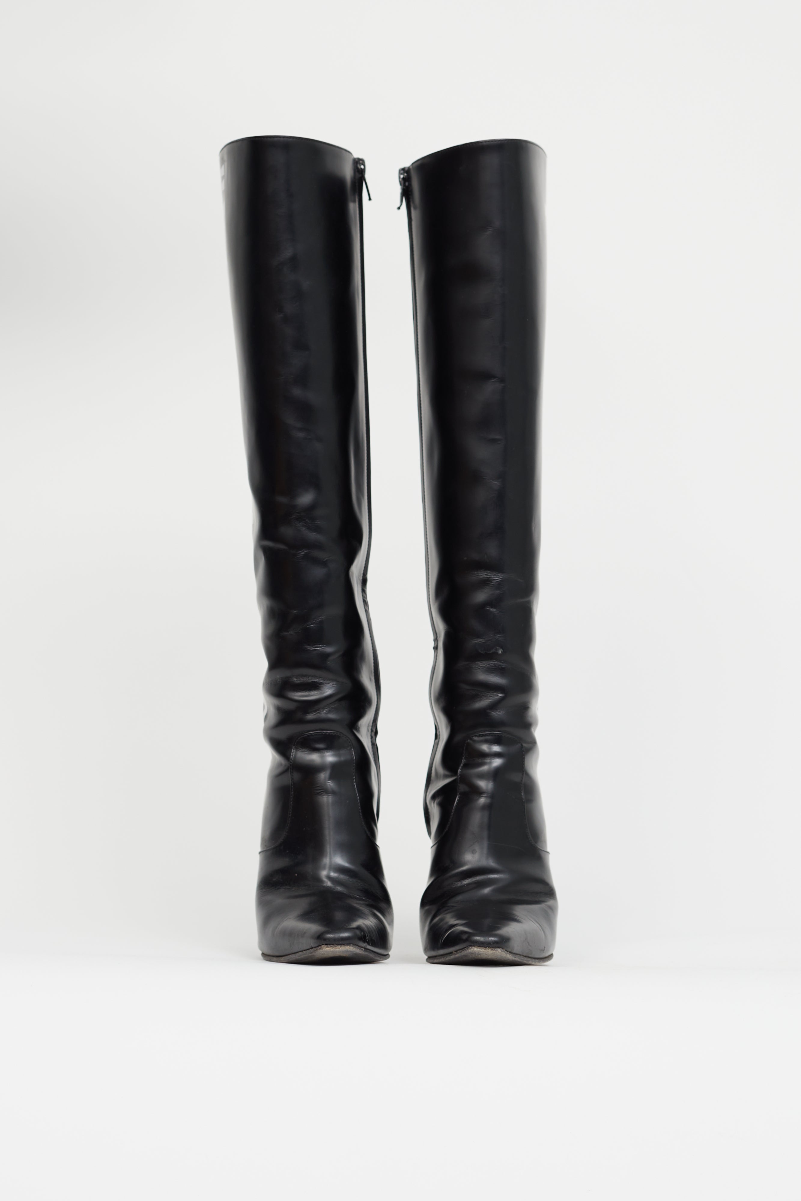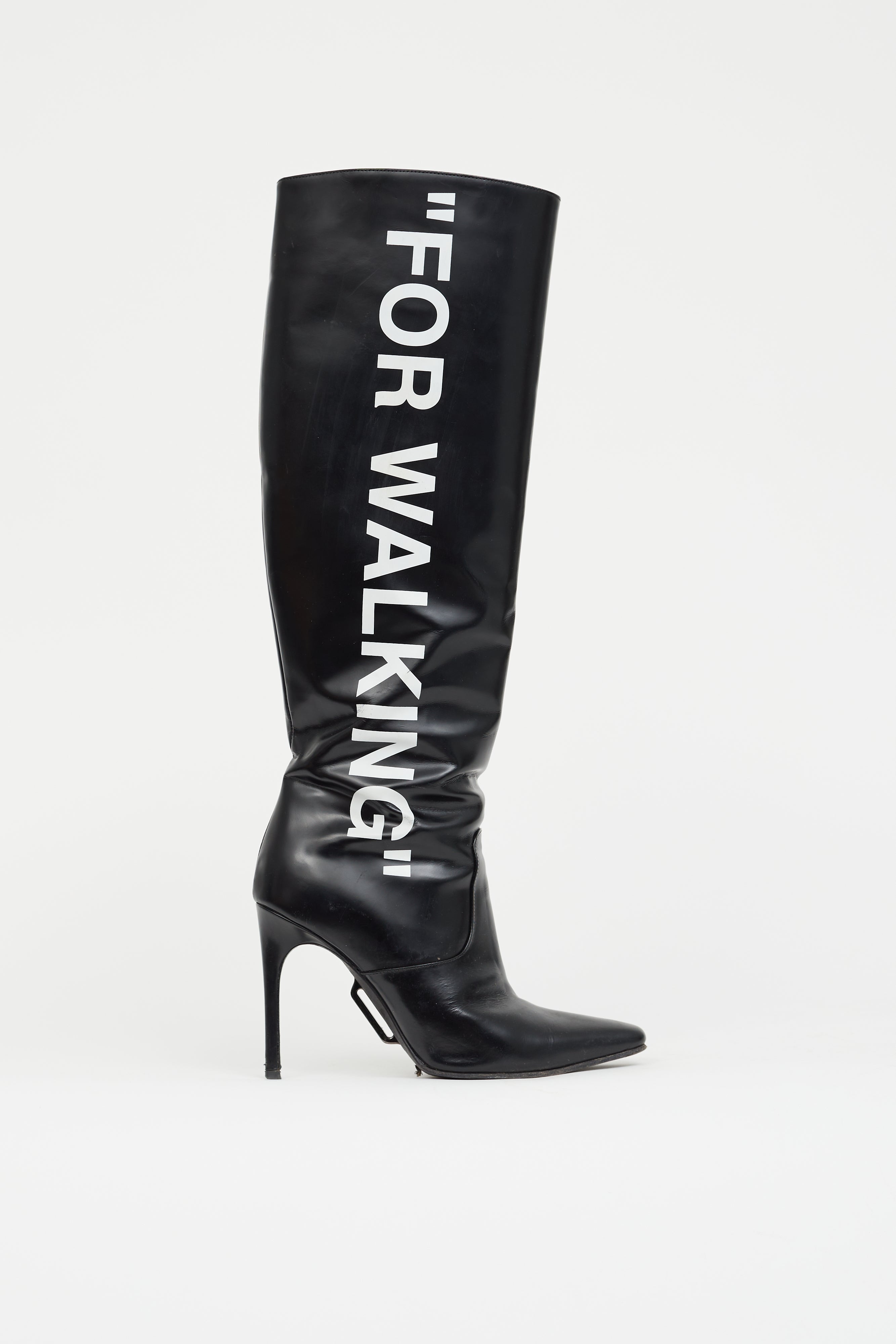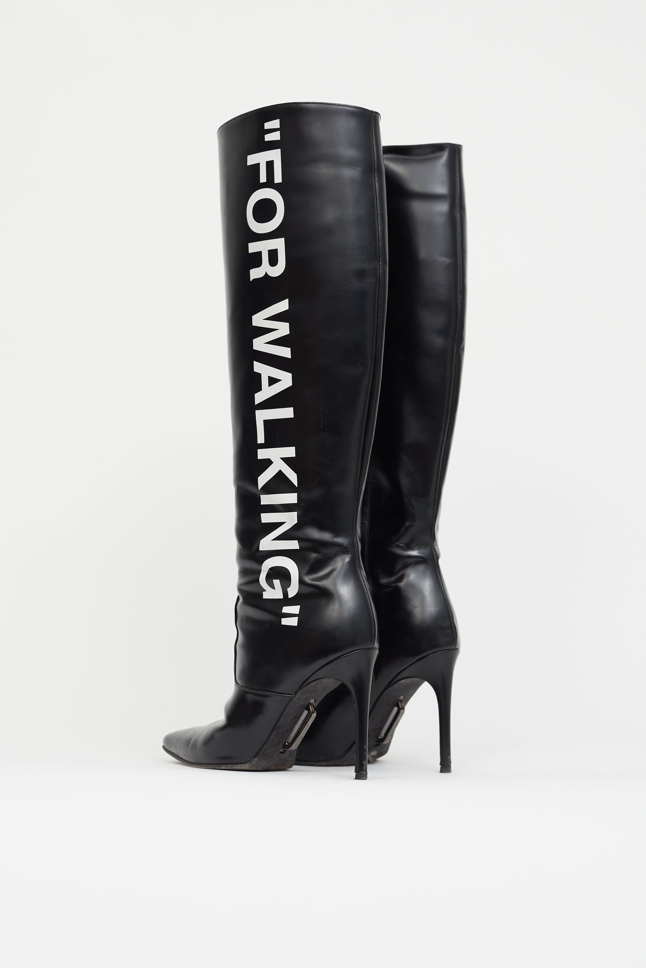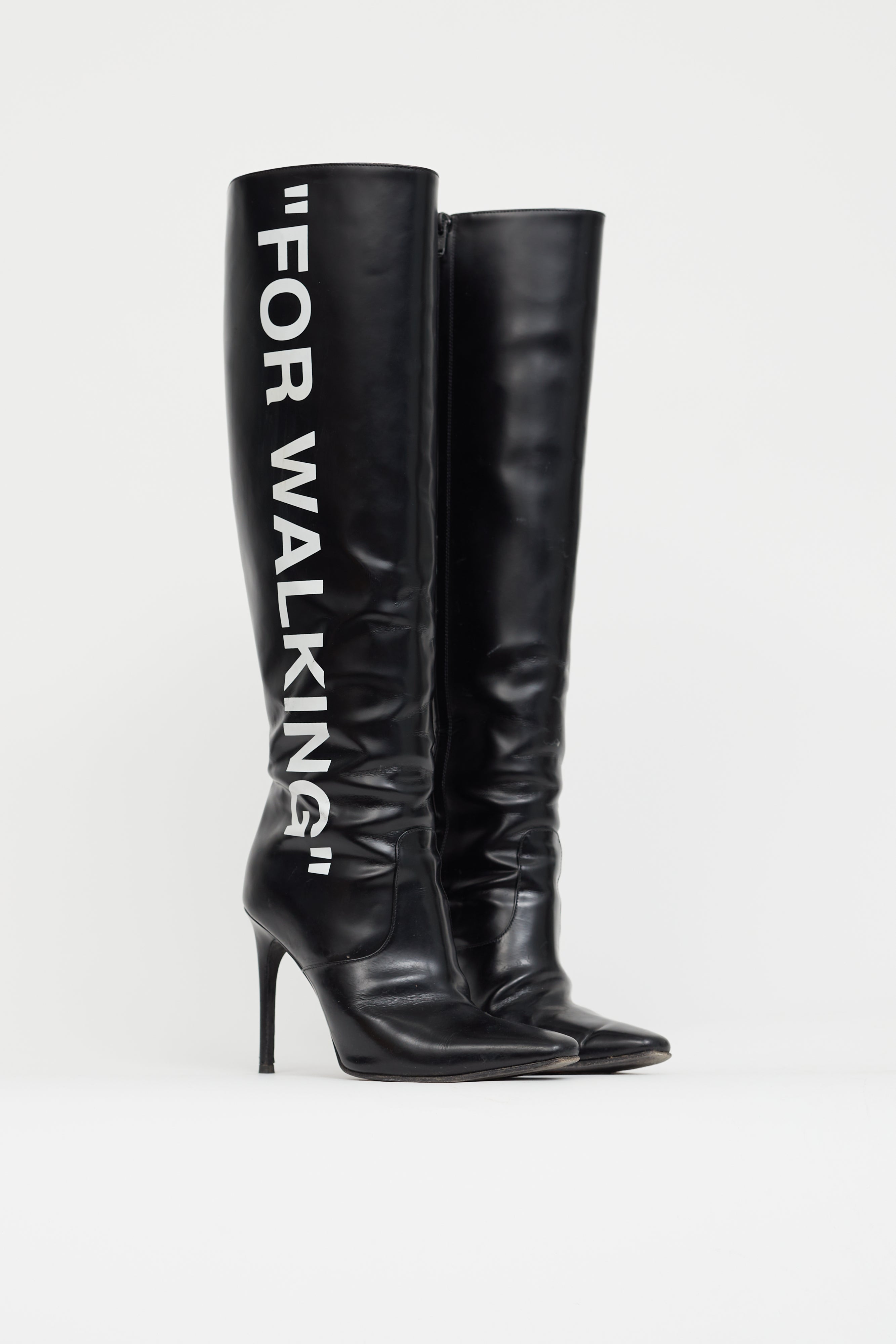 Pre-loved Off-White knee-high boots in black leather featuring white "For Walking" markings at outer side, zip closure at inner side, tonal panel at vamp, engraved chrome bar at sole, tapered square toe and stiletto heel.