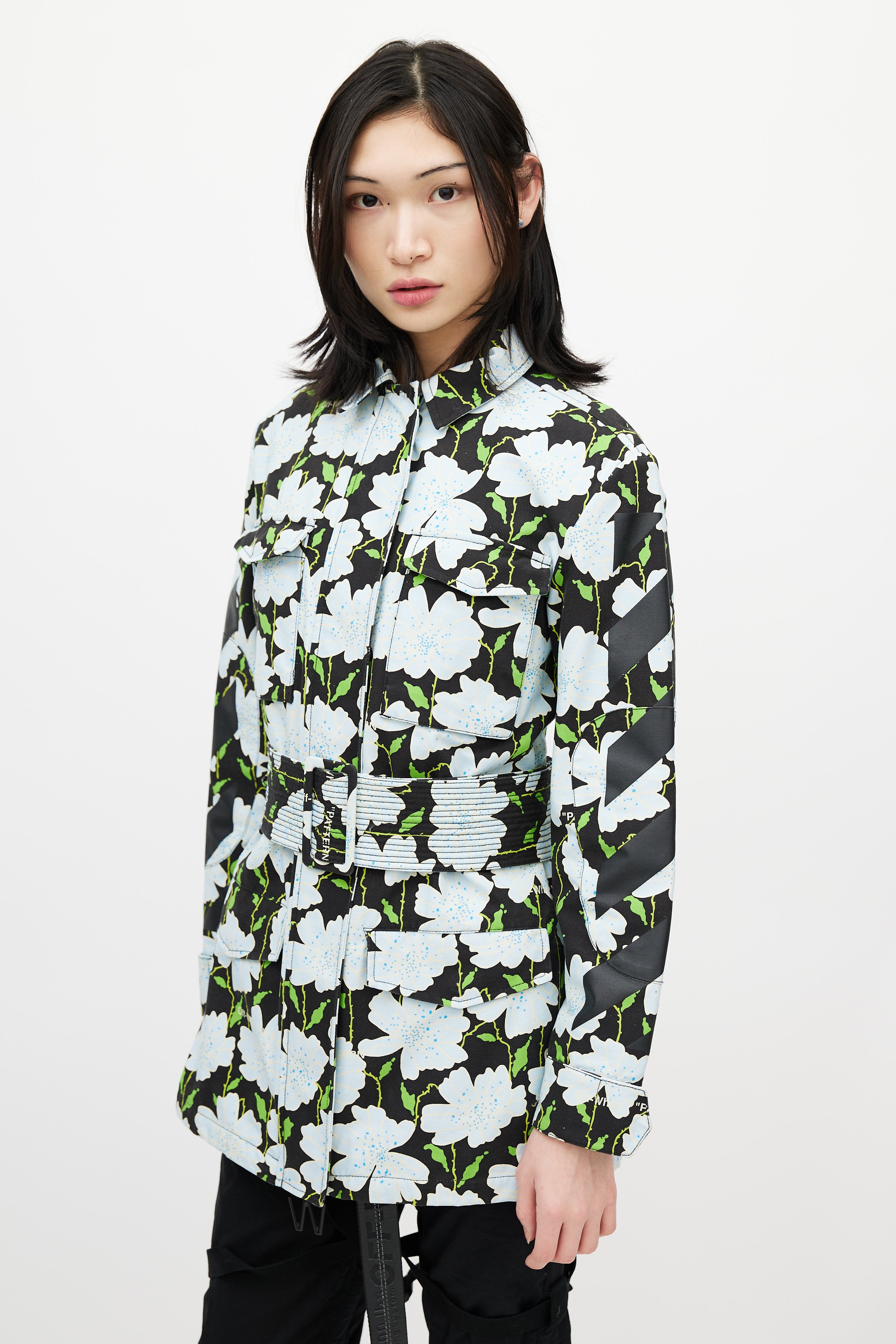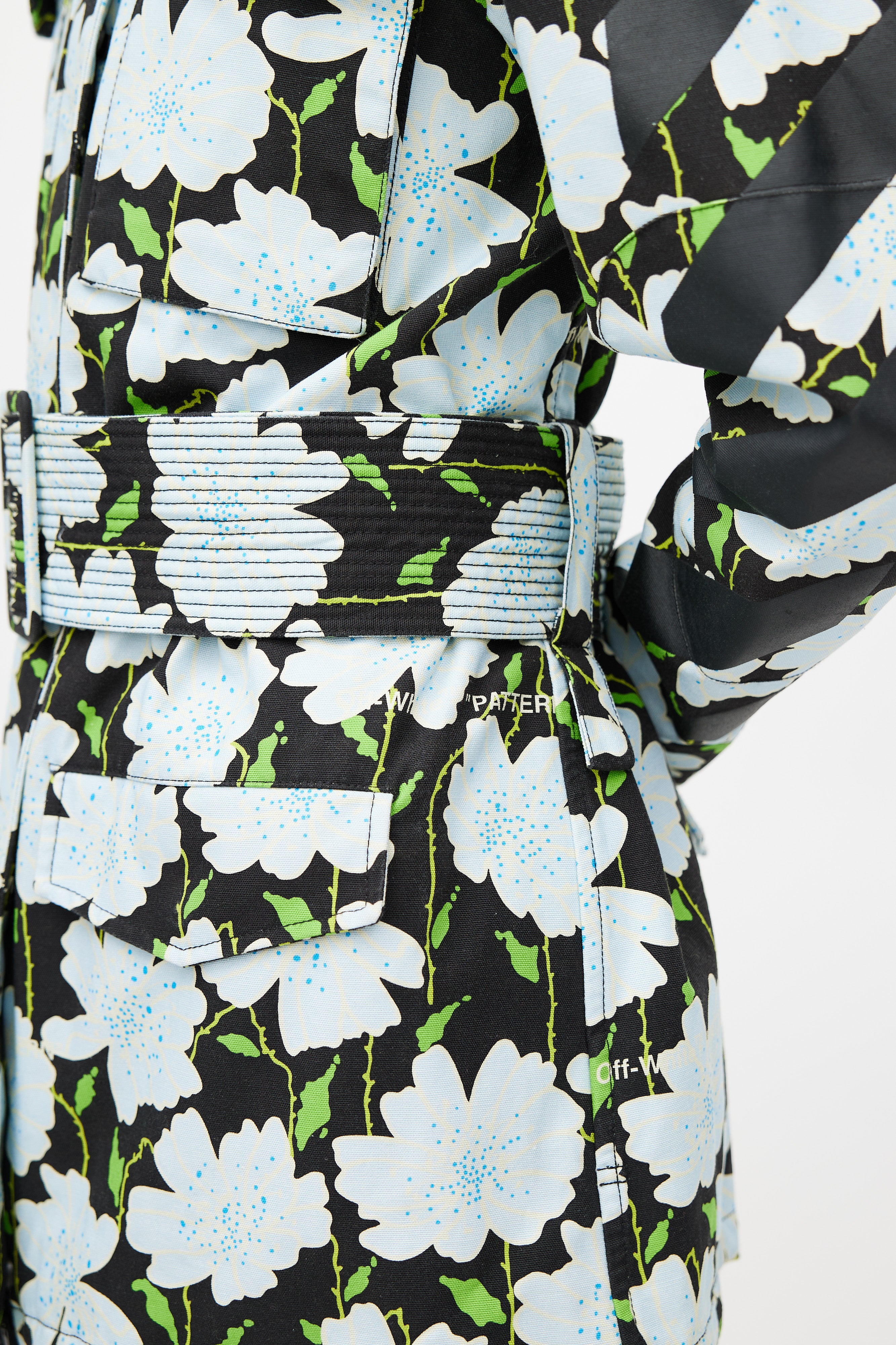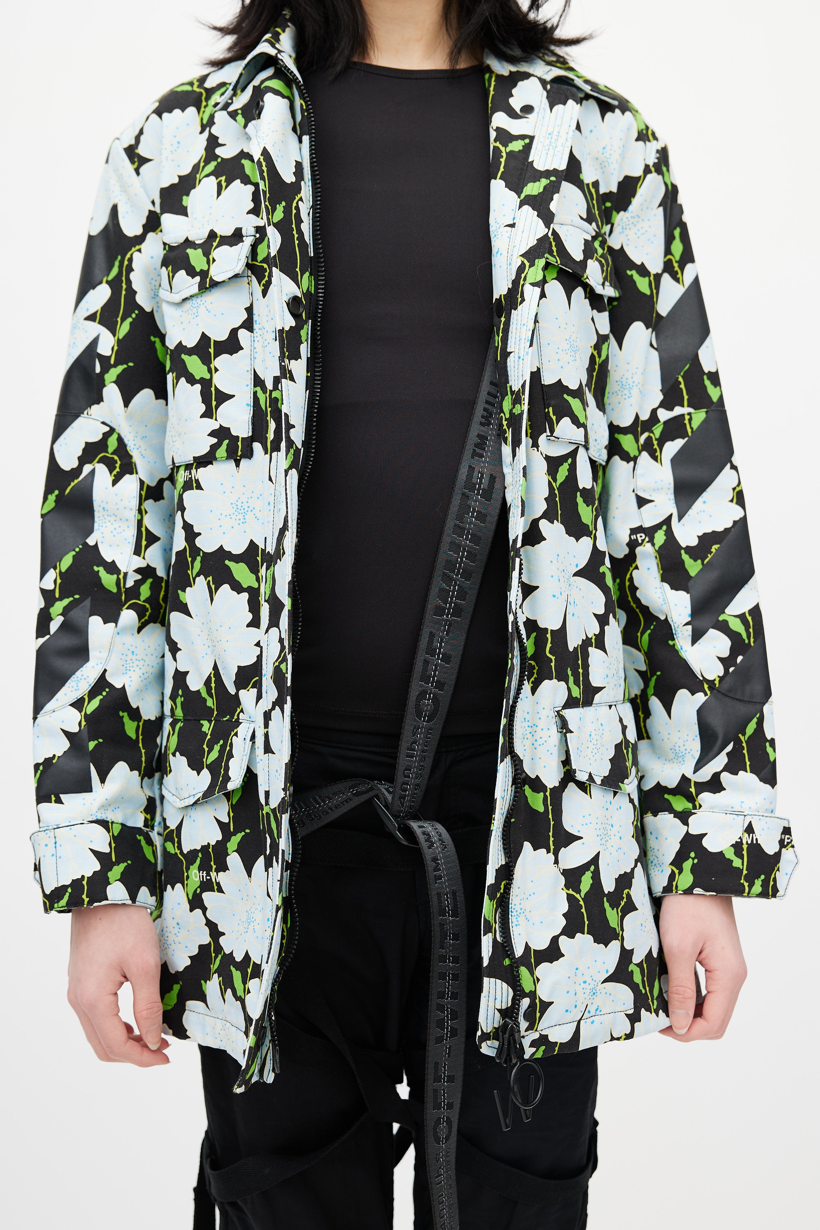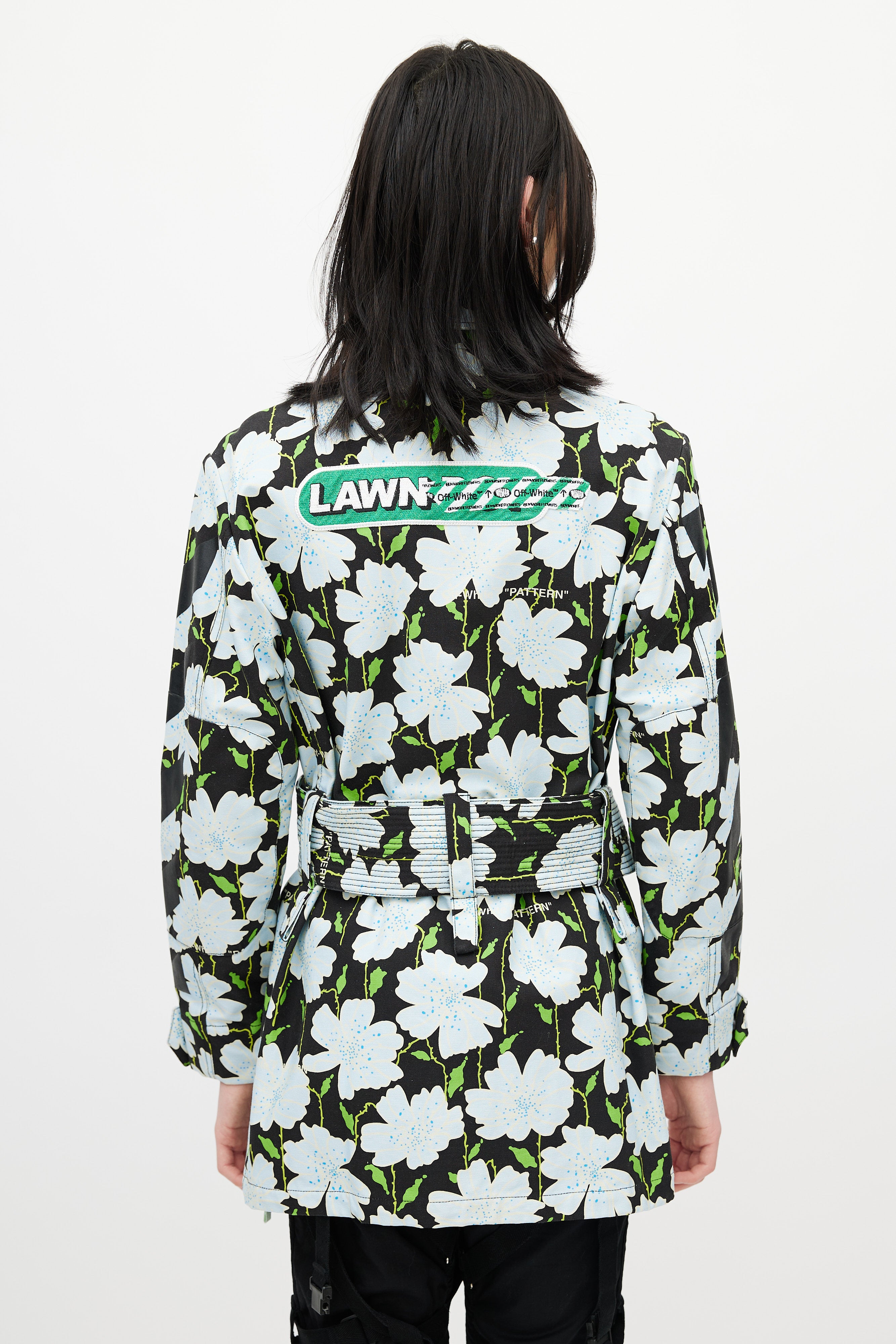 Pre-owned Off-white black Lawn jacket featuring a multicolour floral pattern throughout, pointed collar, long sleeves with buttoned cuffs, logo embroidery at back, two flap pockets at chest, two flap pockets at hip, adjustable belt at waist, and zip closure with logo pull tab. Lined.