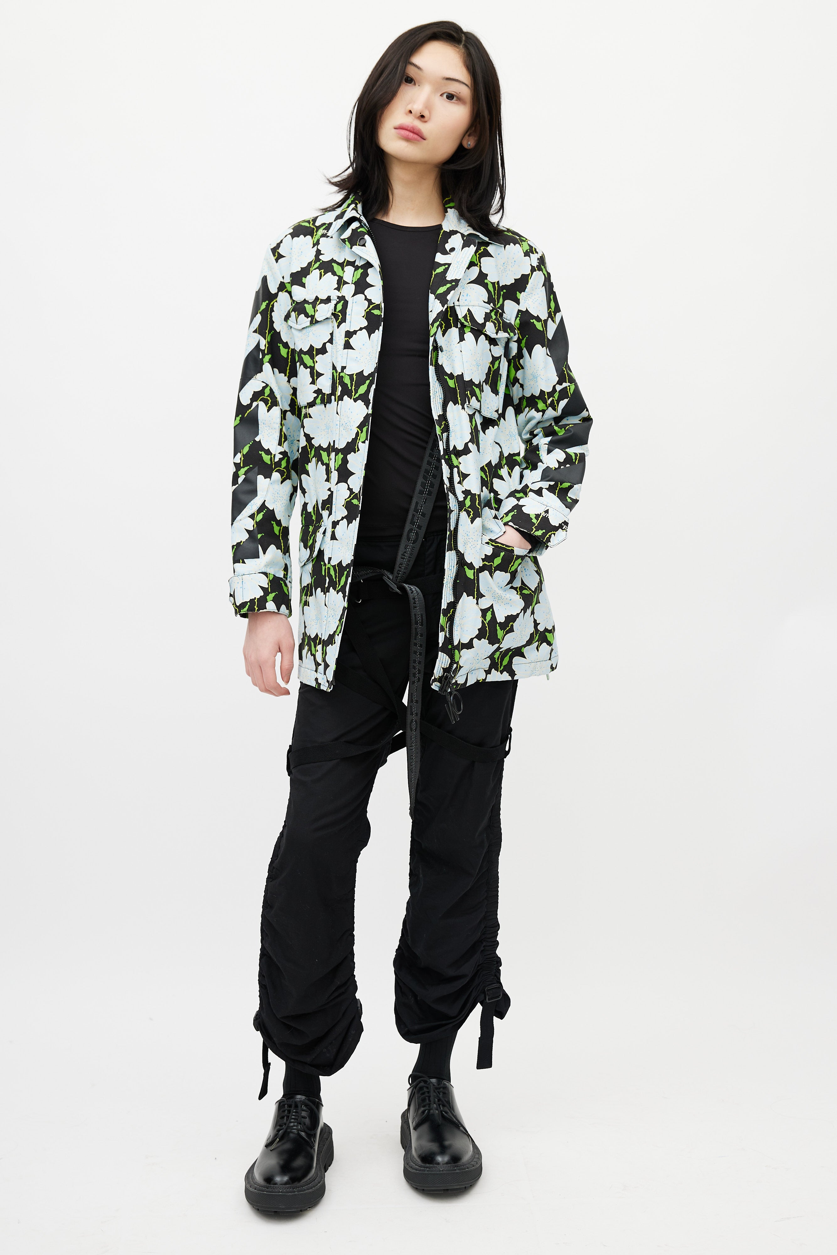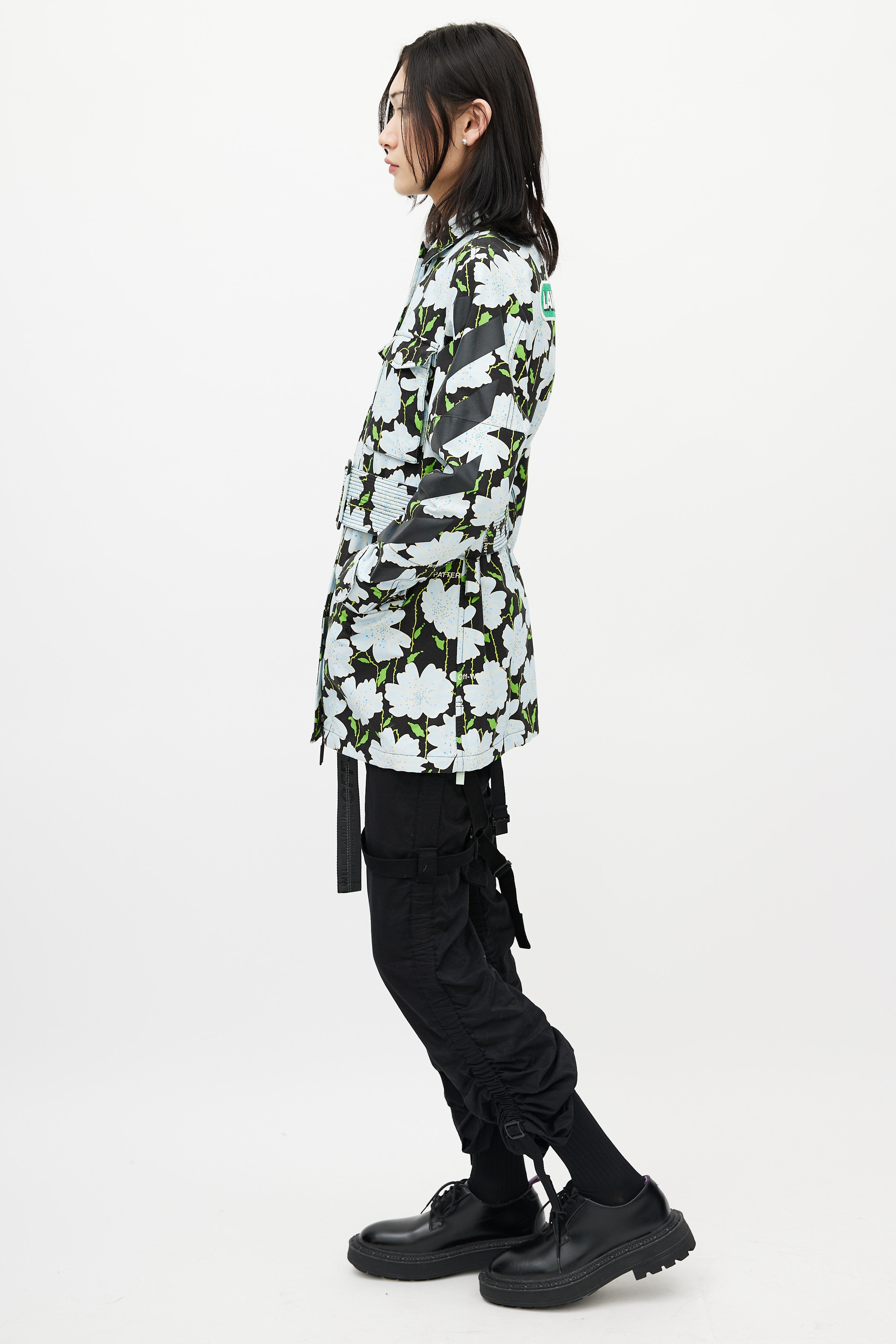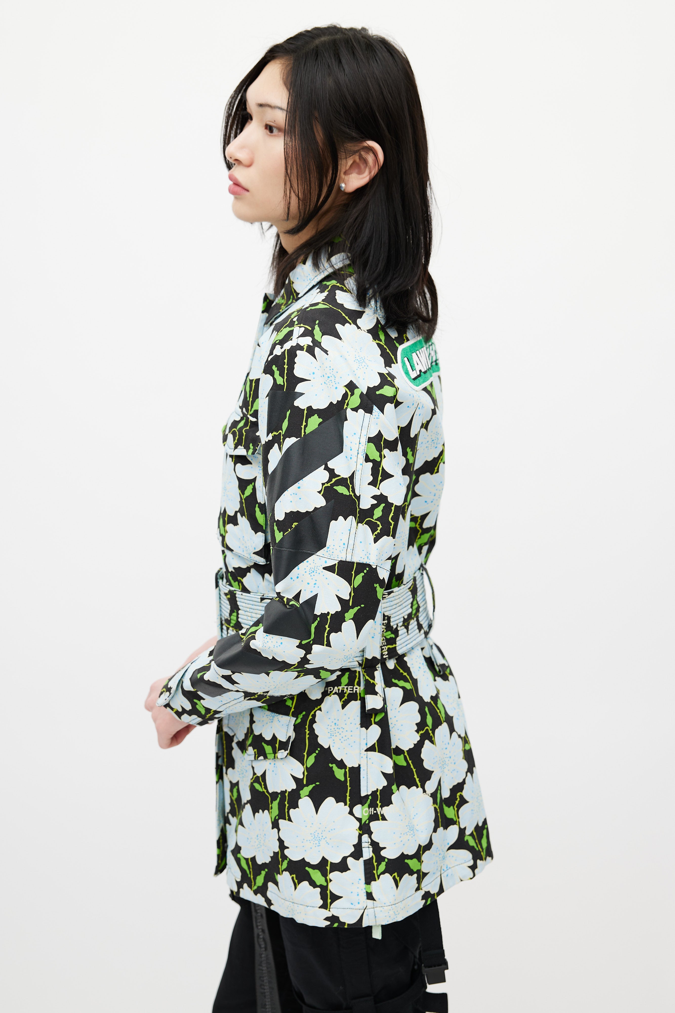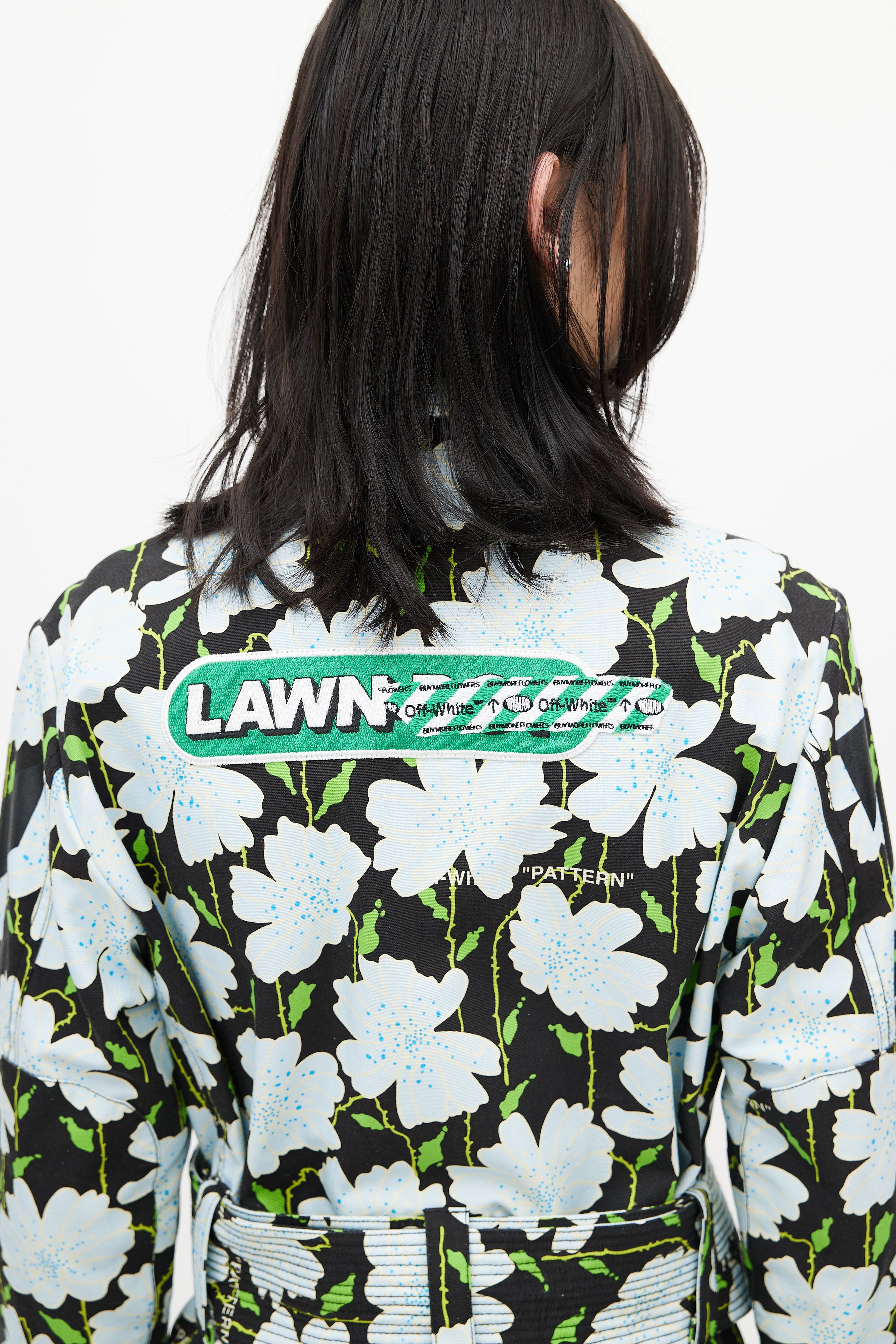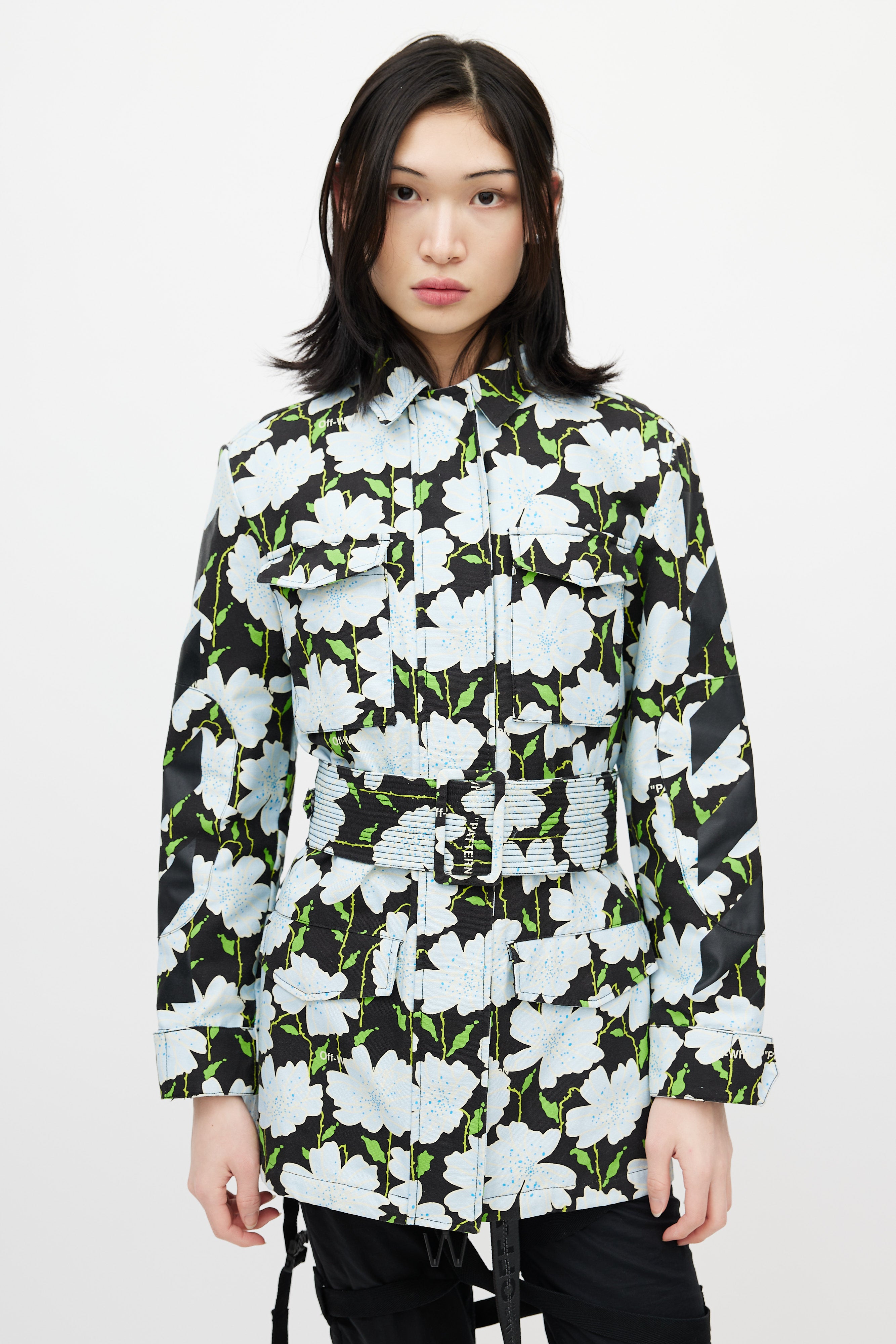 Pre-owned Off-white black Lawn jacket featuring a multicolour floral pattern throughout, pointed collar, long sleeves with buttoned cuffs, logo embroidery at back, two flap pockets at chest, two flap pockets at hip, adjustable belt at waist, and zip closure with logo pull tab. Lined.