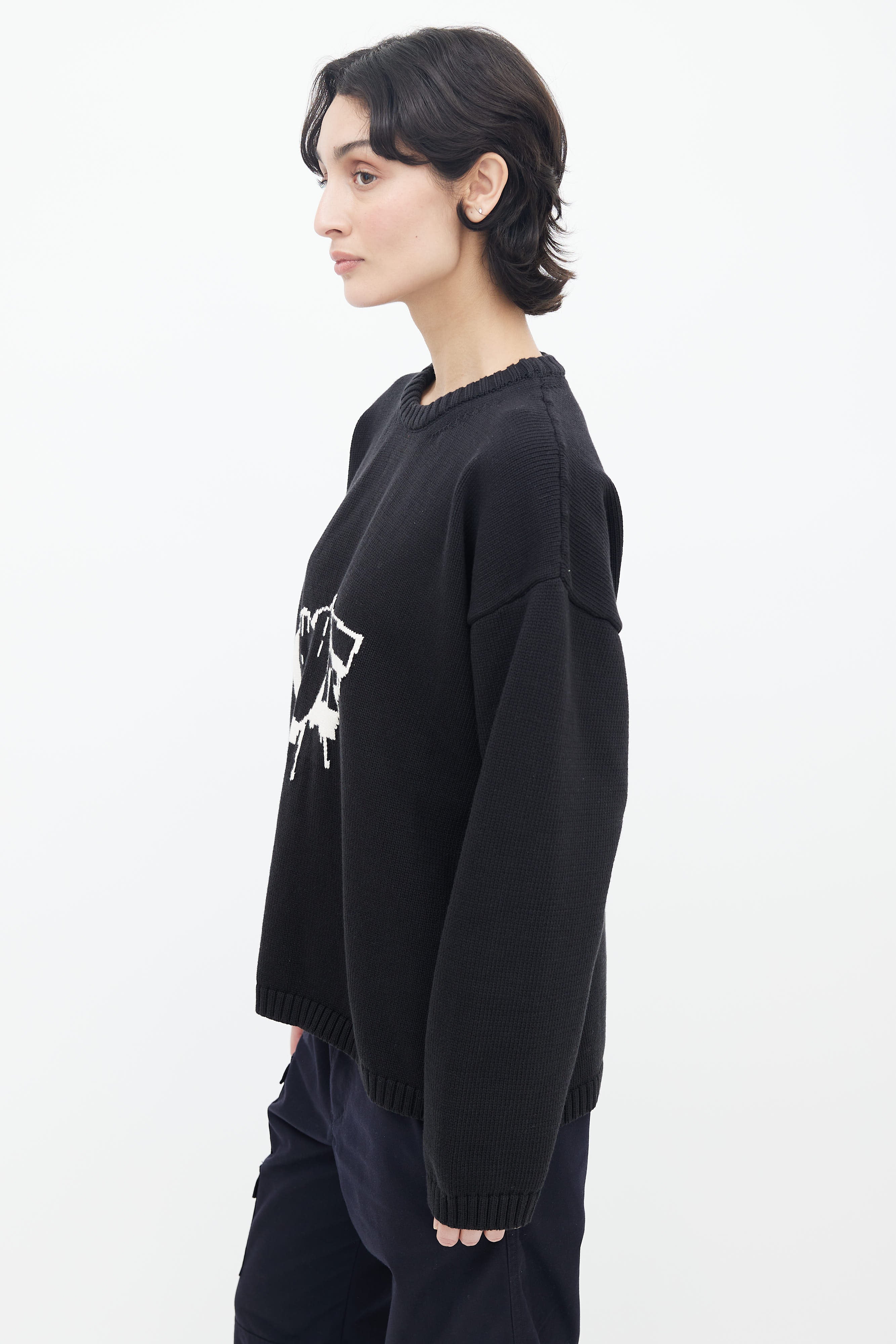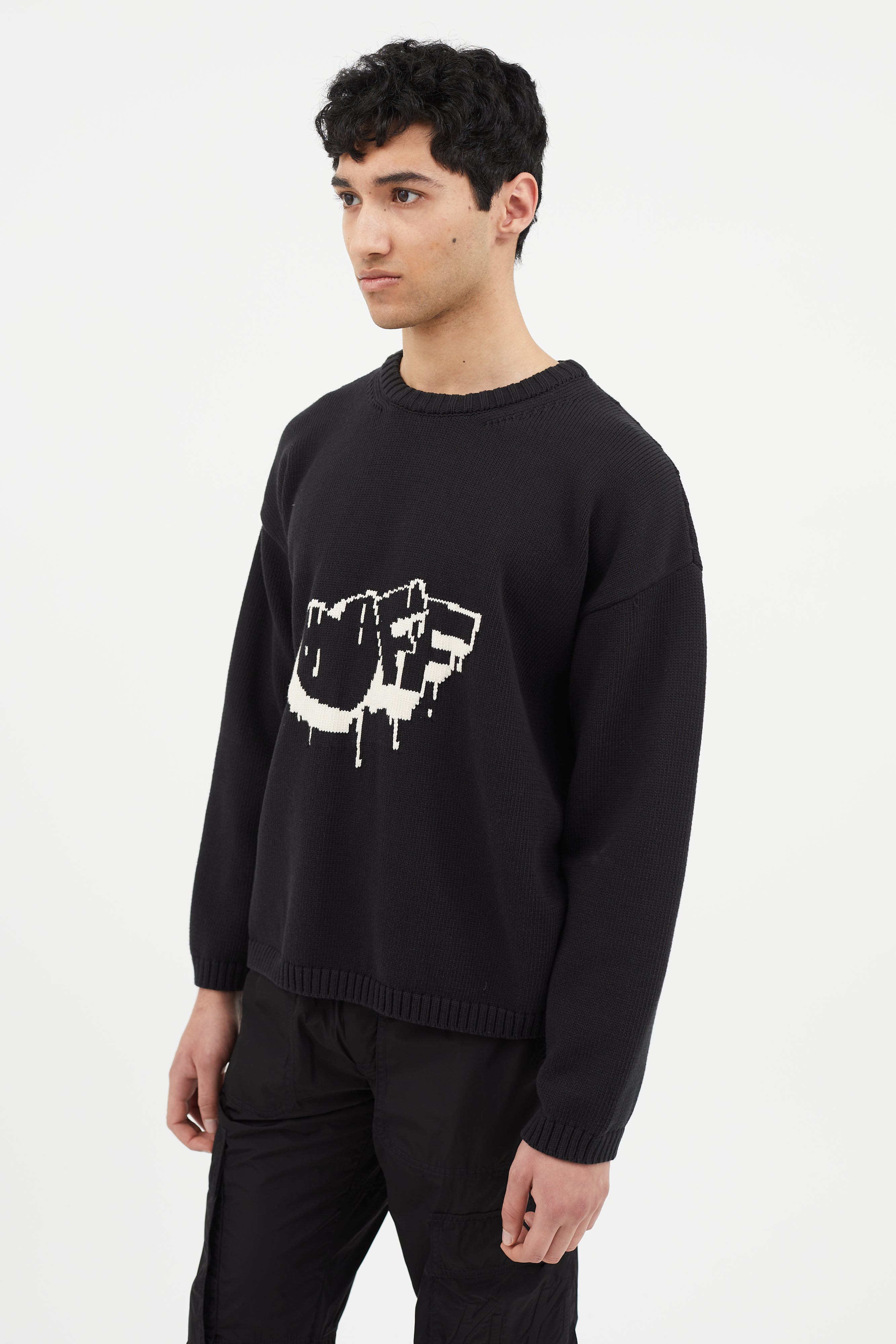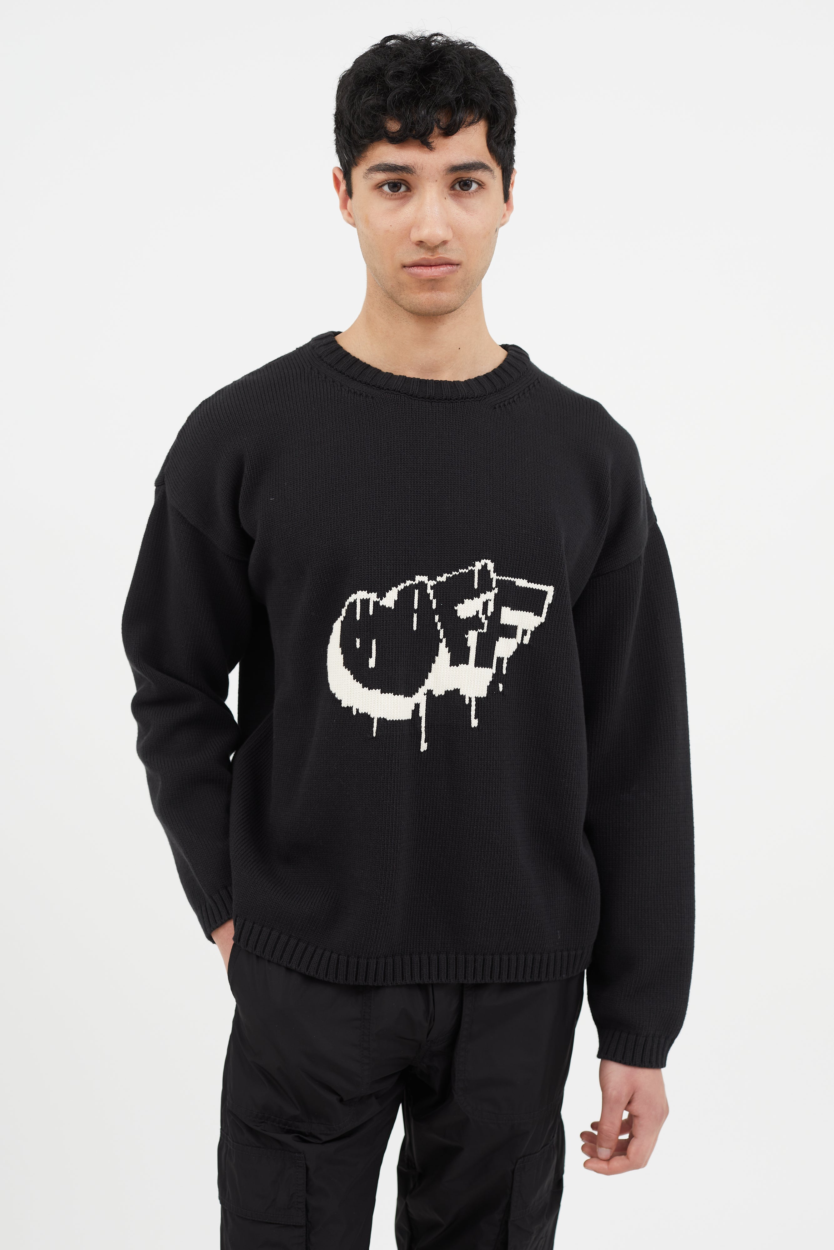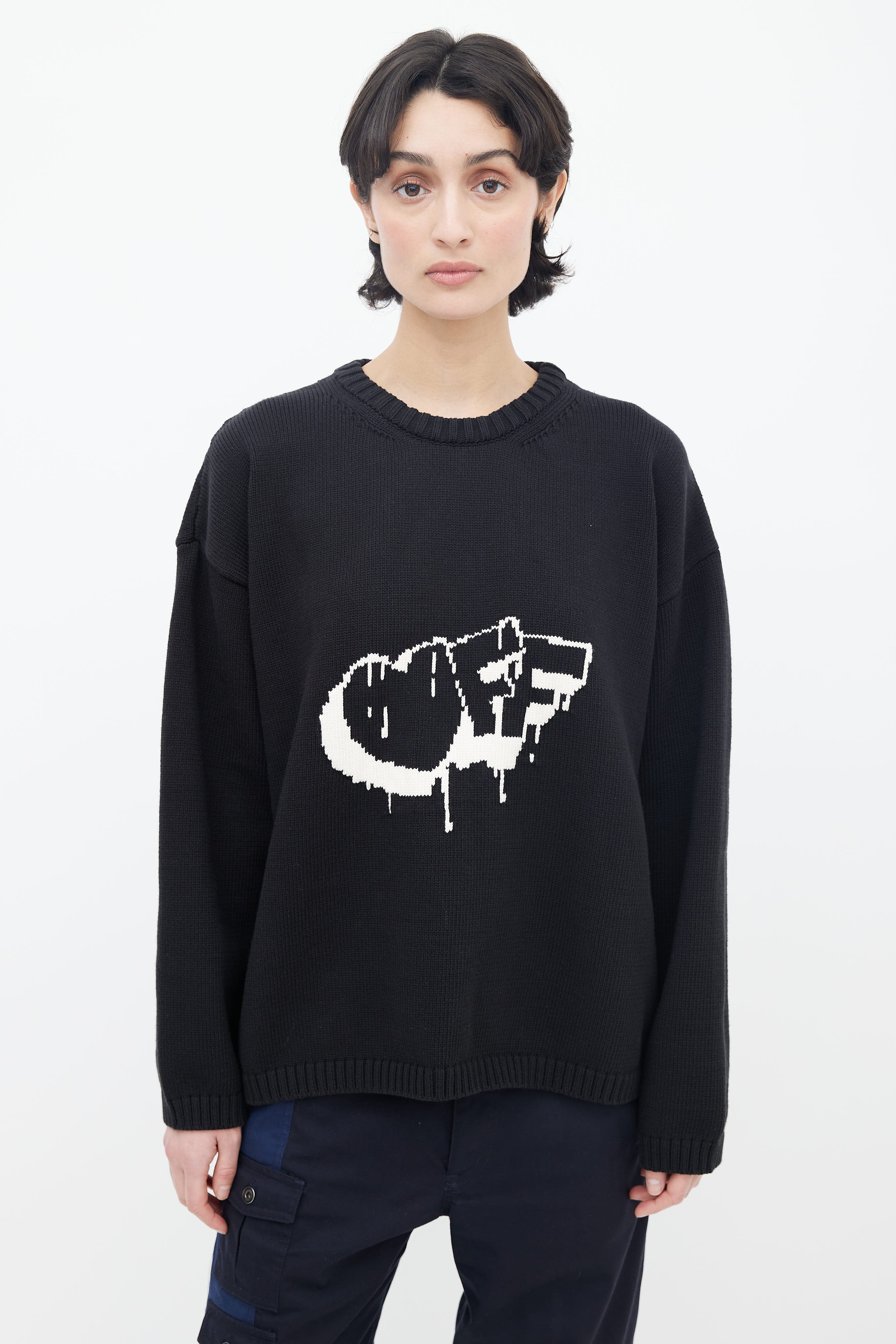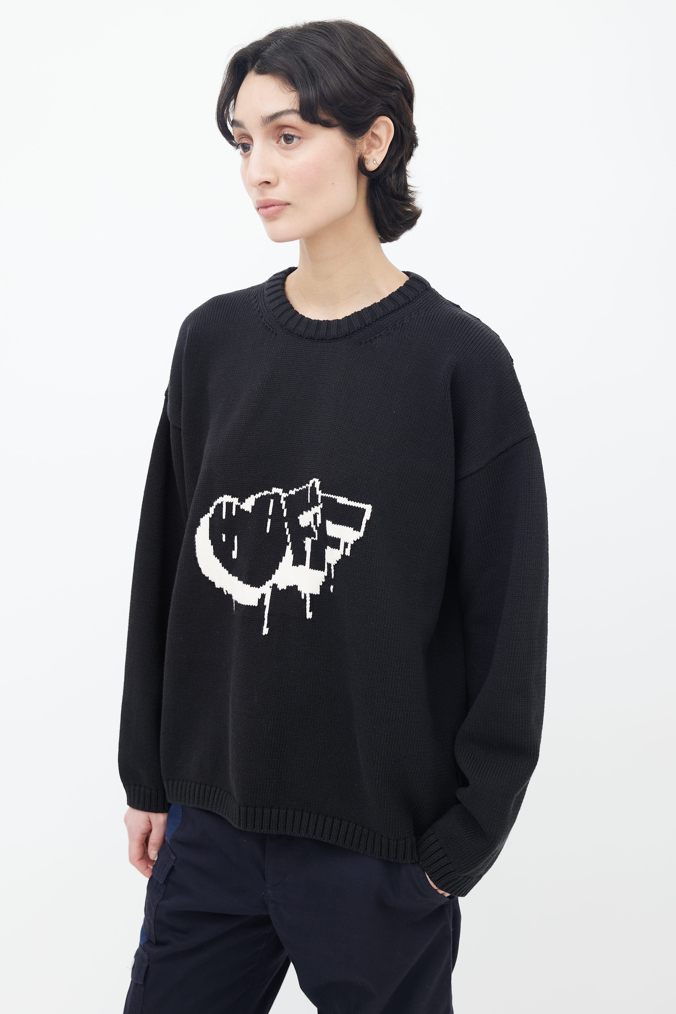 Off-White Bubble Arrow knit sweater in black featuring white logo intarsia at front and back, long sleeves, and tight ribbed collar, cuffs, and hem.
