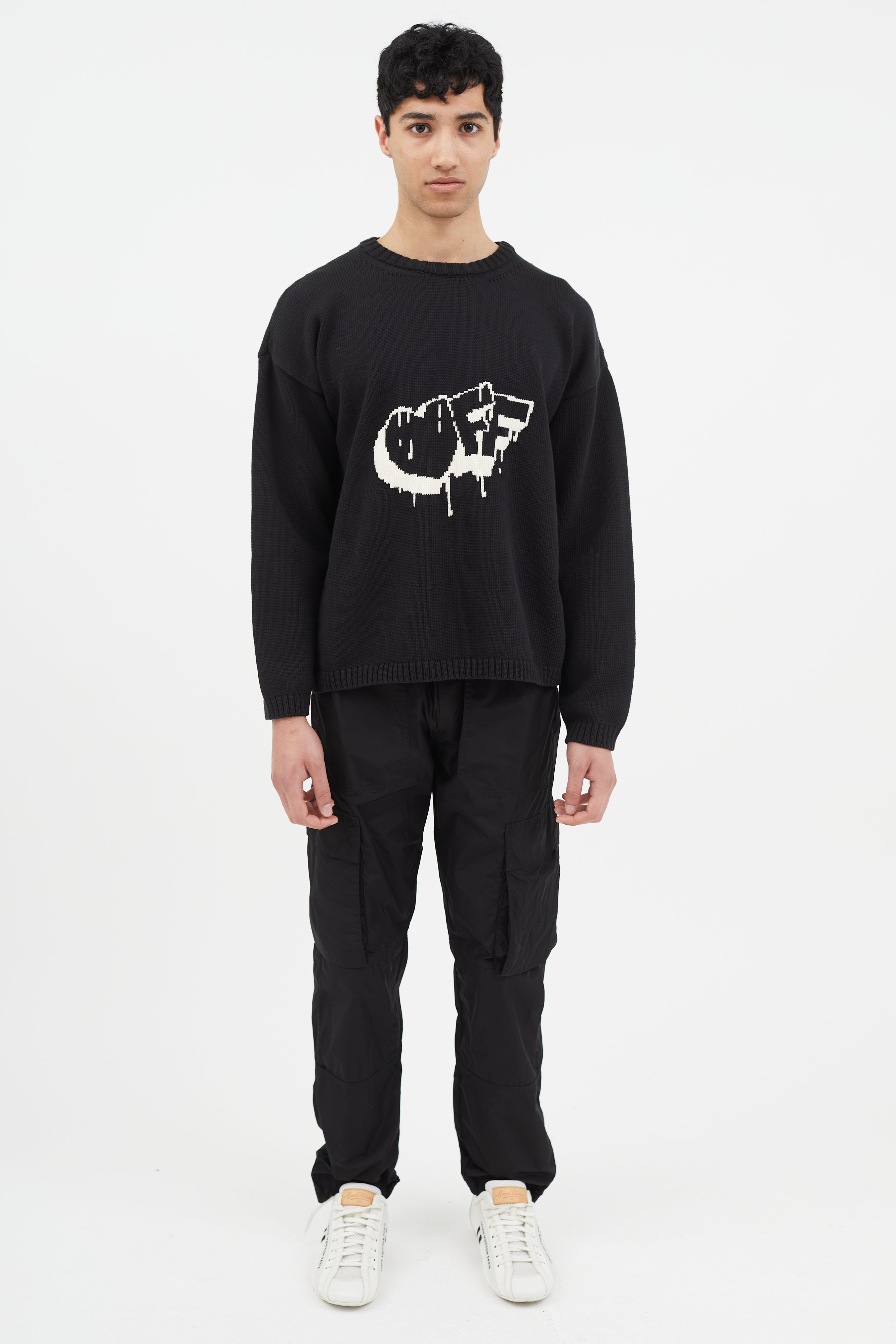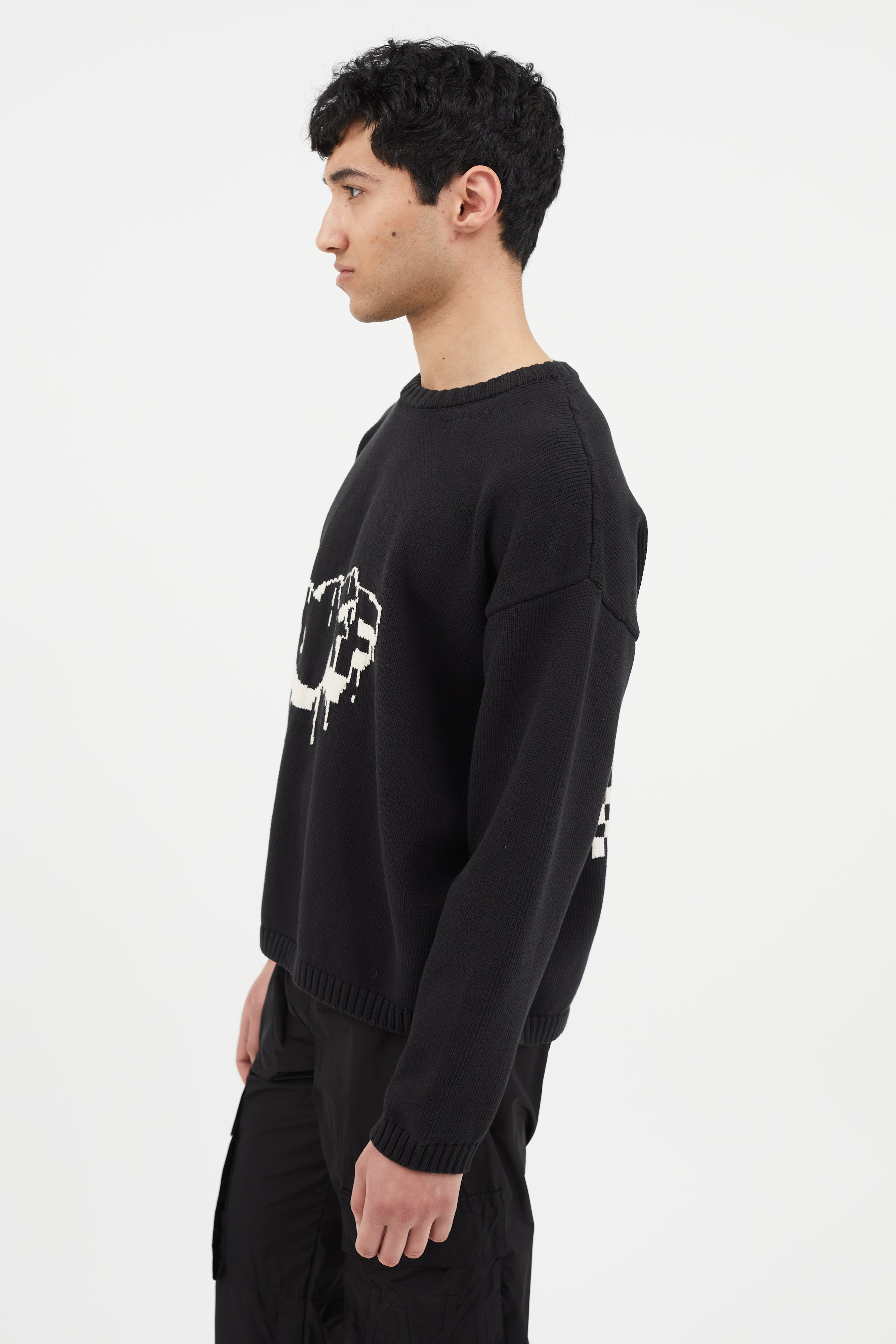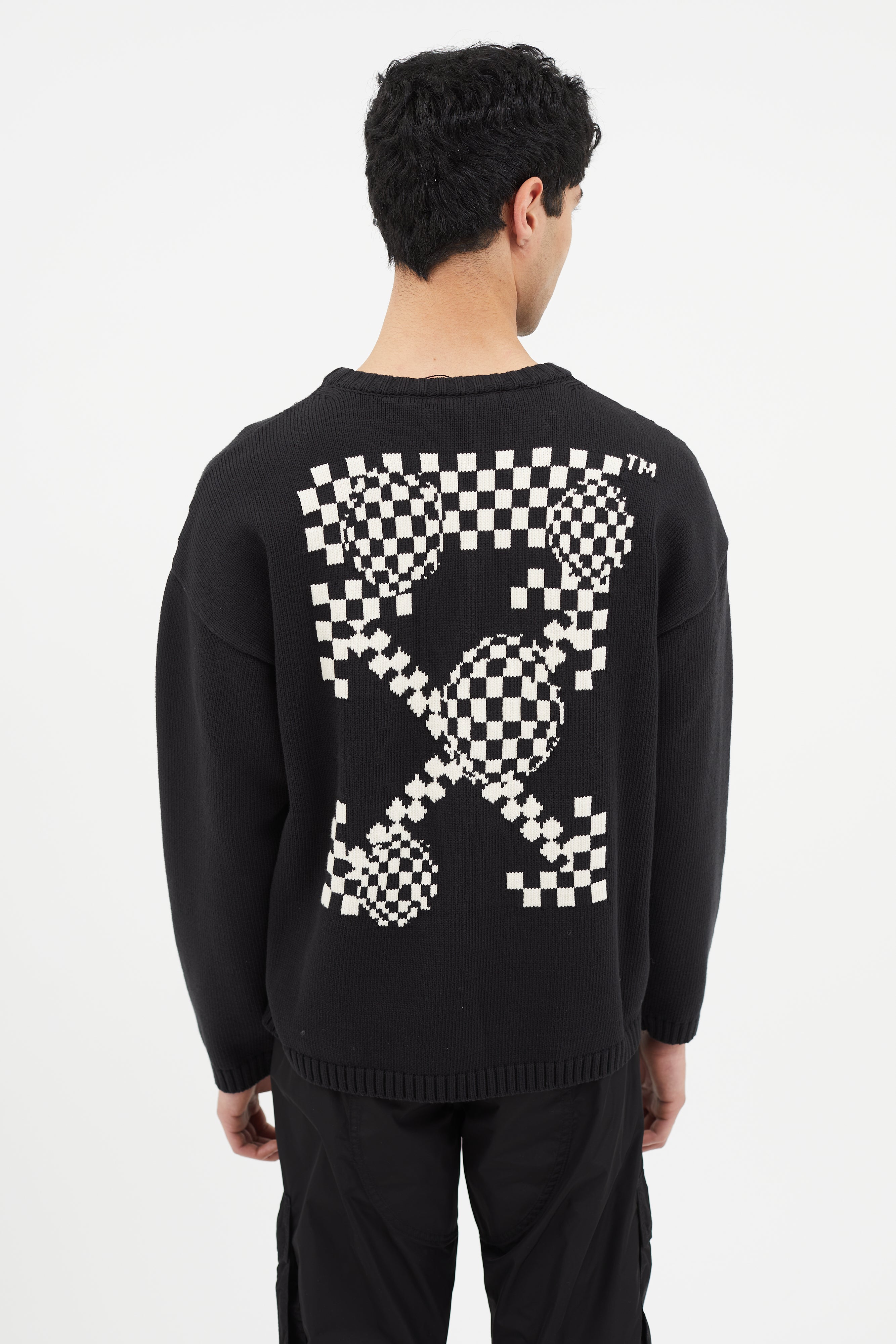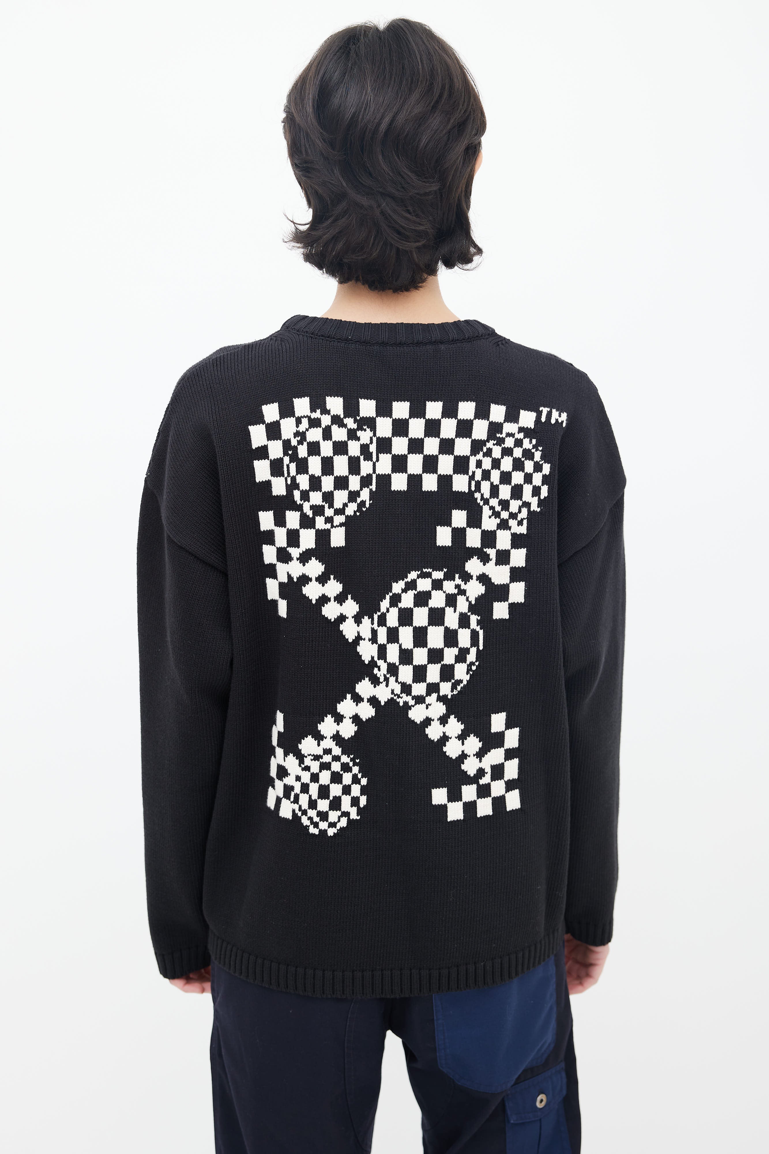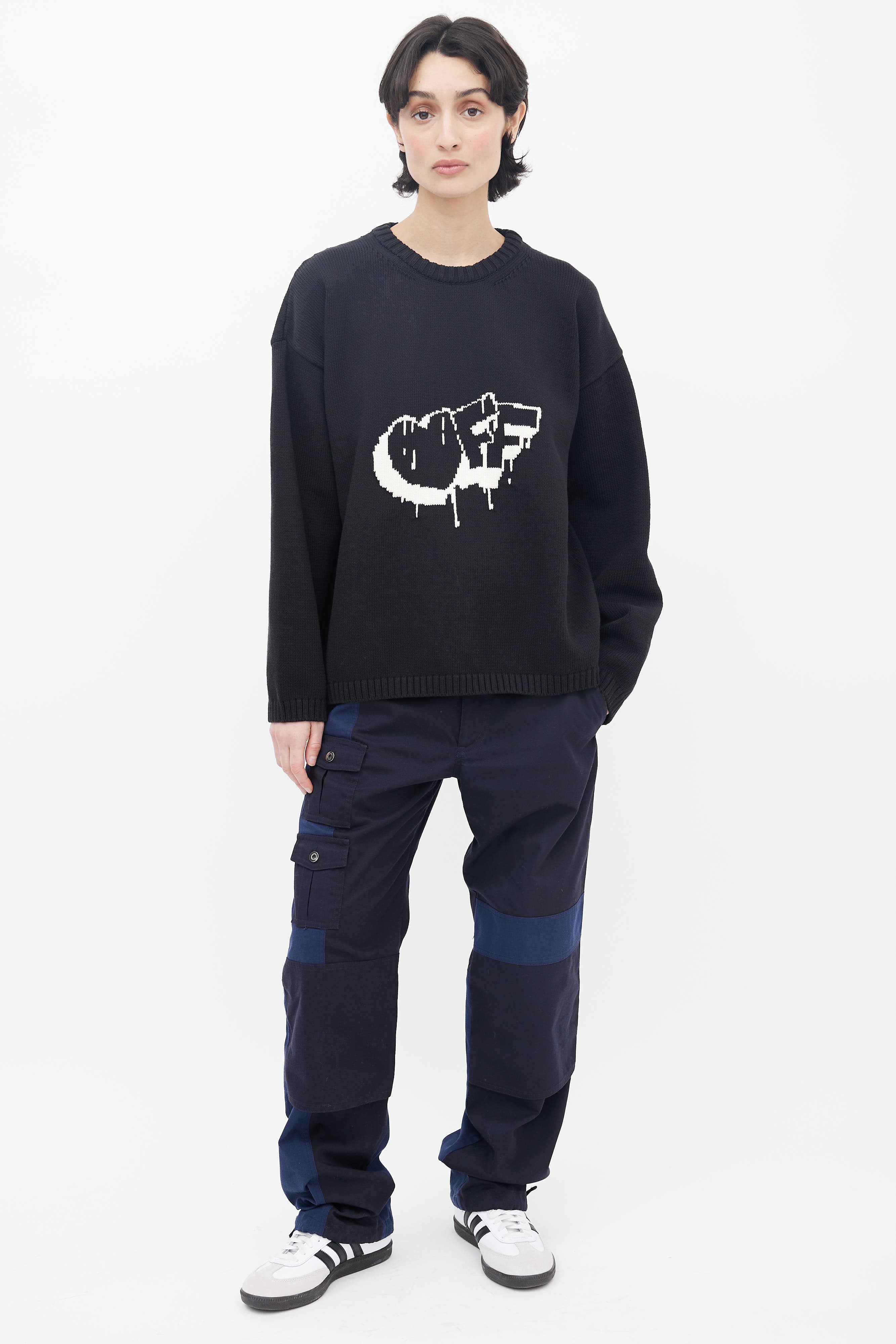 Off-White Bubble Arrow knit sweater in black featuring white logo intarsia at front and back, long sleeves, and tight ribbed collar, cuffs, and hem.