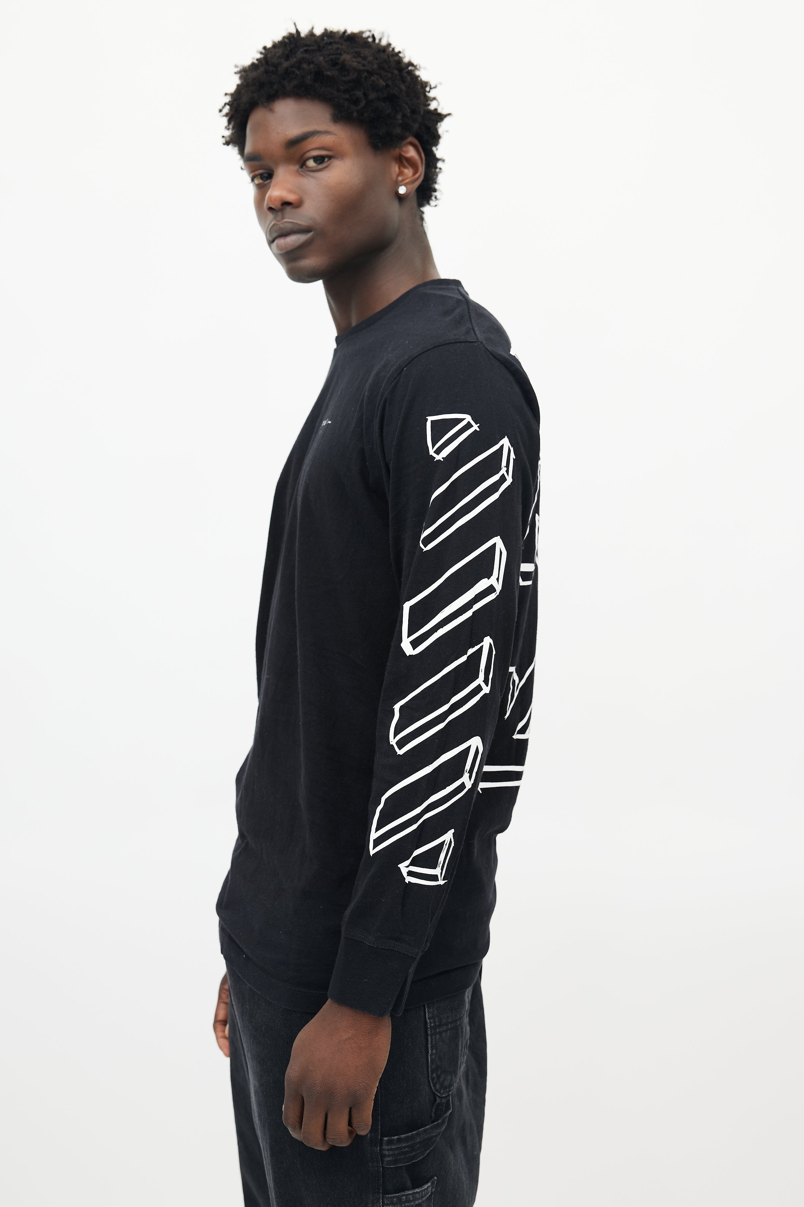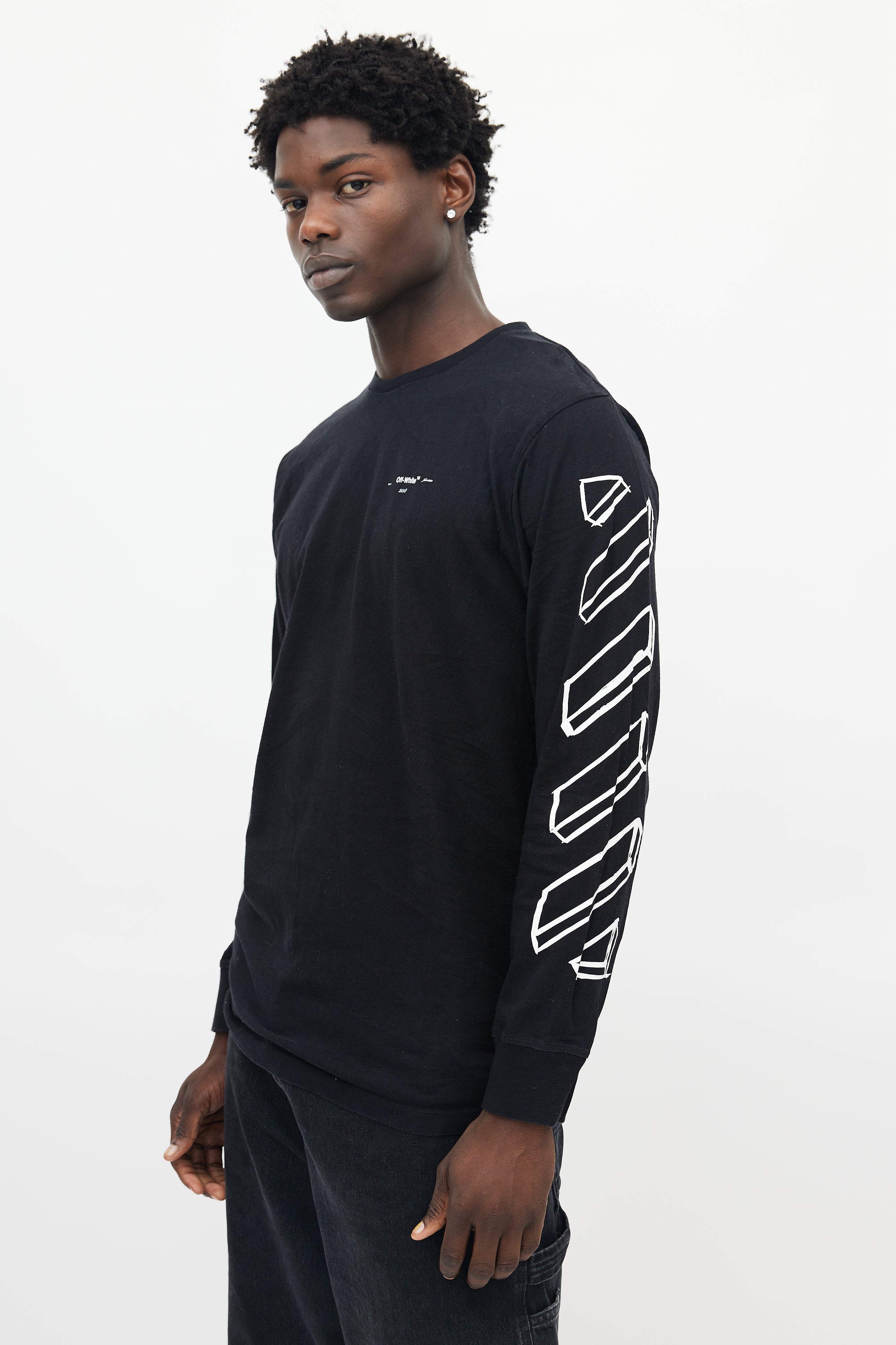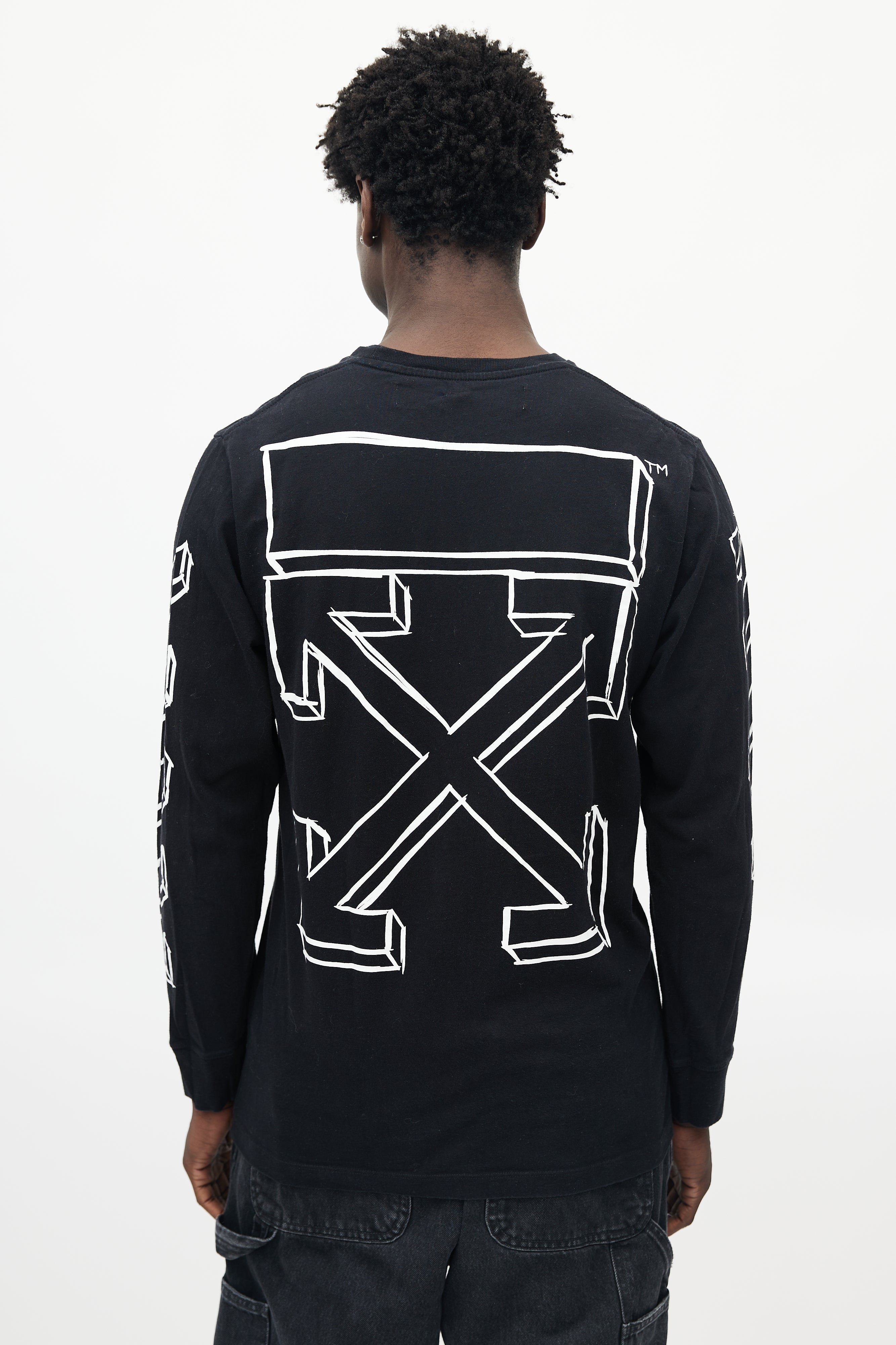 Pre-owned Off-White black longsleeve shirt featuring a crew neckline, white logo print throughout, and ribbed cuffs.