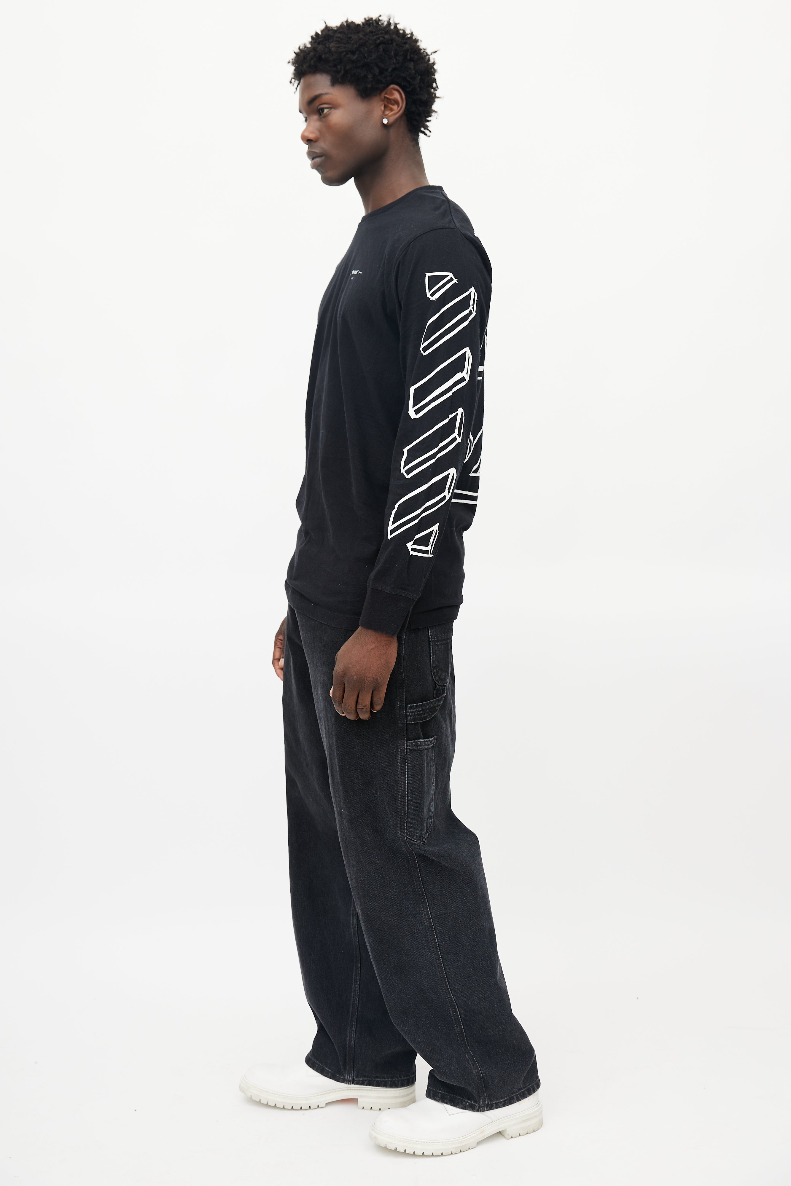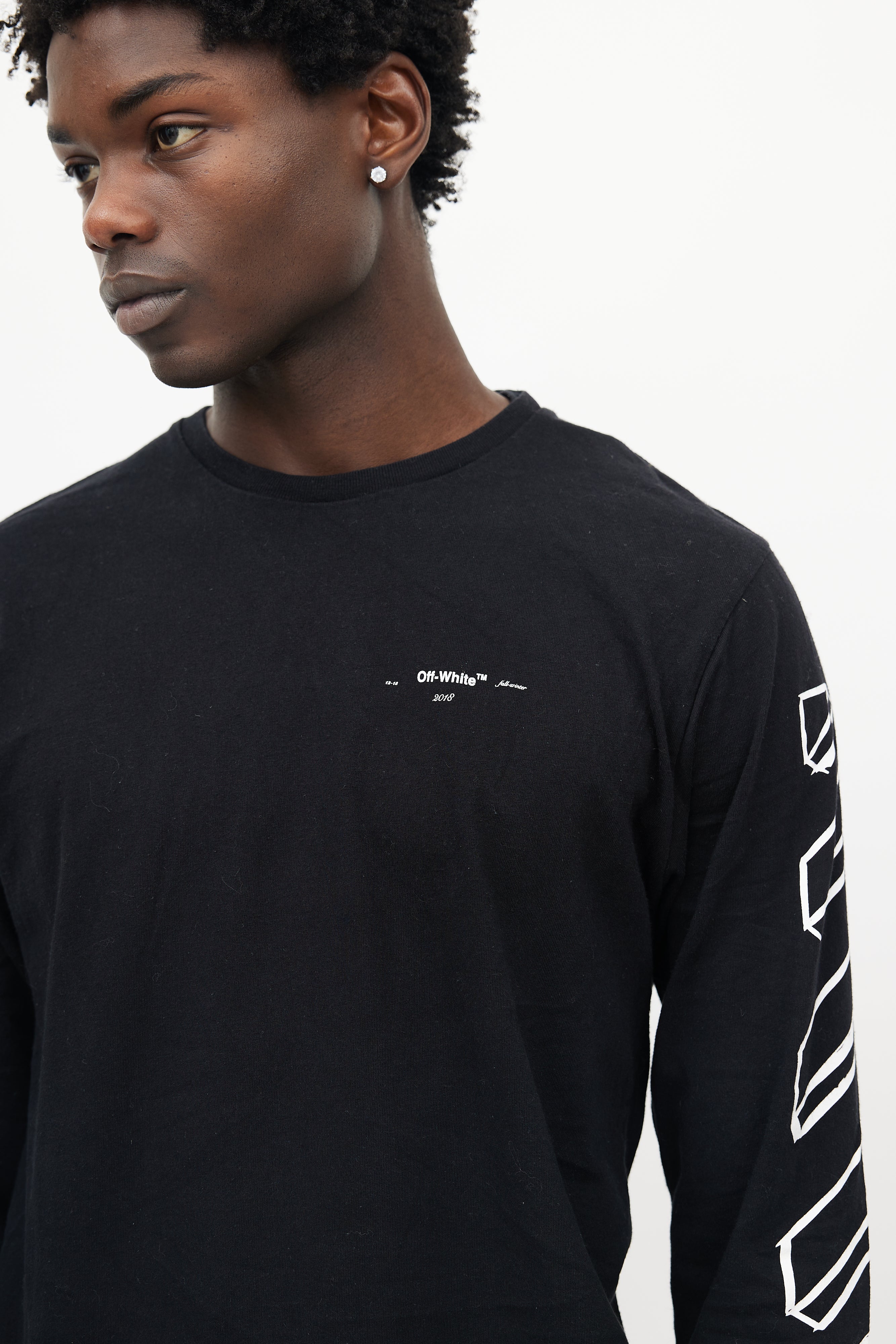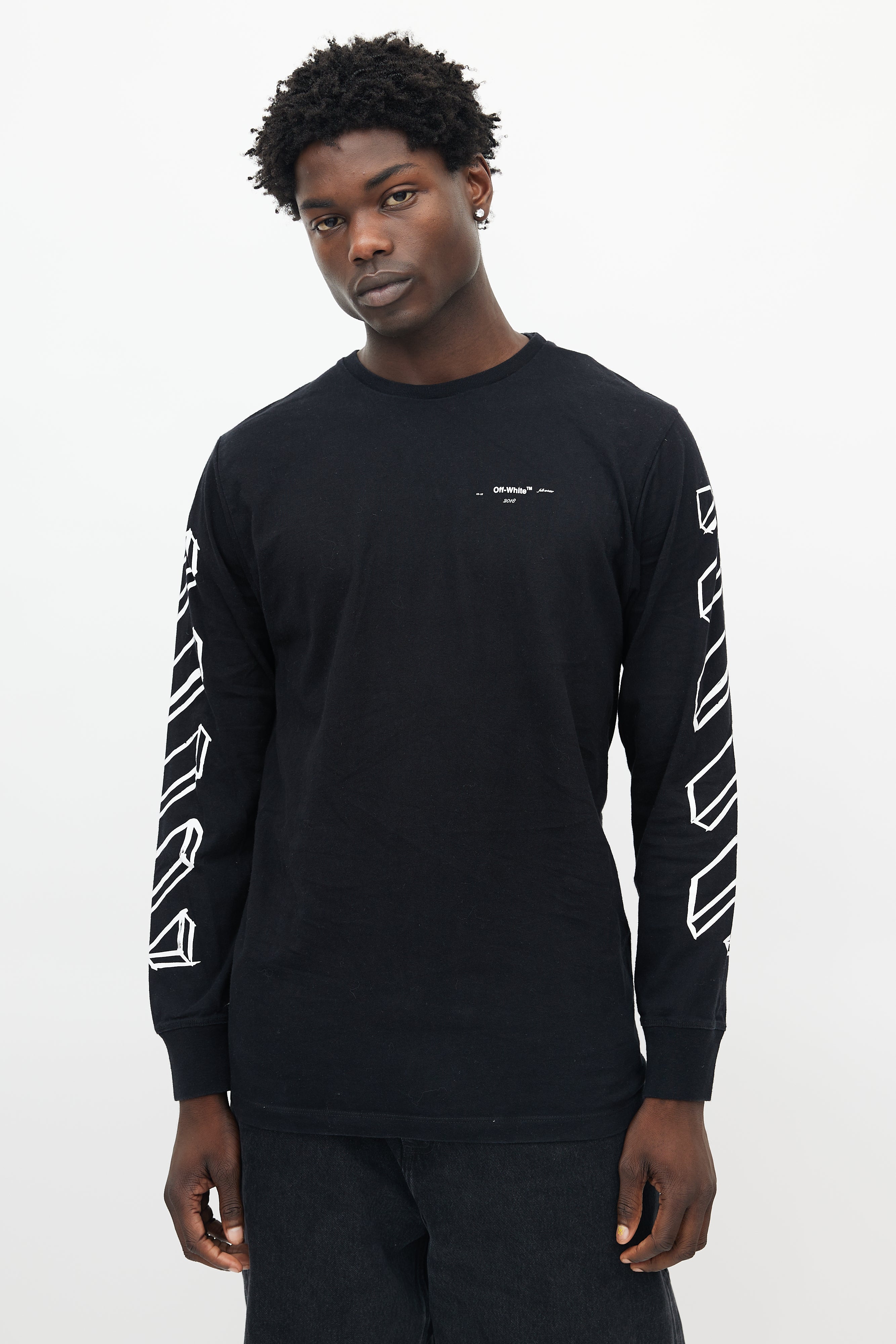 Pre-owned Off-White black longsleeve shirt featuring a crew neckline, white logo print throughout, and ribbed cuffs.
