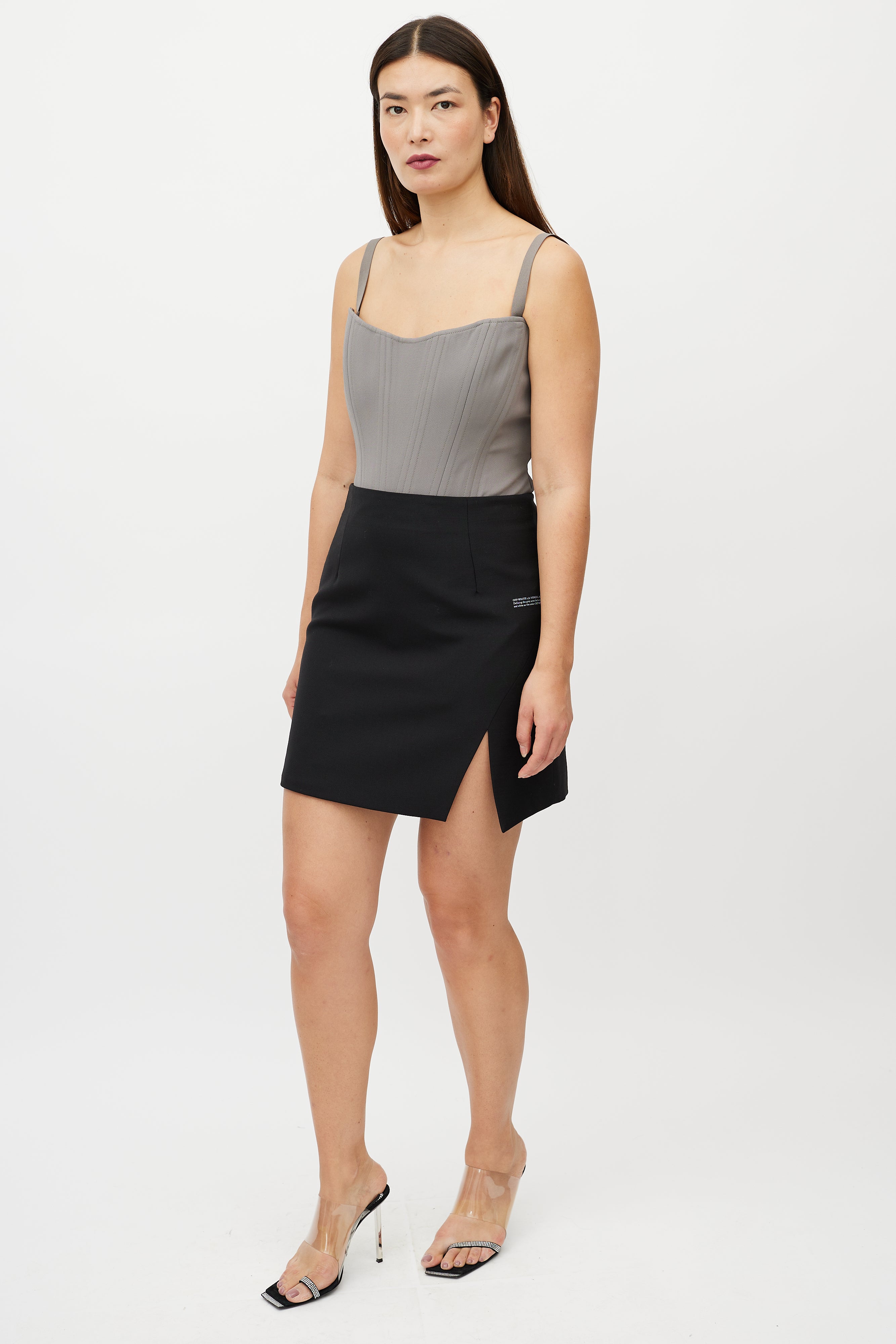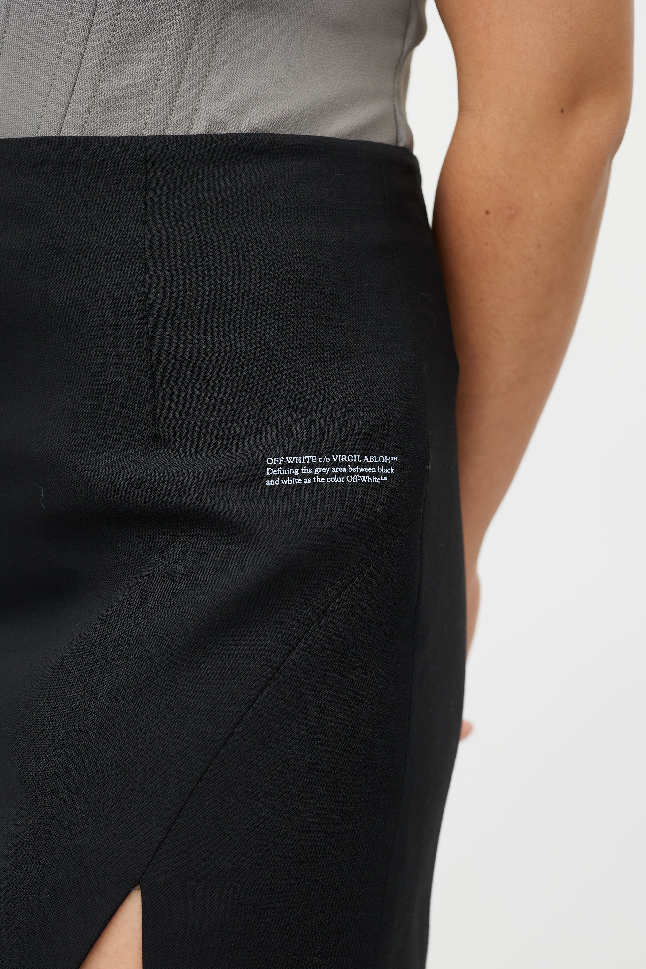 Off-White black wool skirt featuring a printed logo at hip, notched hem, and zip at side with hook and eye closure. Lined.