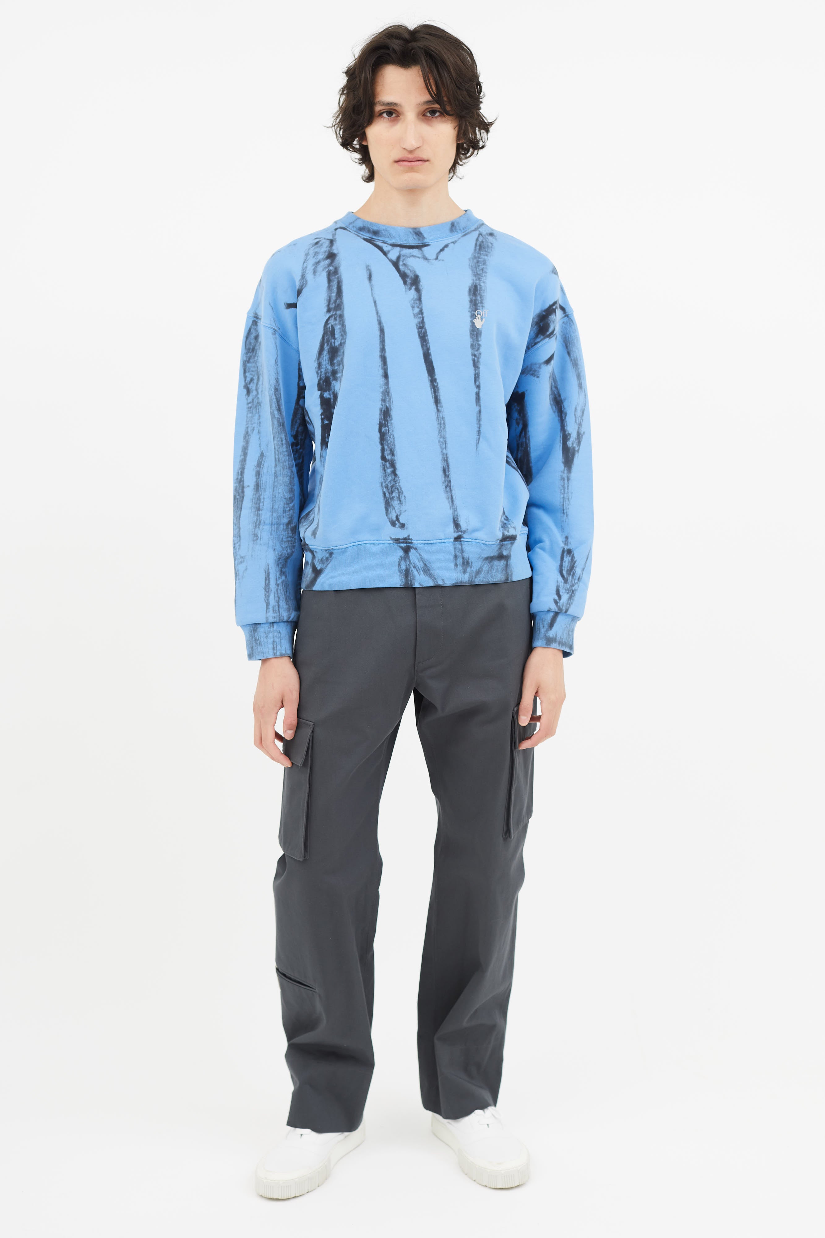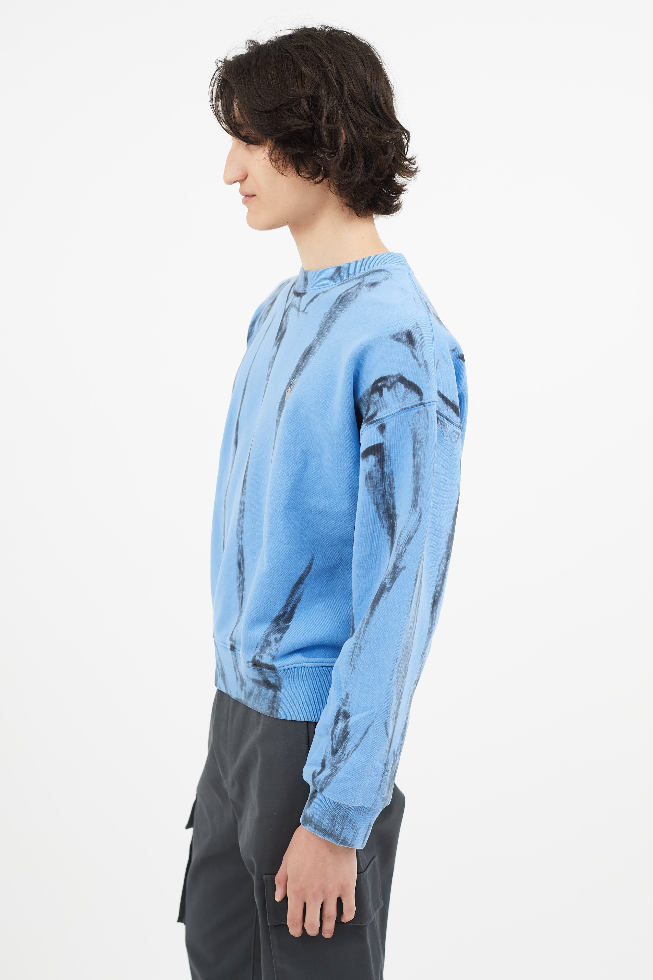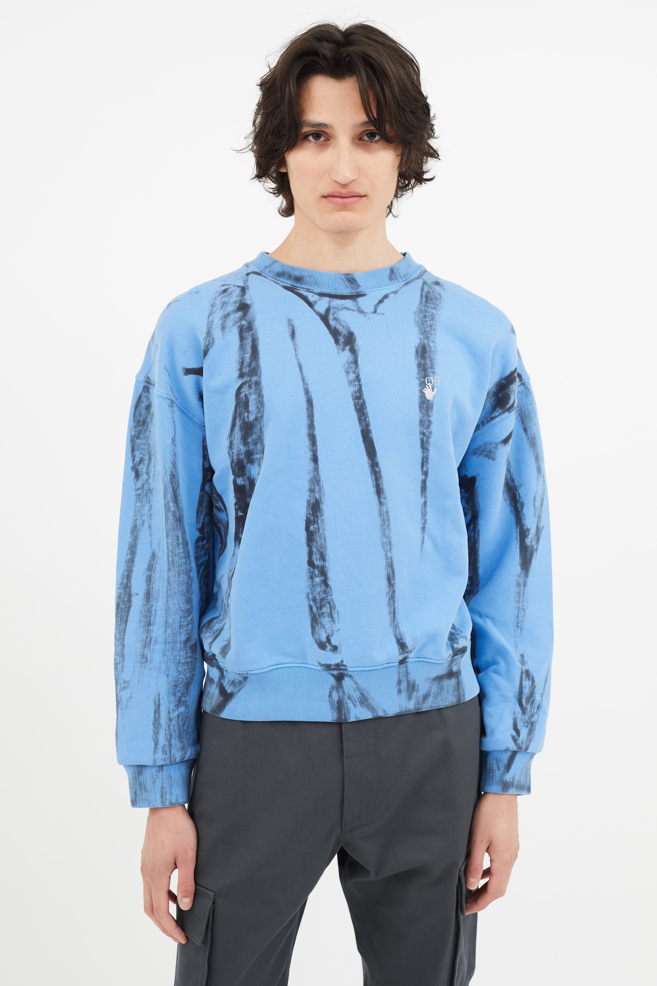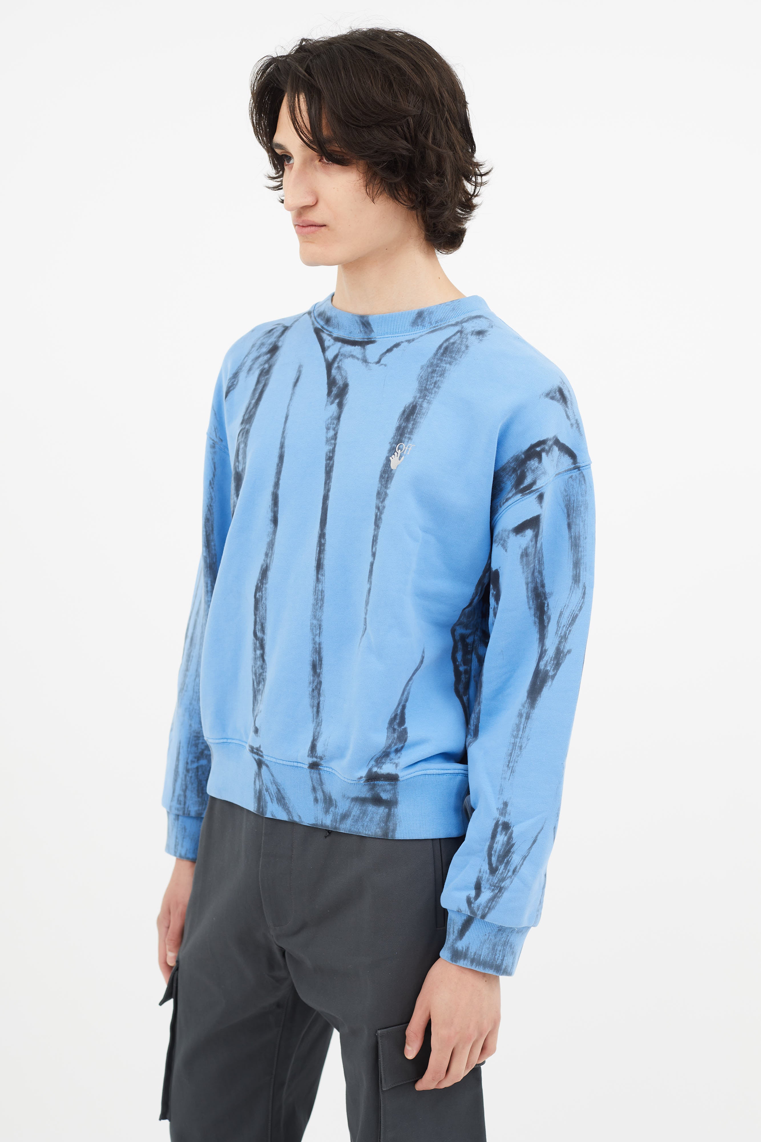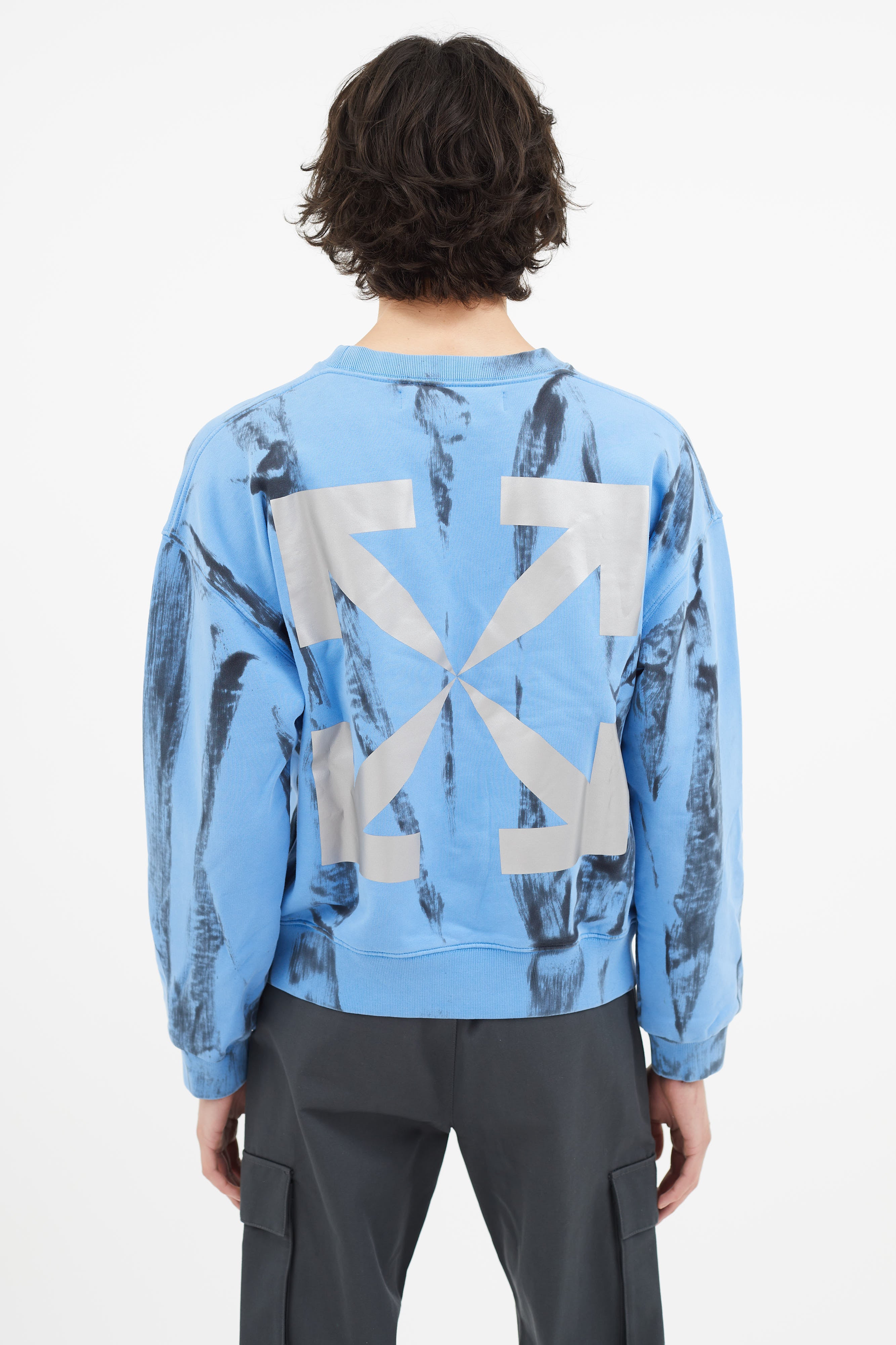 Pre-owned Off-White blue & black tie-dye sweater featuring crew neckline, reflective logo at chest, and reflective signature arrow at back.