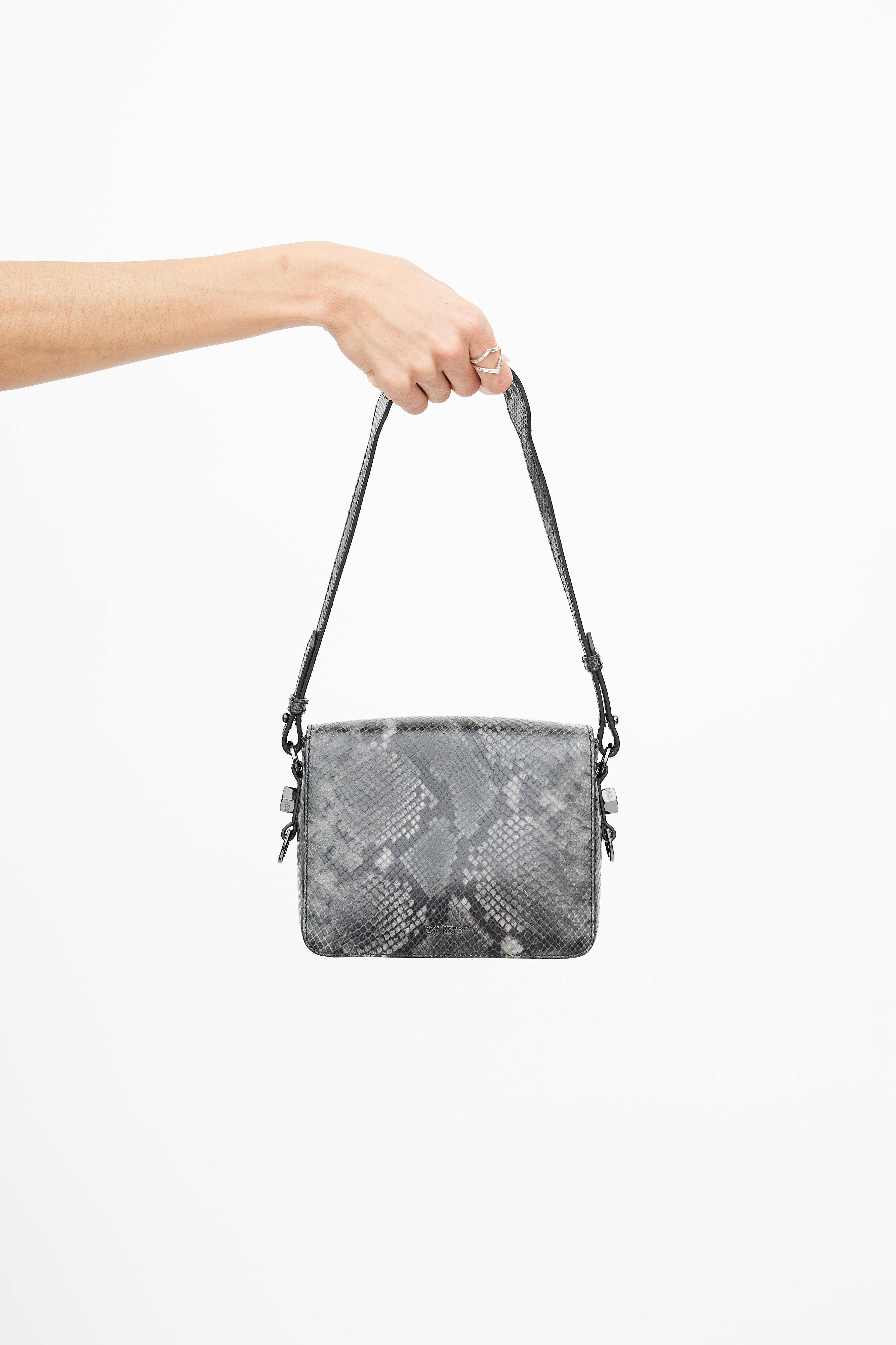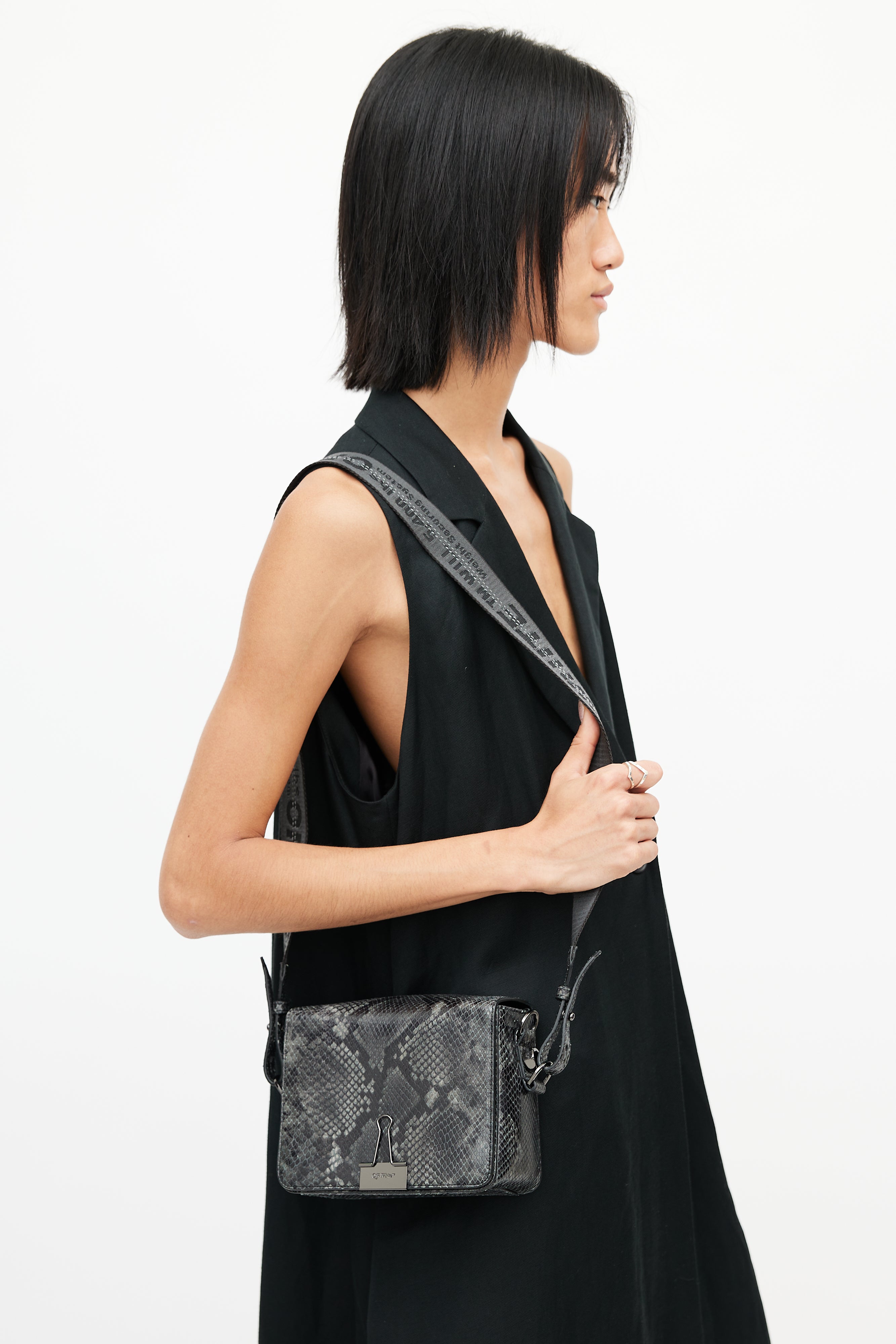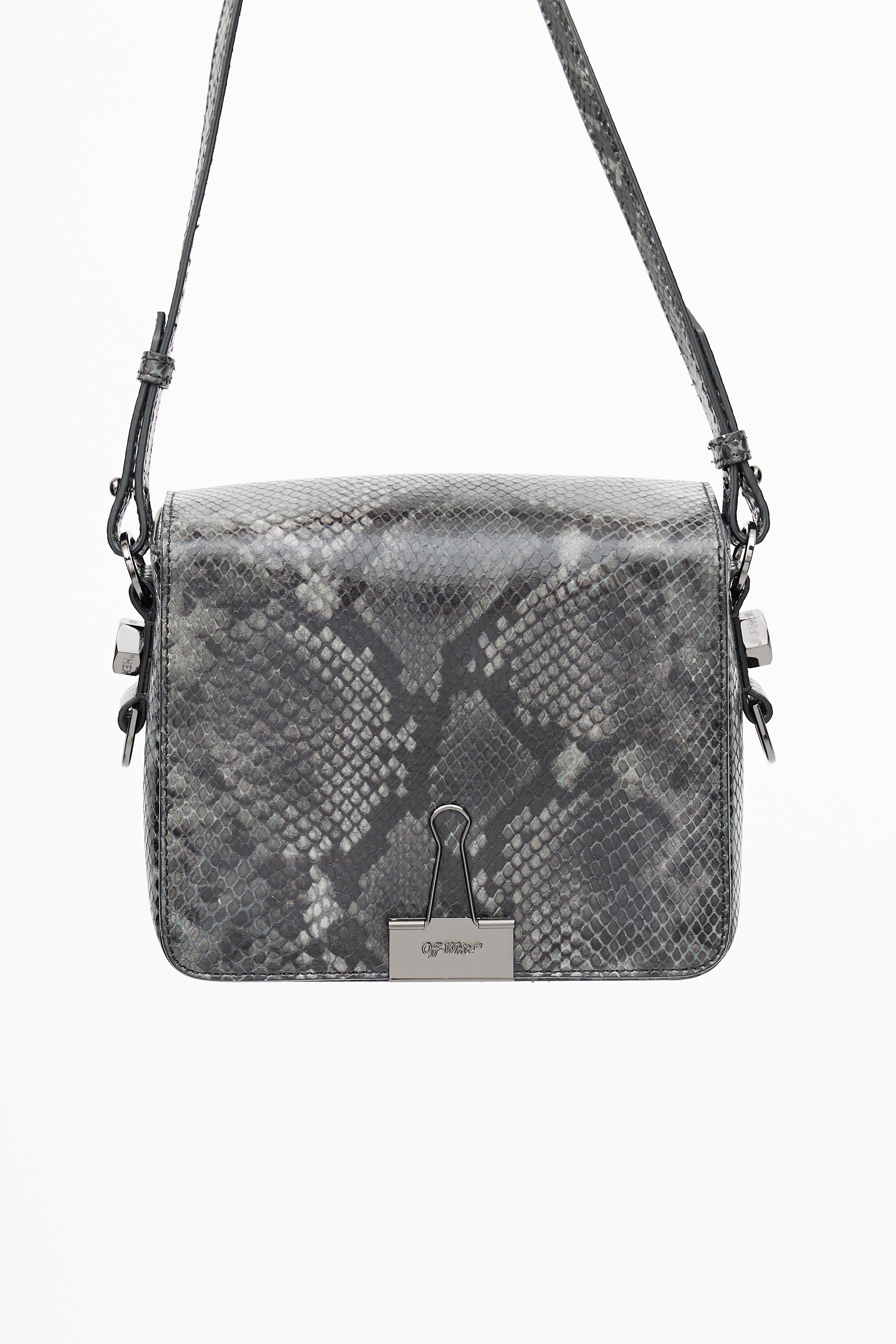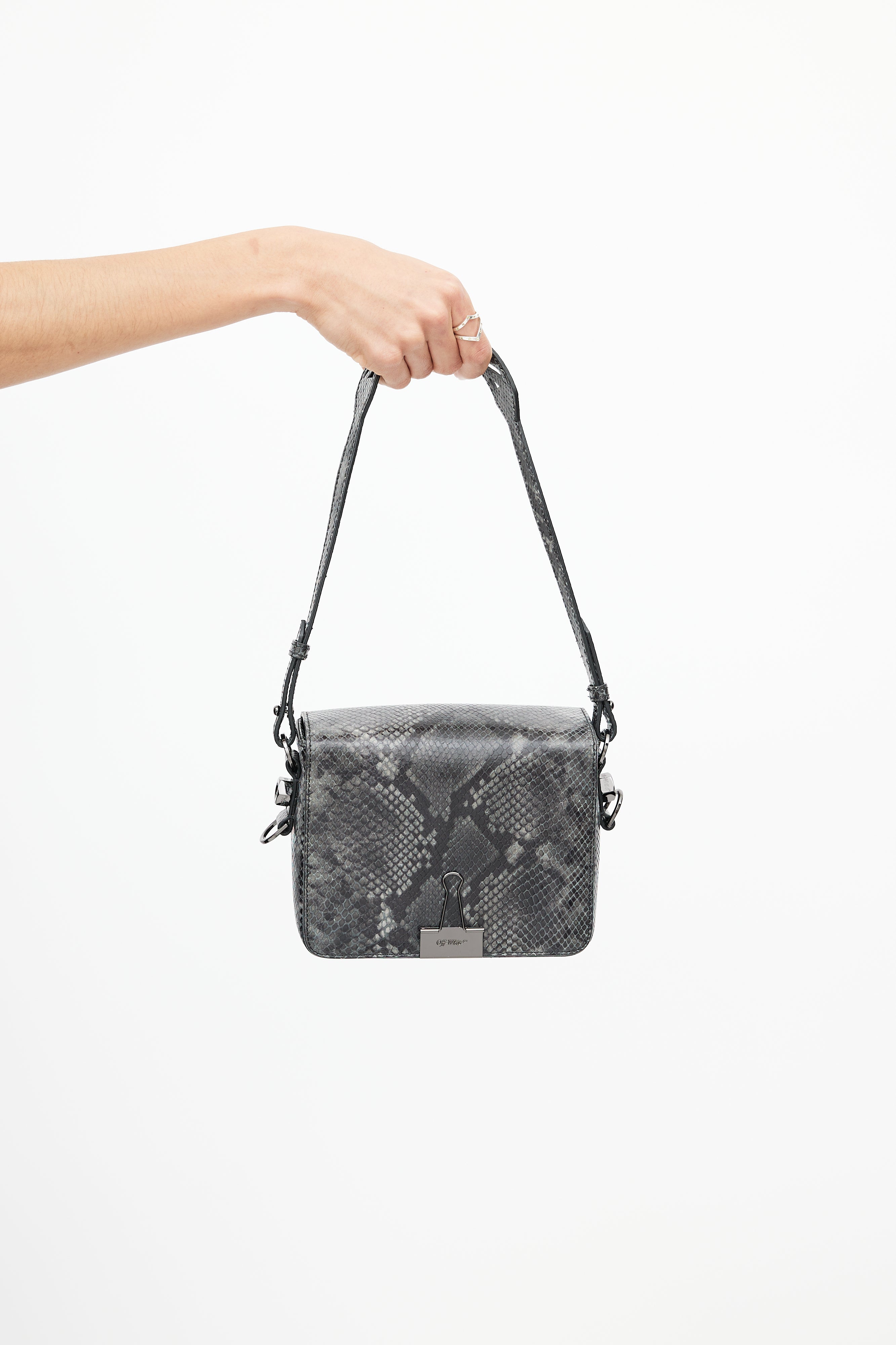 Pre-owned Off-White green Binder Clip shoulder bag featuring a multicolour snakeskin print throughout, top flap with gun metal tone magnetic closure, embossed logo at interior, one main compartment with one slip pocket and one zip pocket, top handle, logo hardware at back, and removable webbed logo shoulder strap.