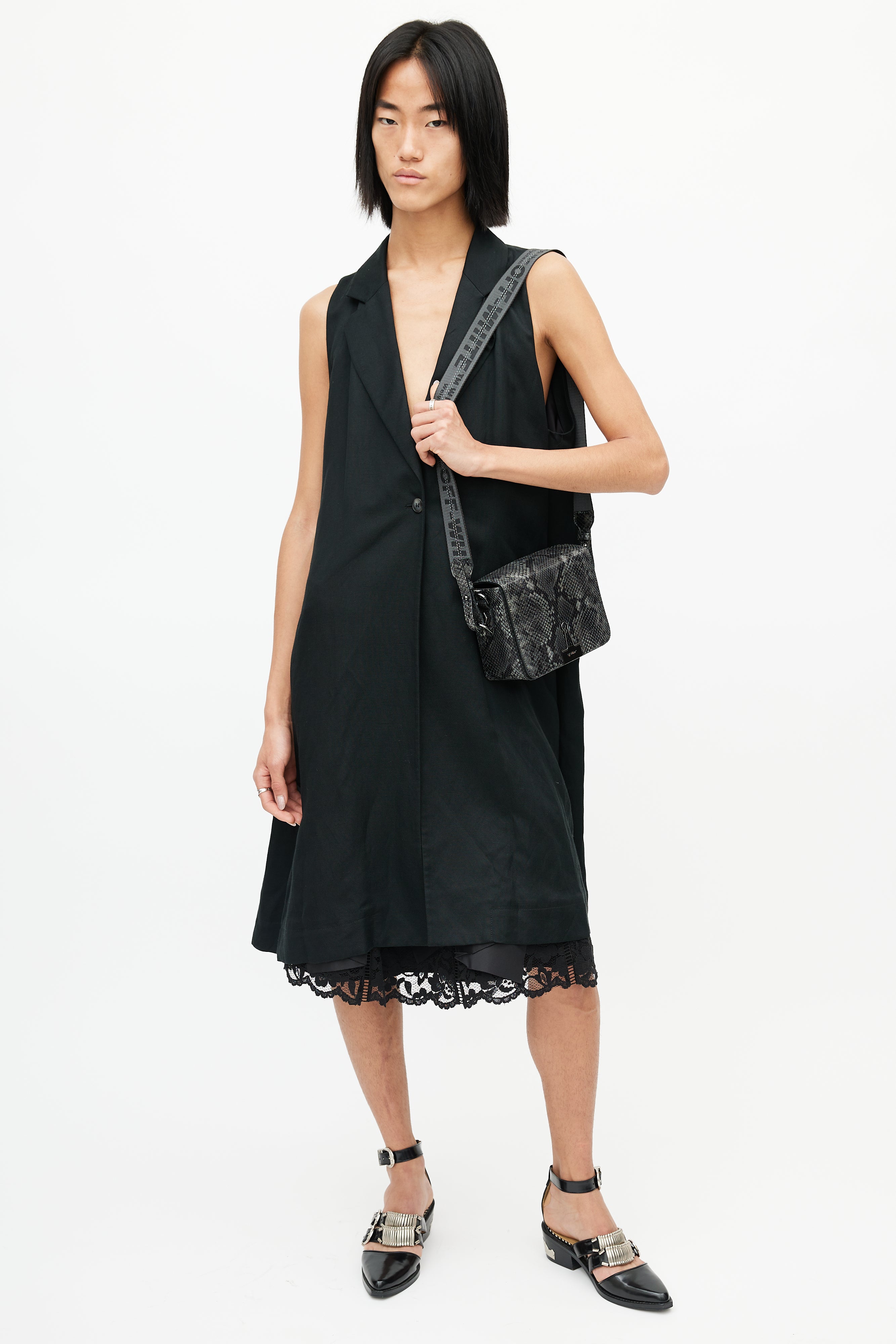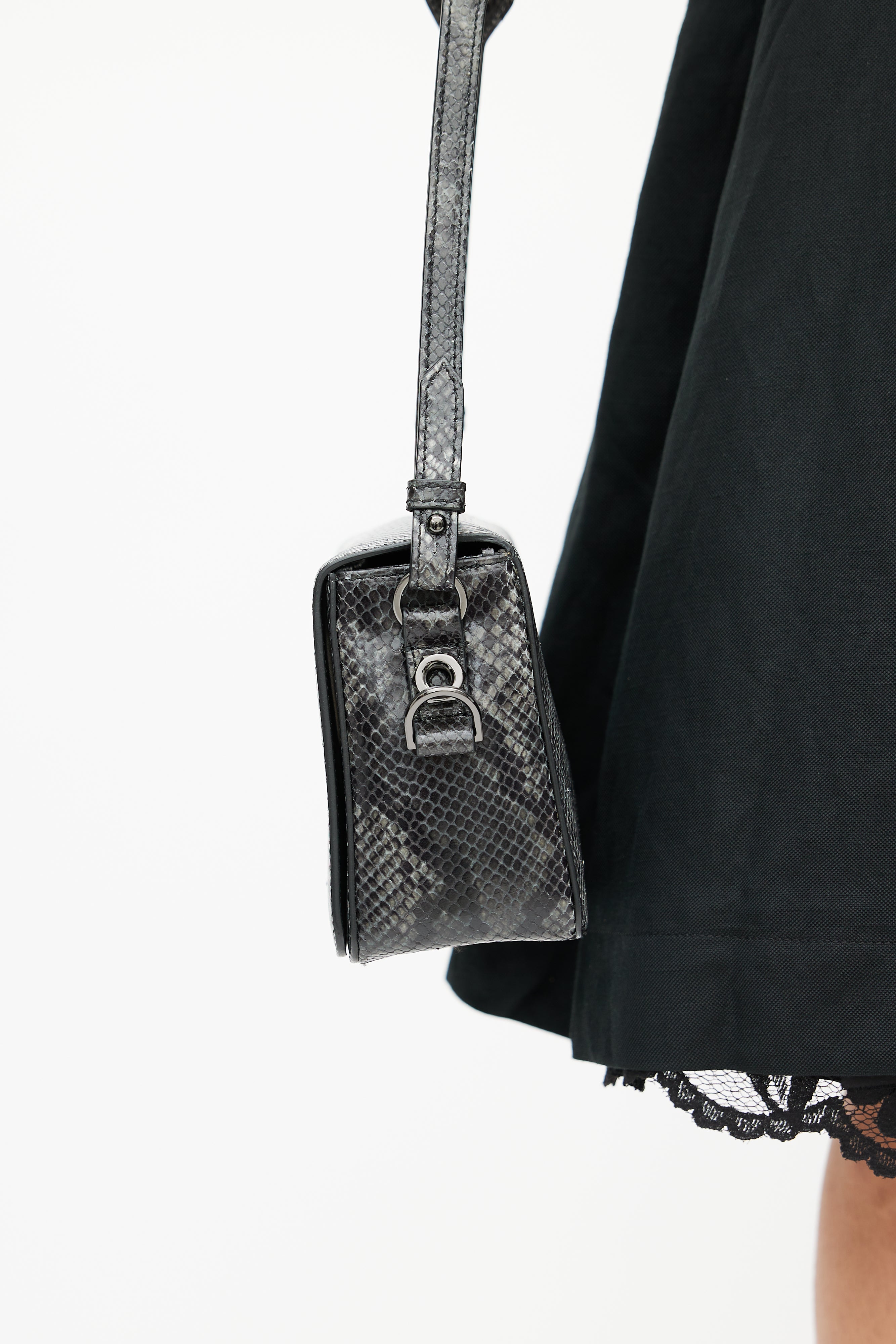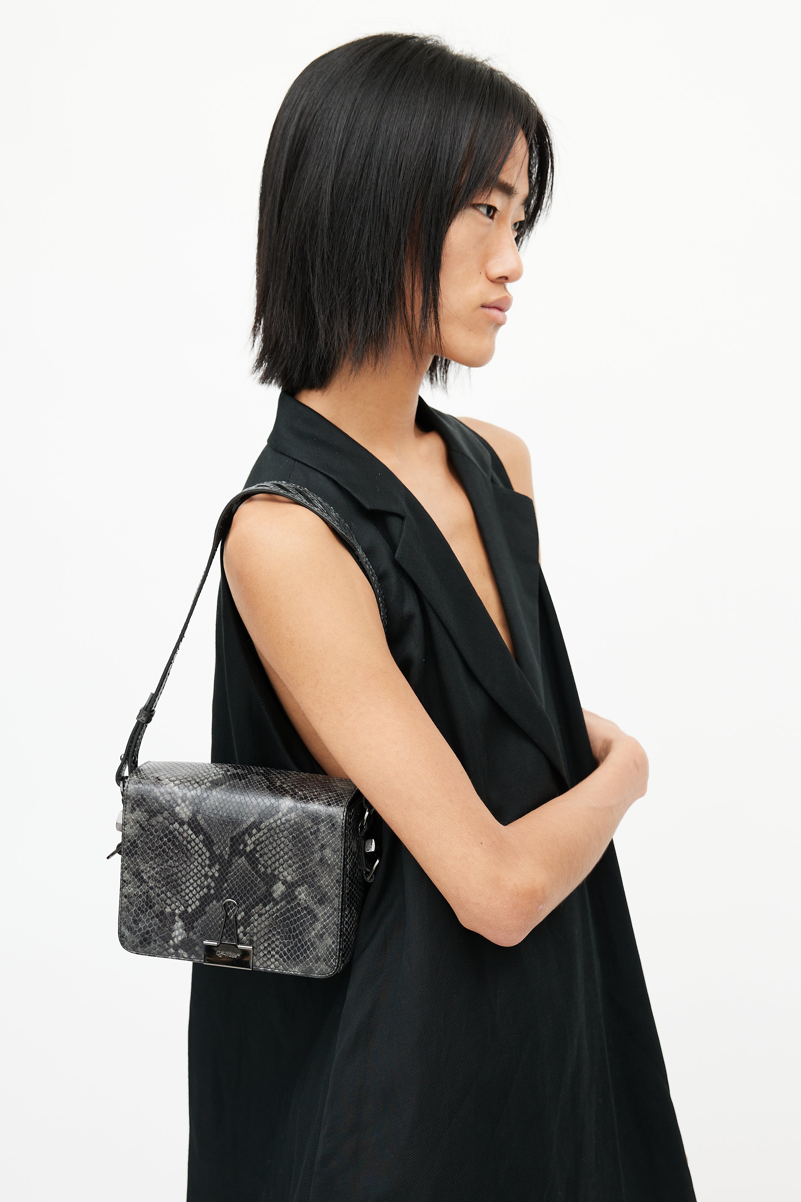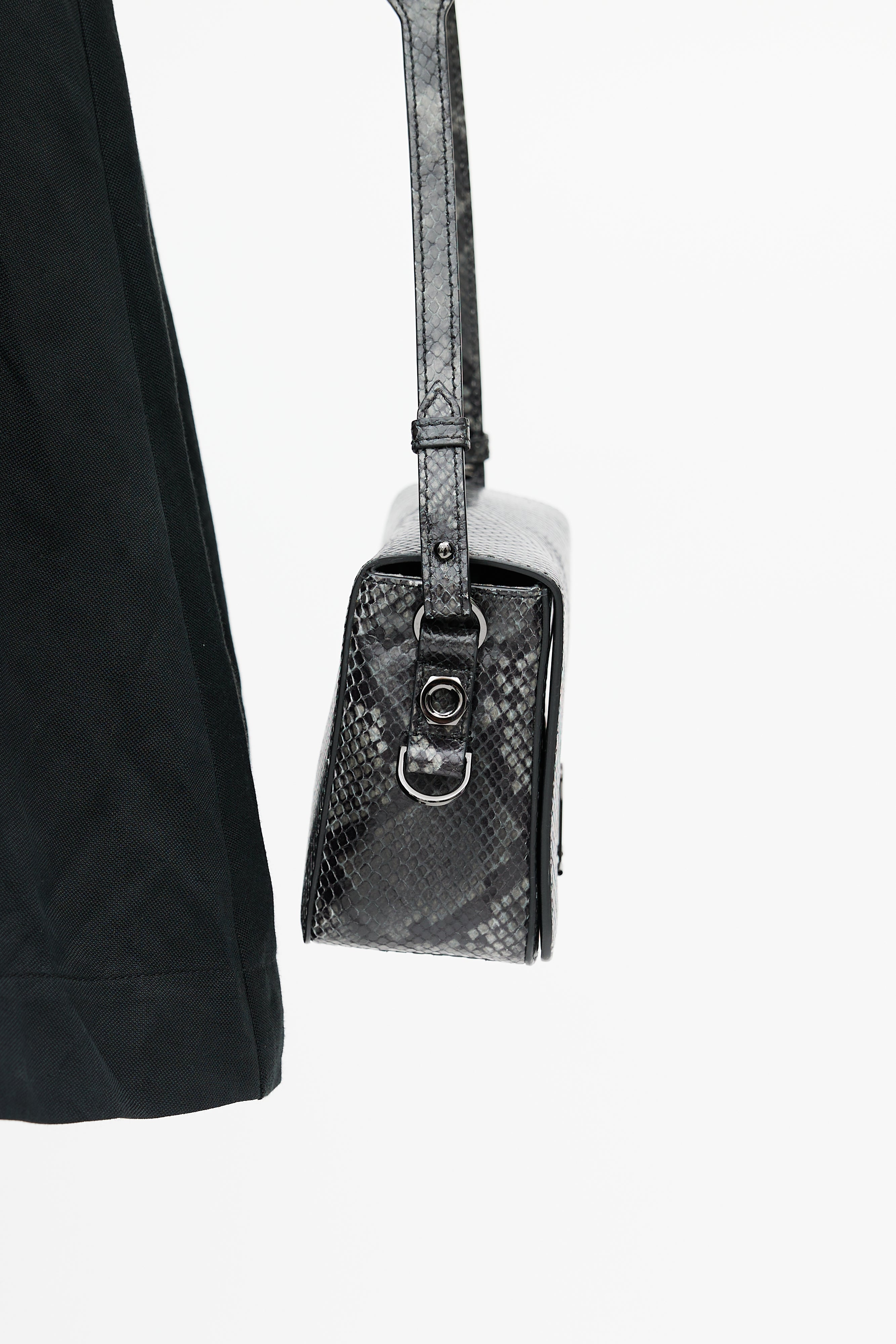 Pre-owned Off-White green Binder Clip shoulder bag featuring a multicolour snakeskin print throughout, top flap with gun metal tone magnetic closure, embossed logo at interior, one main compartment with one slip pocket and one zip pocket, top handle, logo hardware at back, and removable webbed logo shoulder strap.