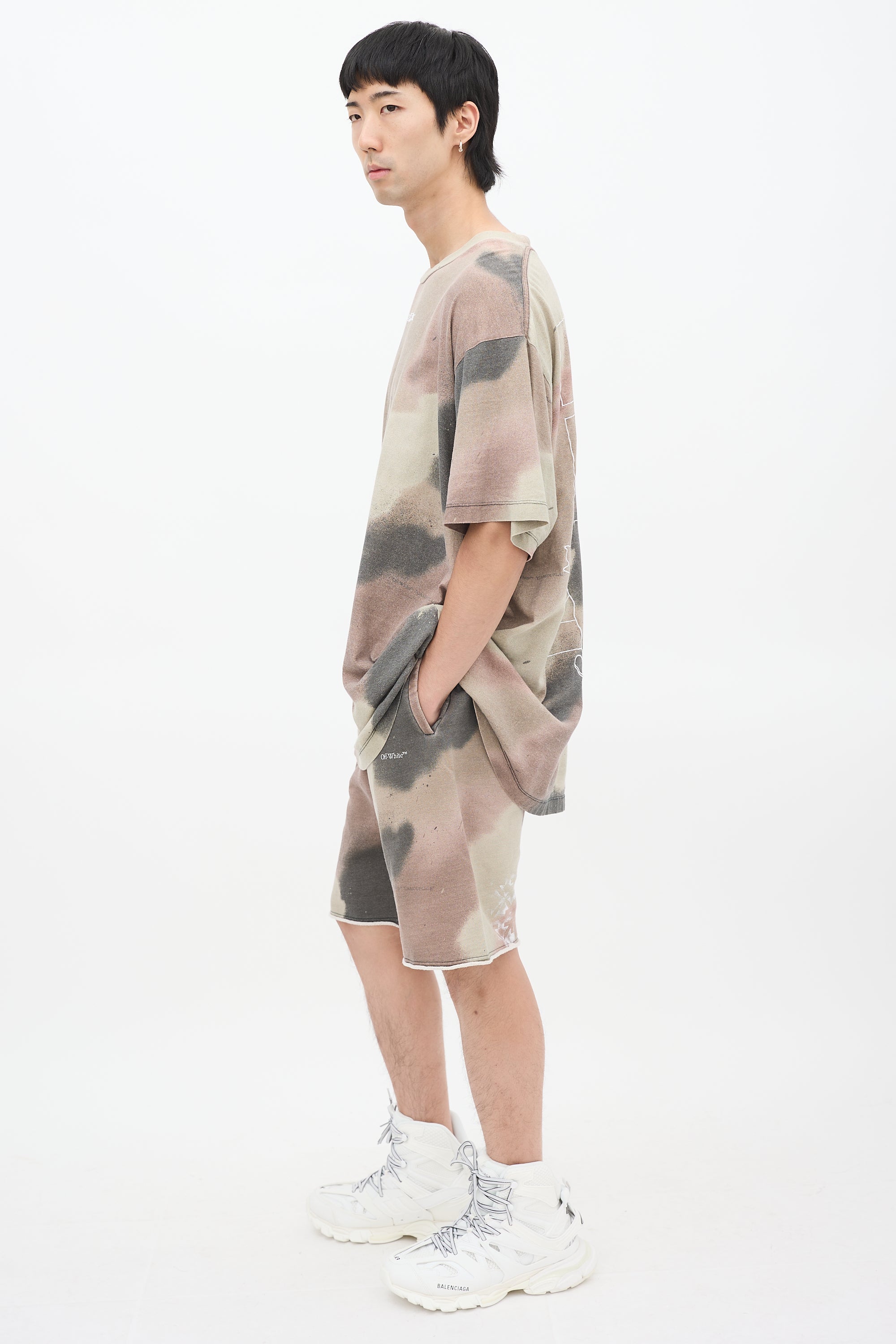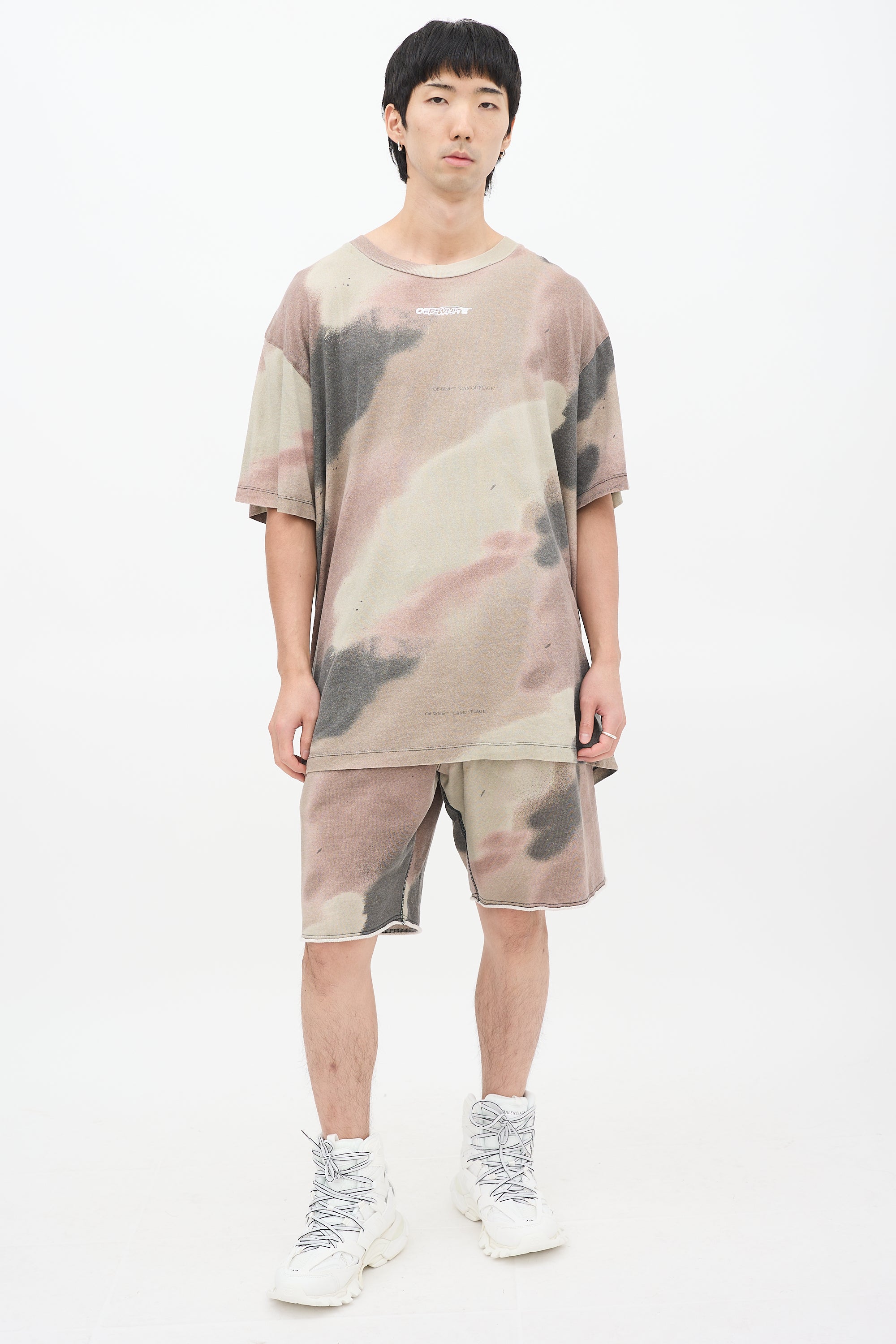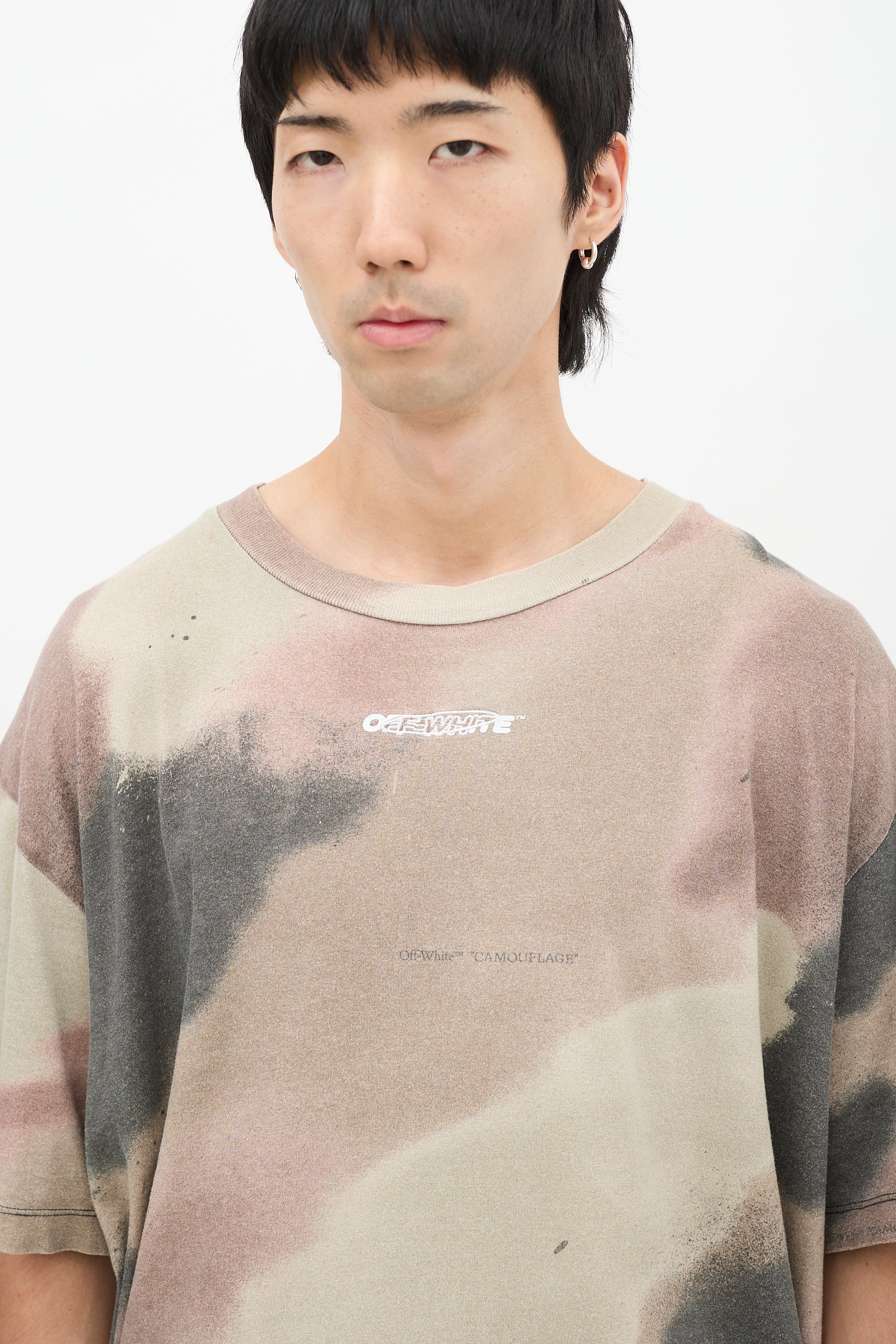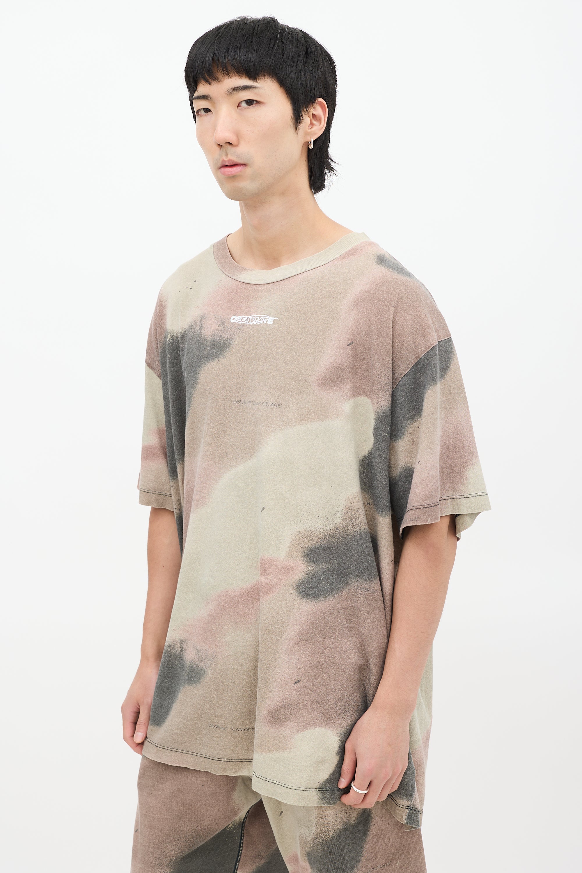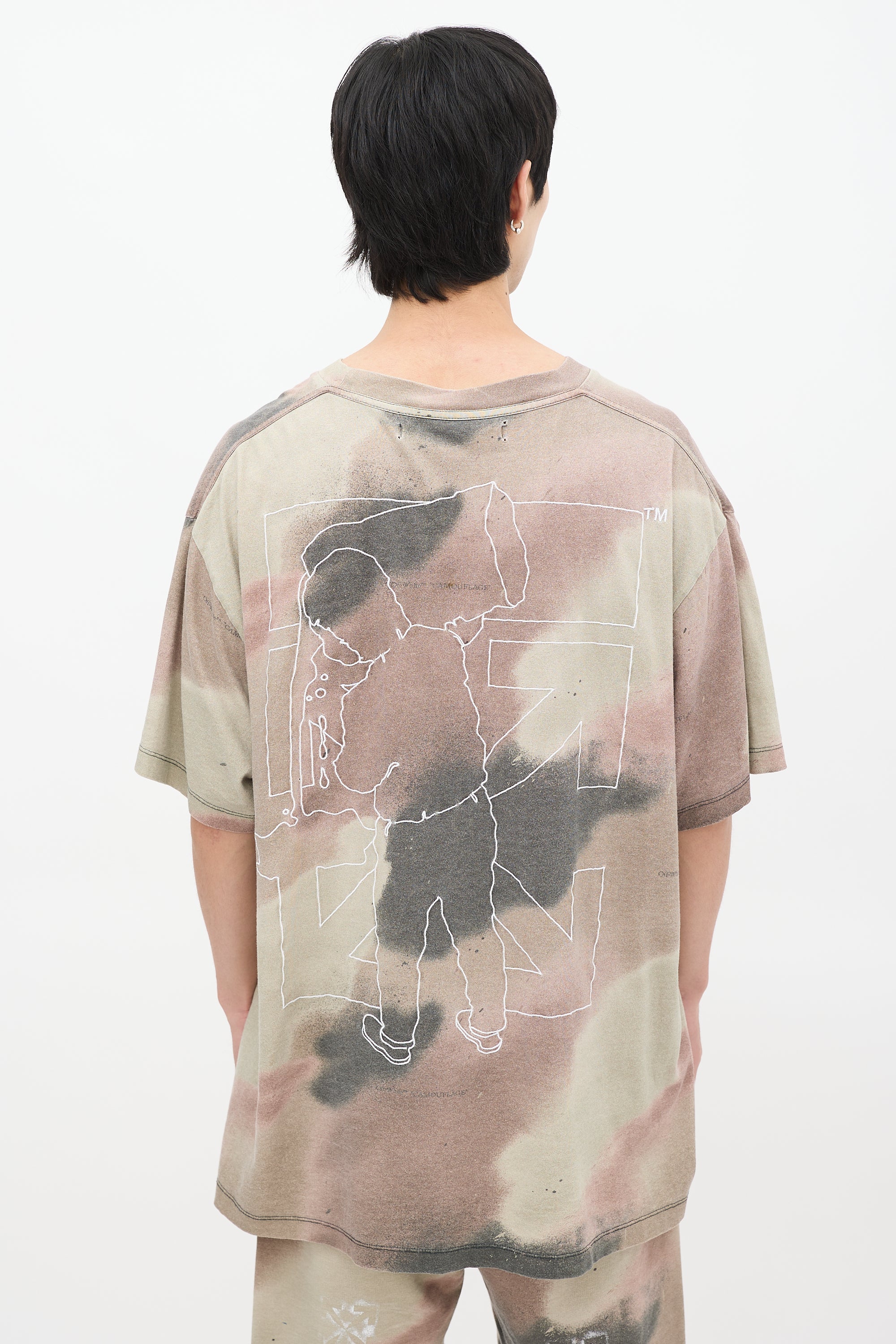 Pre-owned Off-White khaki green, brown, and black Camouflage Stencil T-shirt featuring a round neckline, oversized fit, even hem, dropped shoulders, short sleeves, logo embroidery at chest, and graphic embroidery at back.