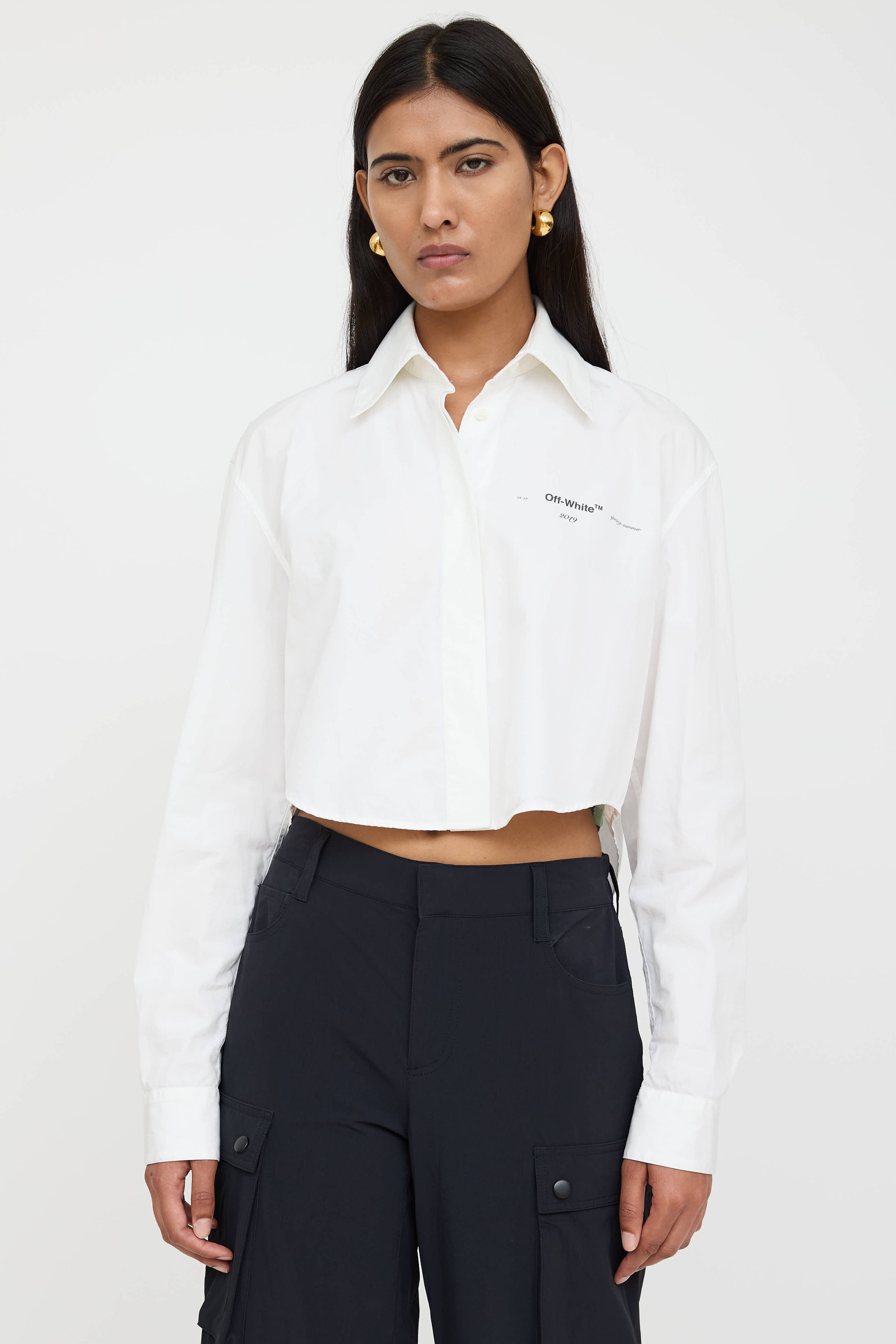 Pre-owned Off-White white long sleeve cropped shirt featuring pointed collar, button front, logo at chest and at back, buttoned cuffs, and round hemline.