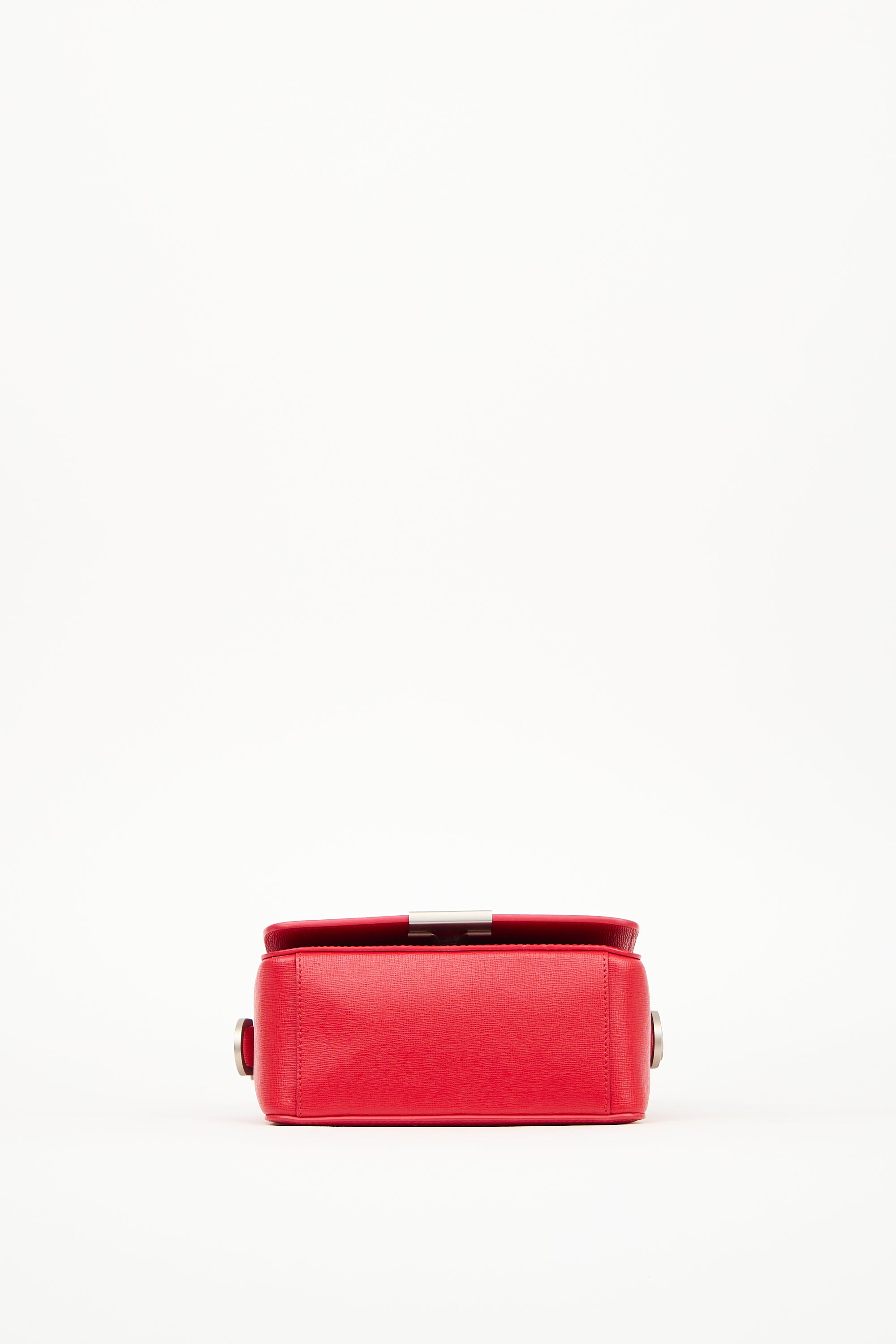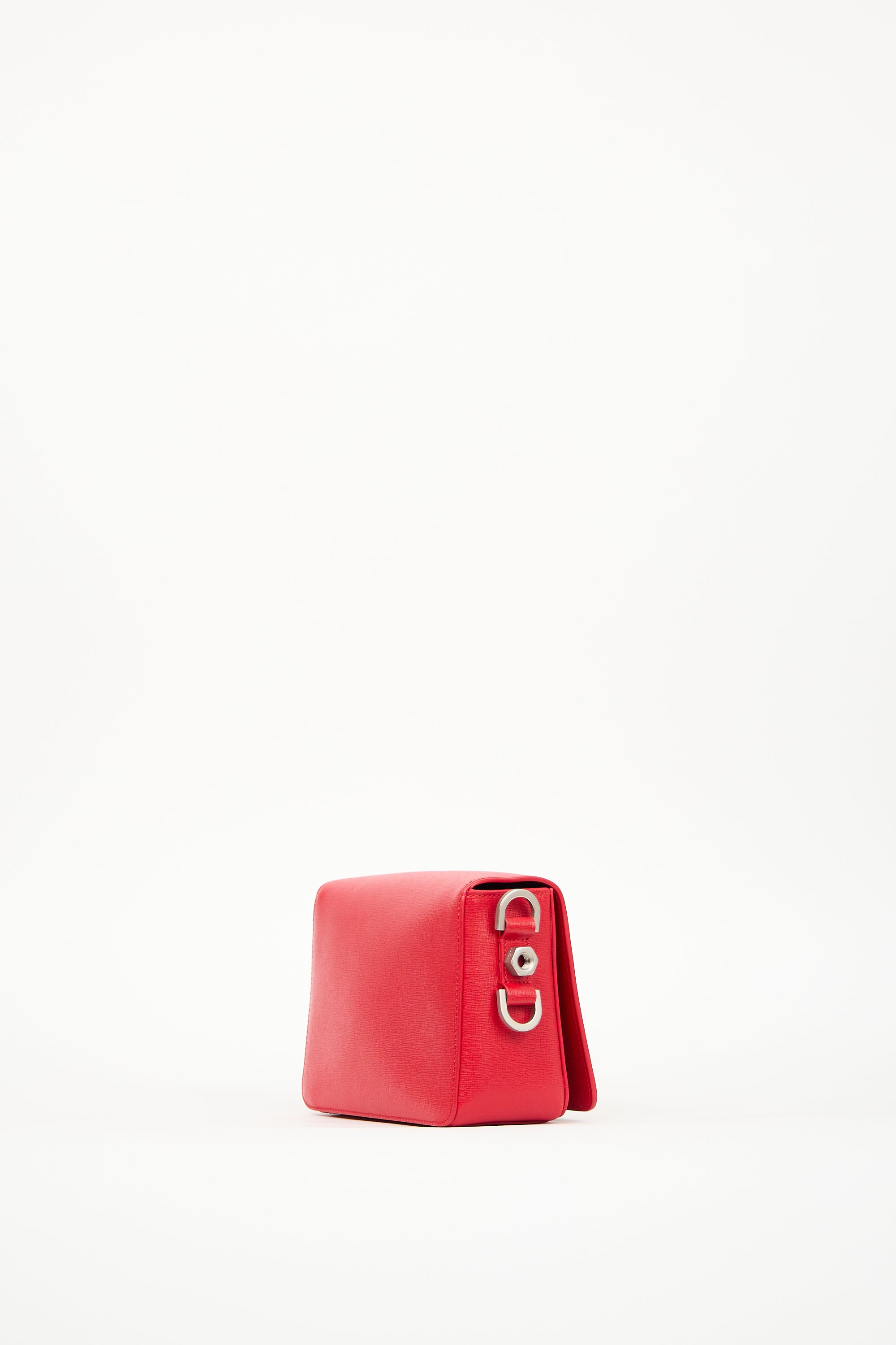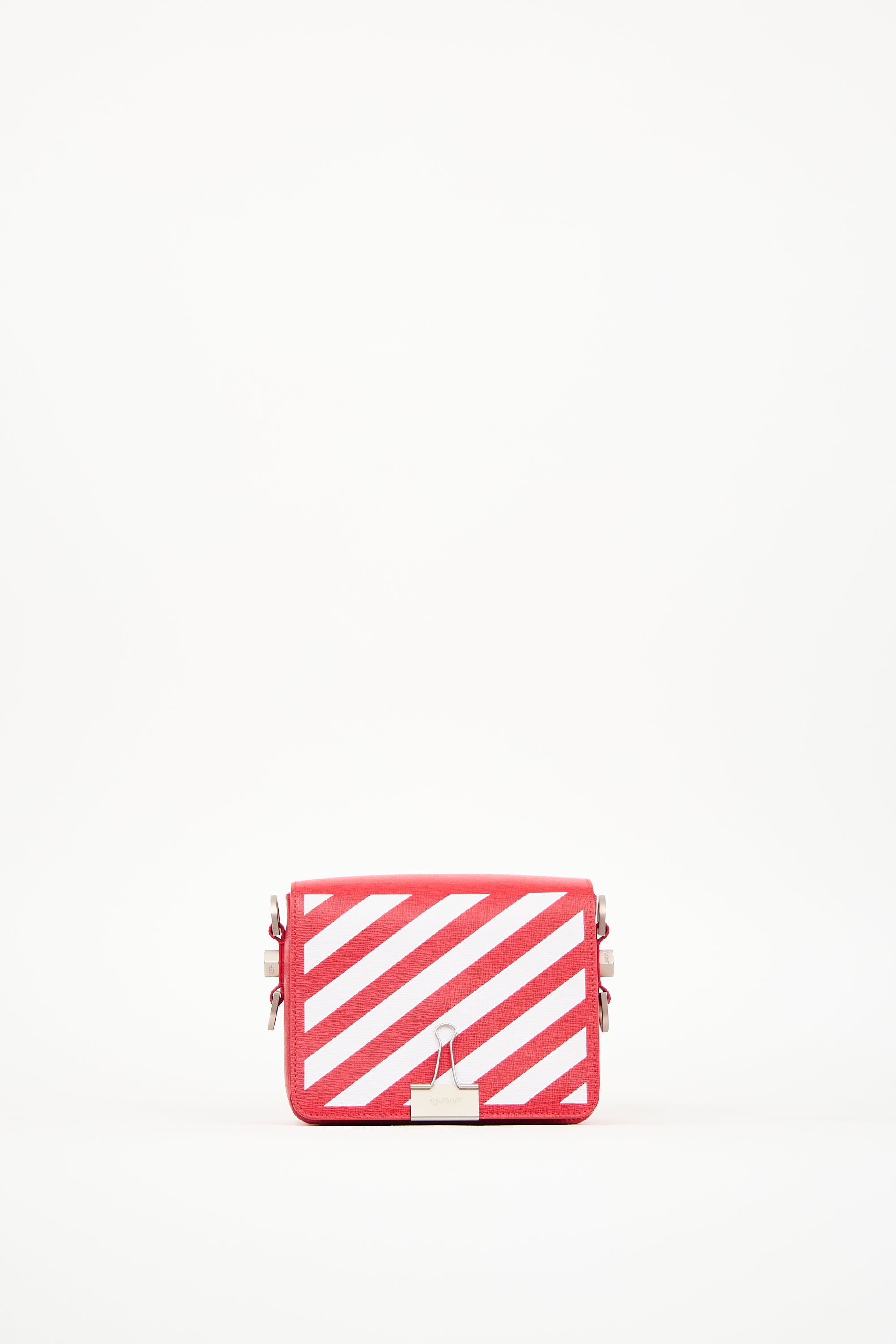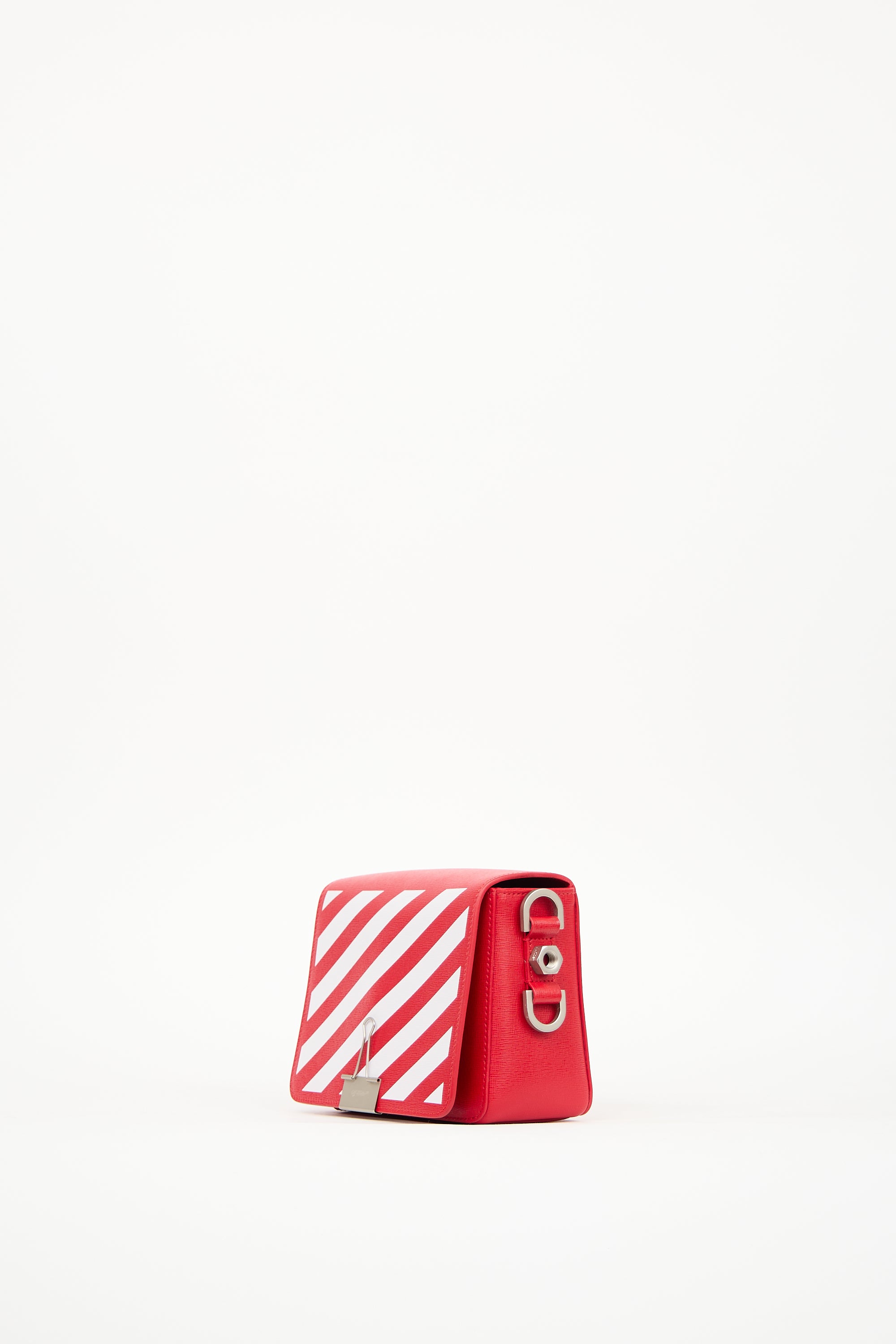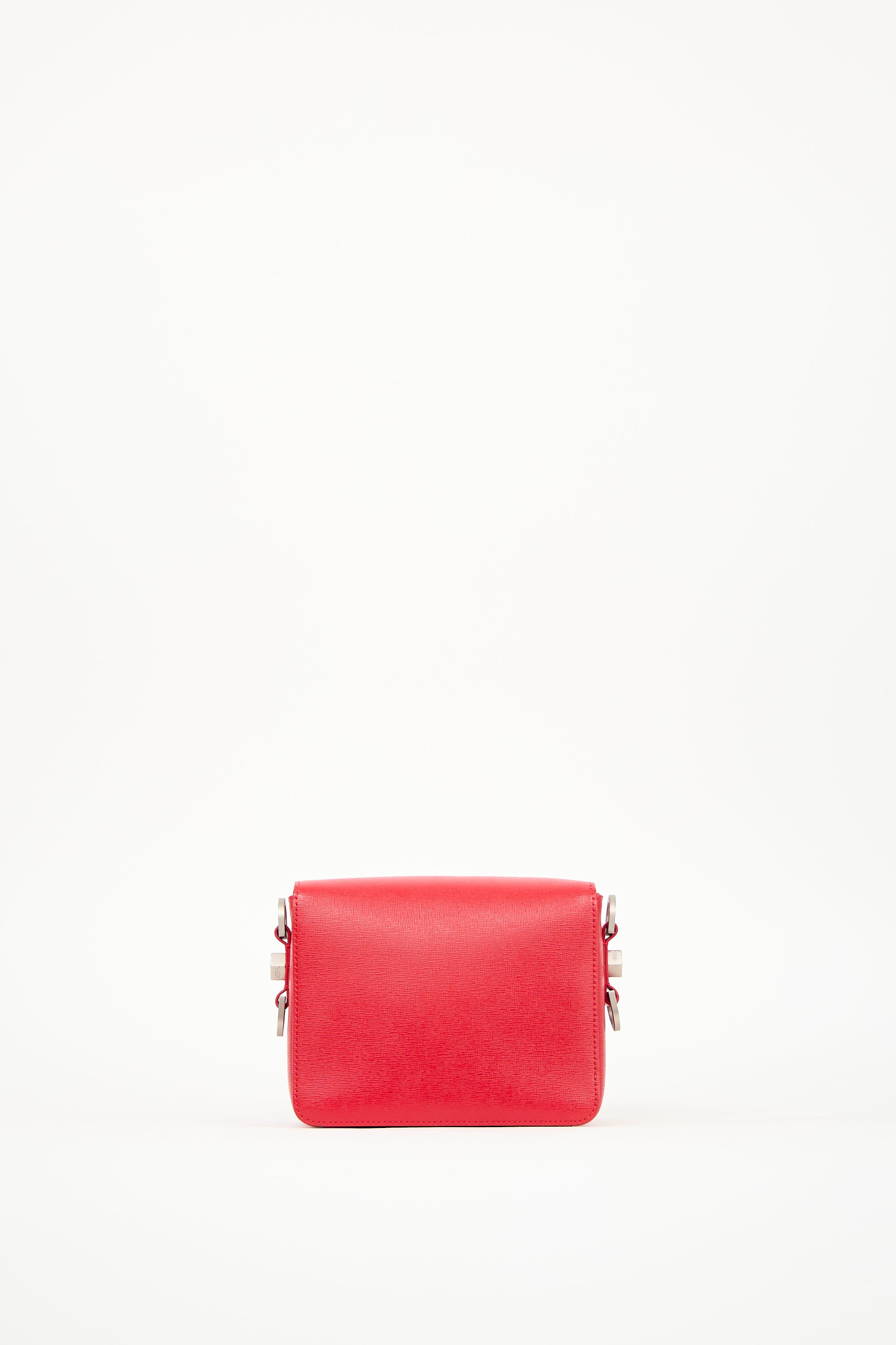 Pre-owned Off-White red Saffiano leather bag featuring silver tone hardware, detachable strap with cut out diagonal stripe motif, detachable and adjustable yellow logo tape strap, front flap with white diagonal stripe print and logo binder clip embellishment, magnetic closure, and one lined main compartment with one zip pocket and one slip pocket. Comes with original dust bag.