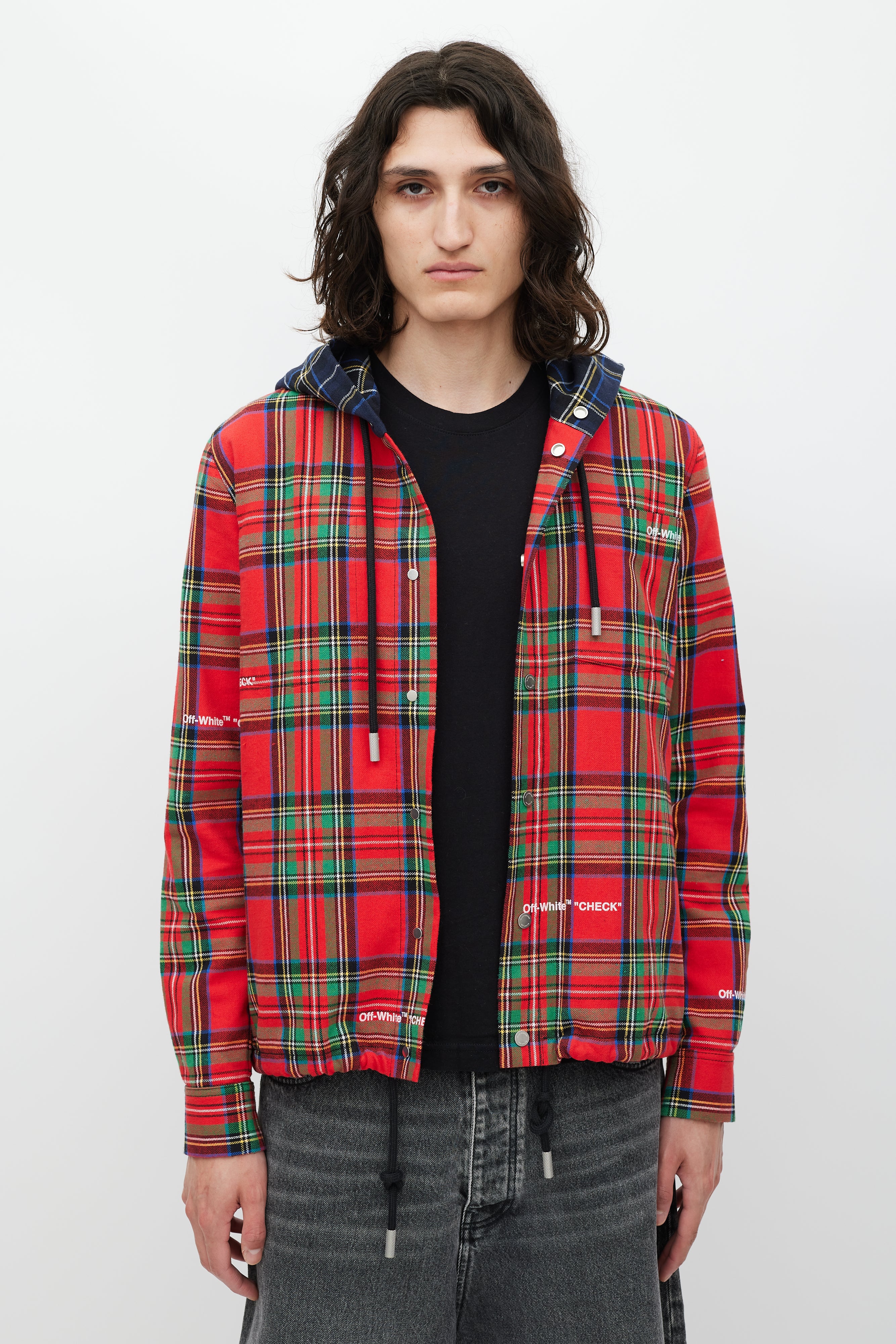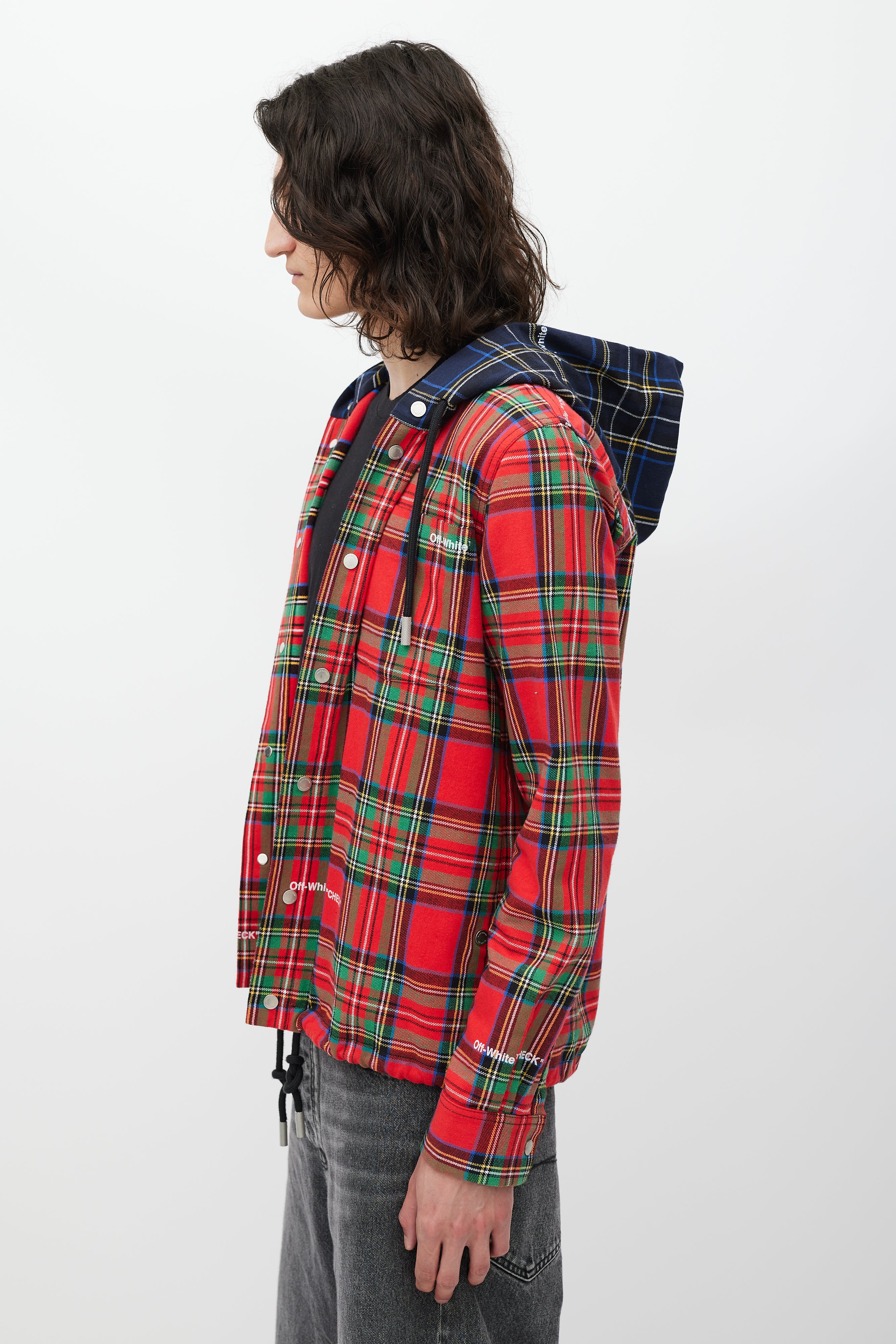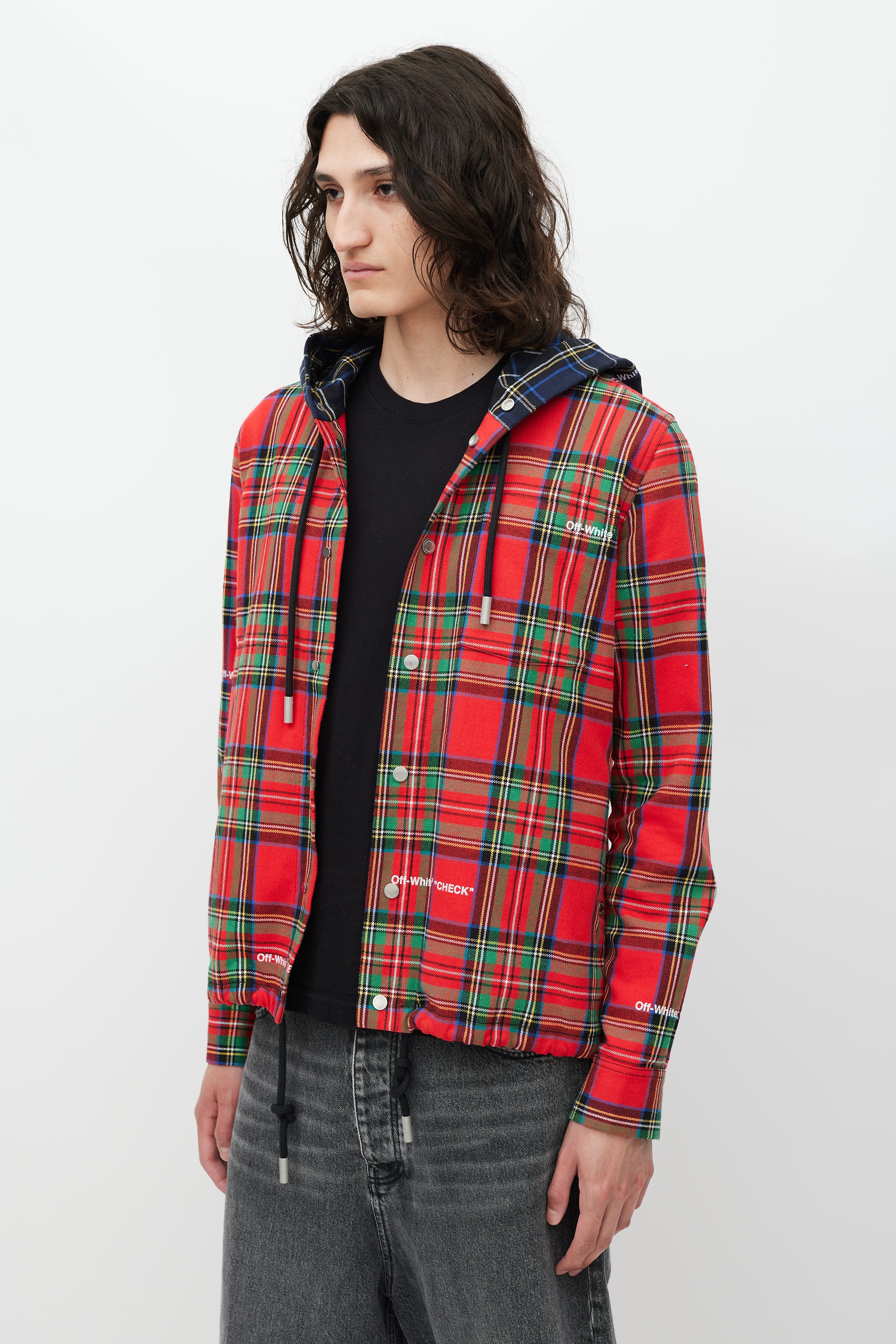 Pre-owned Off-White red jacket featuring a multicolour plaid pattern throughout, drawstring hood, one patch pocket at chest, two slip pockets at hip, drawstring hem, embroidered logo at back, and snap button closure.