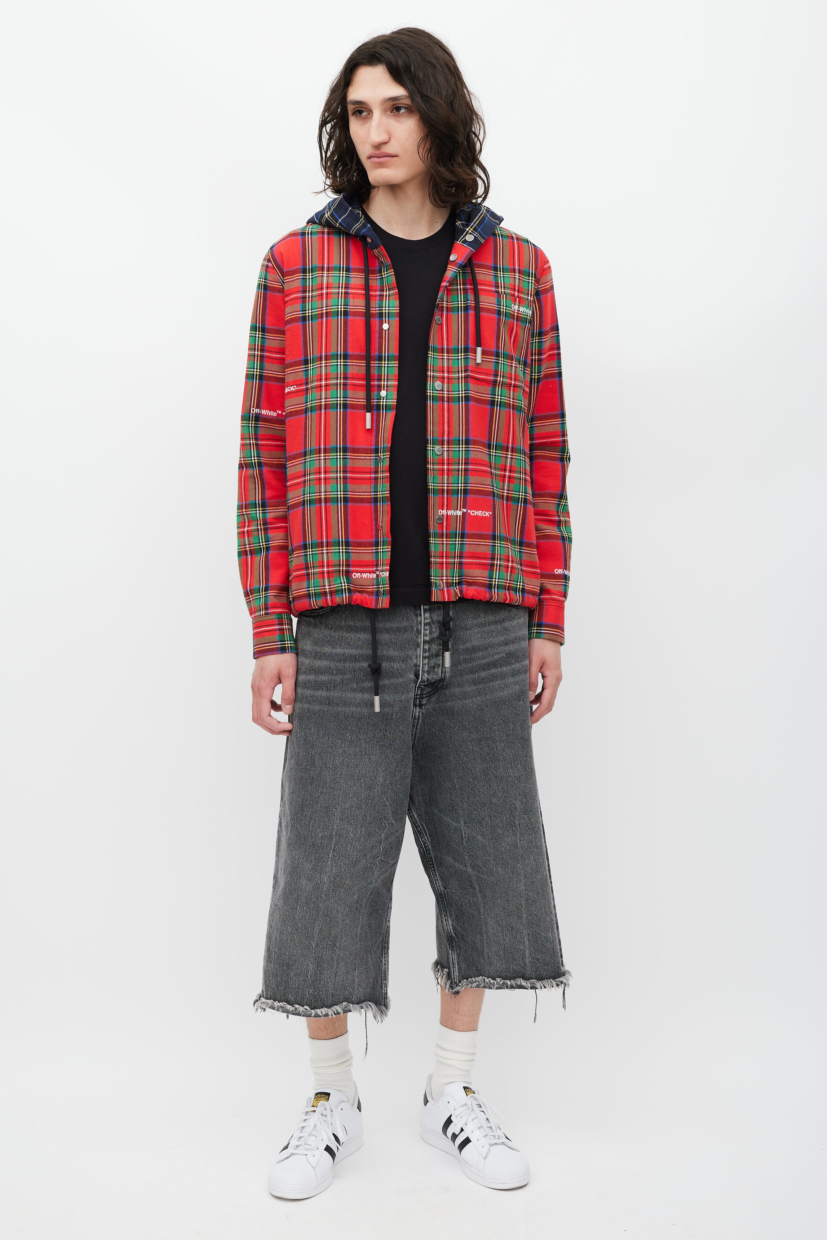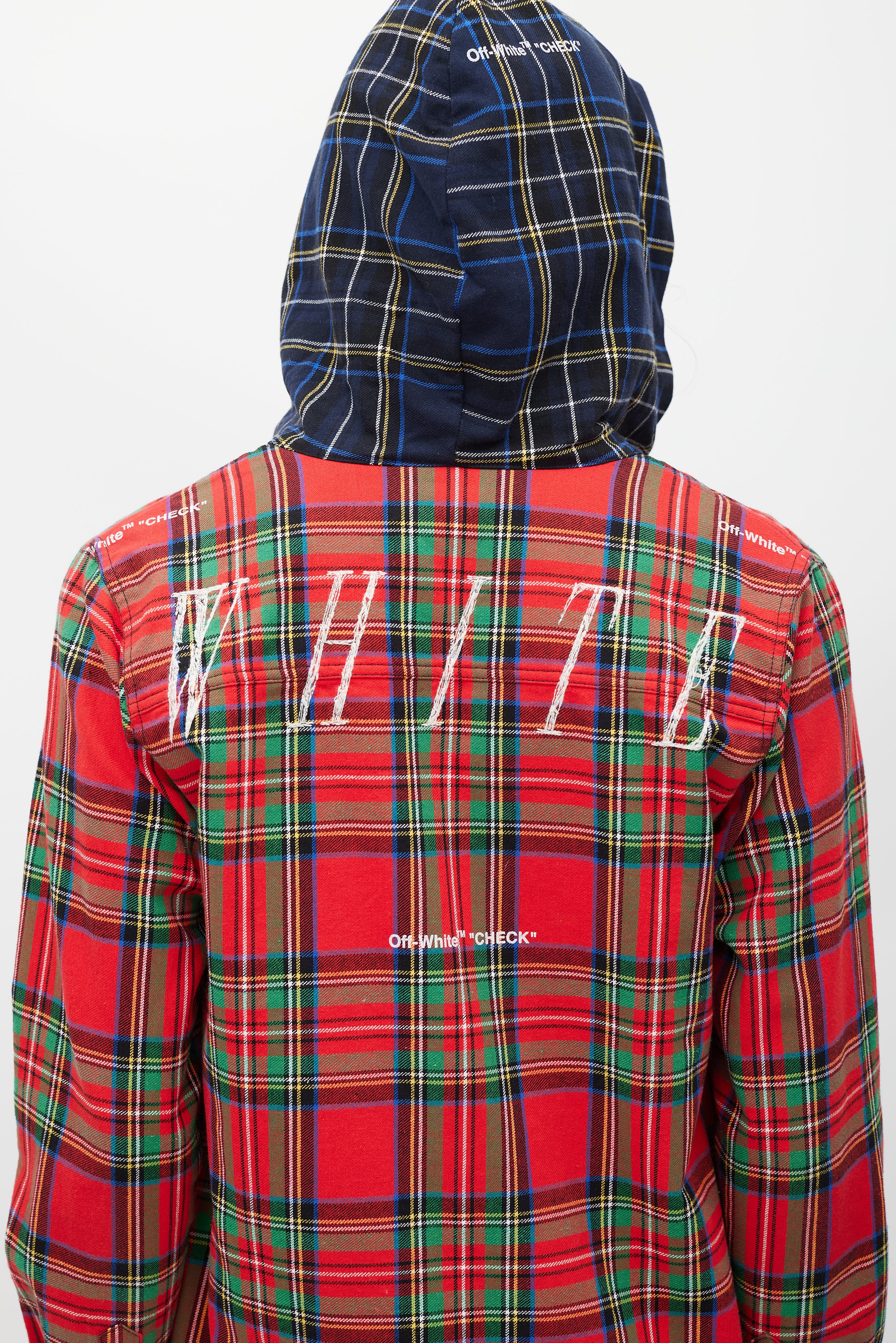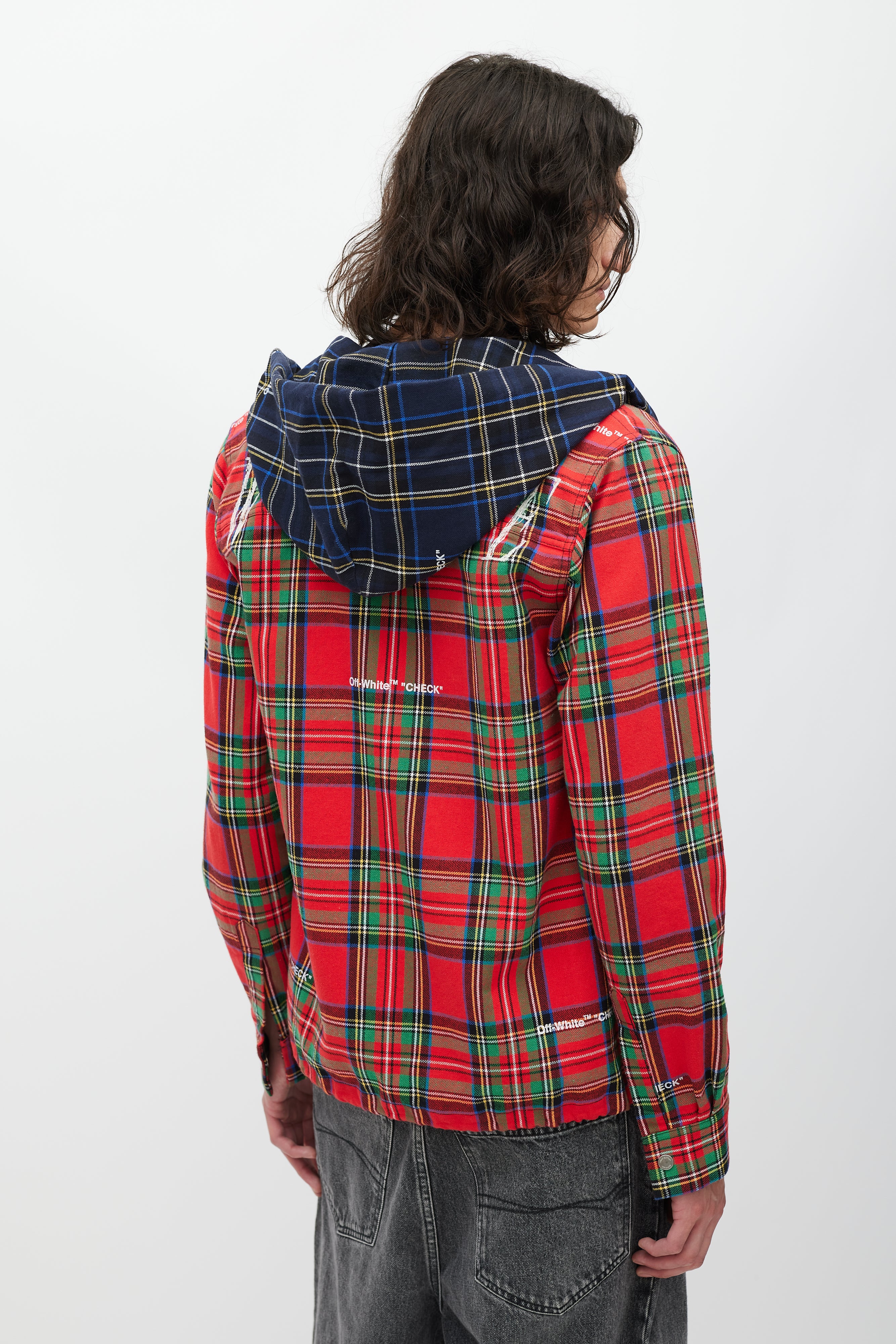 Pre-owned Off-White red jacket featuring a multicolour plaid pattern throughout, drawstring hood, one patch pocket at chest, two slip pockets at hip, drawstring hem, embroidered logo at back, and snap button closure.