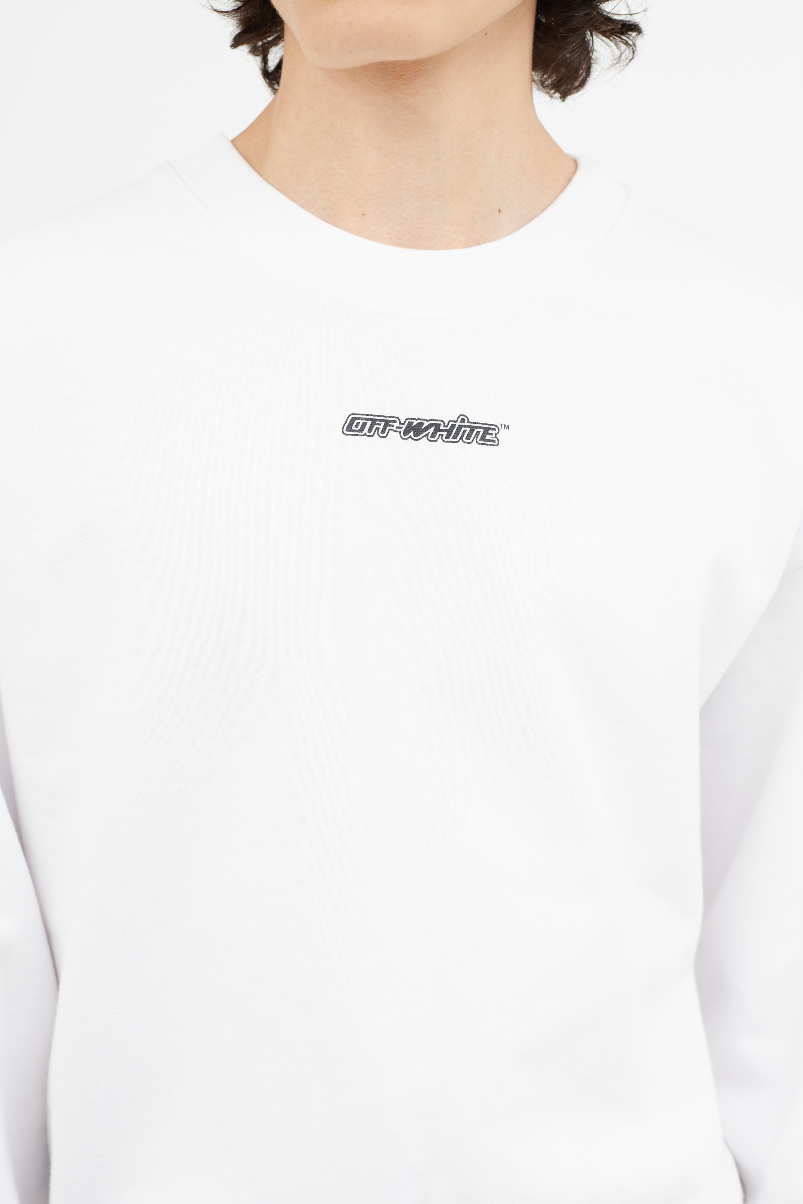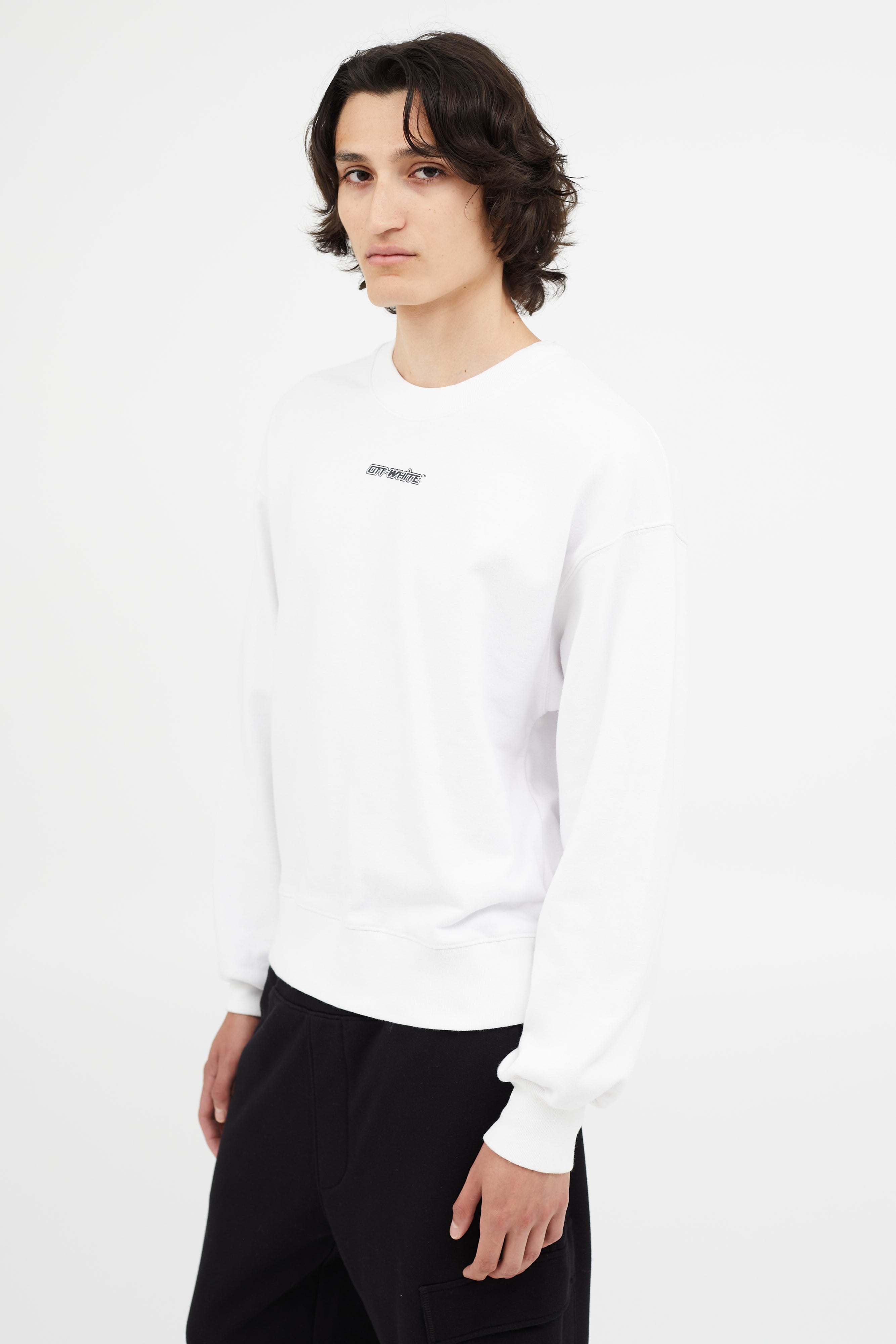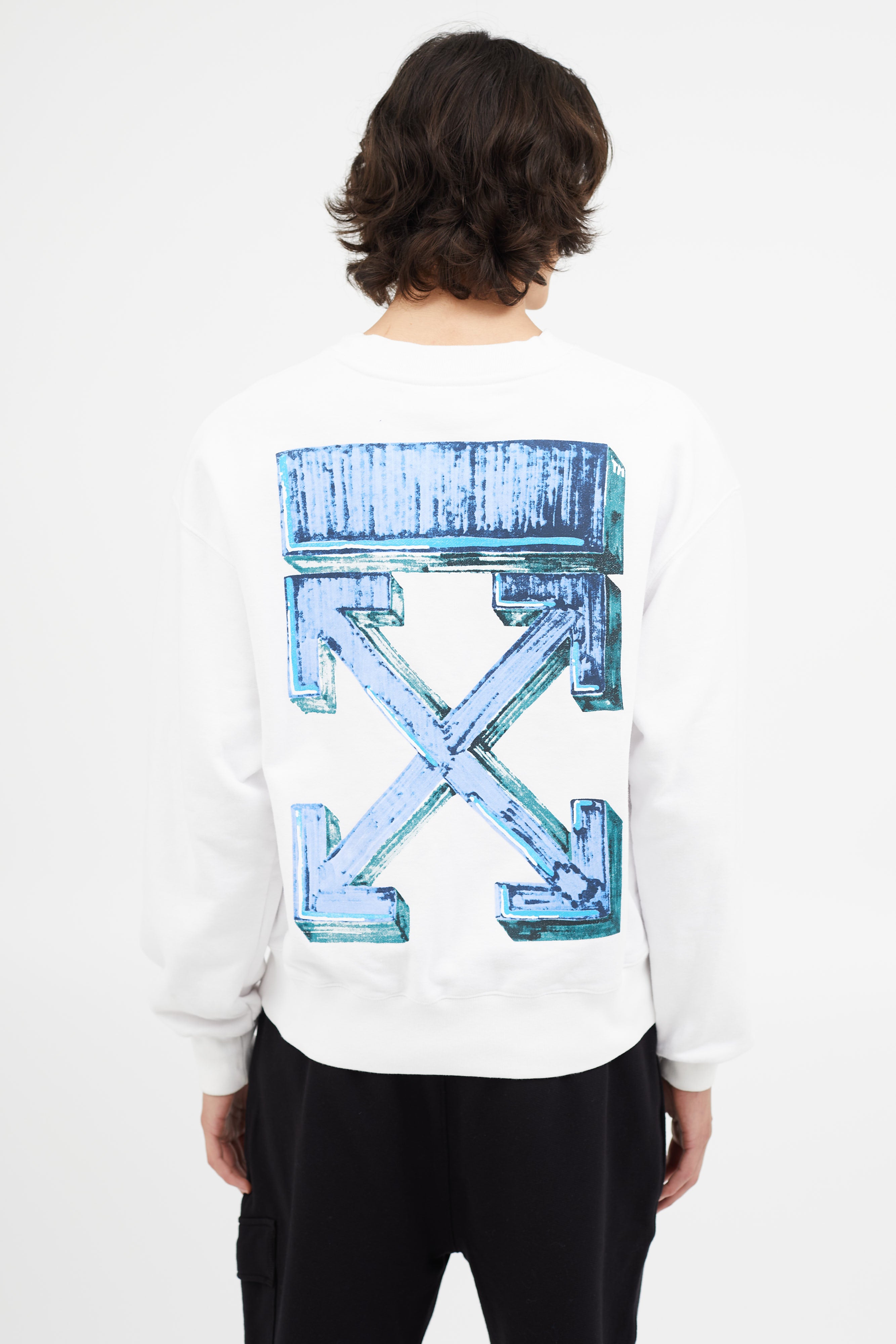 Pre-owned Off-White white sweatshirt featuring crew neckline, black printed logo at face, blue signature arrow print at back, and ribbed hem.