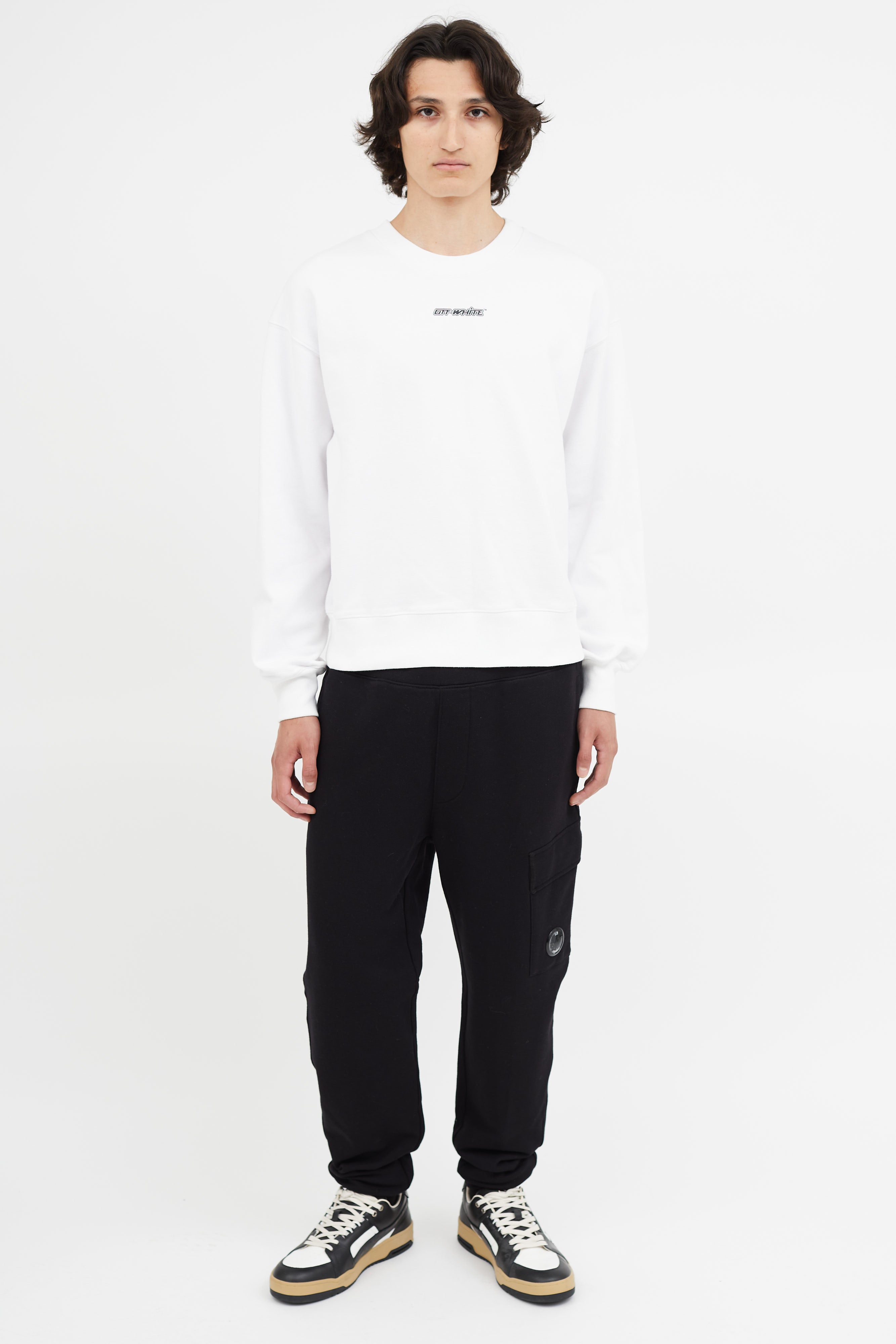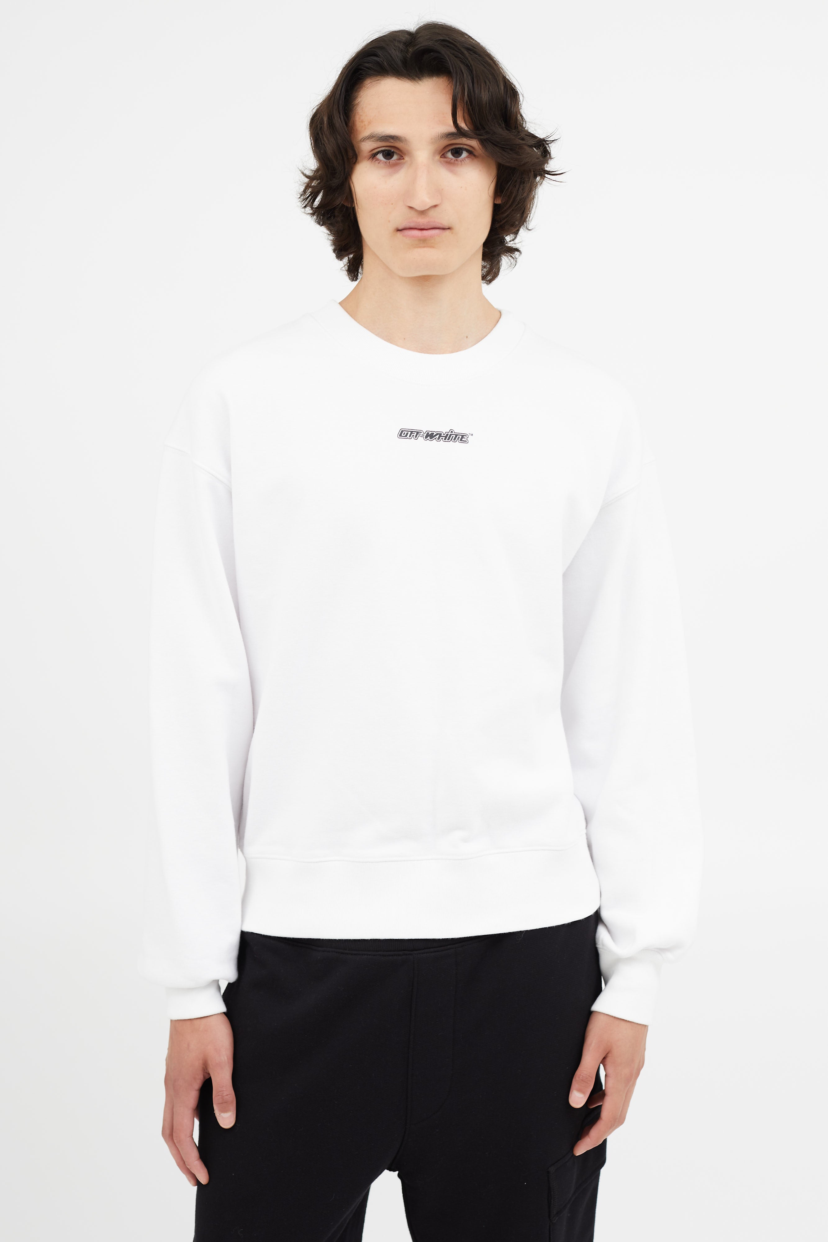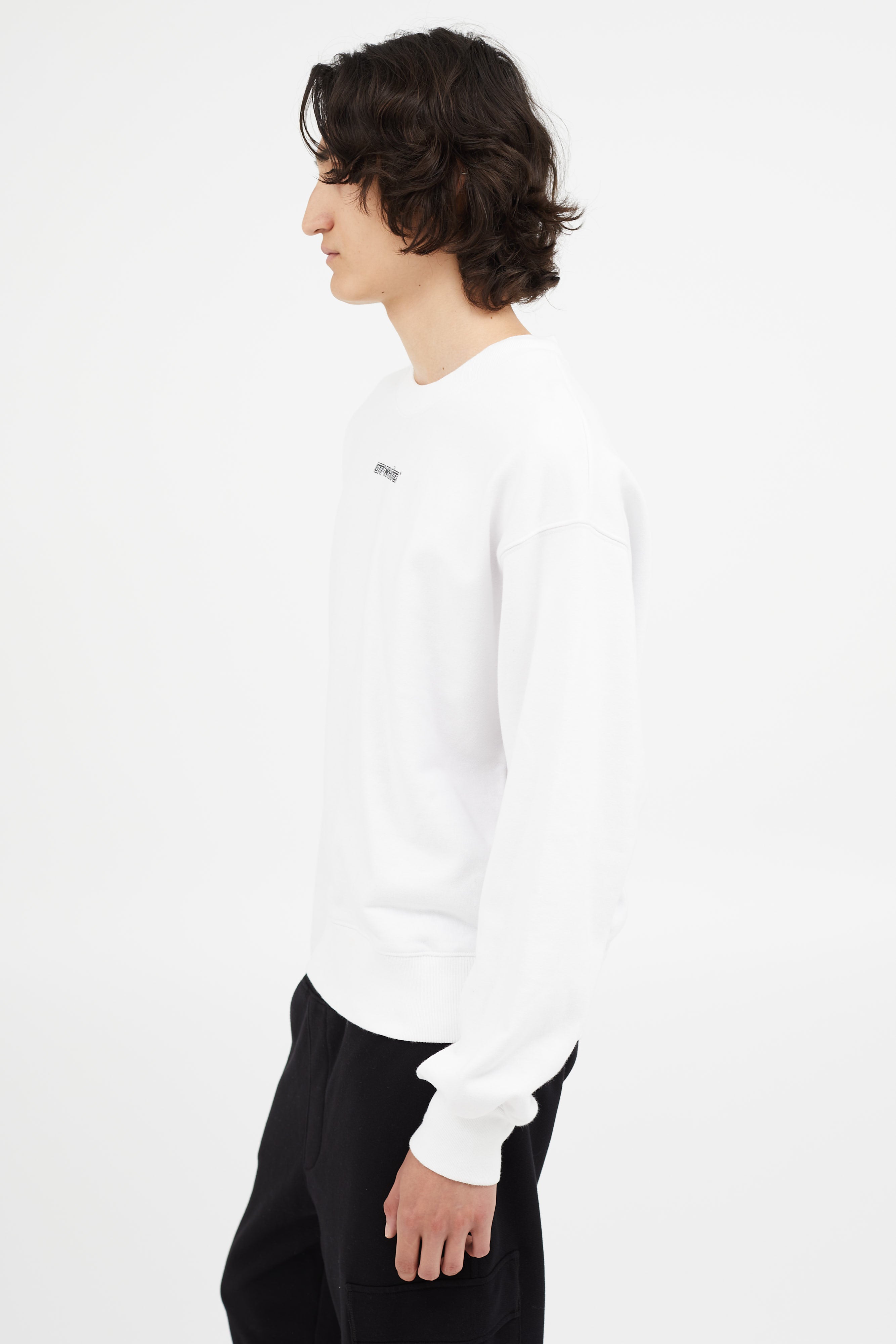 Pre-owned Off-White white sweatshirt featuring crew neckline, black printed logo at face, blue signature arrow print at back, and ribbed hem.