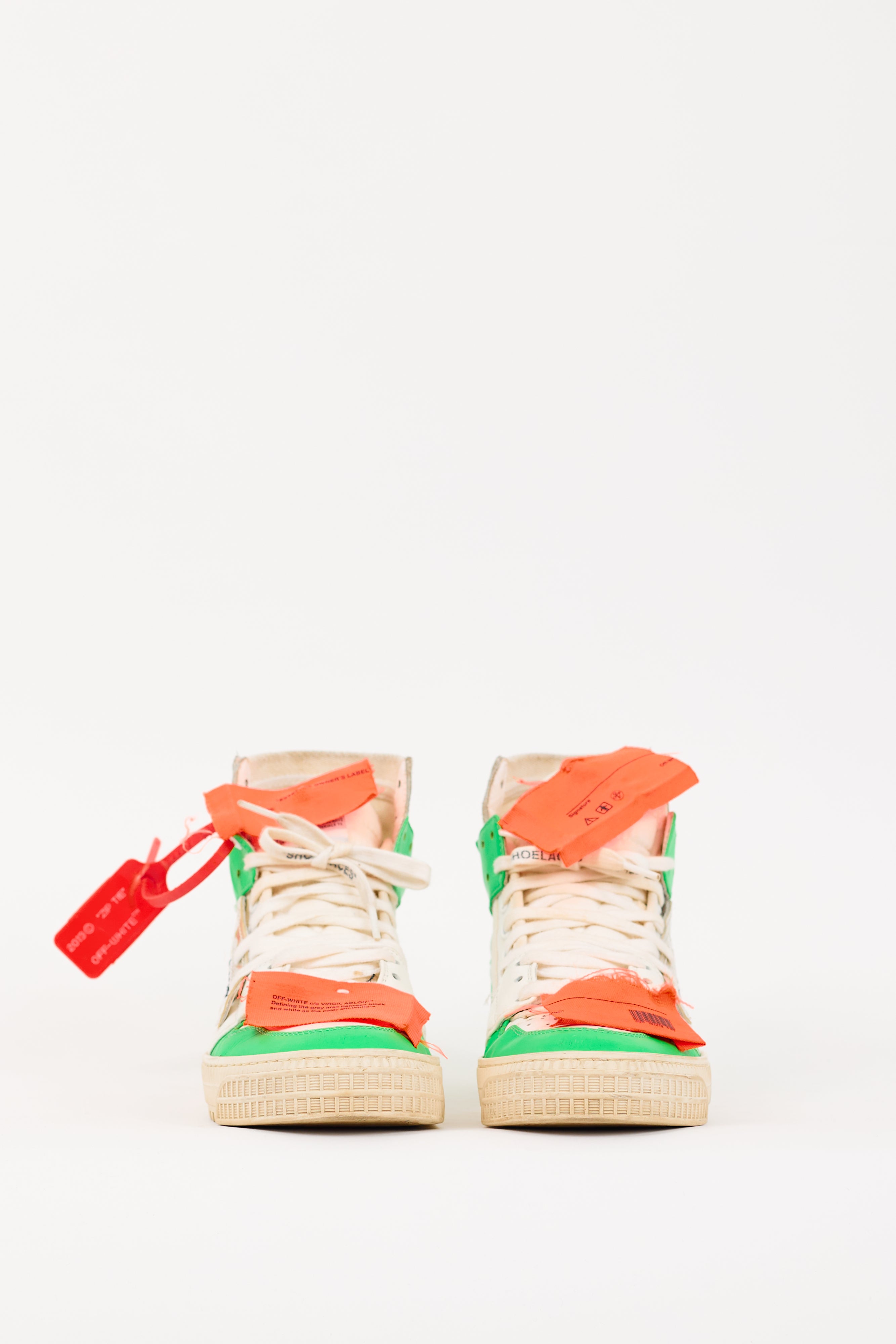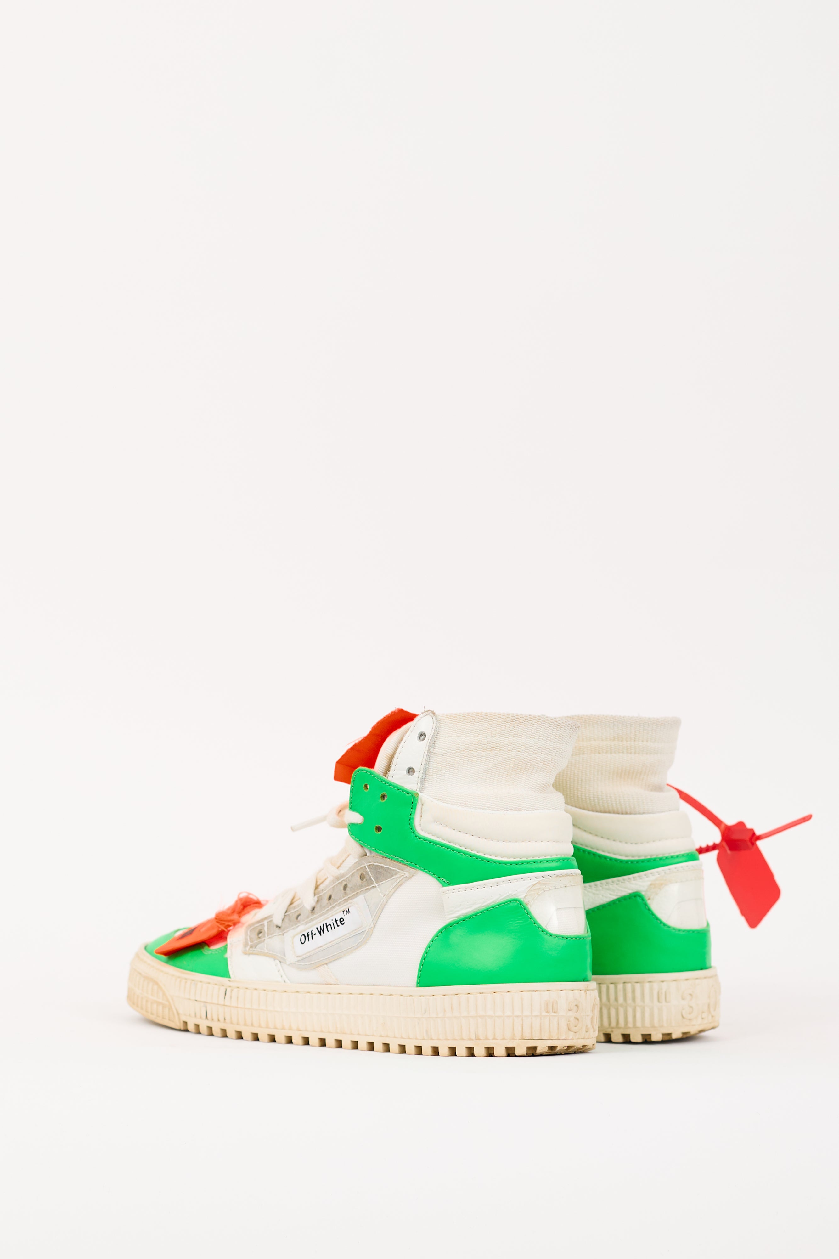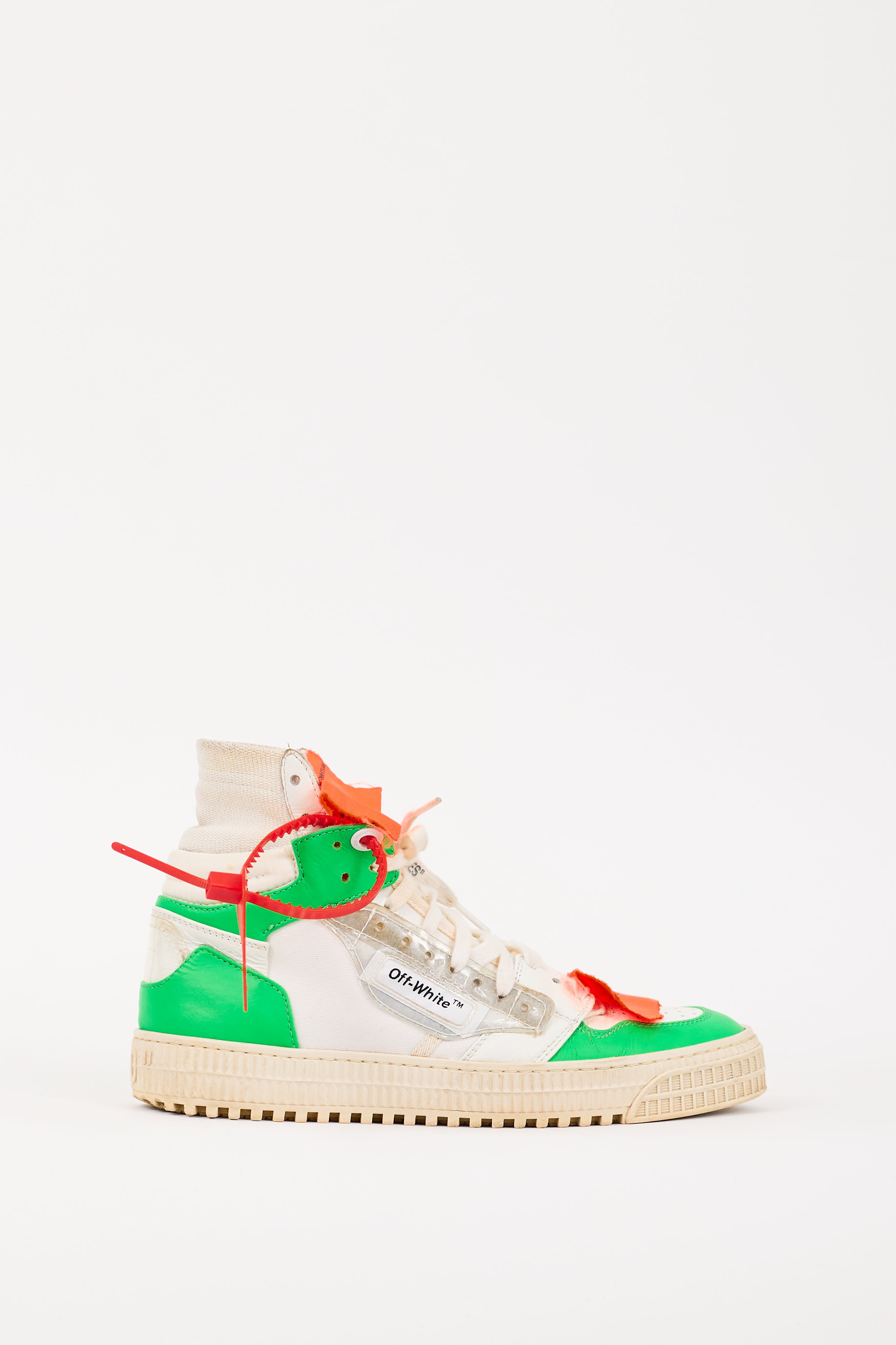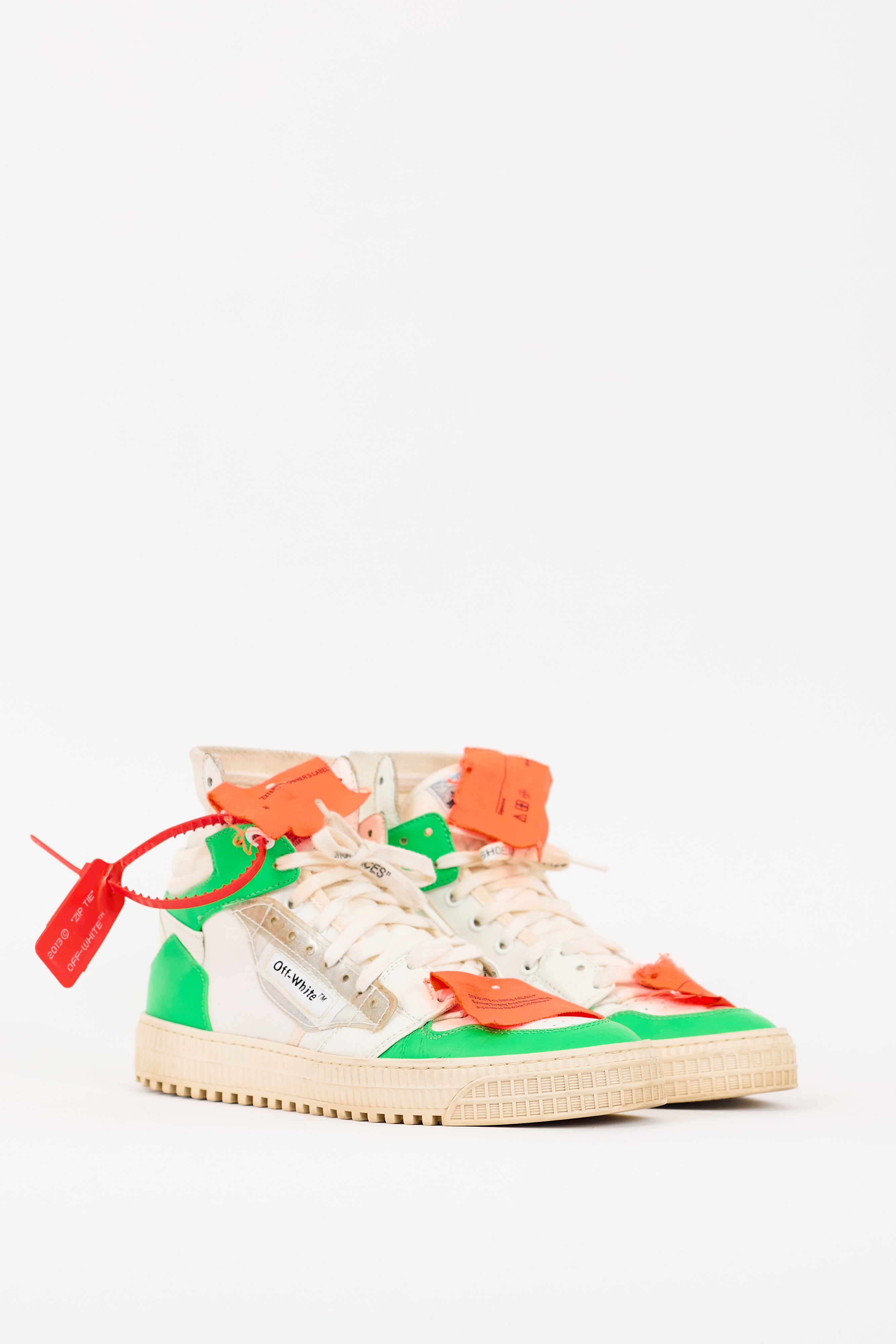 Pre-owned Off-White white and green Off-Court 3.0 High sneakers featuring a perforated rounded toe, canvas and leather panelling throughout, lace up front, signature reconstructed styling with orange labels, zip tie, and lettering, and a treaded rubber sole.