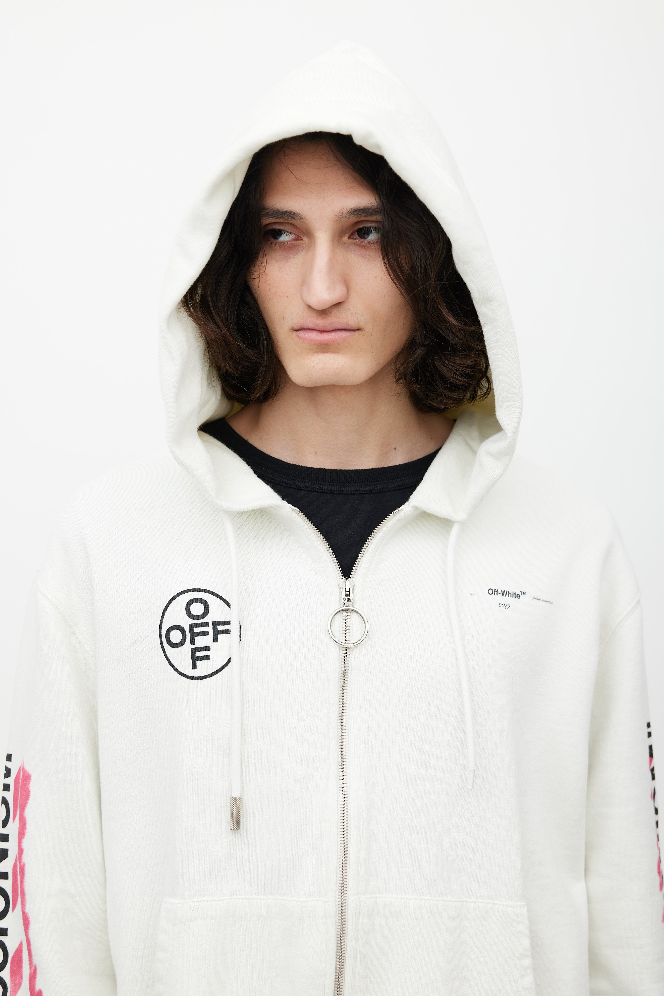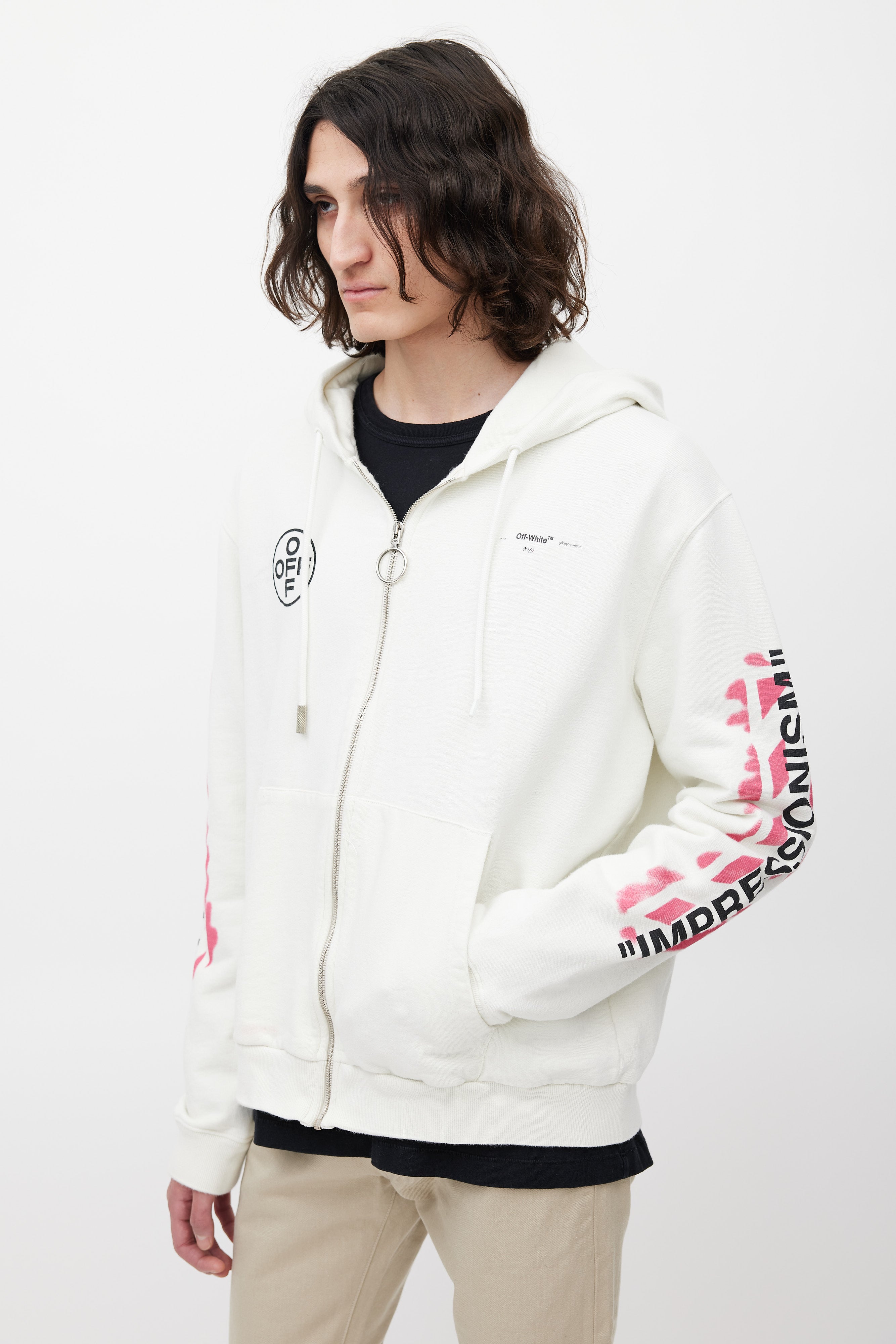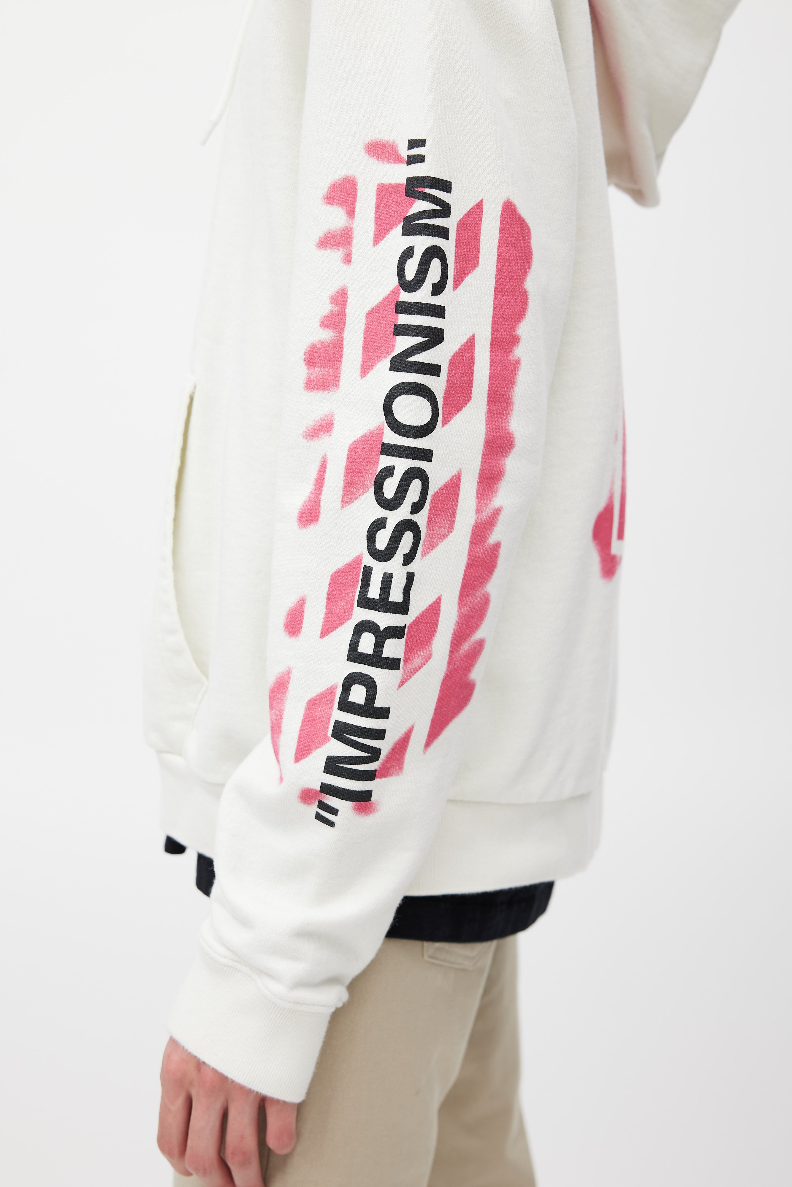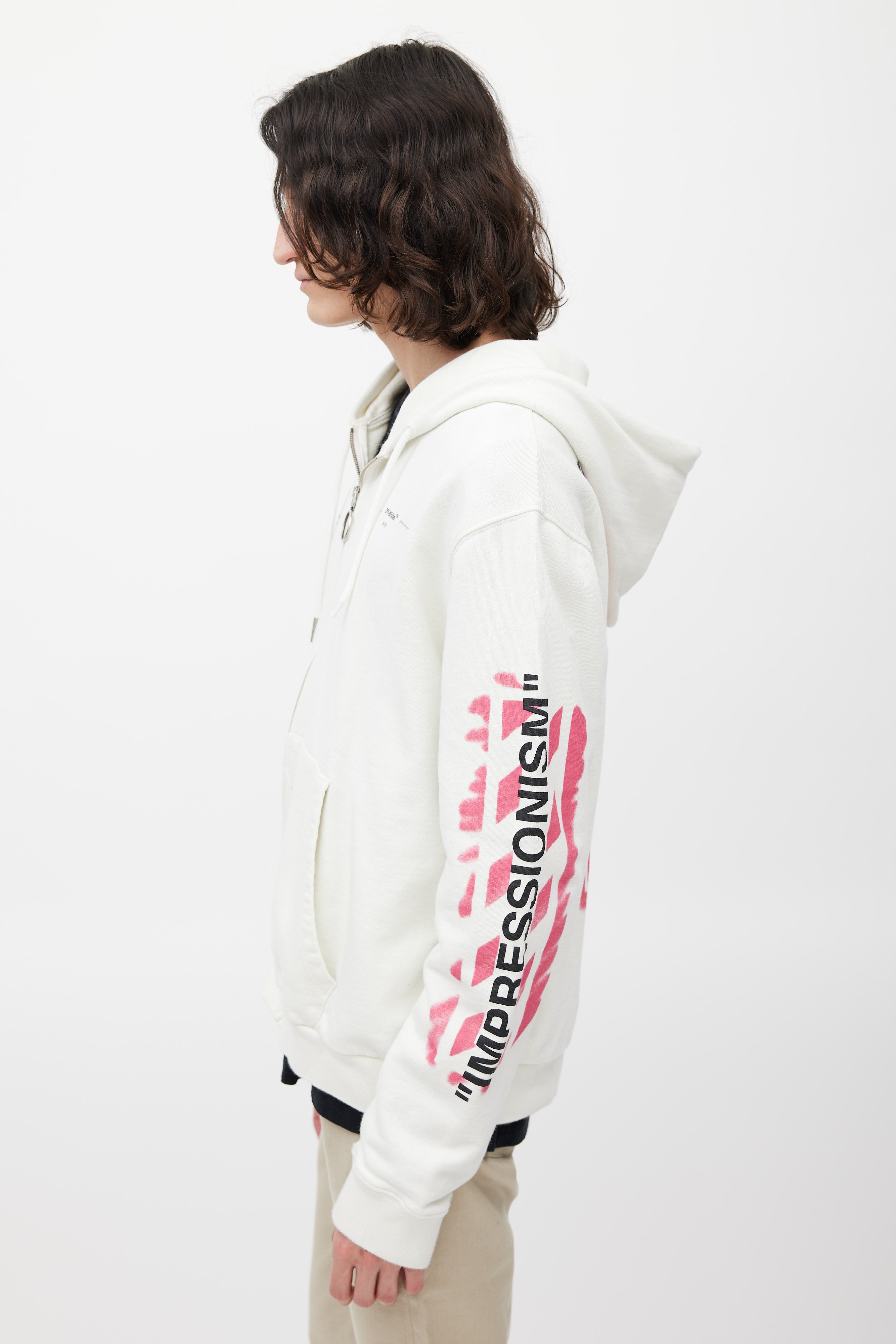 Pre-owned Off-White white hoodie featuring multicolour Impressionism logo print throughout, attached drawstring hood, two slip pockets at hip, and zip closure.